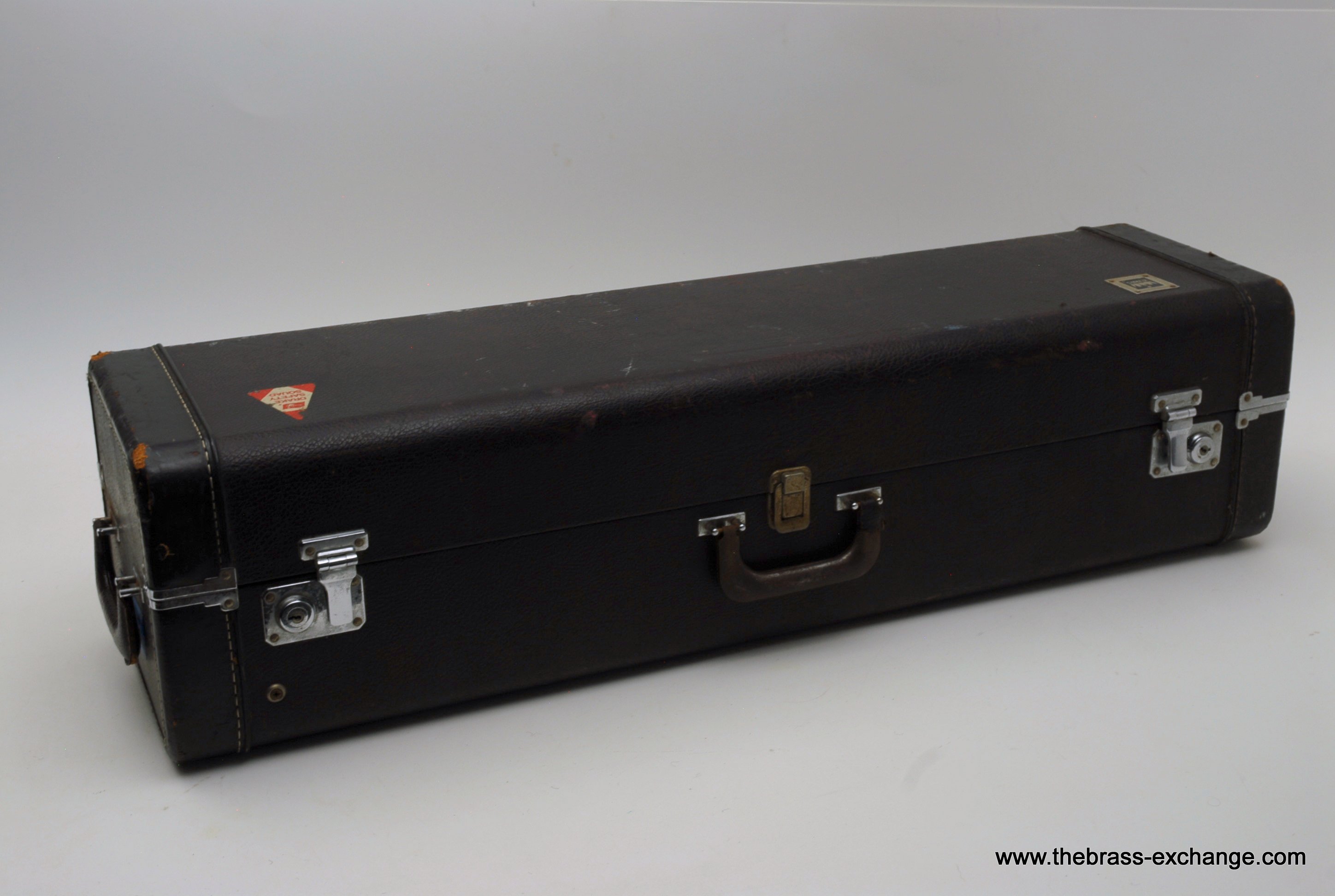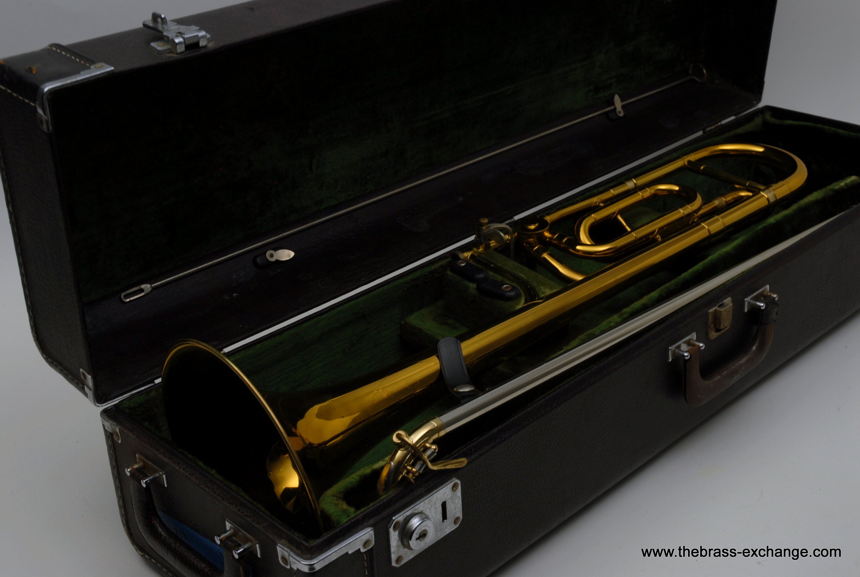 This trombone included its original case and a Bach mouthpiece, completing the vintage package.