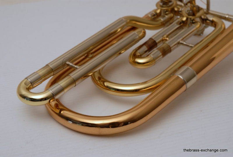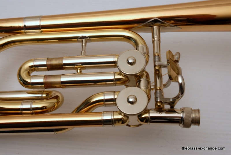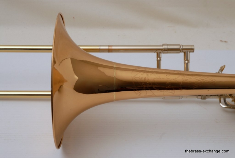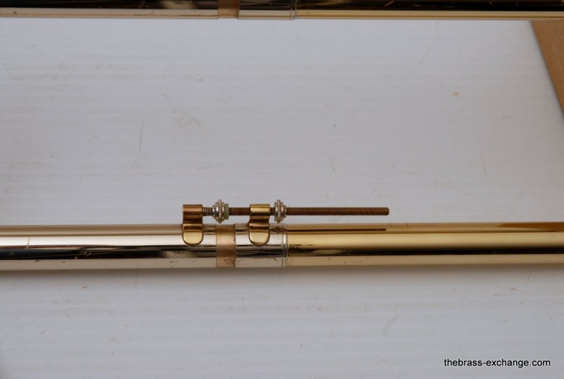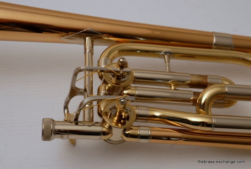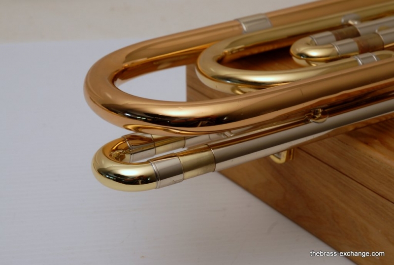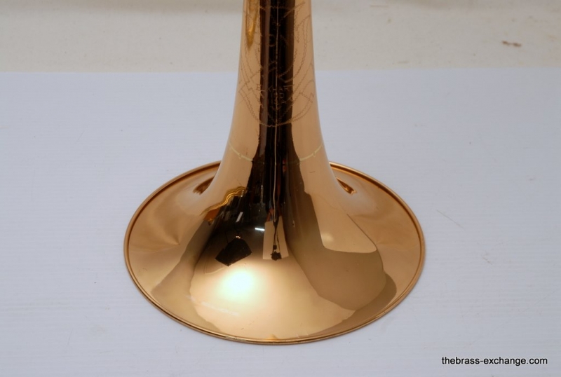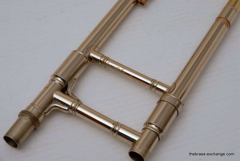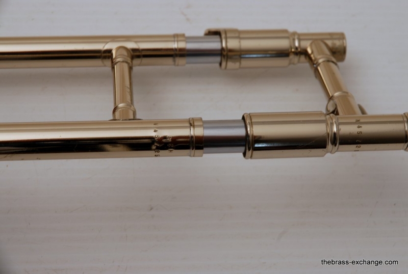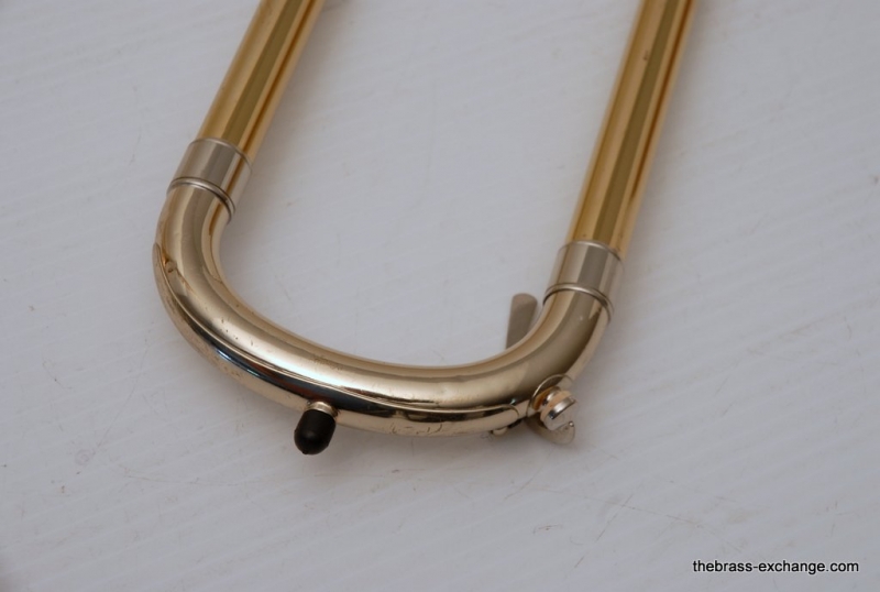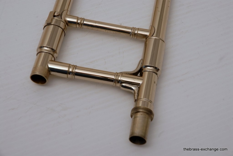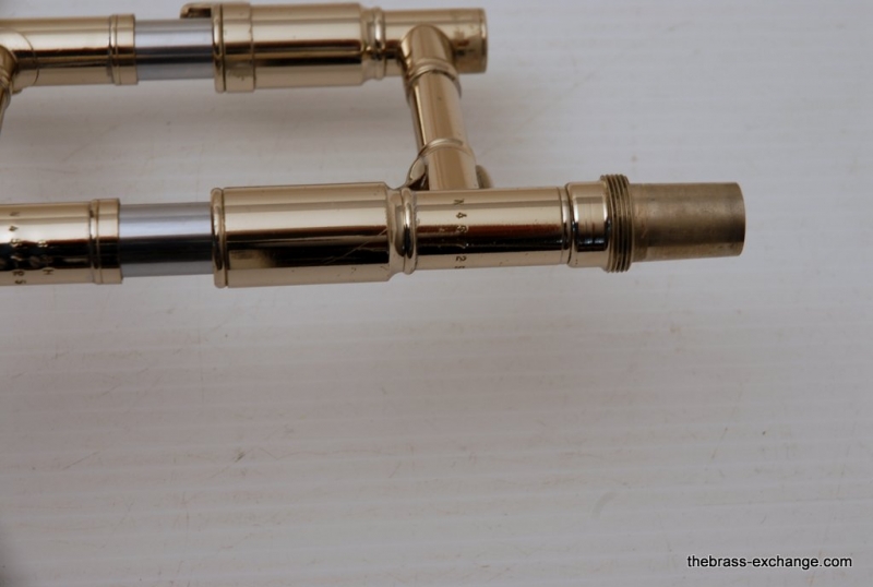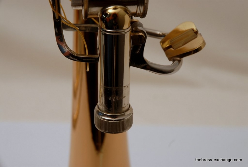 This model features the original factory rotary dependent F/E tuning system, as designed by Conn. The Tuning-in-Slide (T.I.S.) mechanism functions flawlessly. The handslide is also a standout—flawless alignment, original outer tubes with minimal wear, and perfect inner tubes with no chrome loss. The original soldered-in leadpipe and factory first-position springs are both intact.