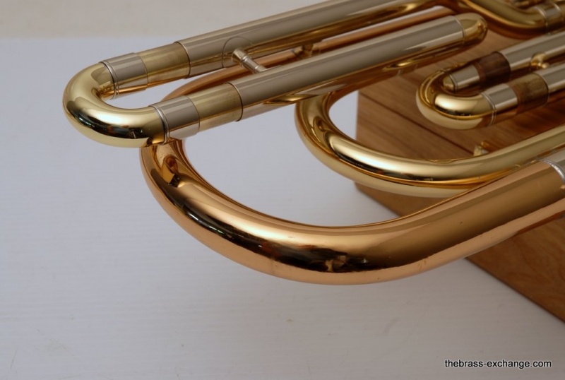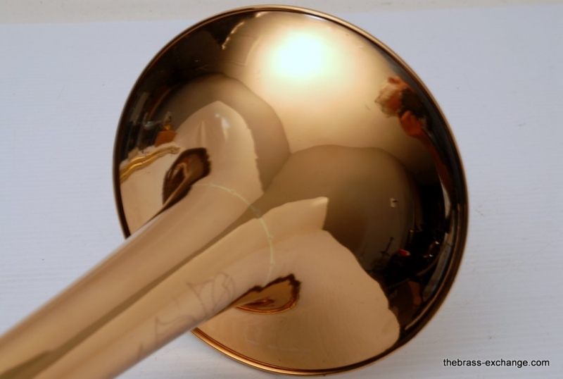 The 9.5" rose brass bell is in perfect shape, with all original lacquer except for a small relacquered section on the F tuning crook where a few minor dents were professionally removed. One small ding remains on the F-wrap—less than 3/8"—but we opted to leave it rather than dismantle the valve. It's purely cosmetic and does not affect function or airflow.