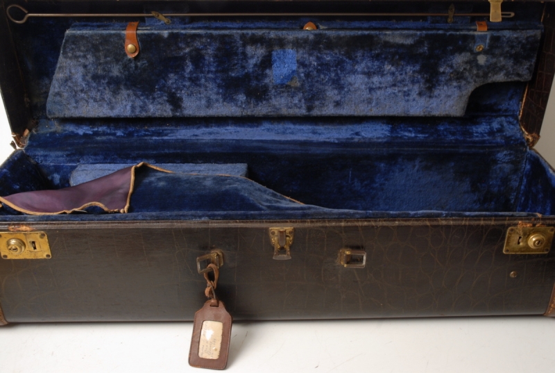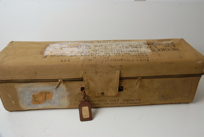 One of the most distinctive features of this instrument is its original case. Preserved by a fitted canvas cover, the exterior still bears faint stenciled military markings, believed to be U.S. Navy. This small detail ties the horn back to its service history and adds to its collector appeal.