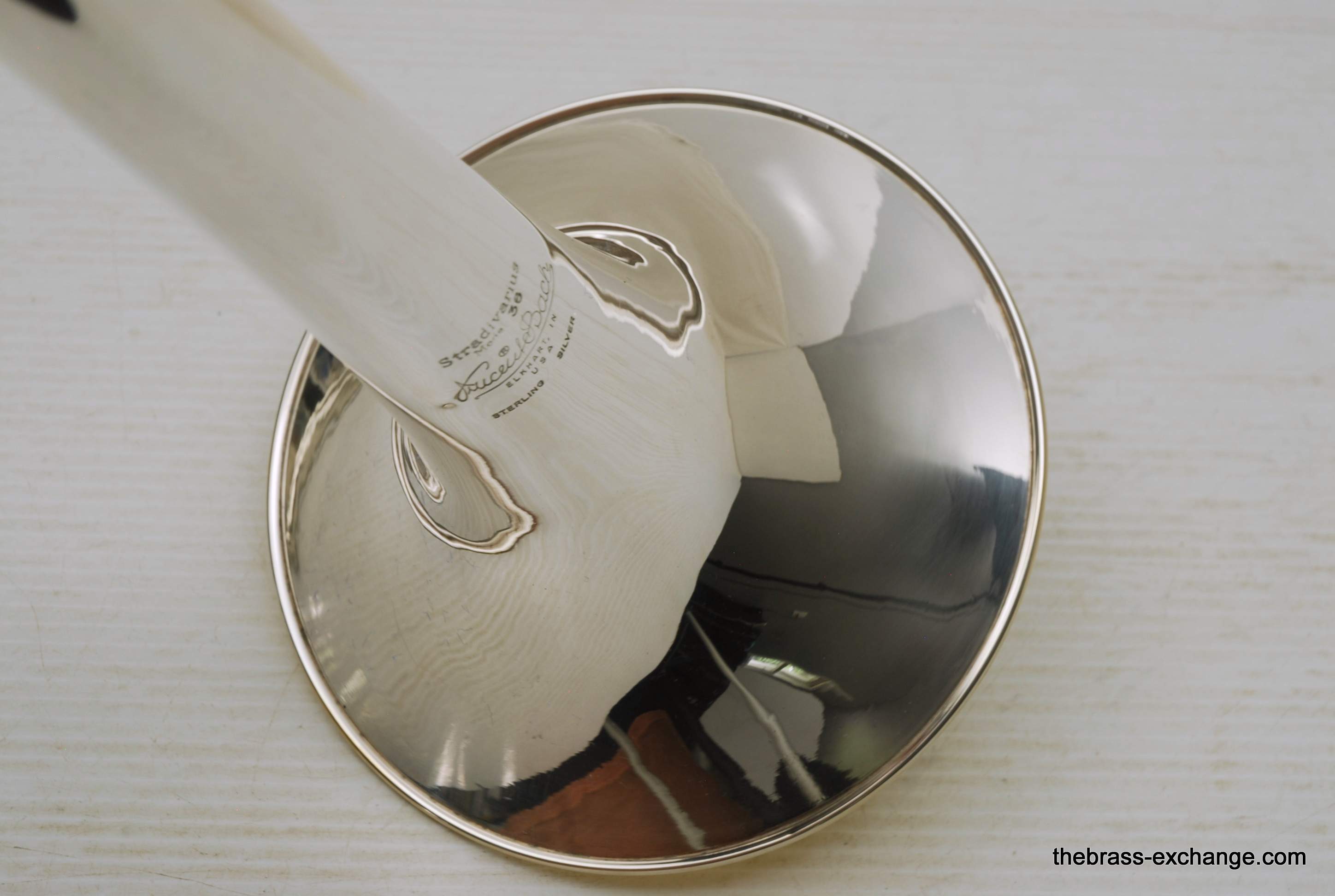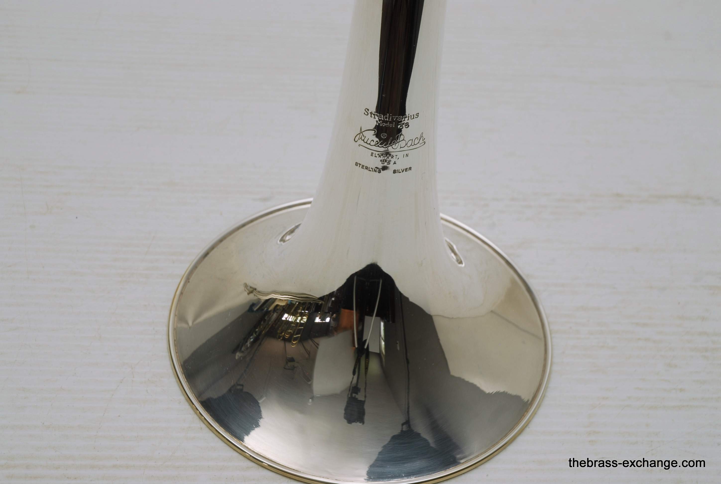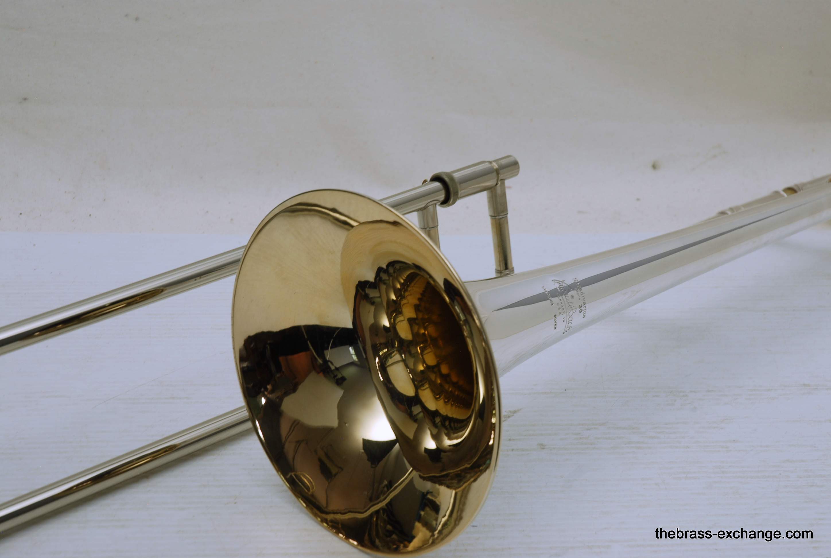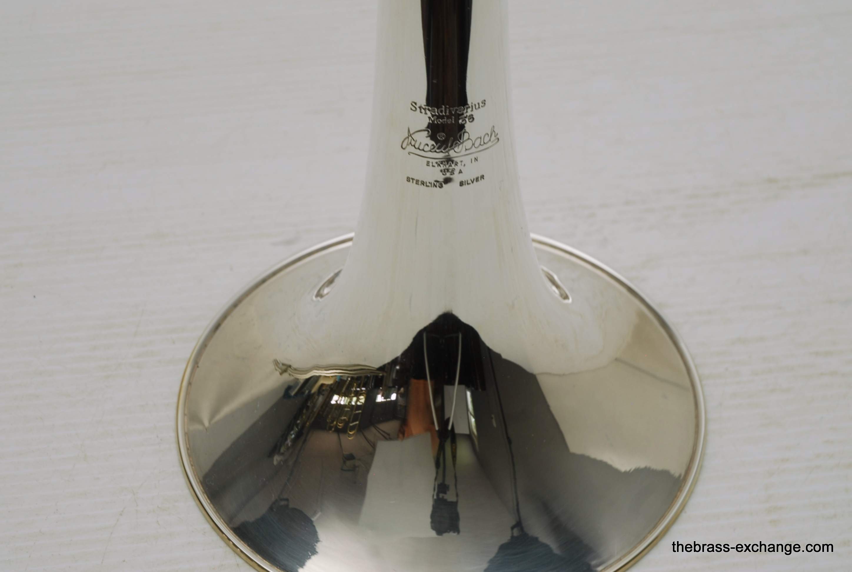 Bach 36 STraight Tenor, Sterling Silver Bell with Gold wash inner bell, Lightweight nickel silver slide, original French style case. Super Mint Condition, looks and plays perfectly, never damaged or repaired. SN 19275. Amazing playing .525 bore, has 8" sterling silver bell. Made in the mid 1970's. Everything is original on this trombone. It will not dissapoint. This is the type of horn that you can push to the limit and the sound keeps getting bigger and wider. Would be perfect for a medium bore Jazz guy looking to push it to the extreme. No service needs to improve slide or anything else on this horn. To keep our price in perspective: A new straight 36 model with LT slide today sells for over $3600. They don't make this model with sterling silver any longer. Other manufacturers that do make sterling bells generally have a $1500-1600 upcharge for sterling silver. For example a 3B Brass today is $2829 while a 3B Sterling is $4469. In stock for immediate delivery.