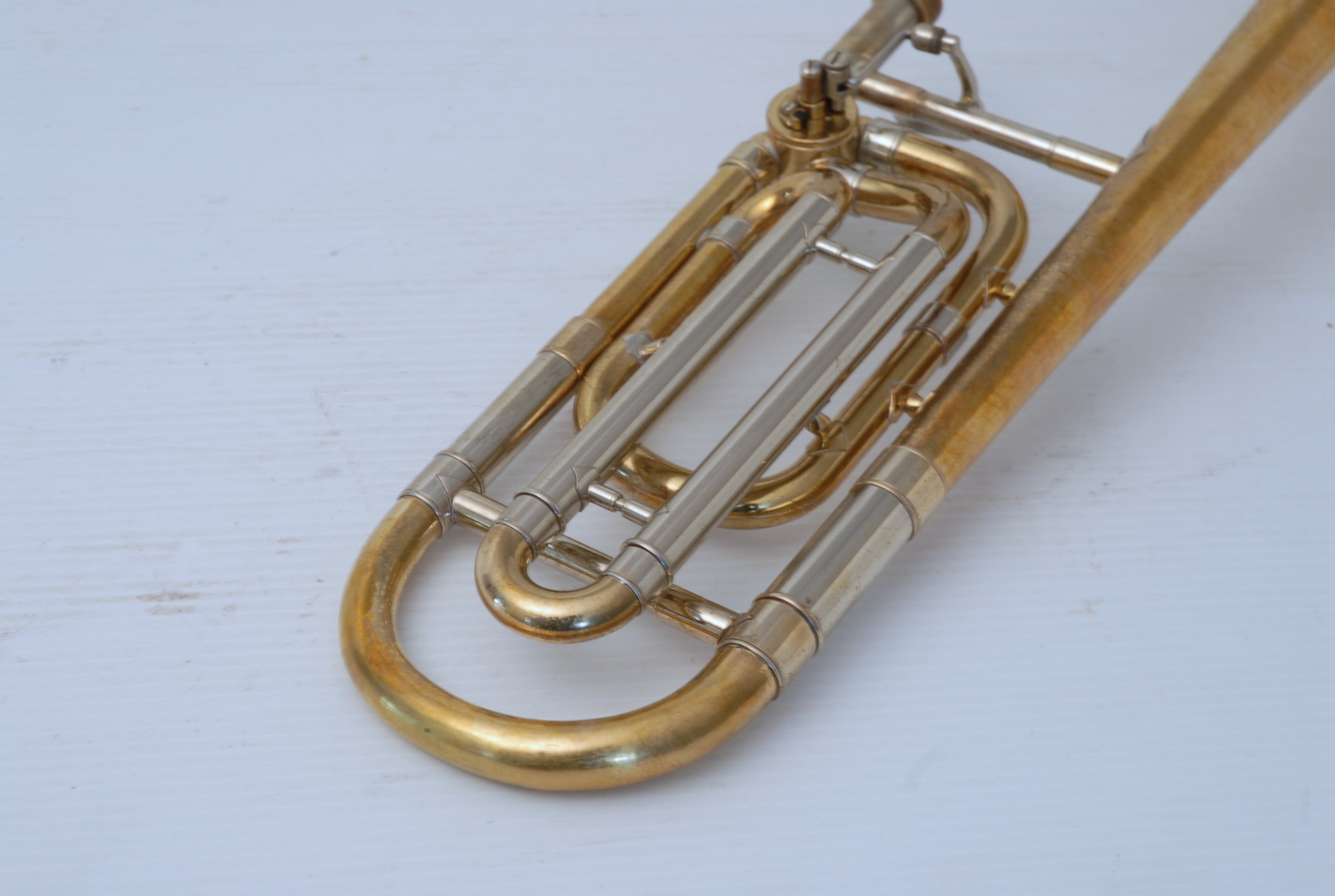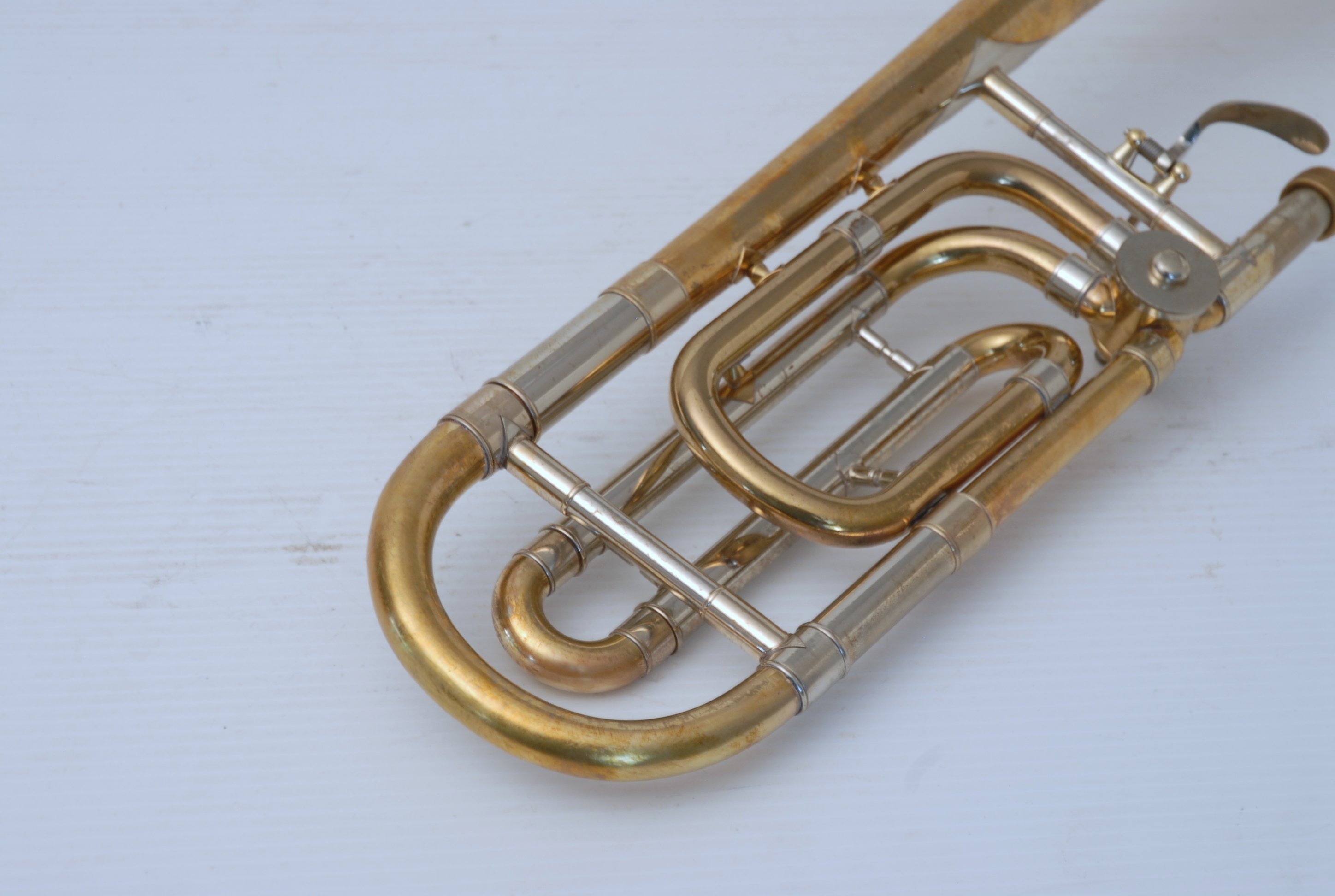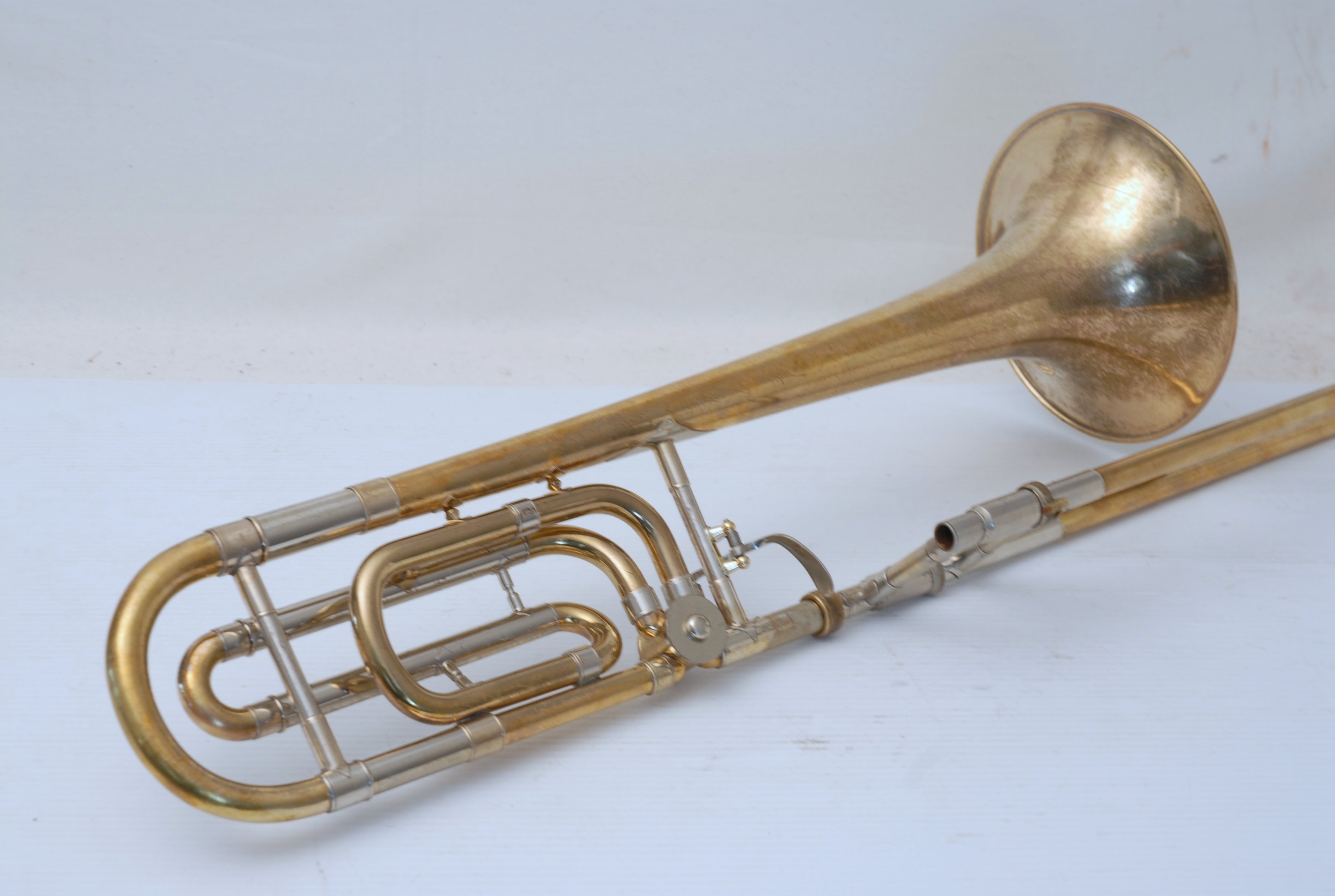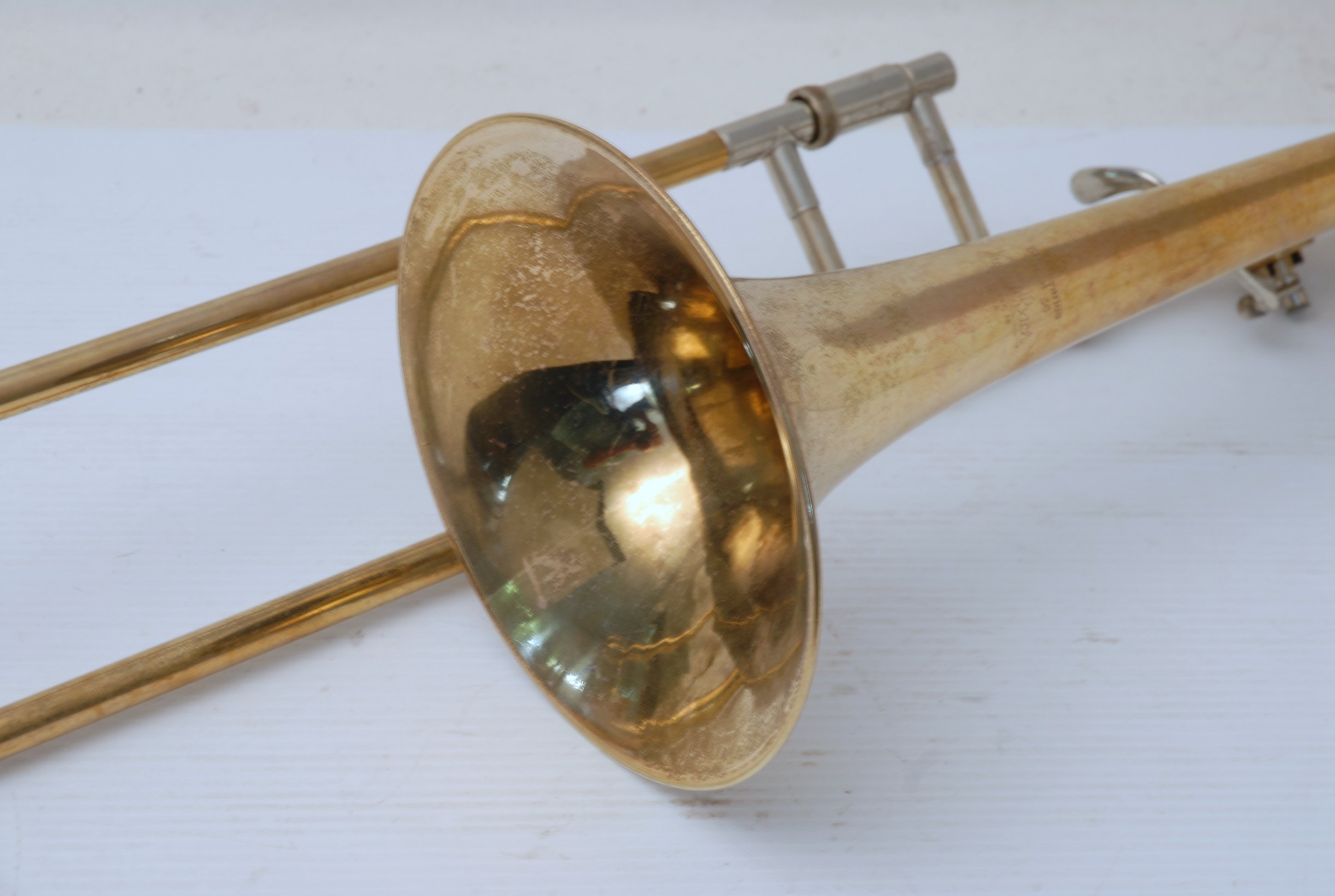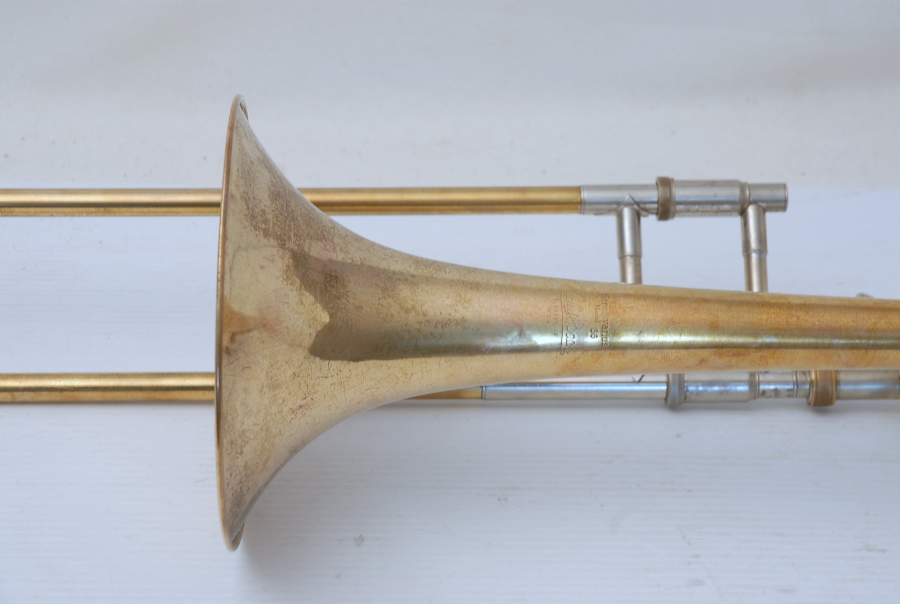 Bach 36B from Early 1980's. Has had full service with chem bath and adjusted. Some previous repairs, but all cleaned up now. Is a very good player. Mostly unlacquered. Would be a great choice for an advancing student looking for pro level, not step-up. Can play like a bigger horn with a larger cup mouthpiece, and also play smaller like for jazz band with a smaller cup mouthpiece. Classic .525 bore size. Comes with original case, fair condition.