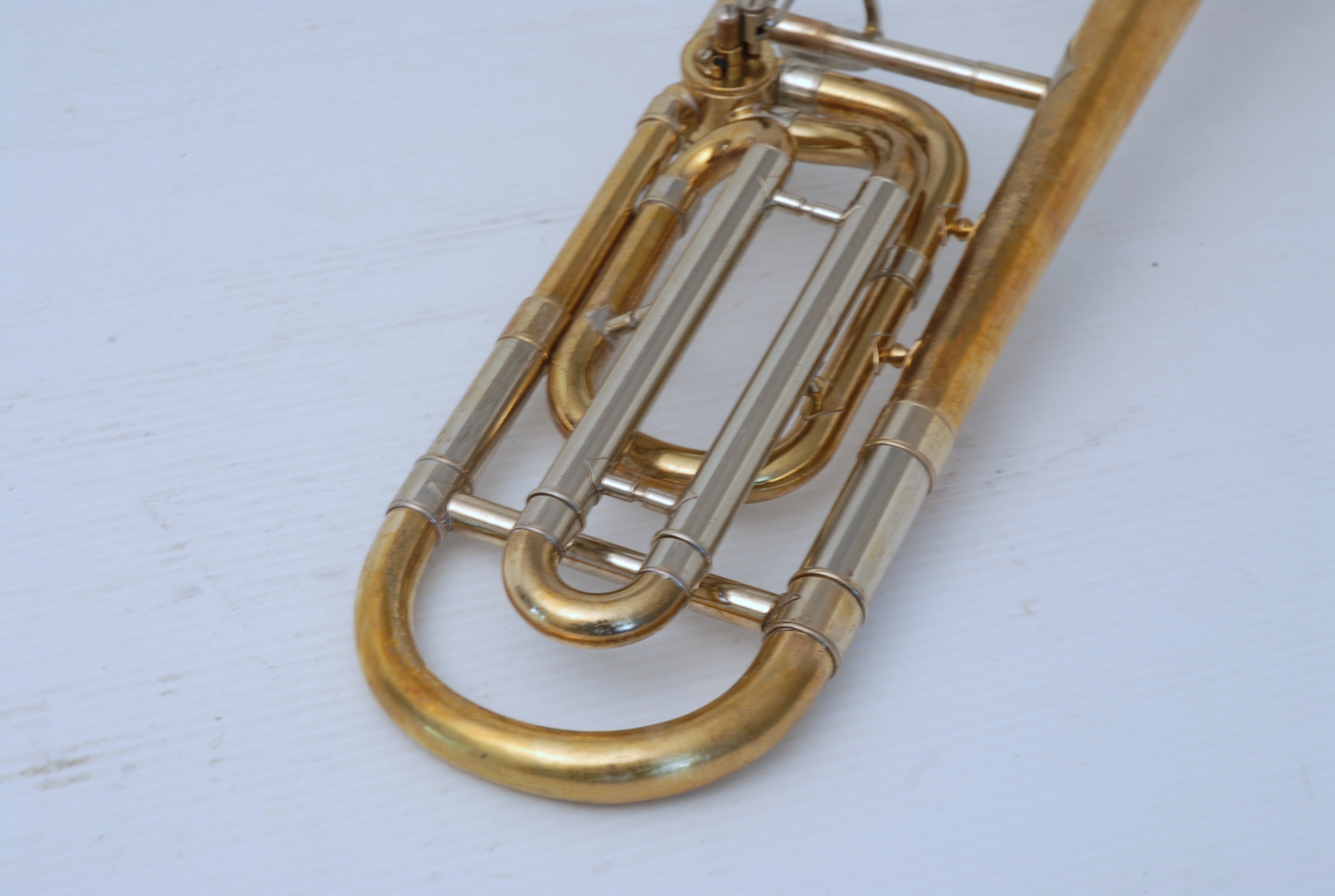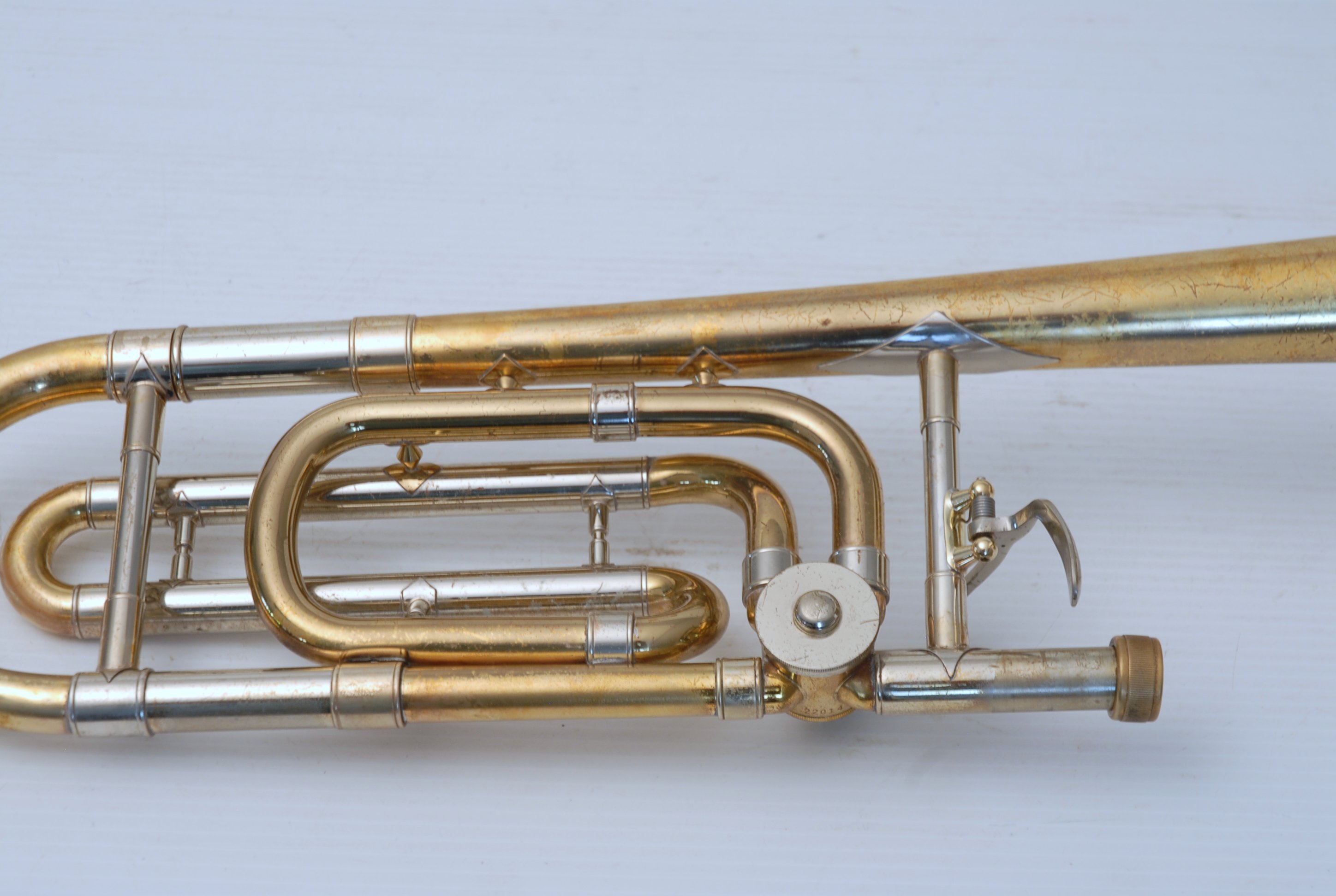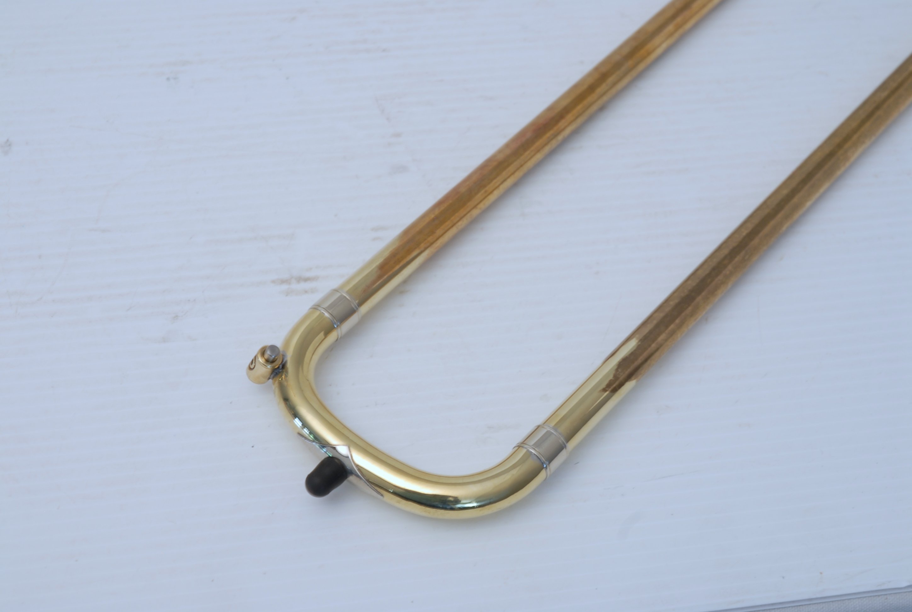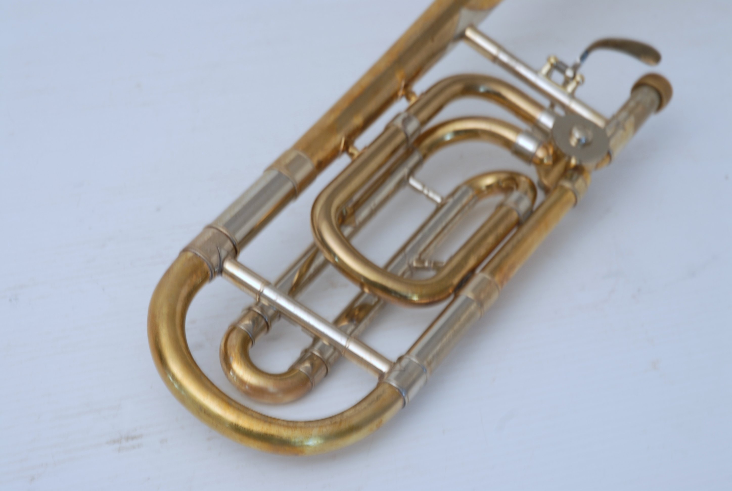 Bach 36B from Early 1980's. Has had full service with chem bath and adjusted. Some previous repairs, but all cleaned up now. Is a very good player. Mostly unlacquered. Would be a great choice for an advancing student looking for pro level, not step-up. Can play like a bigger horn with a larger cup mouthpiece, and also play smaller like for jazz band with a smaller cup mouthpiece. Classic .525 bore size. Comes with original case, fair condition.