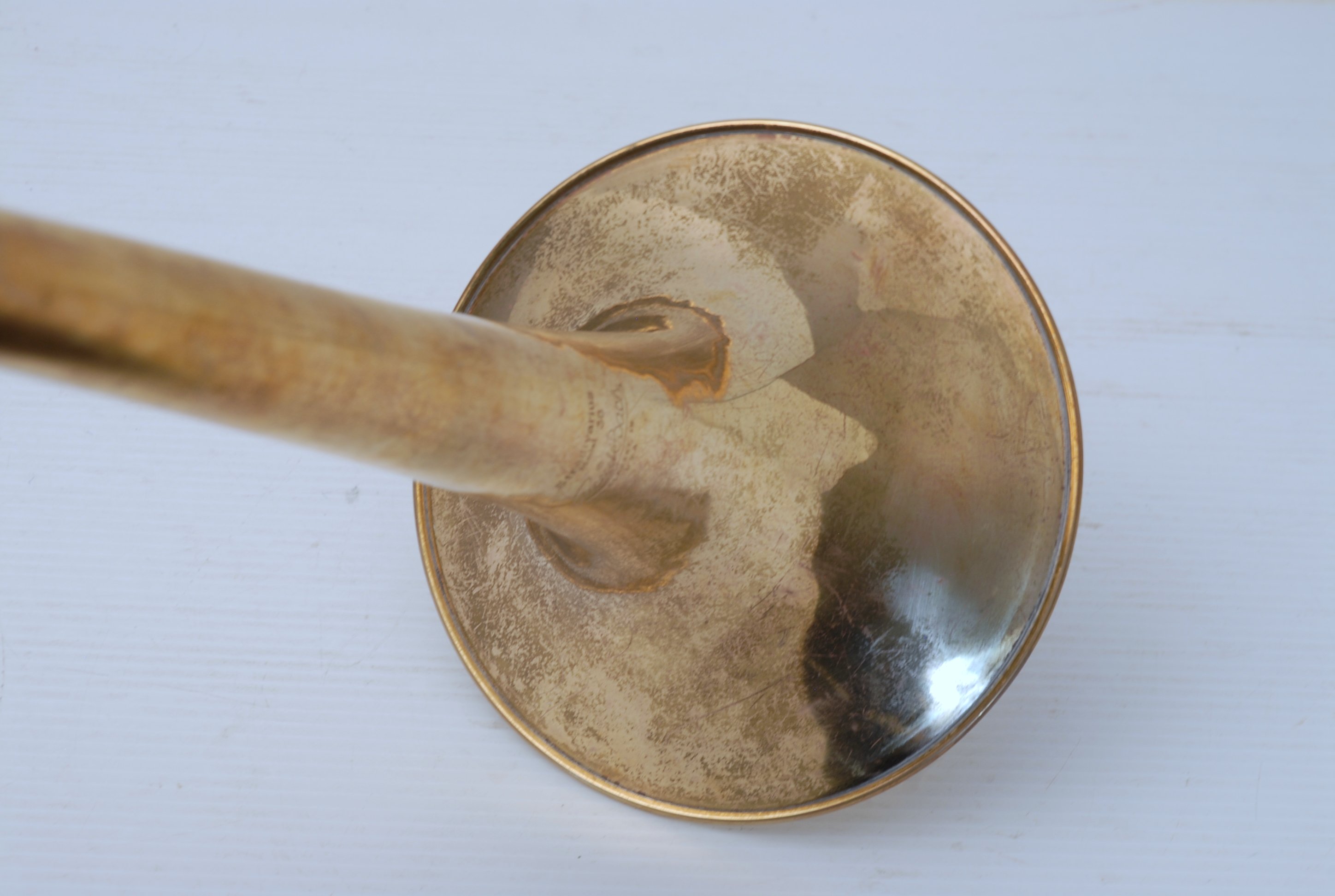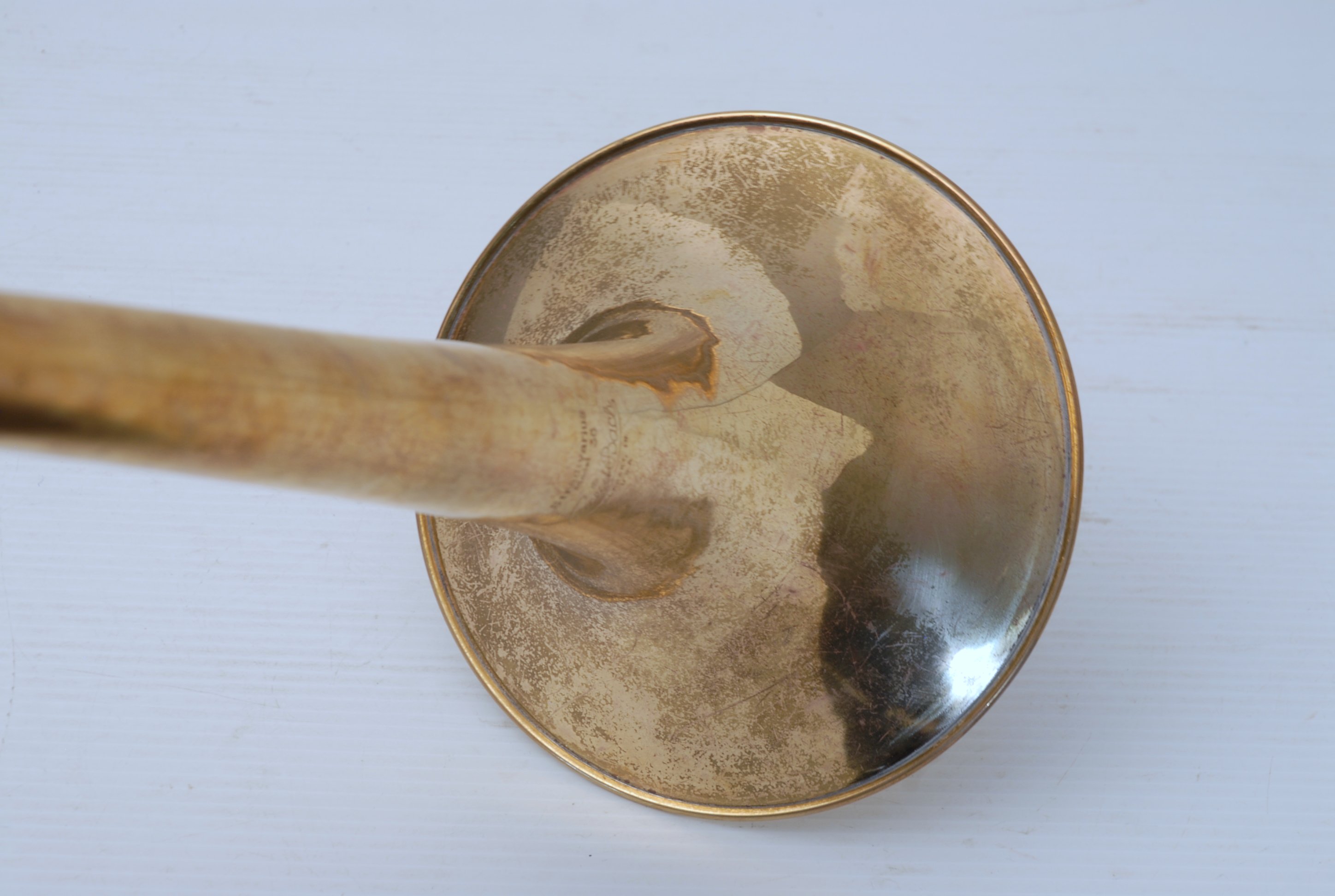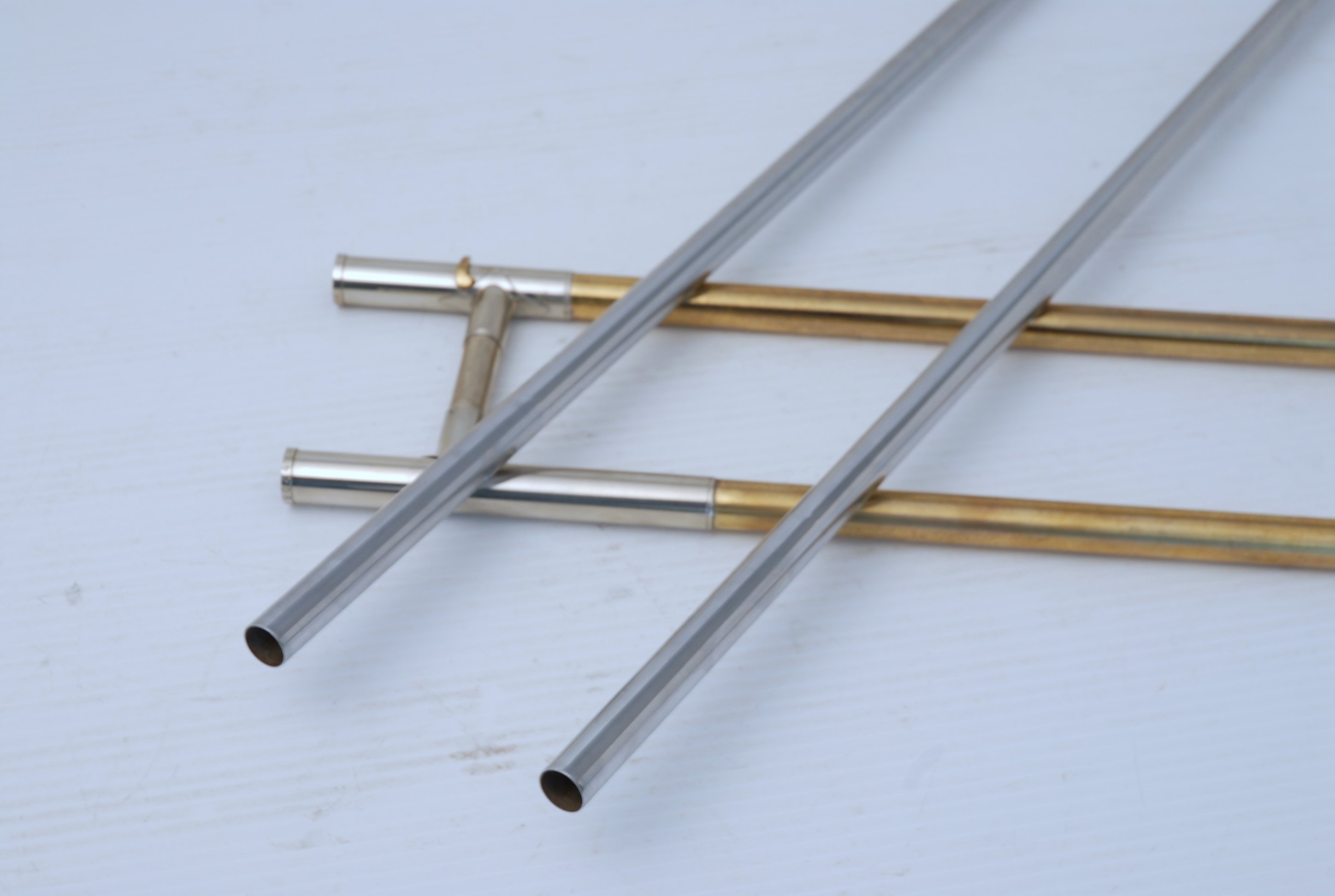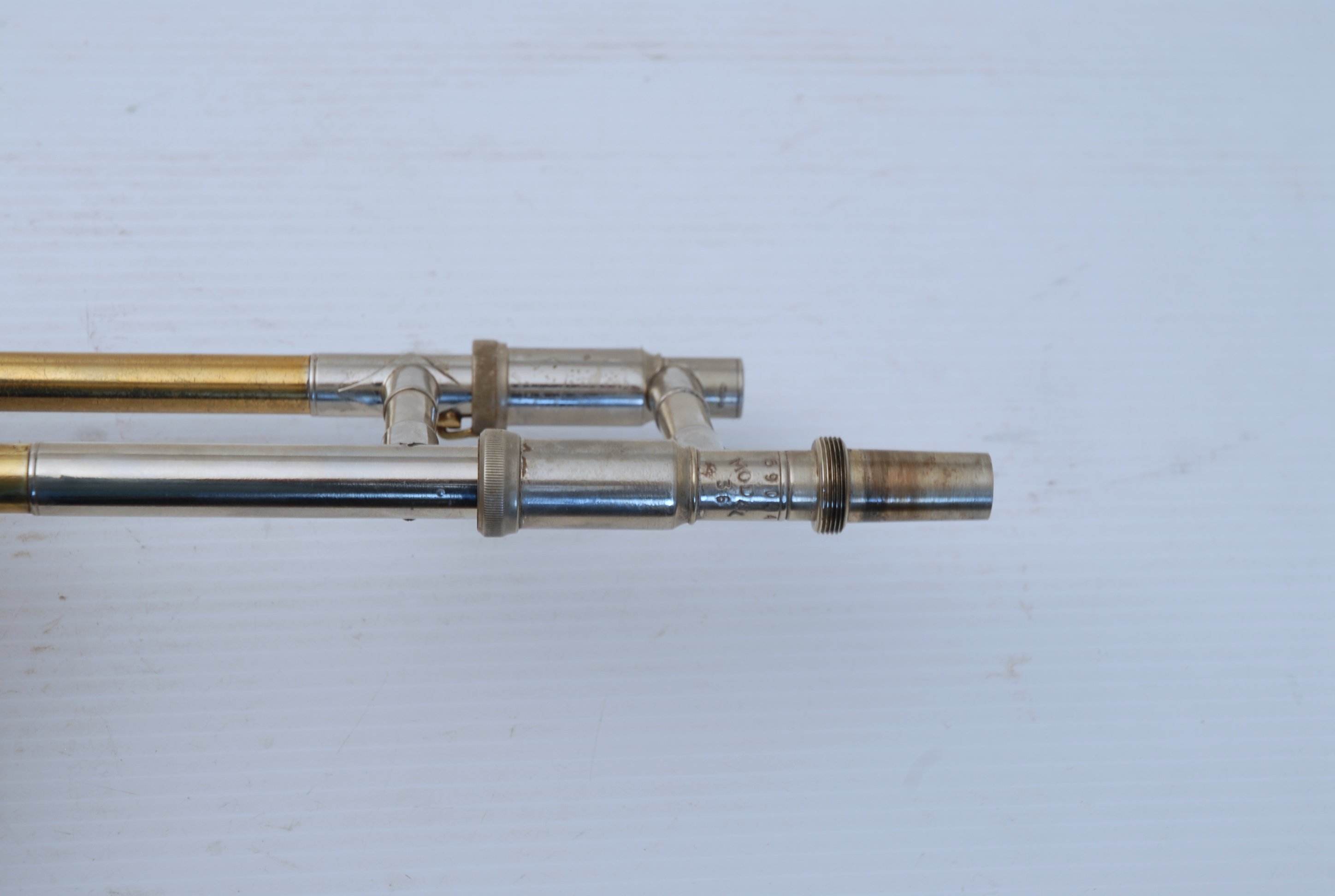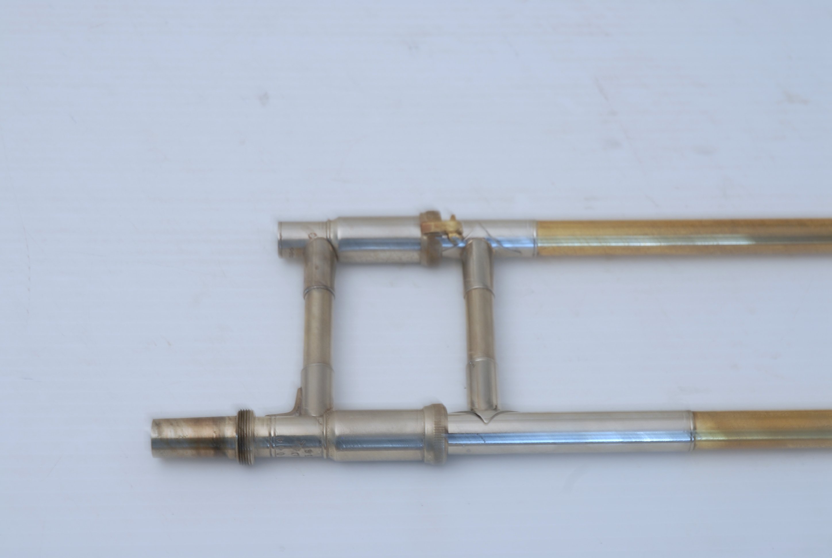Bach 36B from Early 1980's. Has had full service with chem bath and adjusted. Some previous repairs, but all cleaned up now. Is a very good player. Mostly unlacquered. Would be a great choice for an advancing student looking for pro level, not step-up. Can play like a bigger horn with a larger cup mouthpiece, and also play smaller like for jazz band with a smaller cup mouthpiece. Classic .525 bore size. Comes with original case, fair condition.