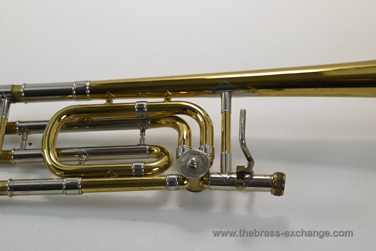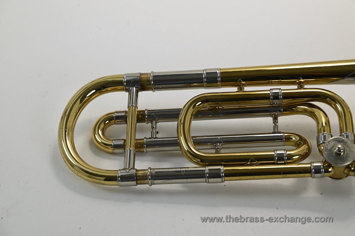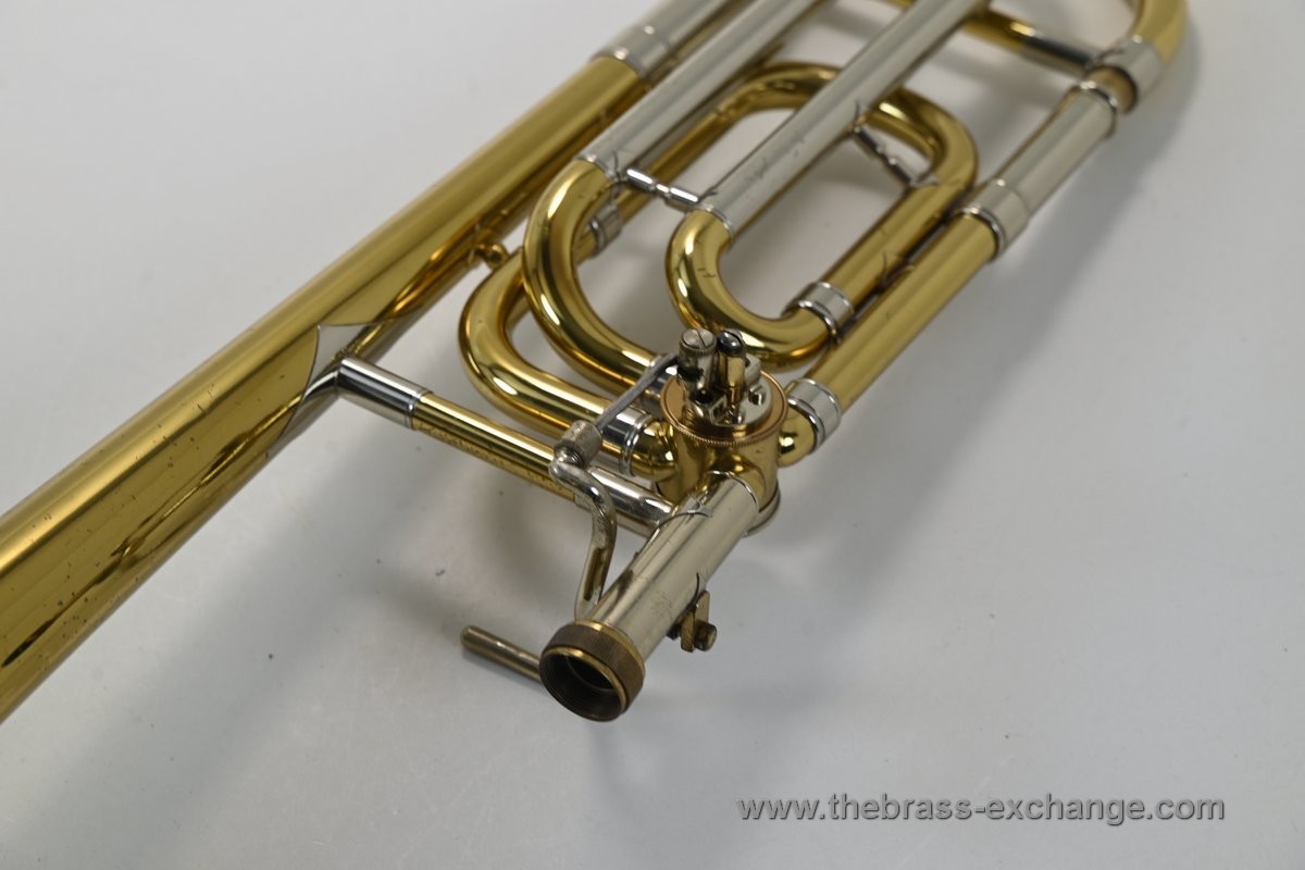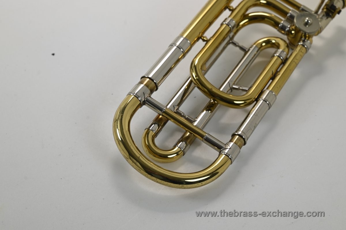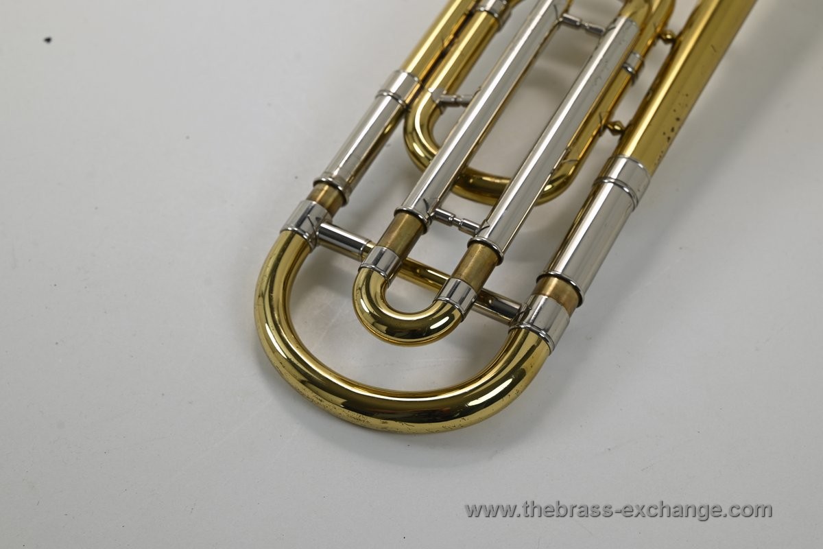 It features the classic 8" one-piece yellow brass bell and standard .525 bore handslide, offering a perfectly balanced medium-bore profile. The instrument has been fully serviced in our shop, including a professional handslide setup, chemical flush, and rotor maintenance.