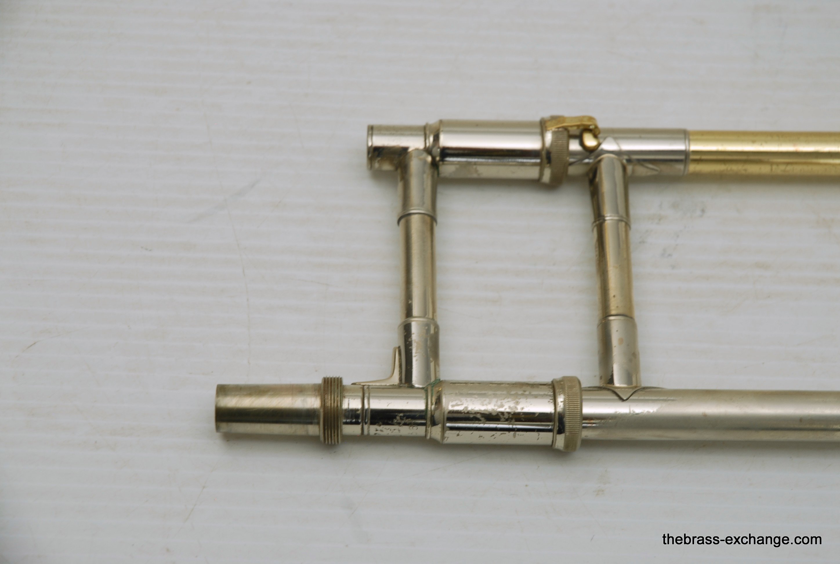 Moderate lacquer wear is common on well-played instruments from this era and does not affect tone or playability when the trombone is structurally sound and properly serviced.