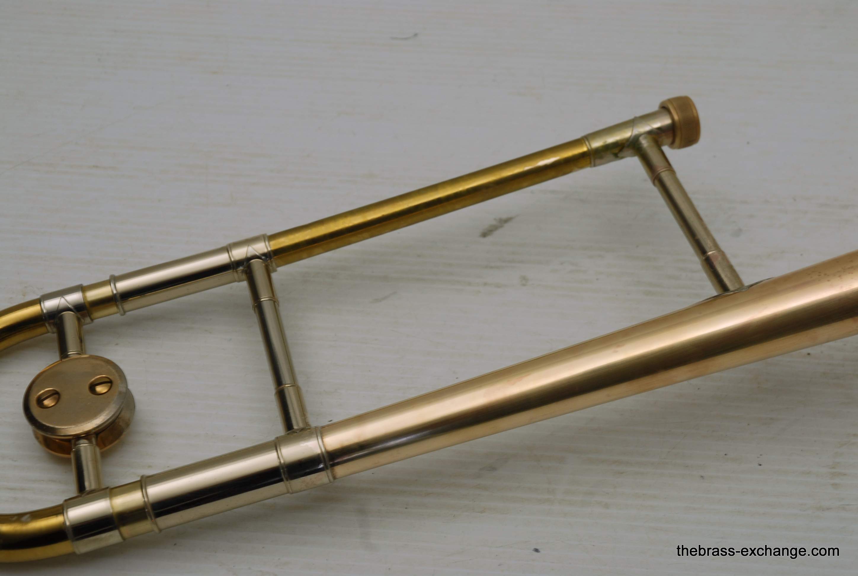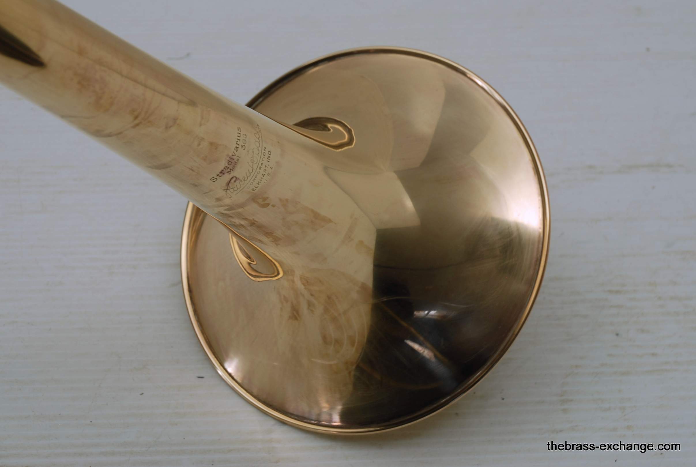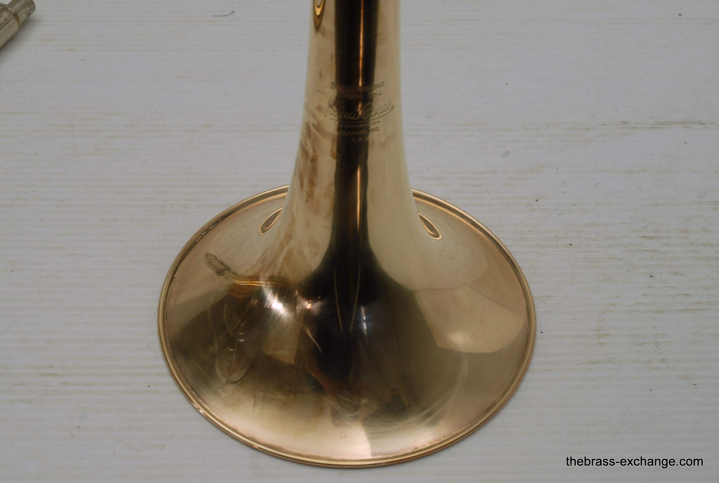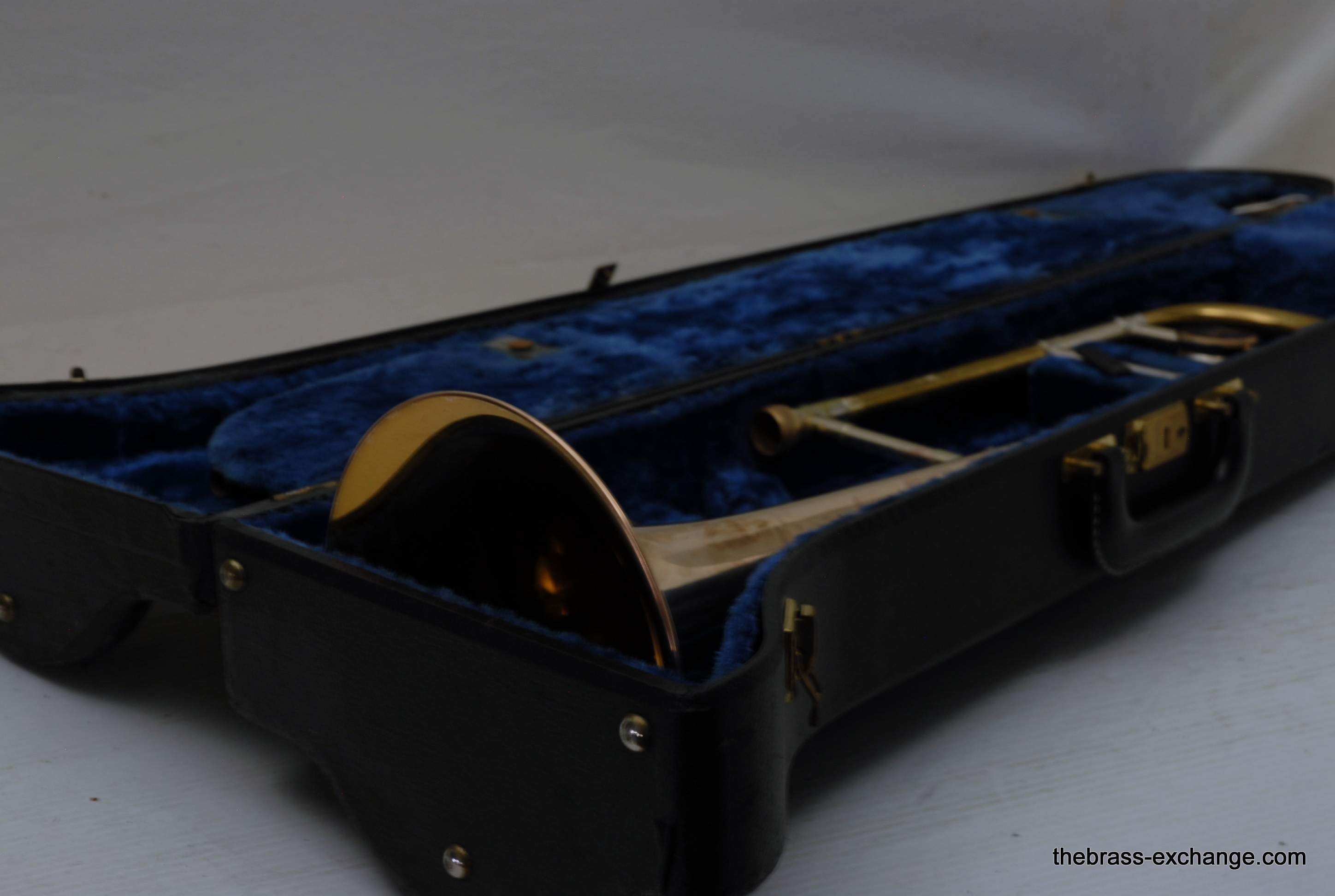 Bach 36G Corporation era. Bell section most likely made in the 70’s, and is unlacquered except for inner bell, which is lacquered. Is a gorgeous bell section and plays perfectly. Handslide is later made early 90’s. Both bell and slide fit and play excellent together. No issues with tubes or red-rot. The photo’s of the slide endcrook have a gold brass look, but it is standard yellow. The tint is from the chemical bath, dip. It will turn to a more yellow color with time. I like it the way it is. This would be a great 36 for any serious gold brass bell player looking to get into this size. Plays rich and warm as one would expect. No service need to improve playability. Super crisp French style case. In-stock.