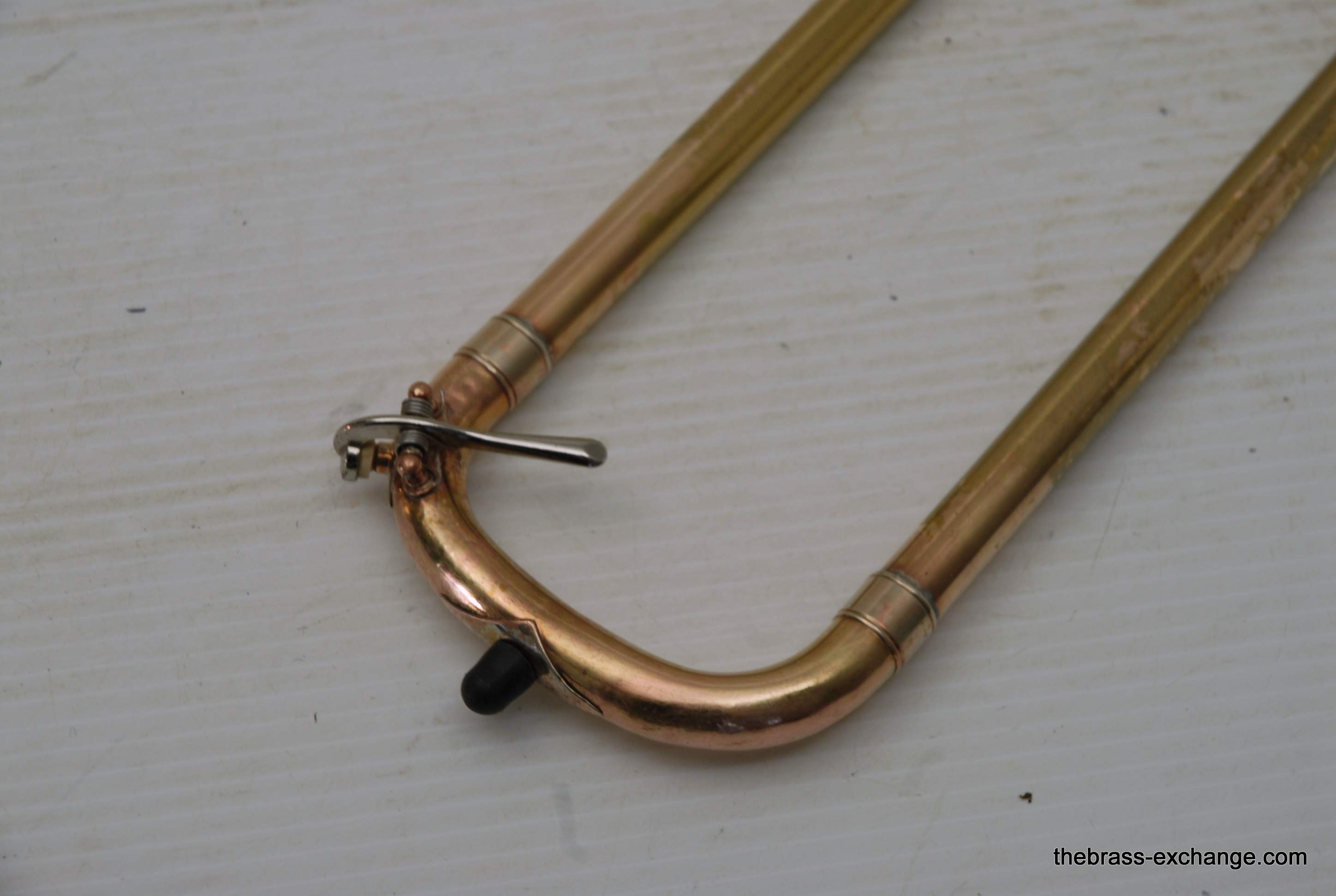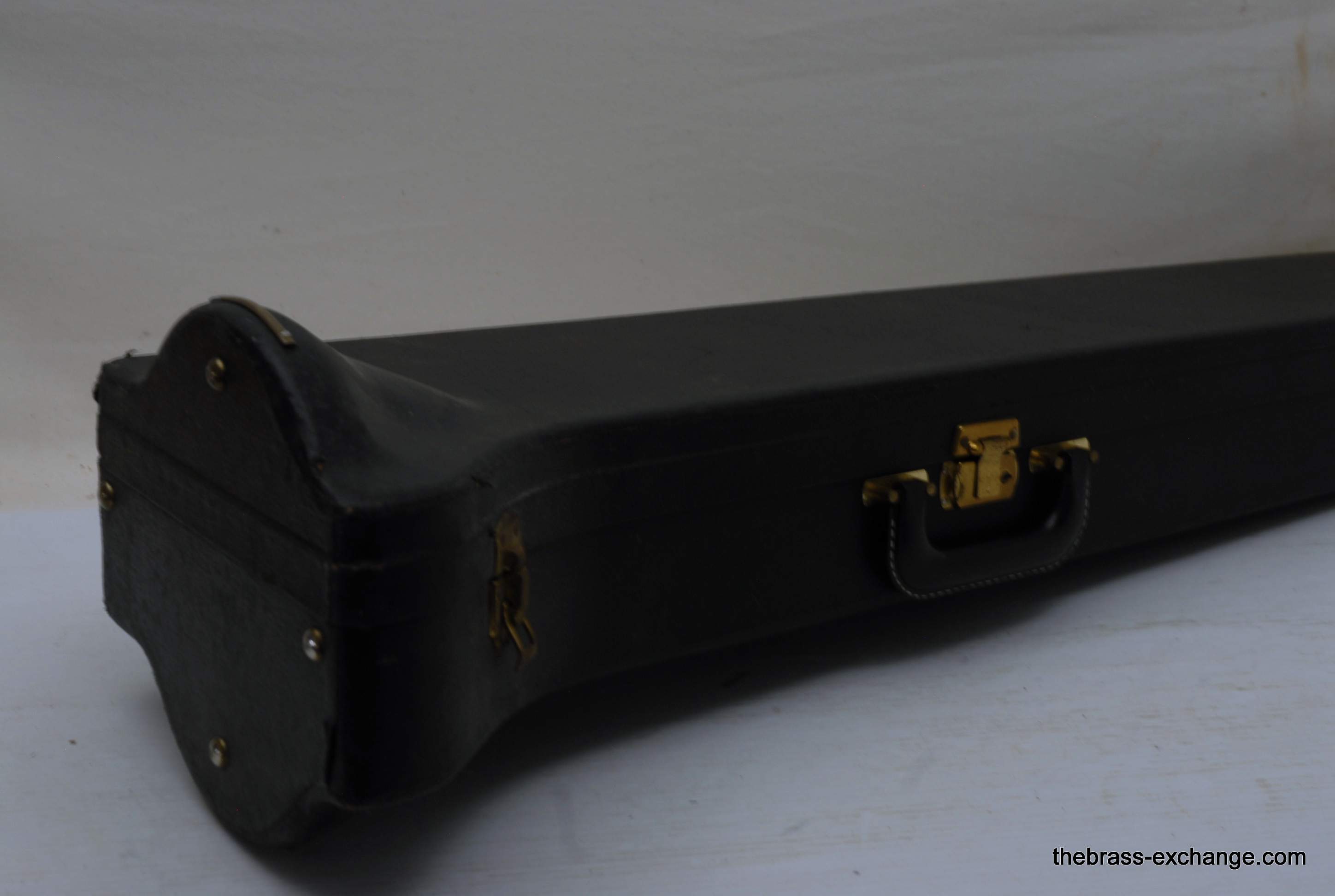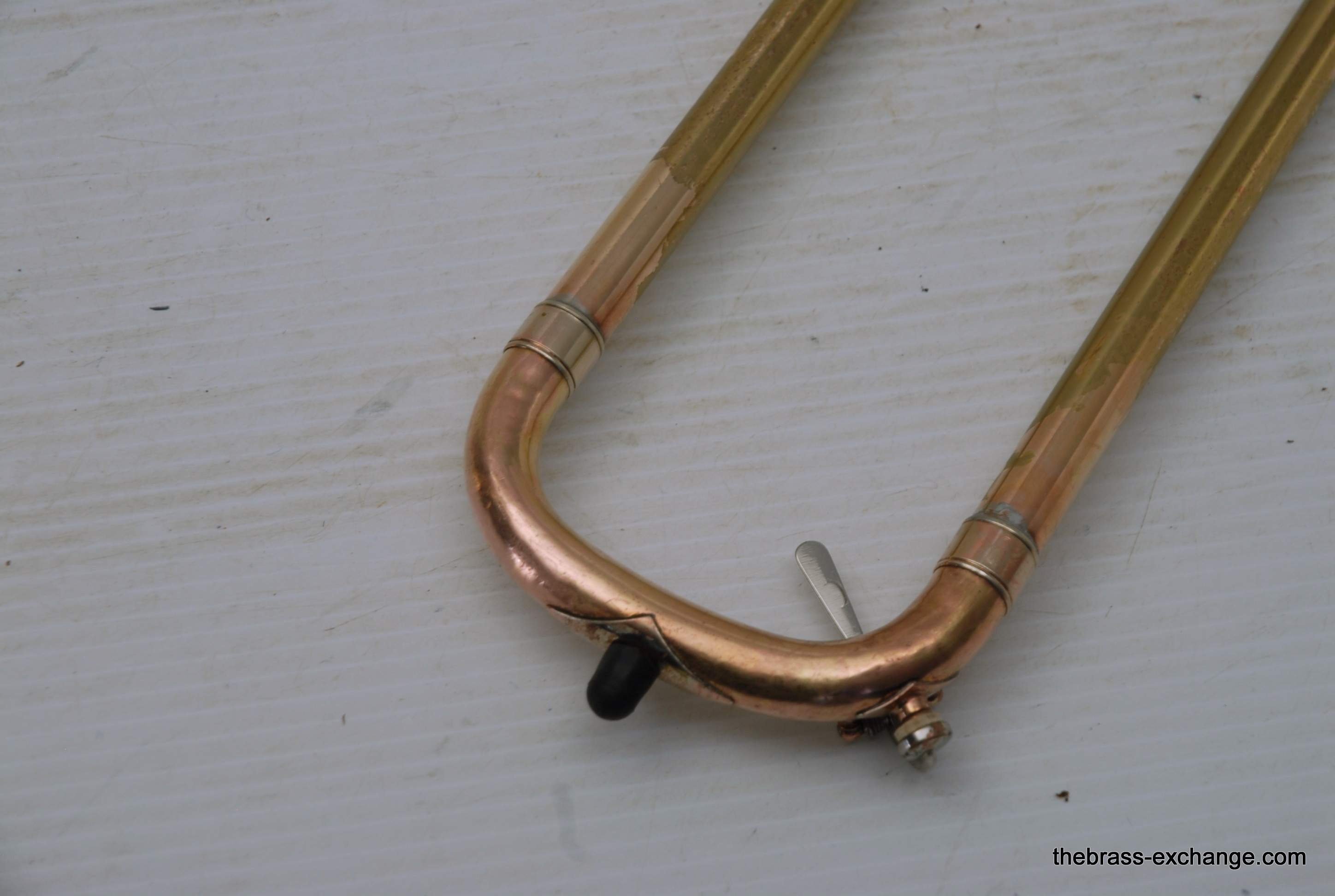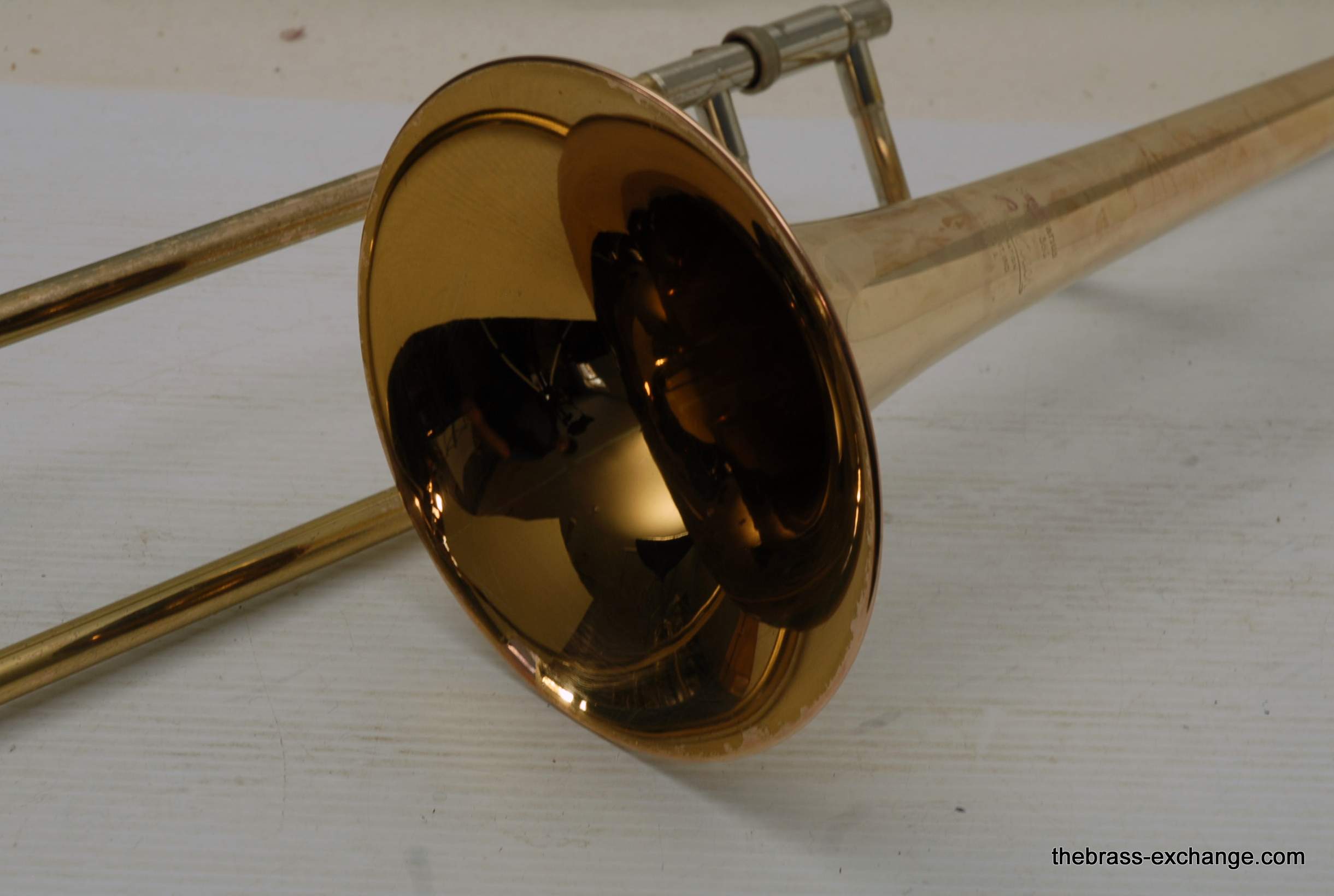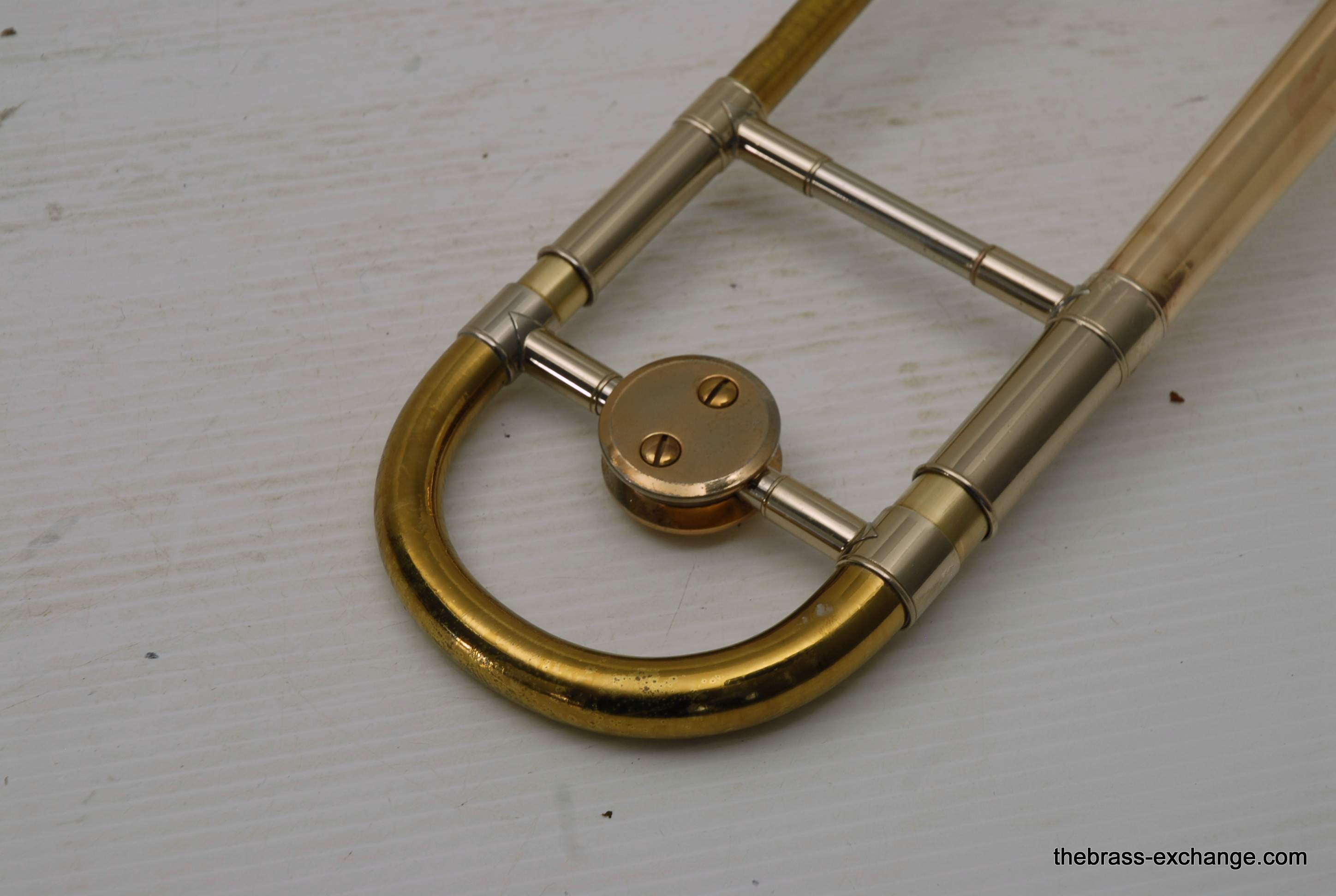 Bach 36G Corporation era. Bell section most likely made in the 70’s, and is unlacquered except for inner bell, which is lacquered. Is a gorgeous bell section and plays perfectly. Handslide is later made early 90’s. Both bell and slide fit and play excellent together. No issues with tubes or red-rot. The photo’s of the slide endcrook have a gold brass look, but it is standard yellow. The tint is from the chemical bath, dip. It will turn to a more yellow color with time. I like it the way it is. This would be a great 36 for any serious gold brass bell player looking to get into this size. Plays rich and warm as one would expect. No service need to improve playability. Super crisp French style case. In-stock.