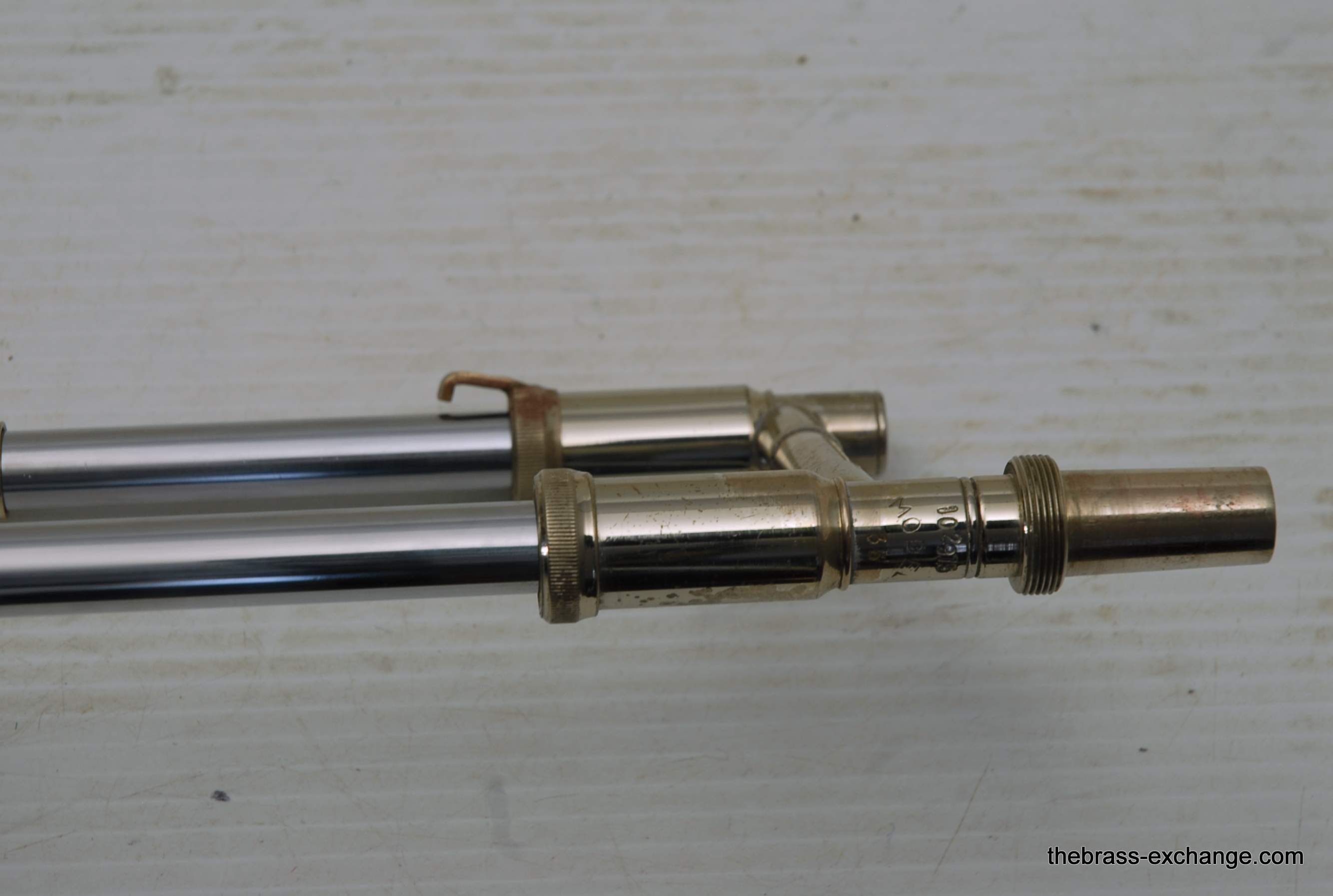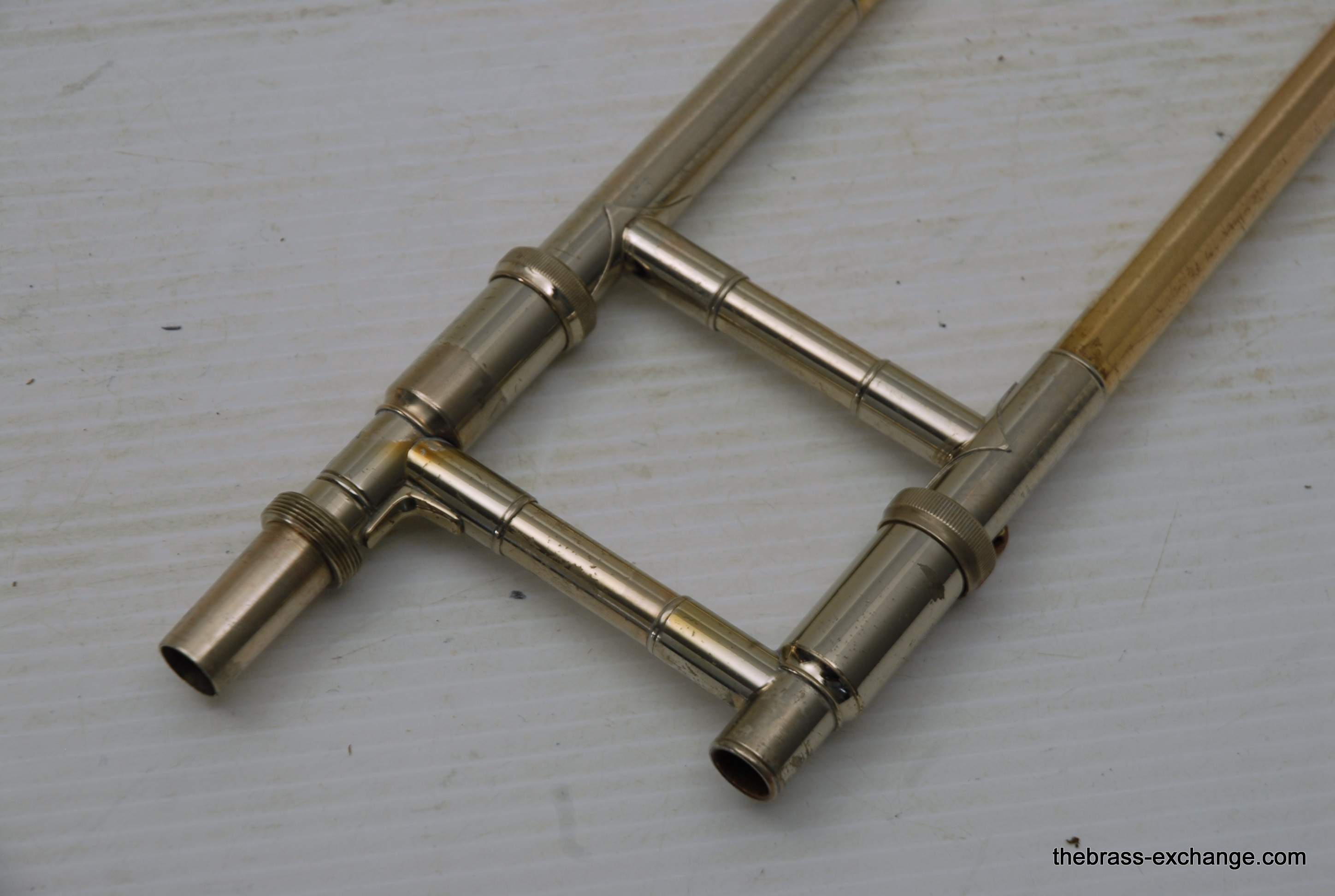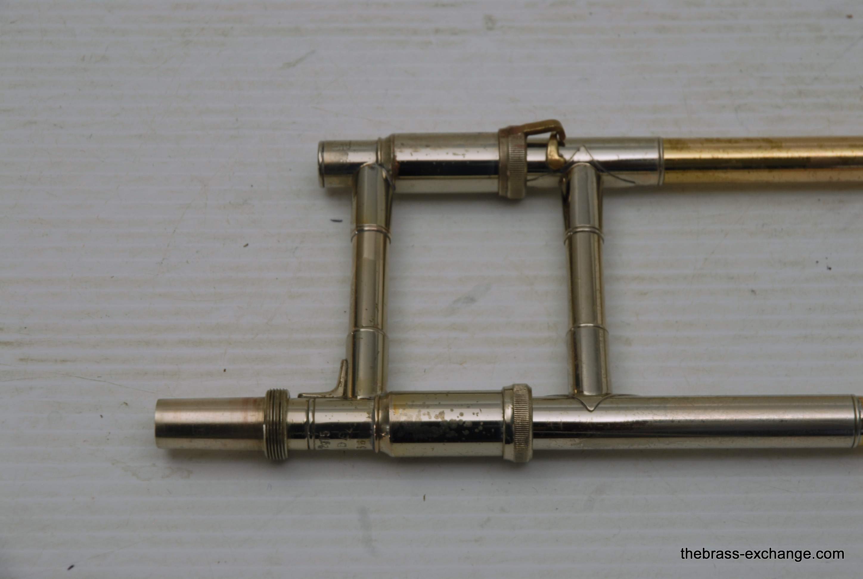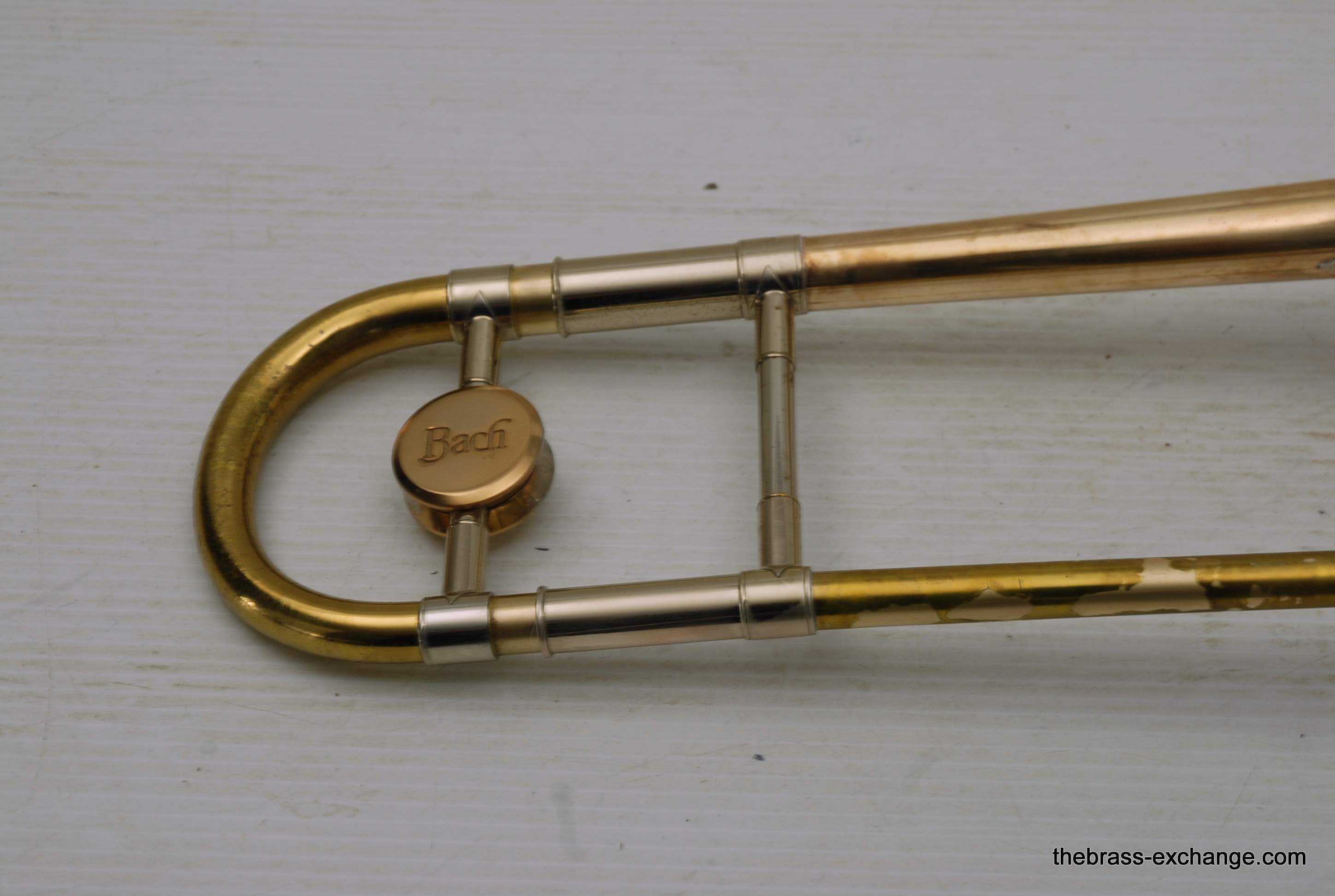 Bach 36G Corporation era. Bell section most likely made in the 70’s, and is unlacquered except for inner bell, which is lacquered. Is a gorgeous bell section and plays perfectly. Handslide is later made early 90’s. Both bell and slide fit and play excellent together. No issues with tubes or red-rot. The photo’s of the slide endcrook have a gold brass look, but it is standard yellow. The tint is from the chemical bath, dip. It will turn to a more yellow color with time. I like it the way it is. This would be a great 36 for any serious gold brass bell player looking to get into this size. Plays rich and warm as one would expect. No service need to improve playability. Super crisp French style case. In-stock.