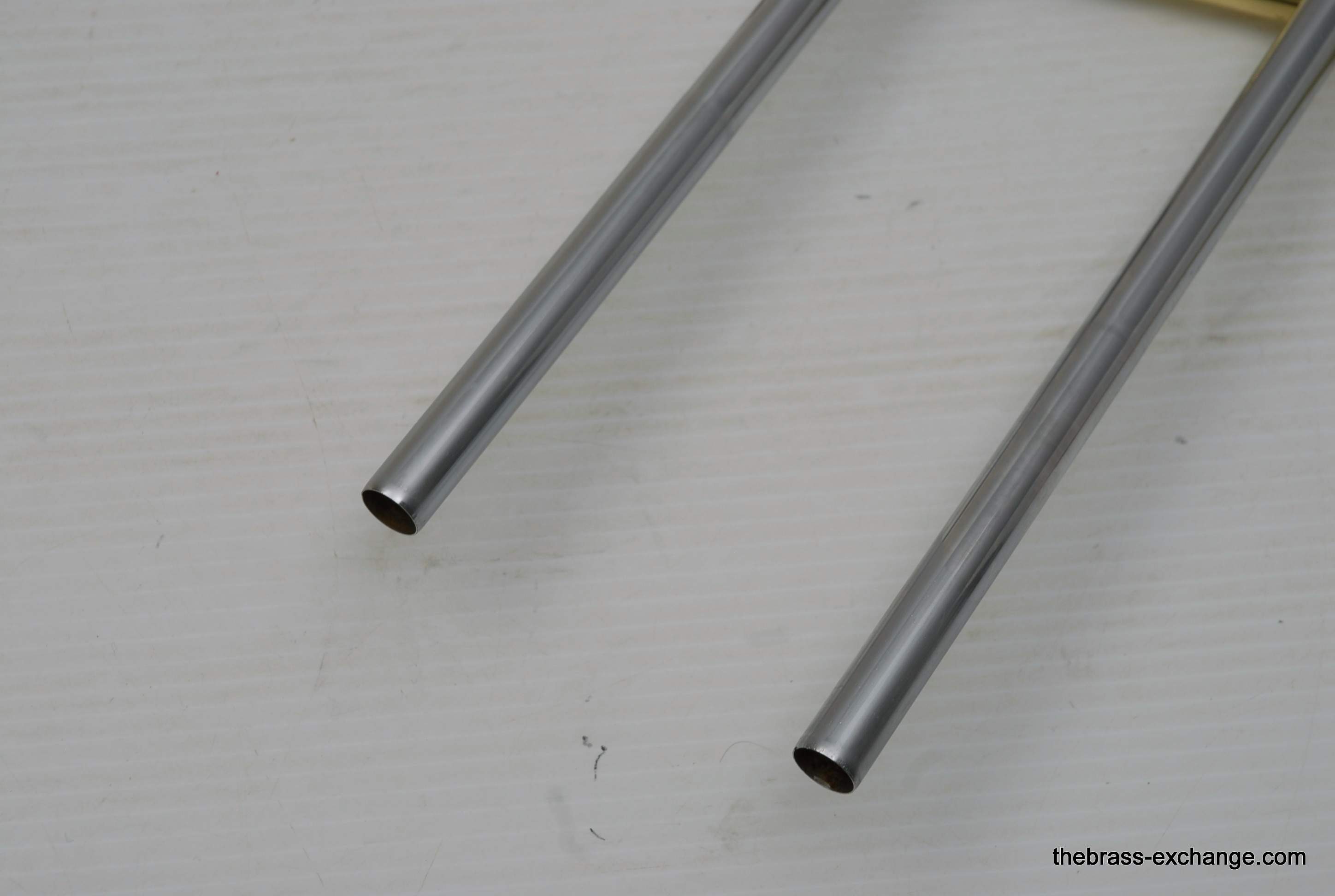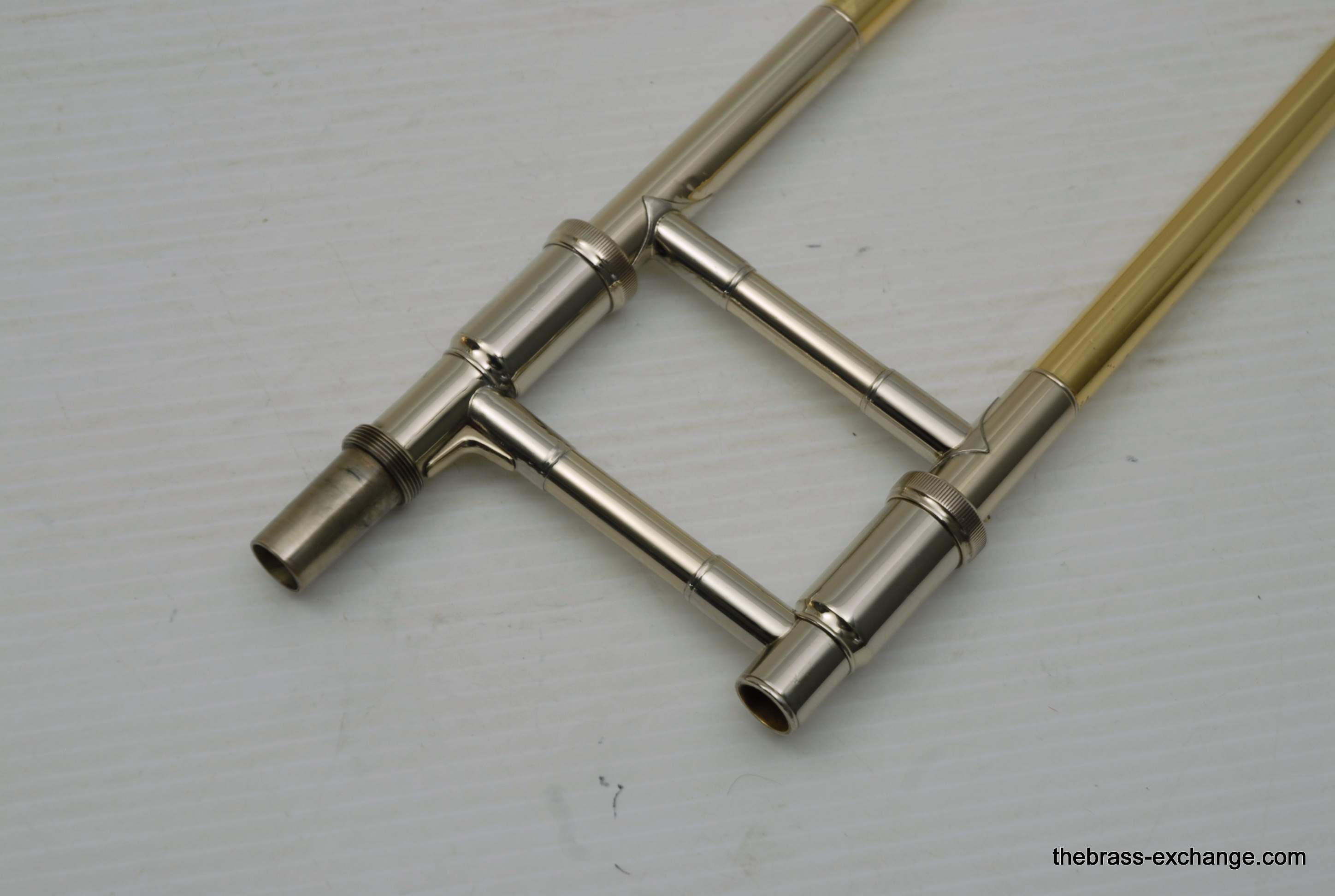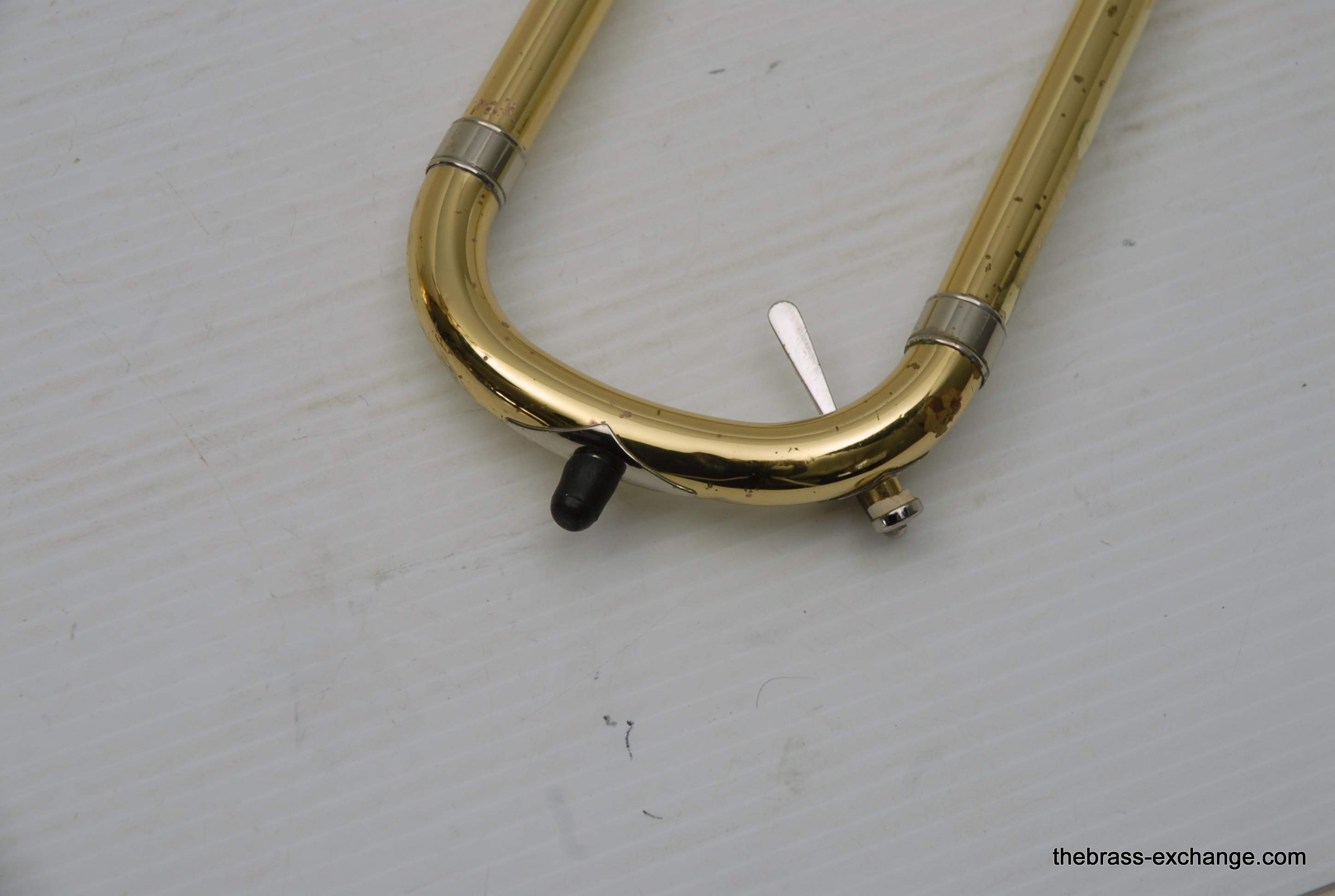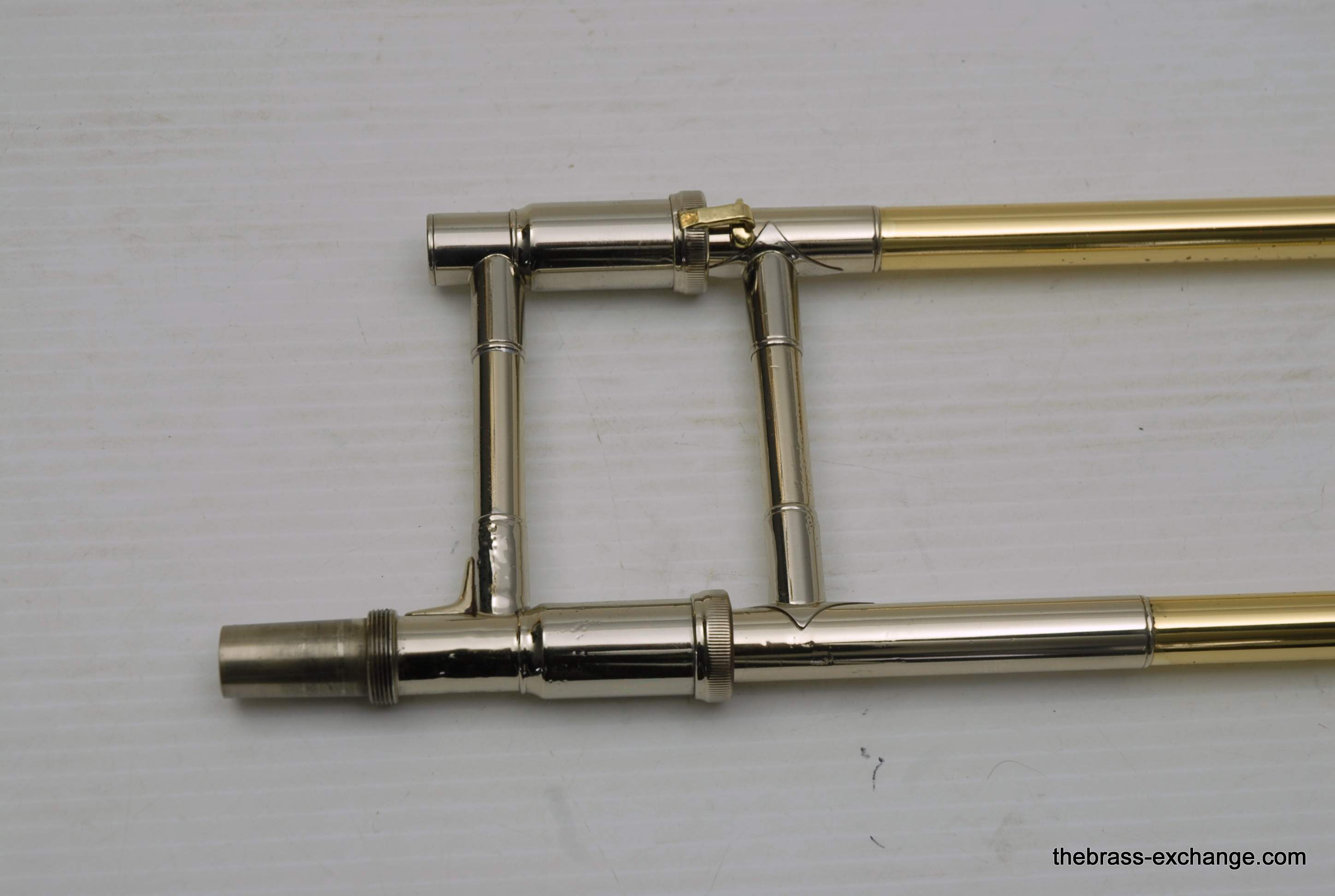 Areas of slide bracing and the nickel silver neck/slide receiver were re-lacquered to protect against prior surface pitting, and these parts presented cleanly after service.