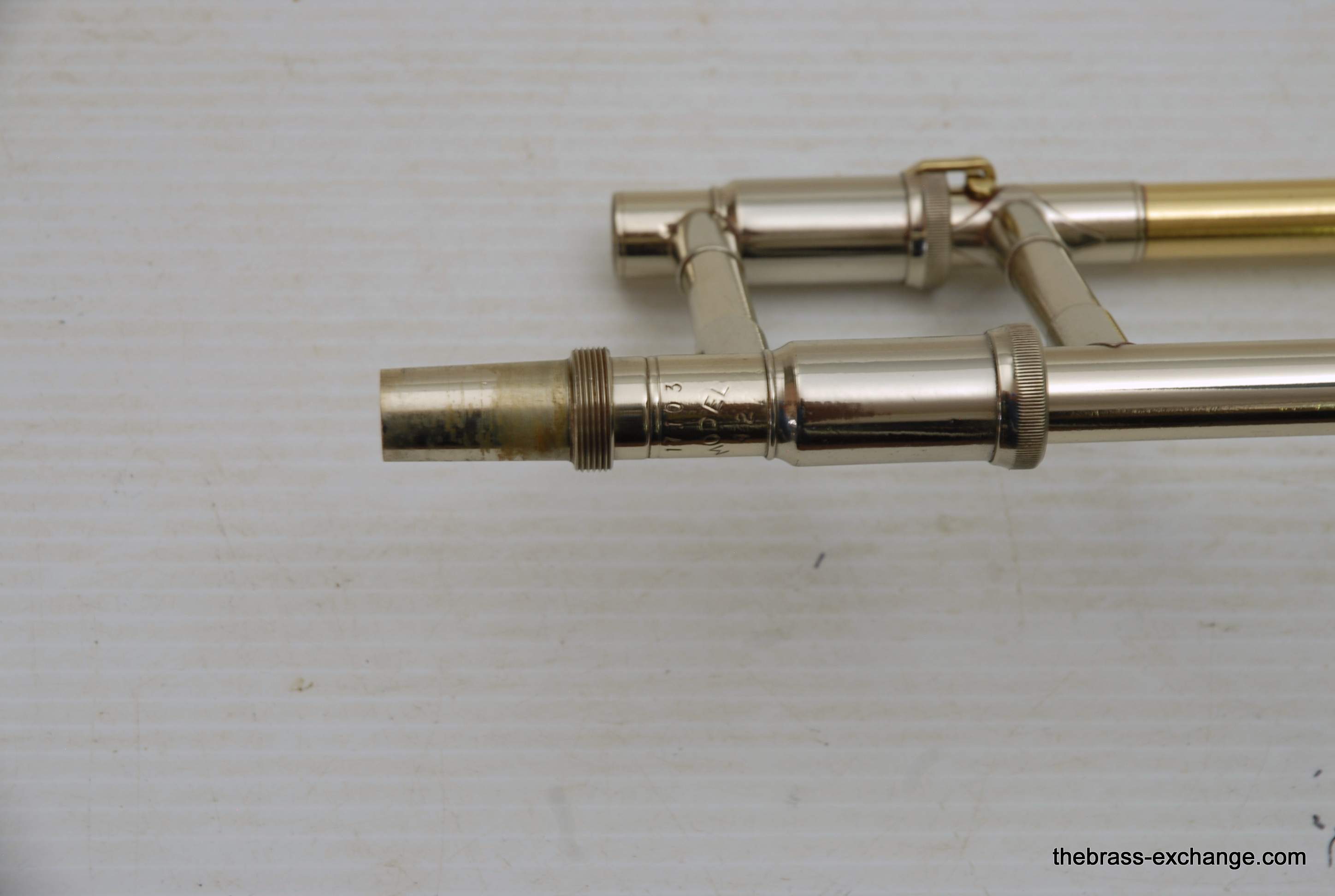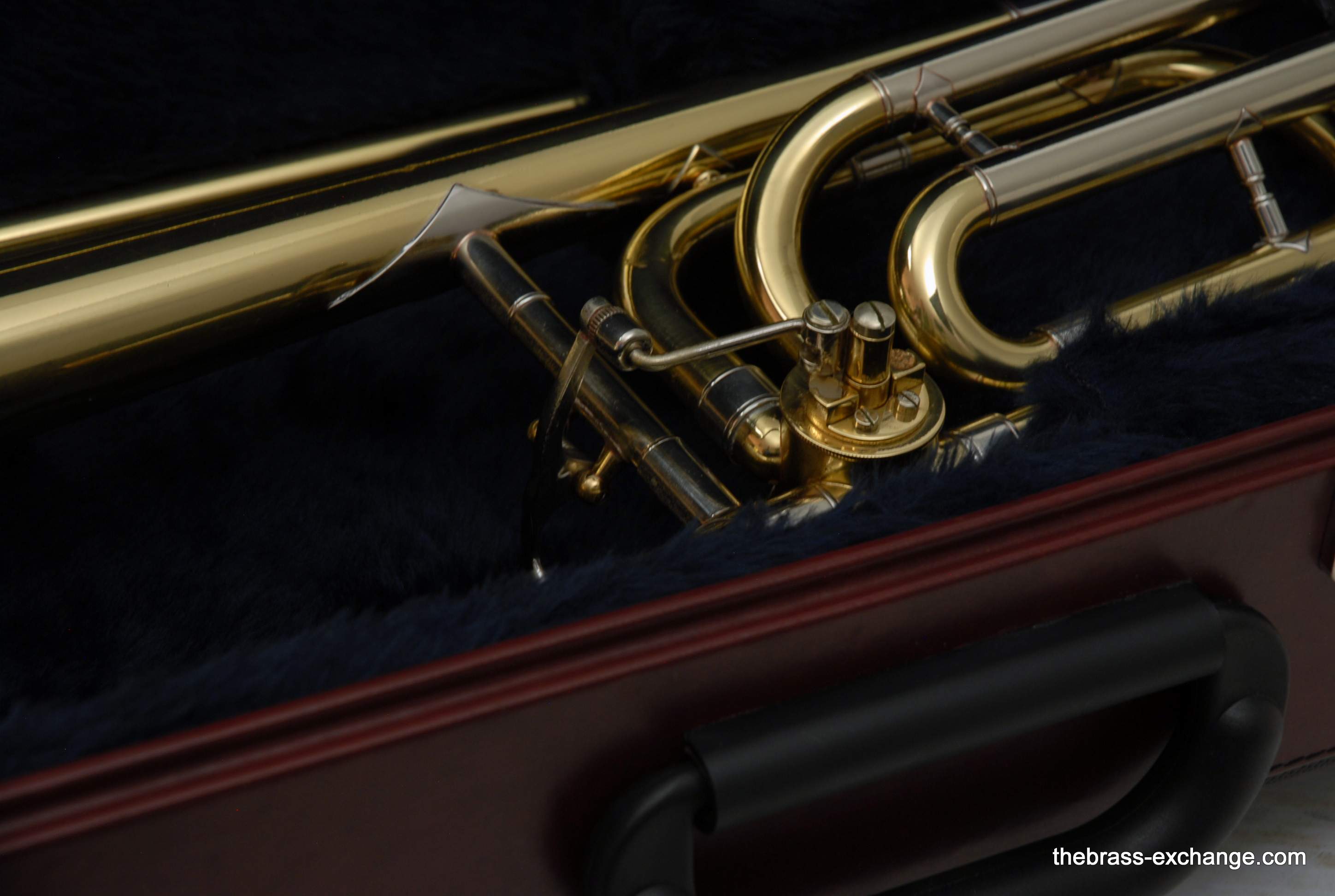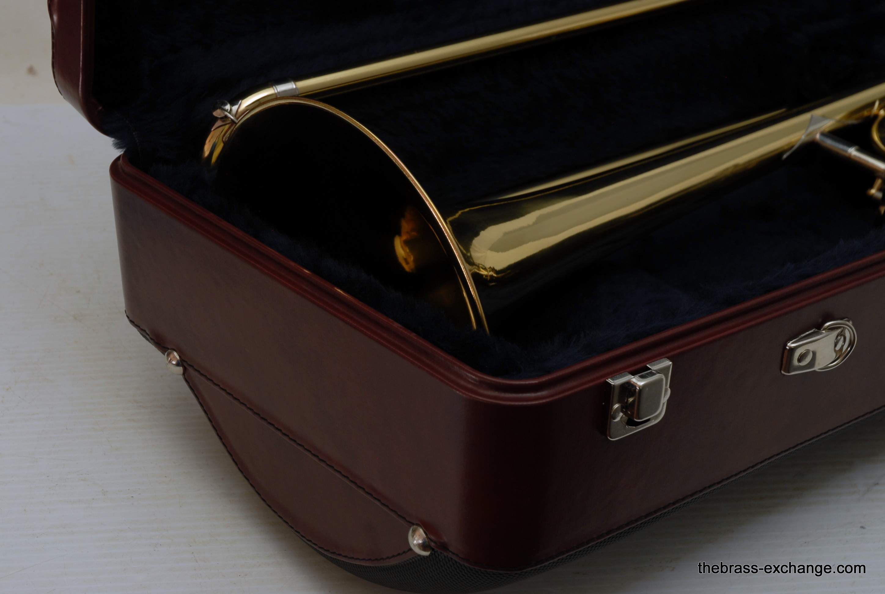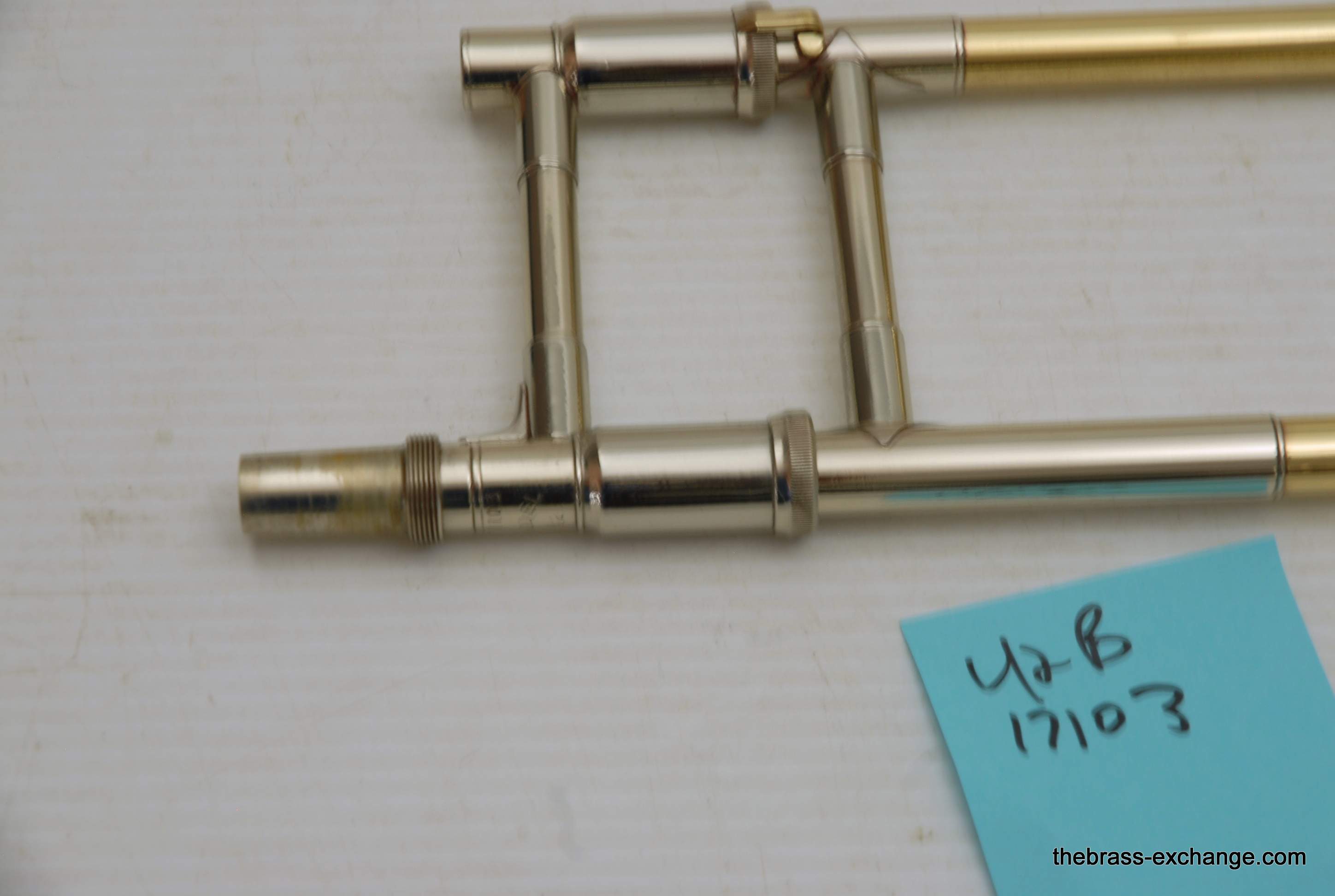 Bach 42B Corporation Era Make, Vintage 1974. SN 17103.  This is the classic 42B with 8.5" one-piece yellow brass bell, traditional rotor, standard weight slide.  Has had full shop service, including chemical bath, rotor service, slide adjusted.  Has had a previous new lacquer job, excellent quality work.   This horn plays proper, sounds gorgeous and looks terrific.  The slide is very good, falls freely with gravity.  High level players with super selective slide expectations may feel that a slide tech could get a little more out of it, but it is totally playable as is.  It's not a 10 out of 10 currently, but has potential, probably an 8 right now.  If you really like the horn you could take it to your slide guy for additional set up, or send it in to us and will do it for an additional cost.  Includes a new Marco Magi Lighweight Series Case with back pack strap option, included.  This is a one of a kind case and is new, just arrived from Italy.  It has the NN series main panels and burgundy top and bottom panels.  Is a gorgeous lightweight hard shell case that will not disappoint, is considerably lighter than the NN custom series.  Overall it is a great horn.  Would be ideal for an advancing player looking for a first pro level horn, or a serious Bach collector player looking for something special.  In-stock for immediate delivery.