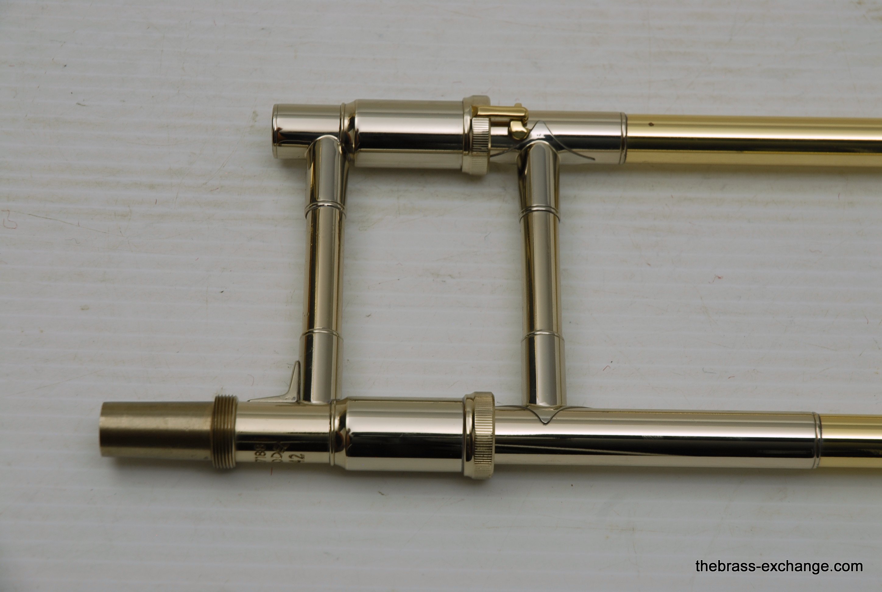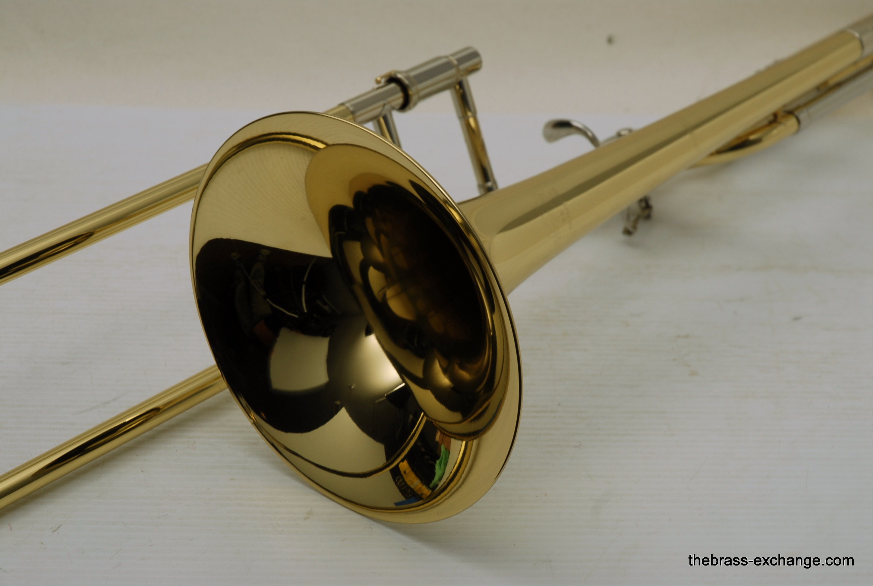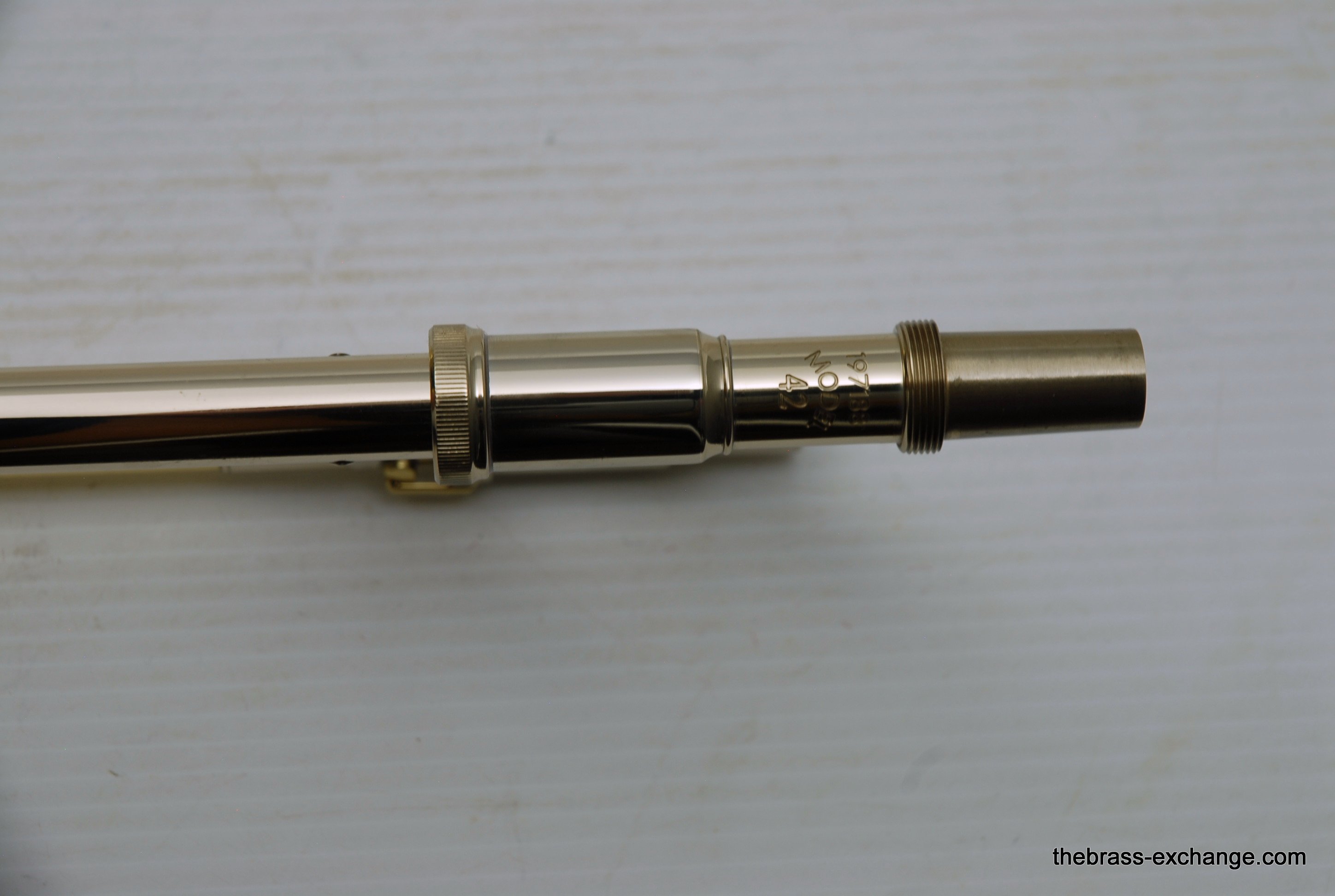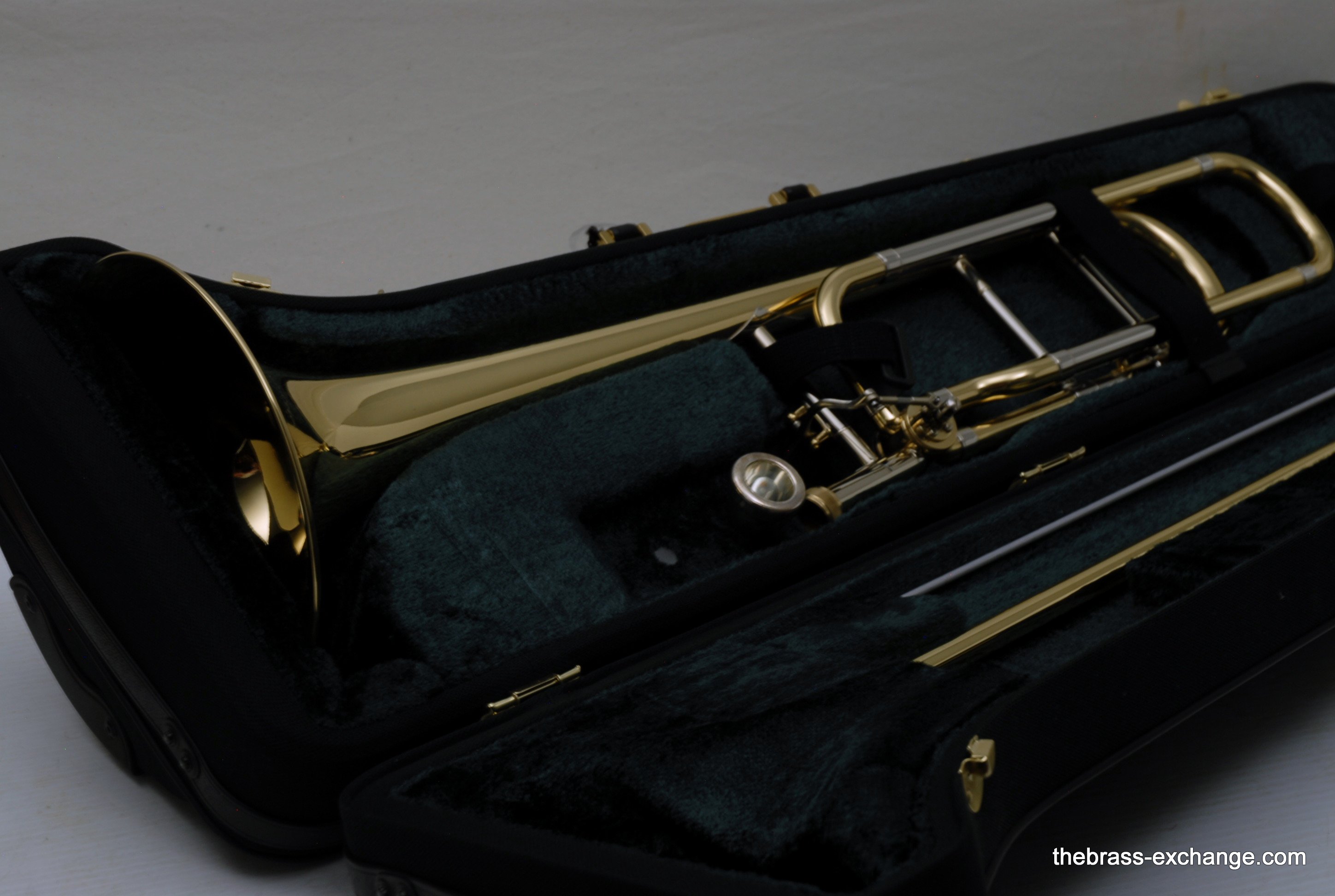 Bach 42BO with S/N 197xxx, this is the classic 42BO large bore tenor. Has 8.5" Yellow brass bell, .547 bore standard weight slide. Has not been used, really at all. You can tell once you look at it. Even the case handle still has the plastic on it. The case looks different than most of the Bach cases becuase this case was only available outside the U.S.  We checked it over, play tested, and conclude no issues with valve, slide, or lacquer. Any player looking for savings on a new 42BO will appreciate this one. Many Bach players today feel that the quality of Bach make has been inconsistent over the past few years. This one is most likely late 1990's and the quality is excellent. Once you play it you know. Handslide is super straight and without defect. Valve section is smooth and quiet. It's a good player. A new 42BO sells new today for $3400, some retailers offer a 10% on line discount, that makes the net cost $3060 plus tax. We believe that this is an excellent value at $2095 for a new 42BO. In-stock for immediate delivery.