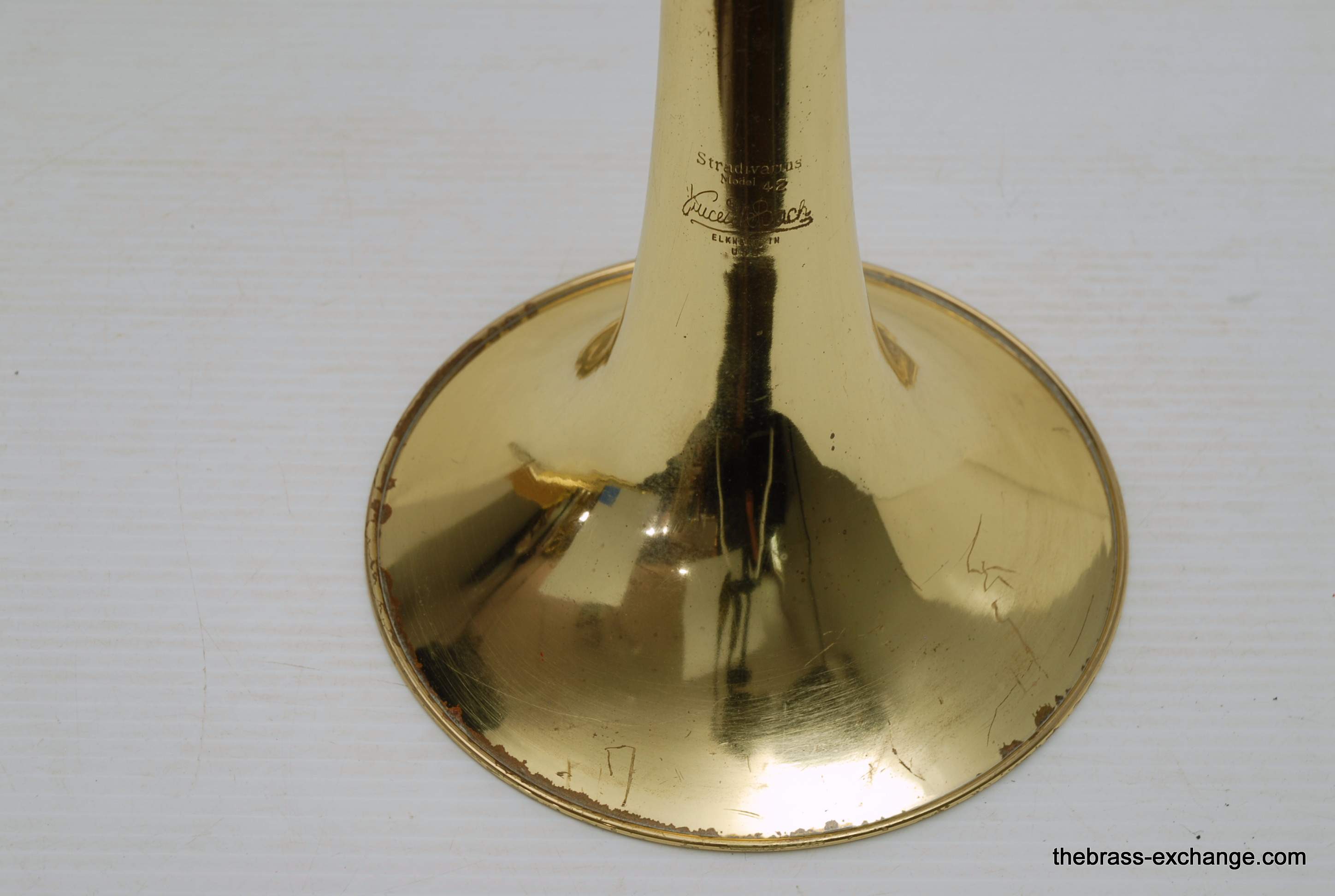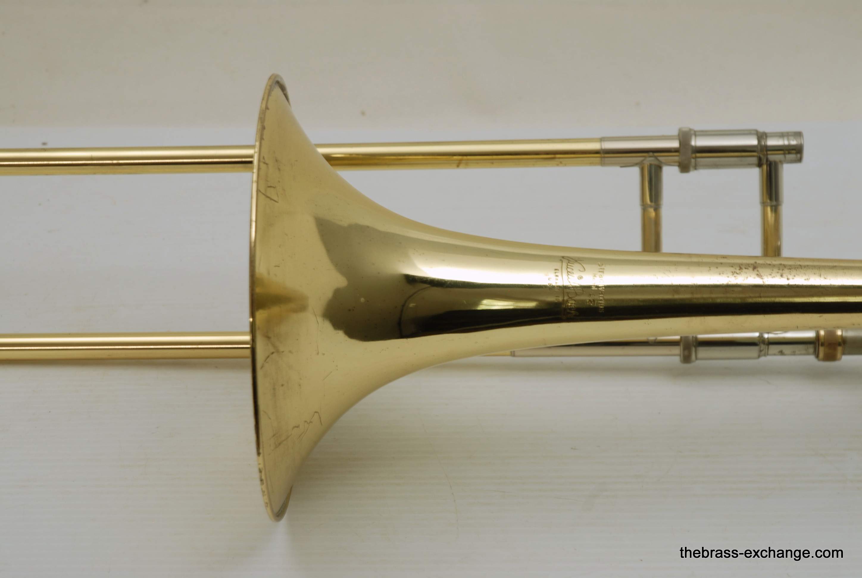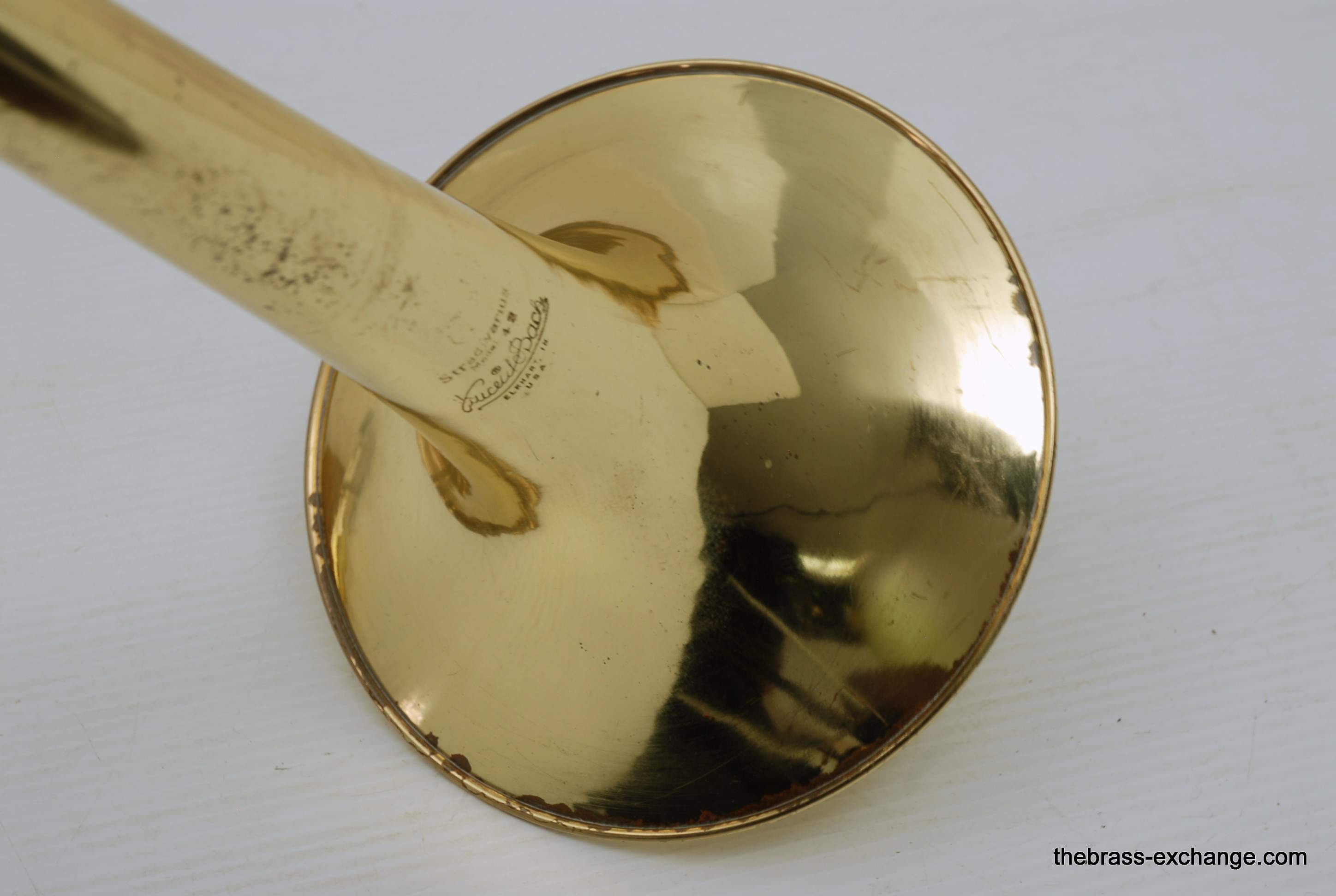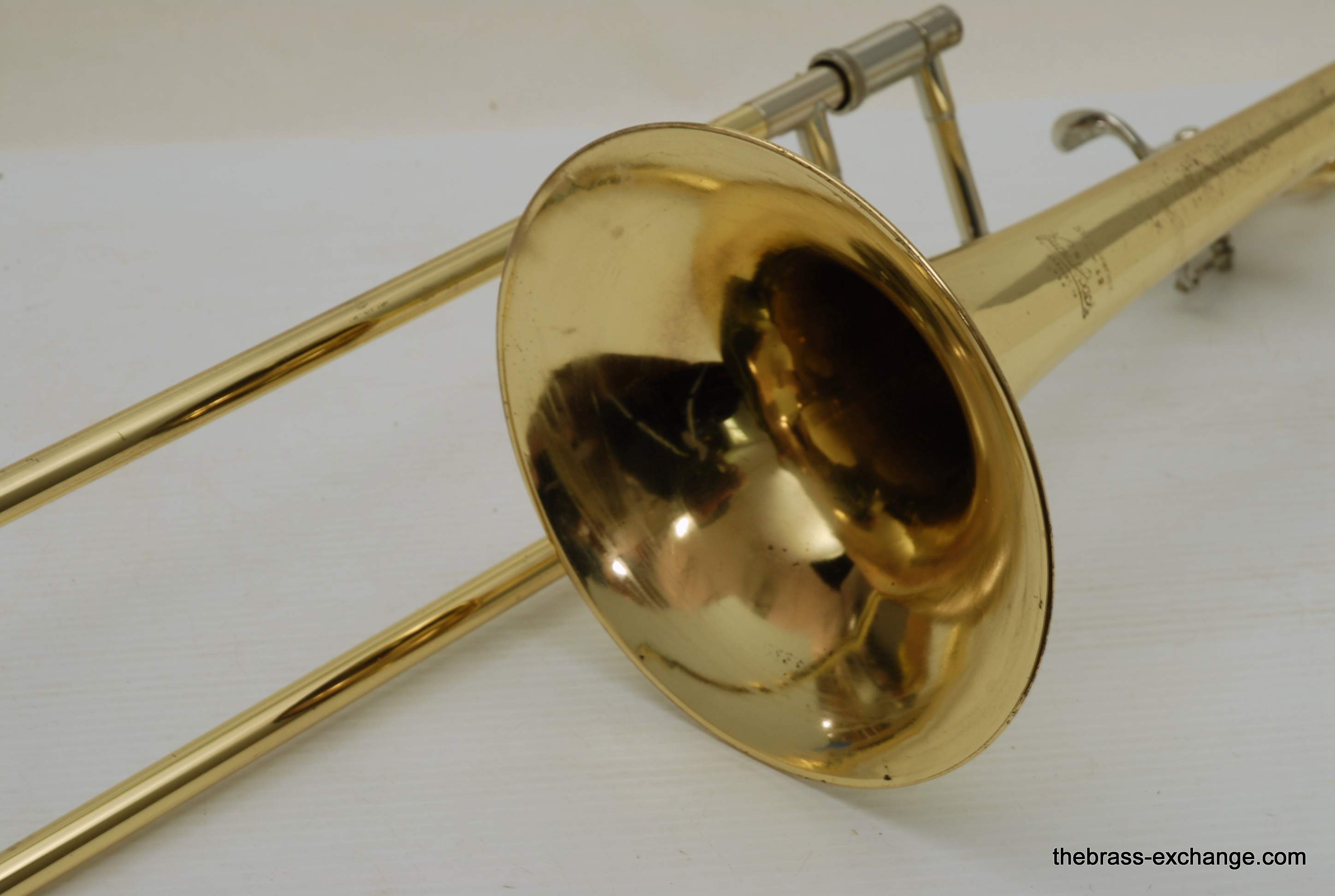 Bach 42BO Large Bore Tenor, Open Wrap Model from the mid 1990's.  This is the classic 42BO that is most reccomended by band directors and private teachers.  Has the classic 42B 8.5" yellow brass bell, standard weight large bore .547 handslide, and open wrap rotor.  Has had full shop service, chemical bath, relacquered F tuning slide, and handslide endcrook.  All other parts are original and original lacquer.  This is a very straight 42BO without any mechanical or issues with playability.  Scratches and worn look to the lacquer is the only issue, of course reflected in the price.  Comes with original case and mouthpiece.  Would be an excellent choice for a first pro-level large bore tenor for an advancing student, or any player looking to play a 42BO.  In stock for immediate delivery.