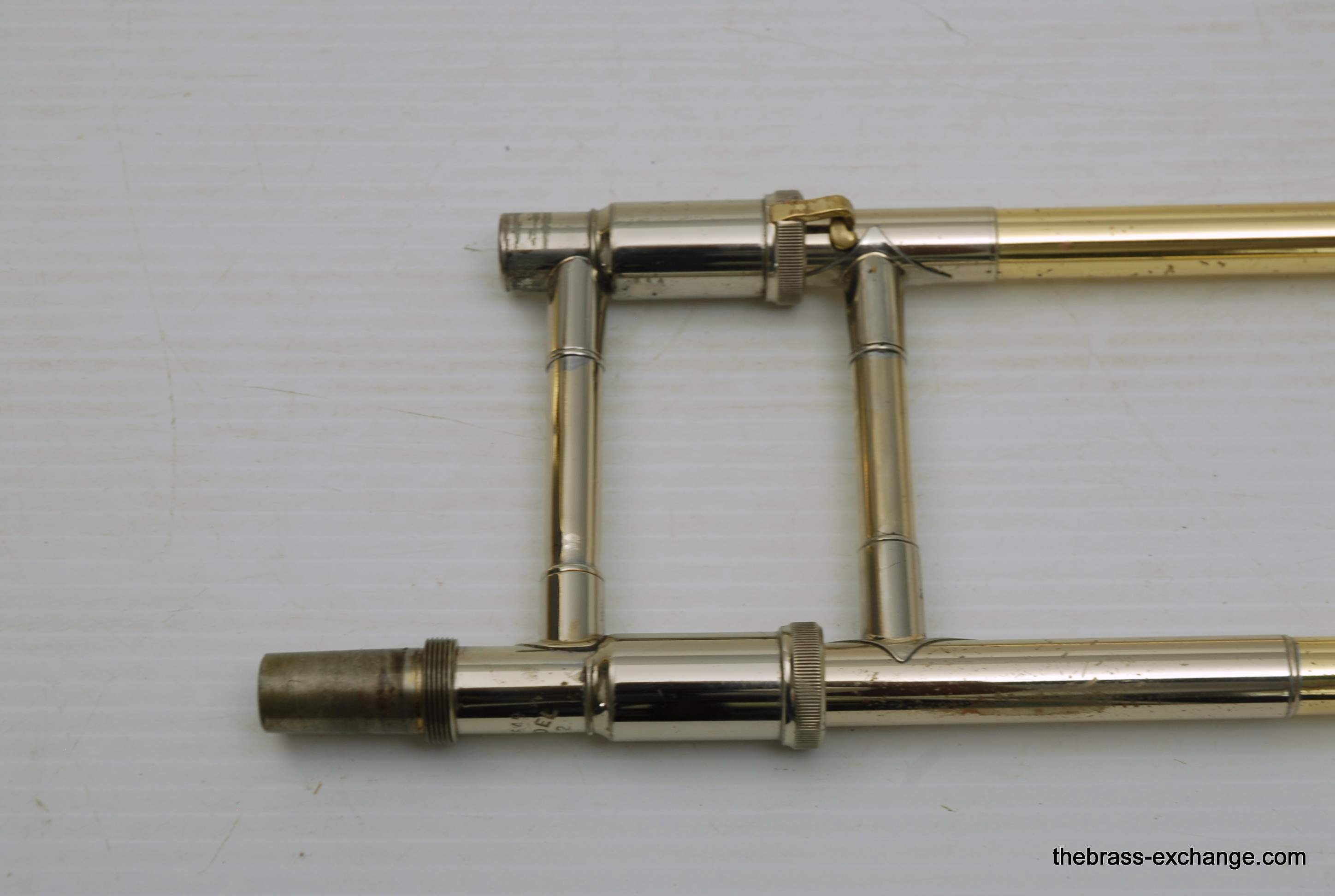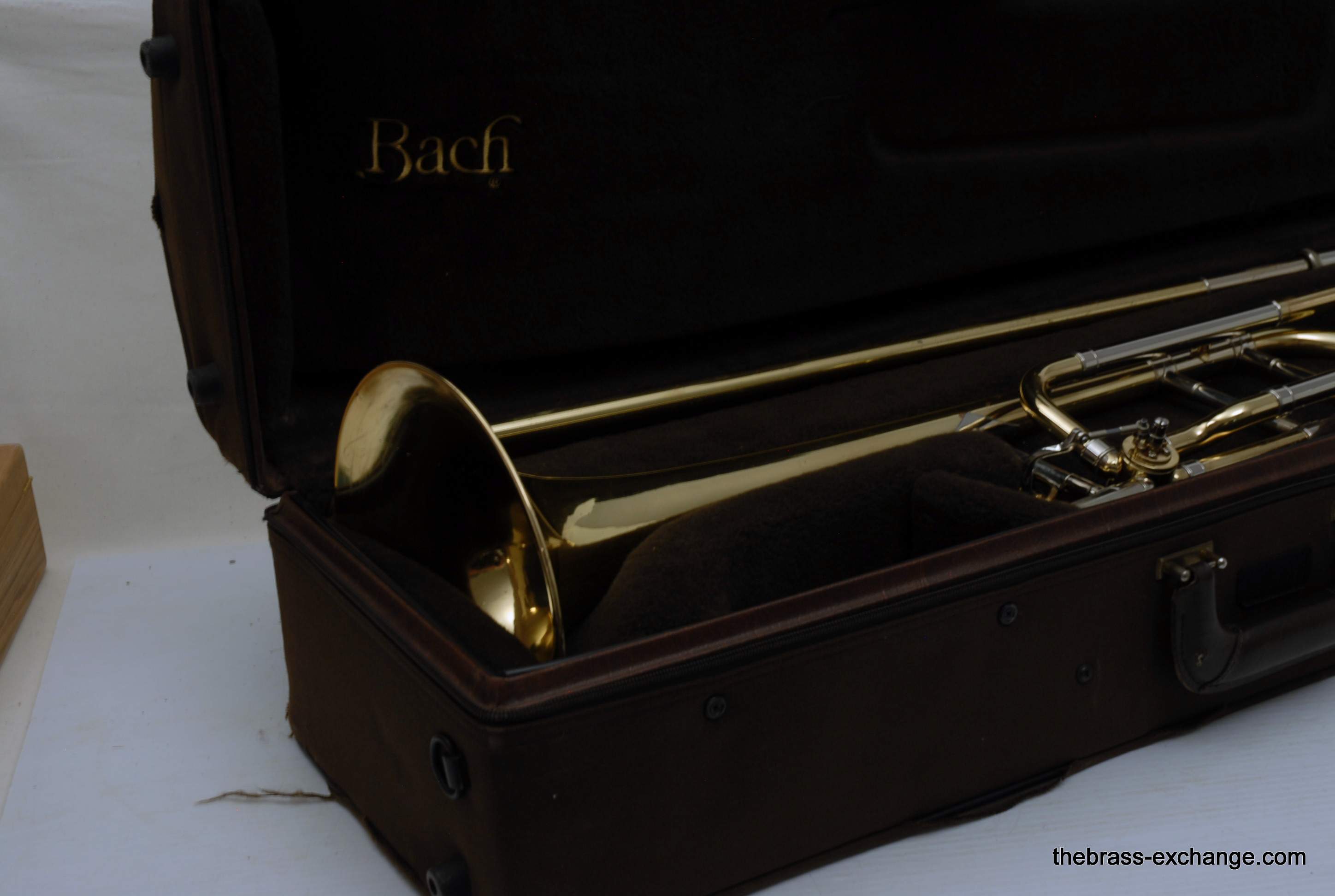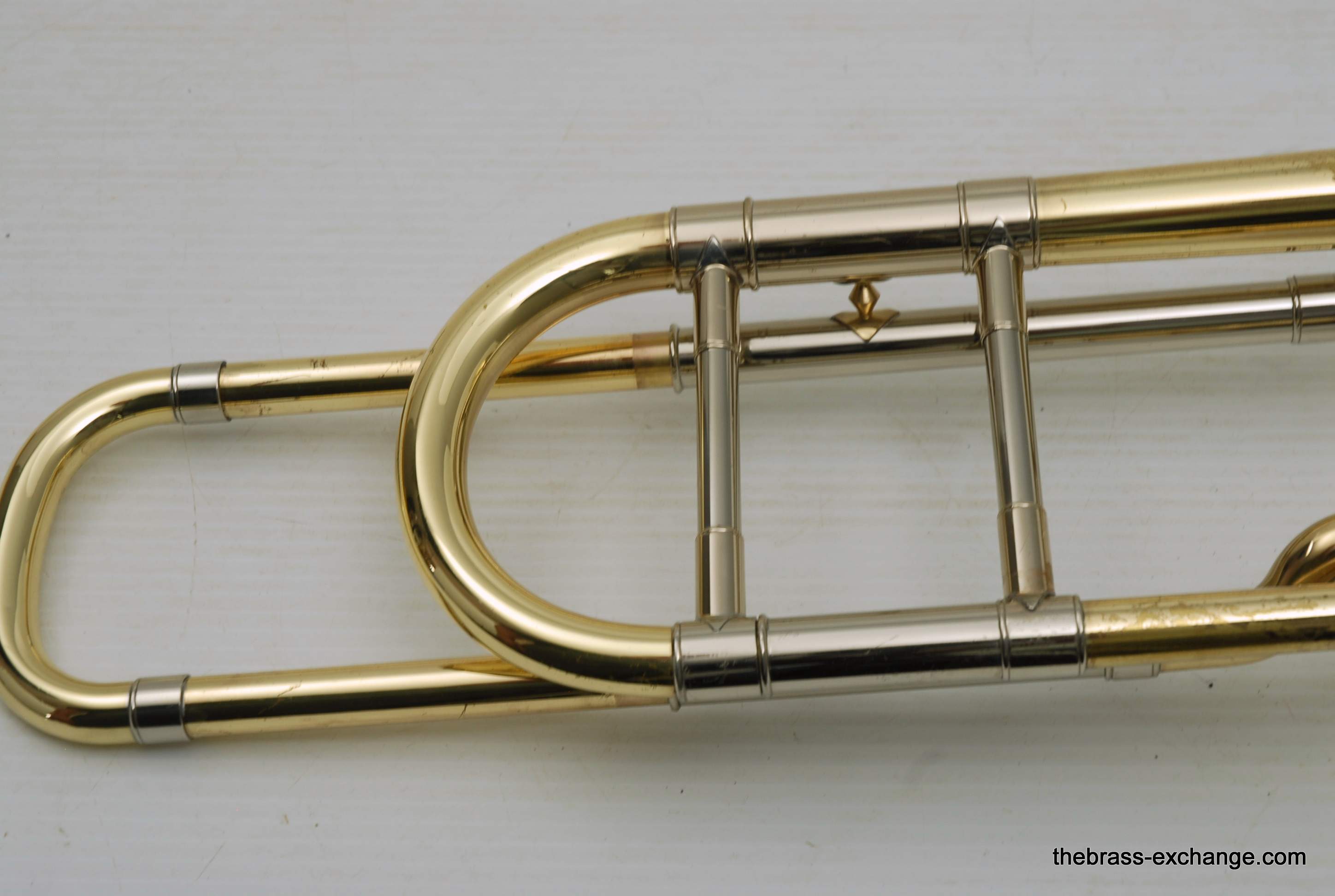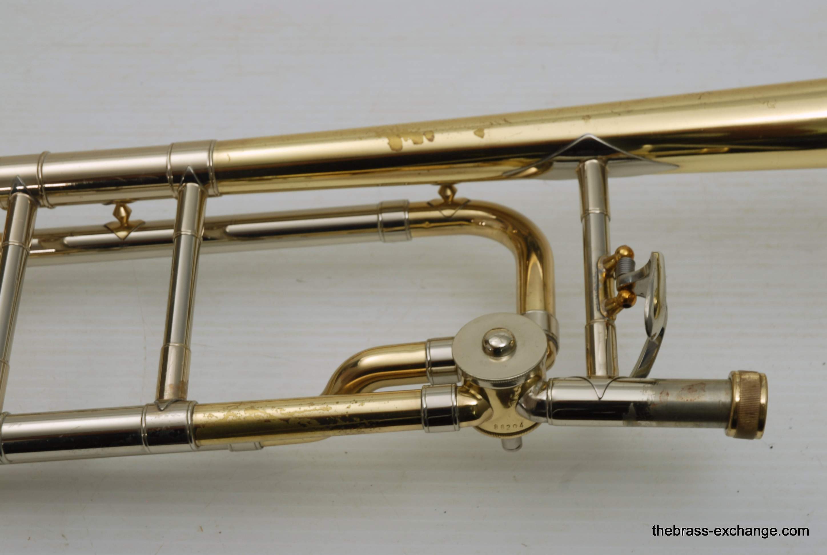 Bach 42BO Large Bore Tenor, Open Wrap Model from the mid 1990's.  This is the classic 42BO that is most reccomended by band directors and private teachers.  Has the classic 42B 8.5" yellow brass bell, standard weight large bore .547 handslide, and open wrap rotor.  Has had full shop service, chemical bath, relacquered F tuning slide, and handslide endcrook.  All other parts are original and original lacquer.  This is a very straight 42BO without any mechanical or issues with playability.  Scratches and worn look to the lacquer is the only issue, of course reflected in the price.  Comes with original case and mouthpiece.  Would be an excellent choice for a first pro-level large bore tenor for an advancing student, or any player looking to play a 42BO.  In stock for immediate delivery.