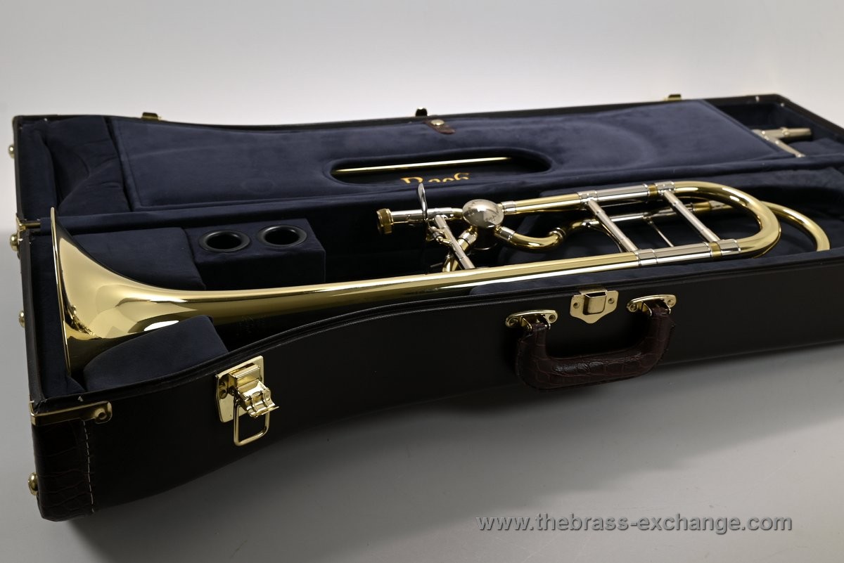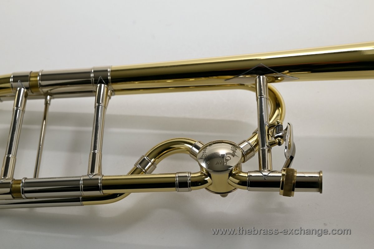 This is a Bach 42BOF large bore tenor trombone with the Meinlschmidt-designed Open Flow rotor valve and European-style open wrap F-attachment. Built as an upgrade to the standard 42BO, this model offers a smoother, freer-blowing response and quieter valve action that many professional players prefer for orchestral and symphonic performance.