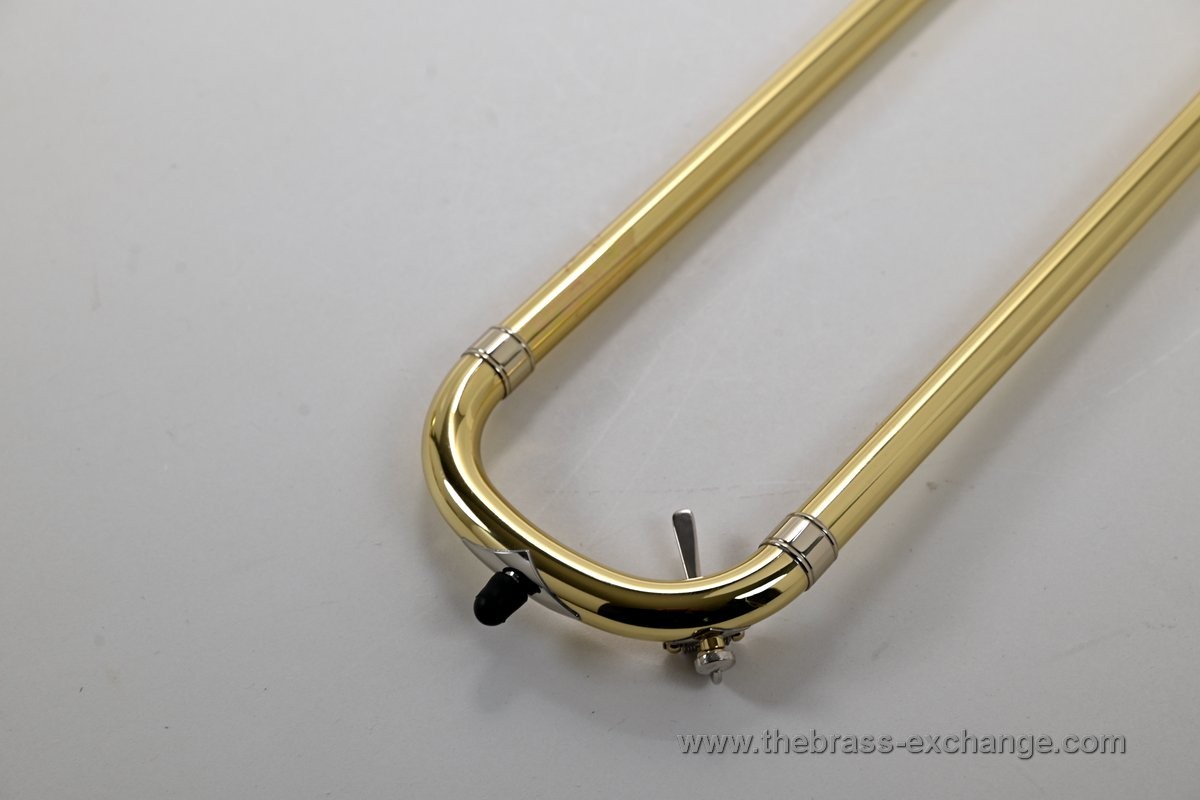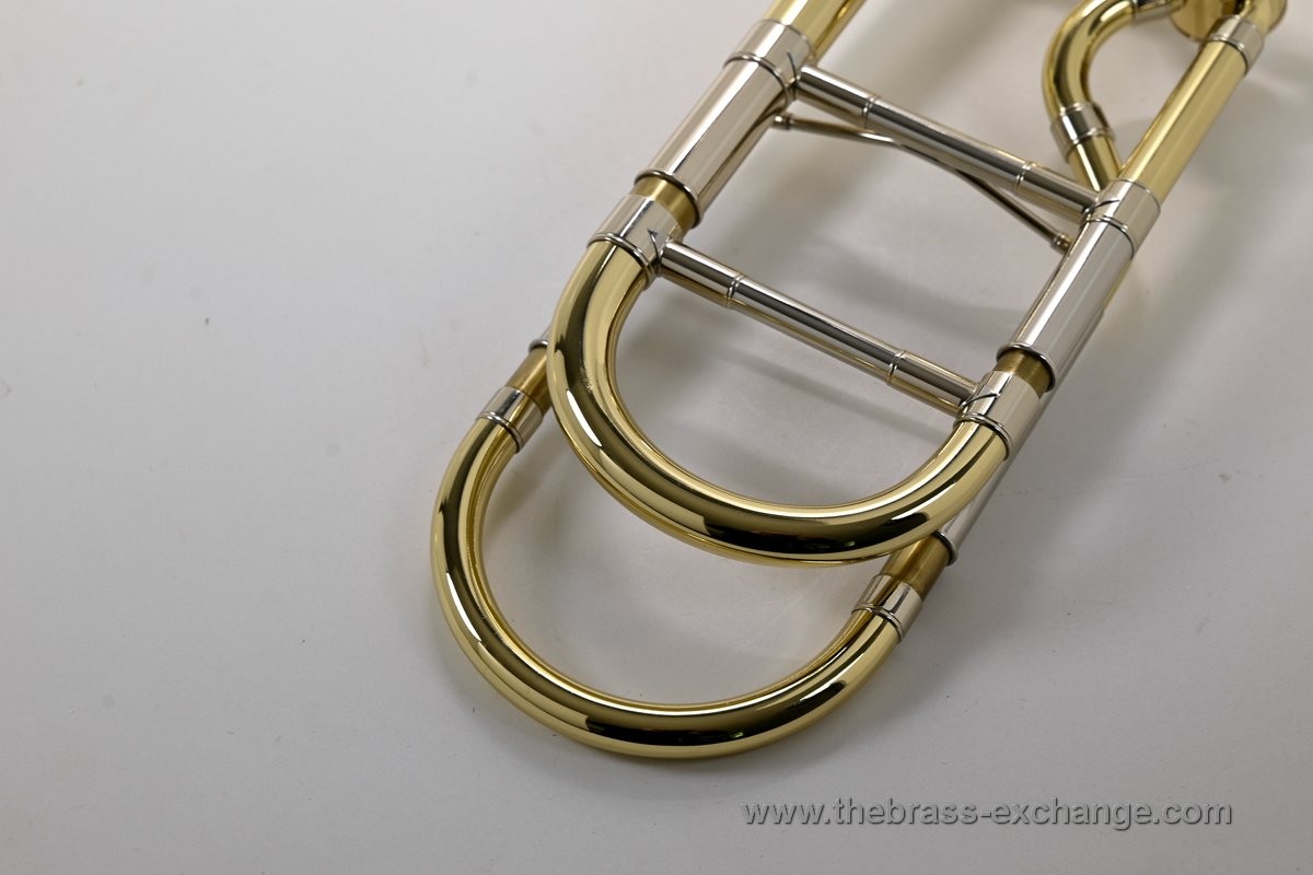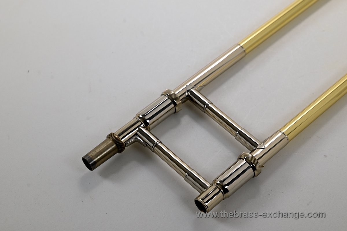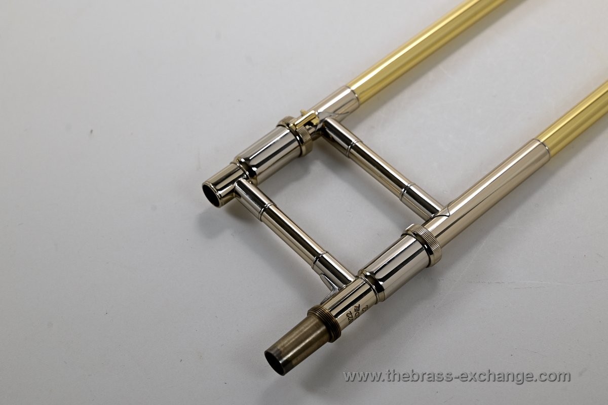 It features the classic one-piece 8.5" yellow brass 42 bell finished in clear lacquer, paired with a standard-weight .547 handslide. The slide has been professionally set up in-shop for optimal action and responsiveness. The inner tubes are clean and straight, with no plating loss or alignment issues.