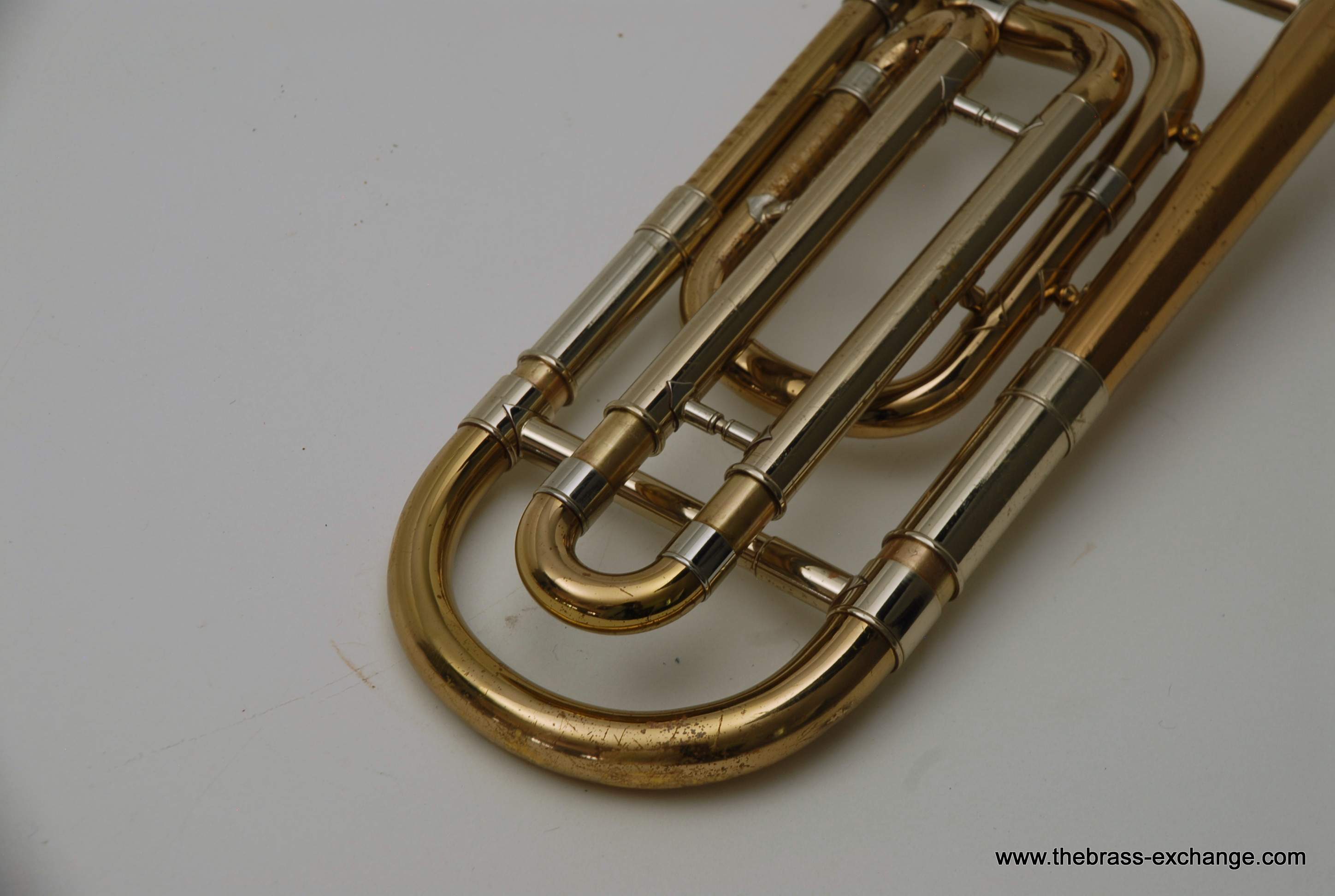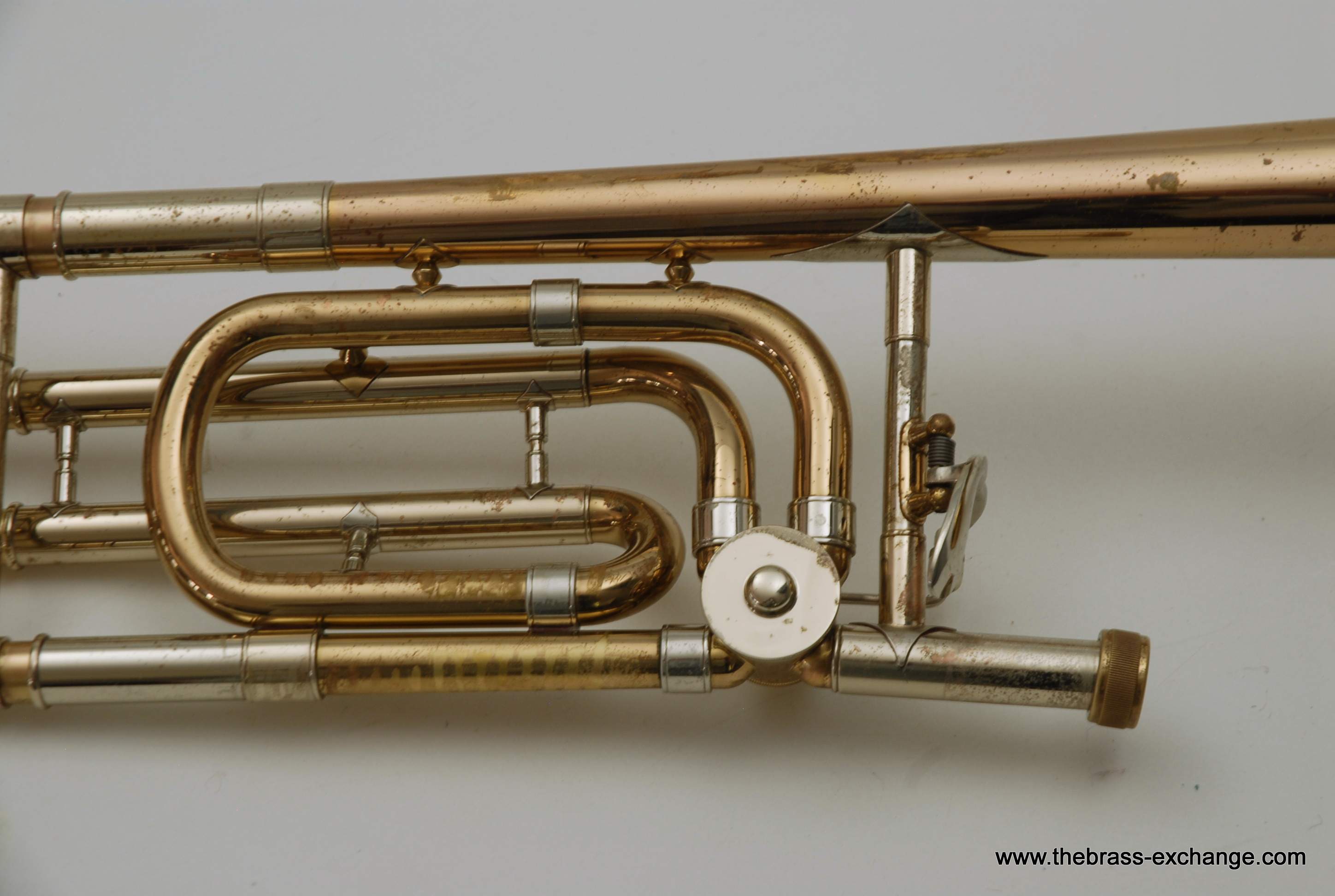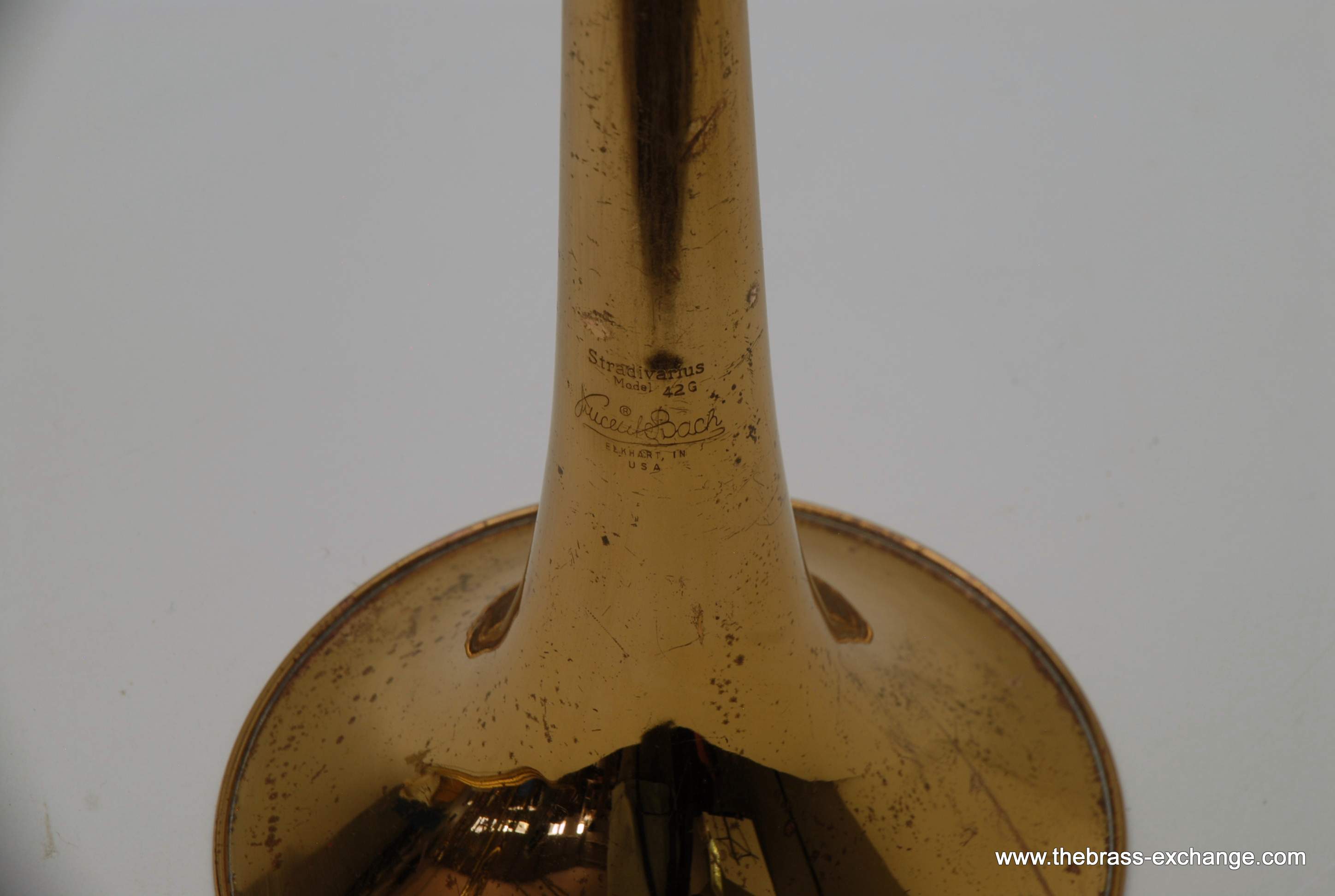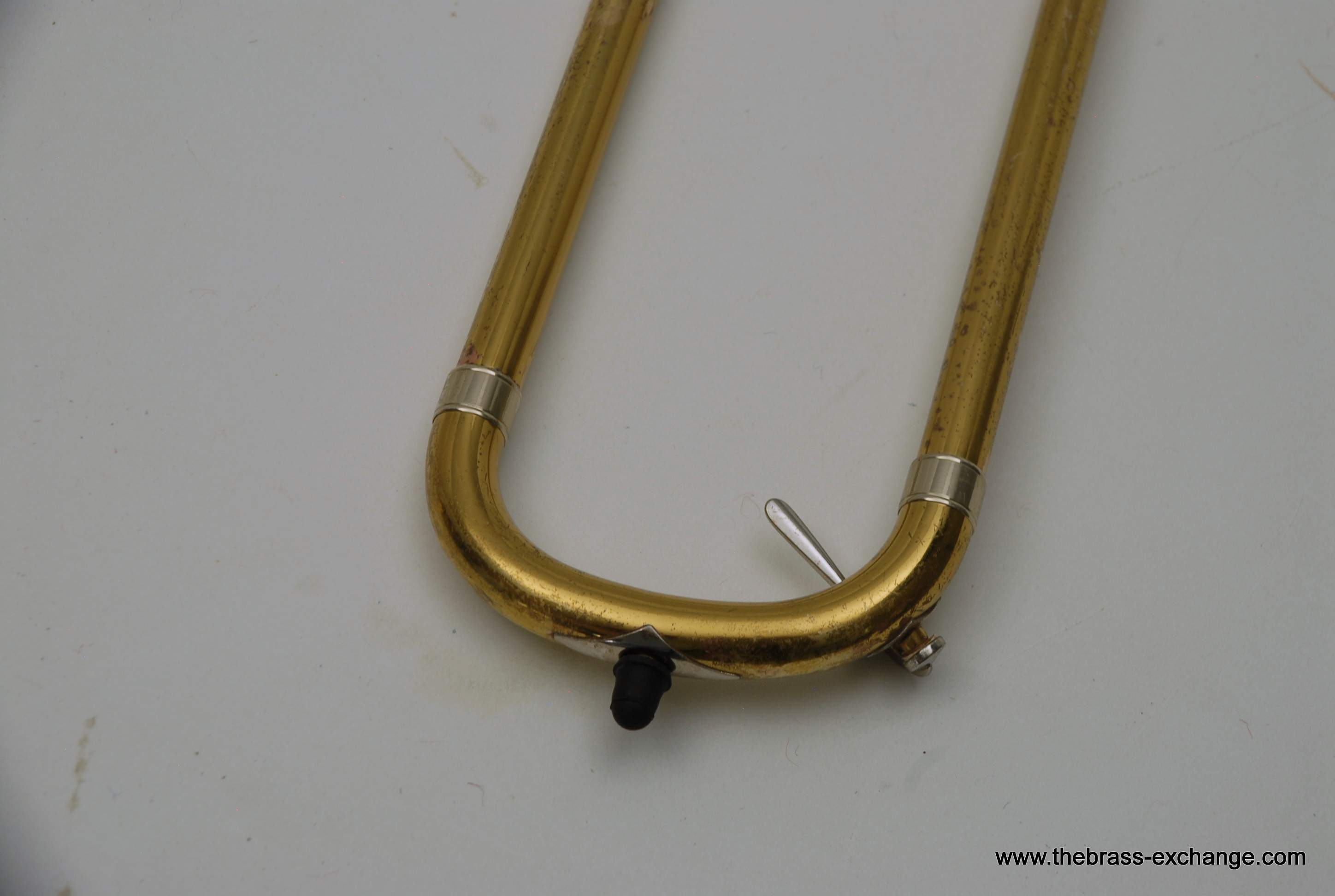 This particular 42G showed signs of a working life. It had considerable lacquer wear throughout, along with evidence of prior repair work. The bell had a noticeable crease in the past that was professionally improved during service here, leaving the instrument structurally solid and visually presentable. A small ding was also noted on the nickel cork barrel of the slide, though it did not extend into the inner tubes and had no effect on playability.