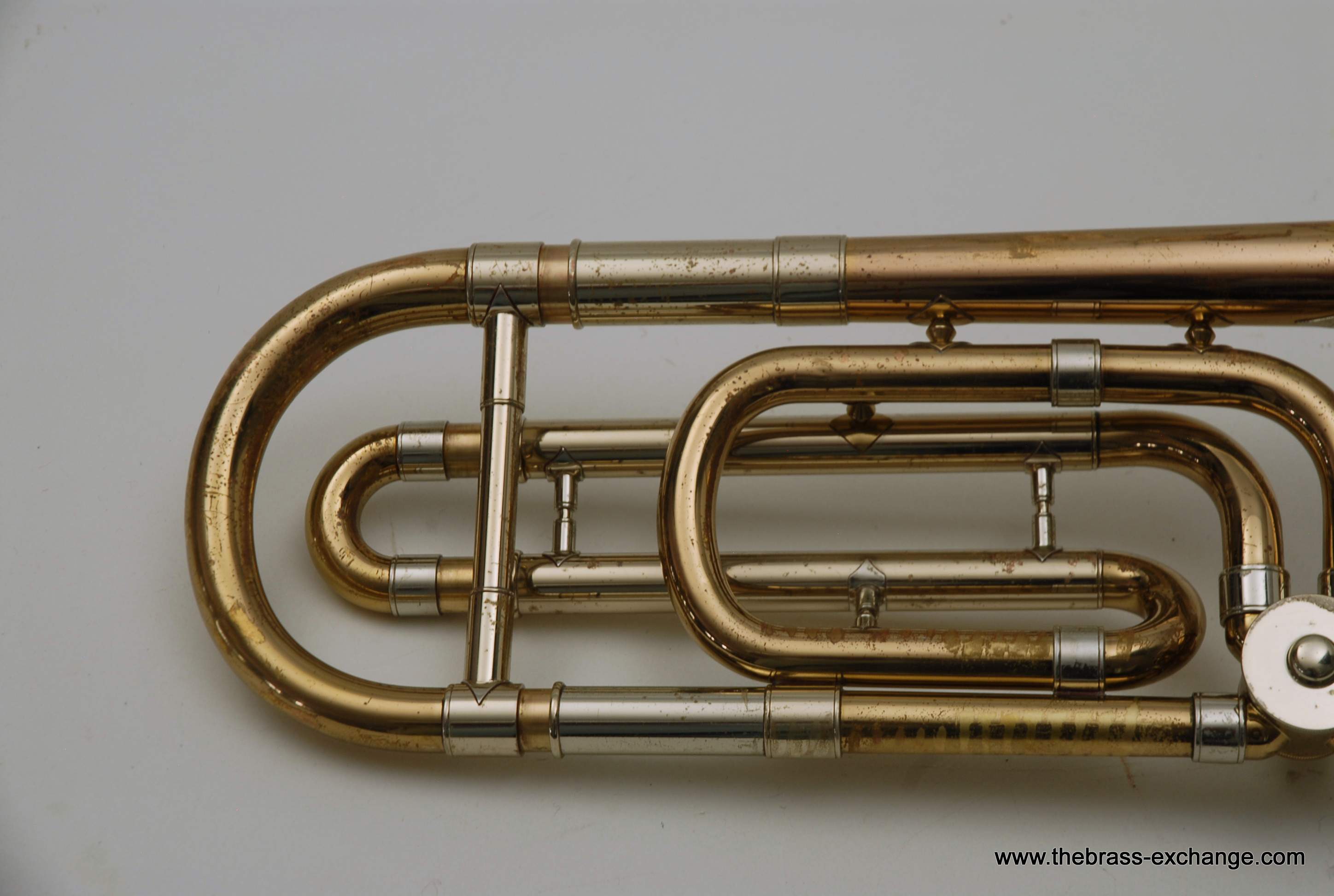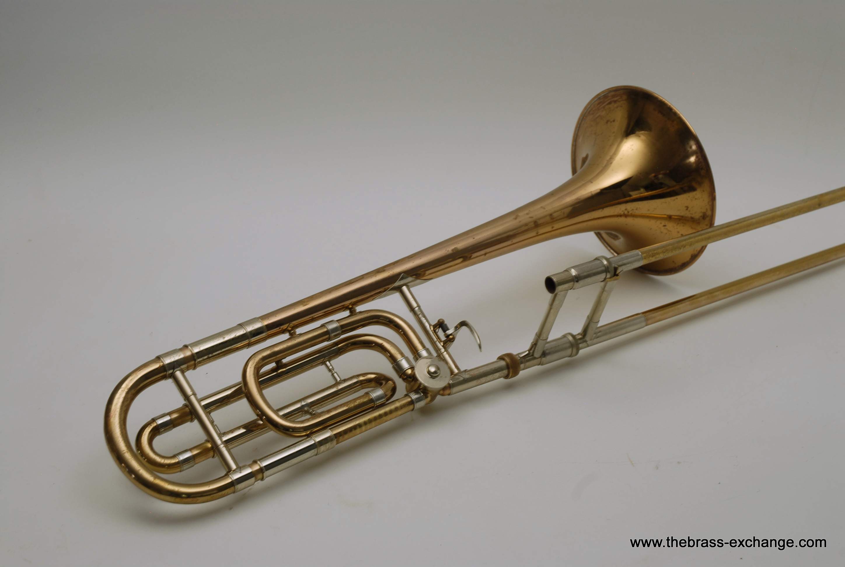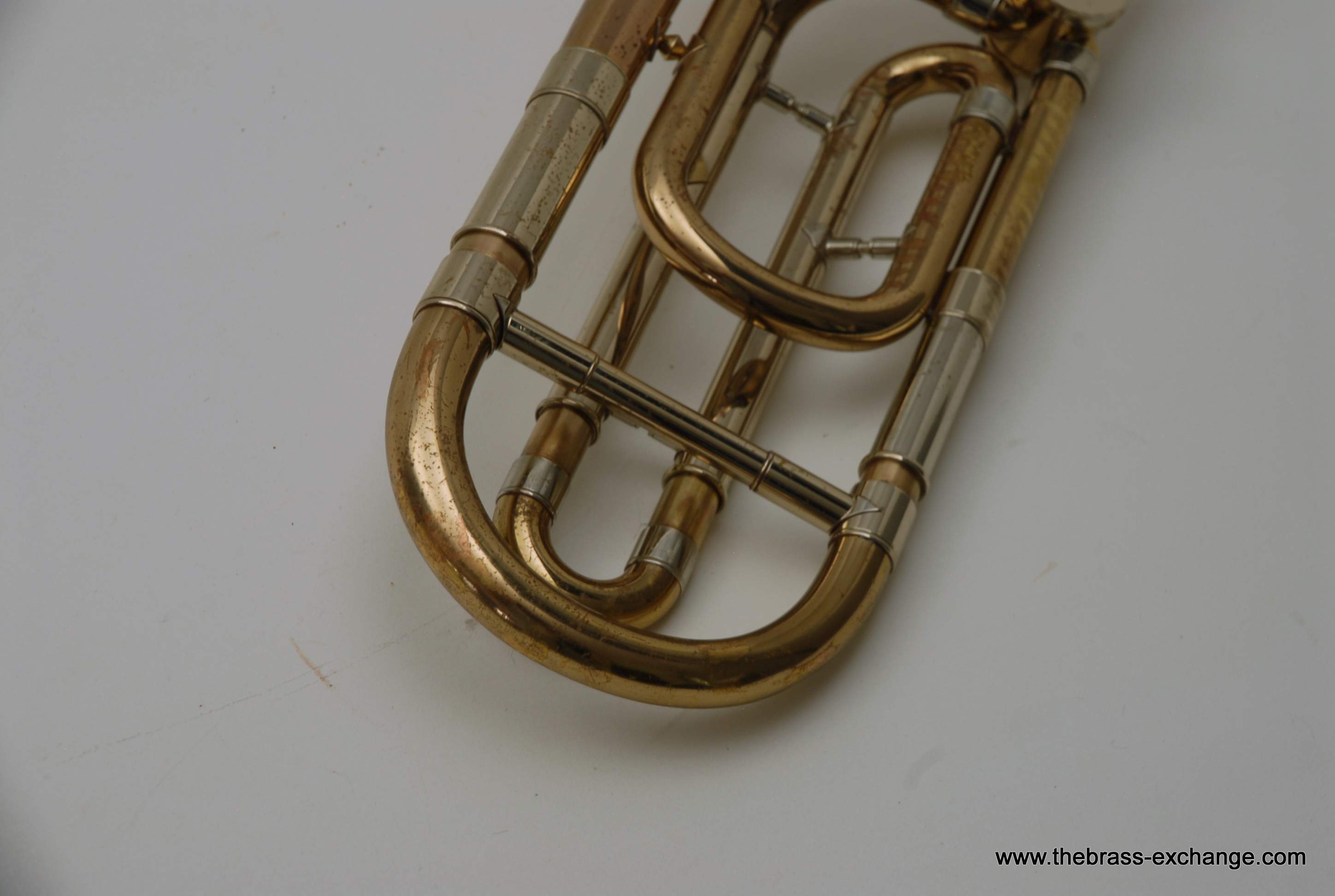 This particular 42G showed signs of a working life. It had considerable lacquer wear throughout, along with evidence of prior repair work. The bell had a noticeable crease in the past that was professionally improved during service here, leaving the instrument structurally solid and visually presentable. A small ding was also noted on the nickel cork barrel of the slide, though it did not extend into the inner tubes and had no effect on playability.