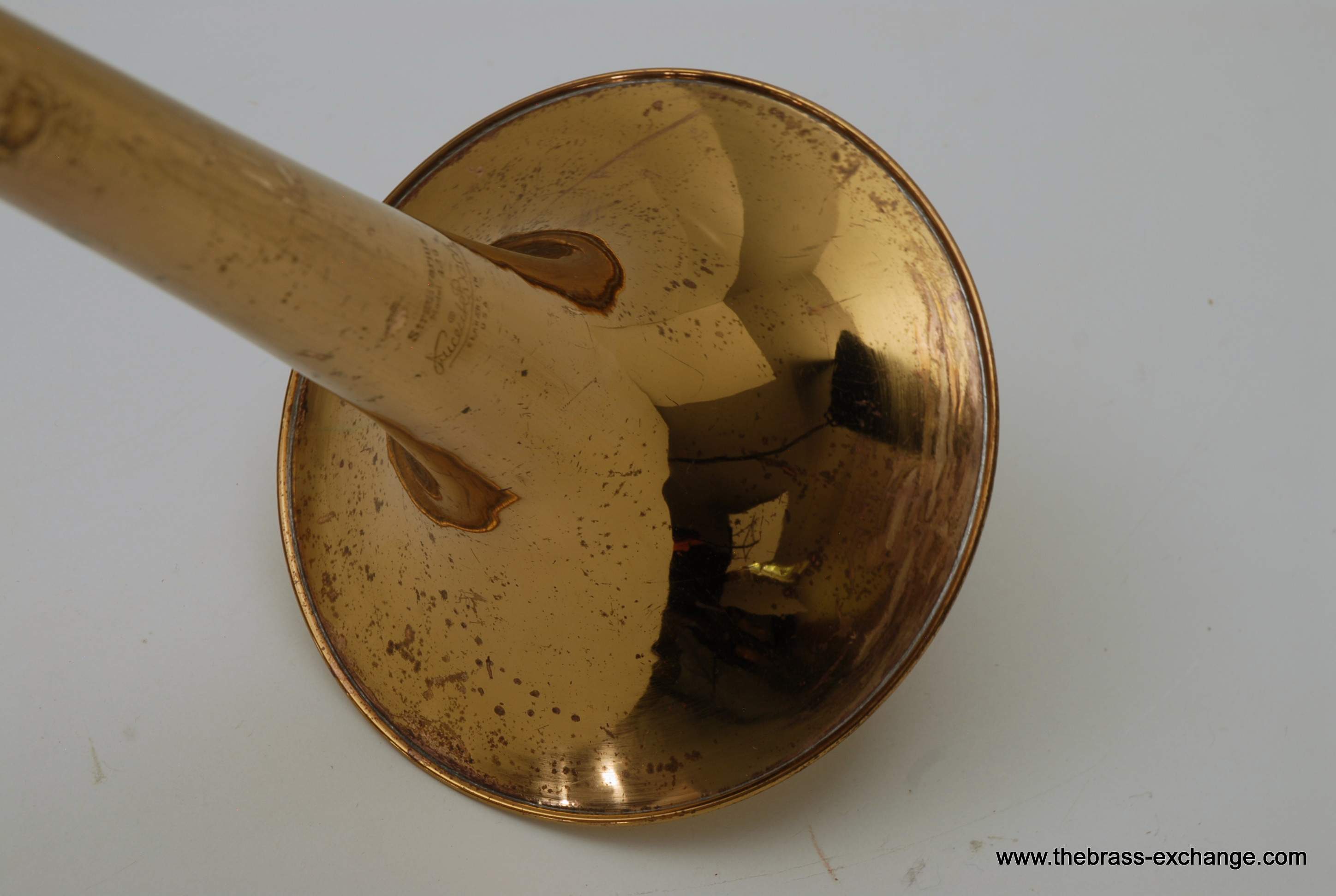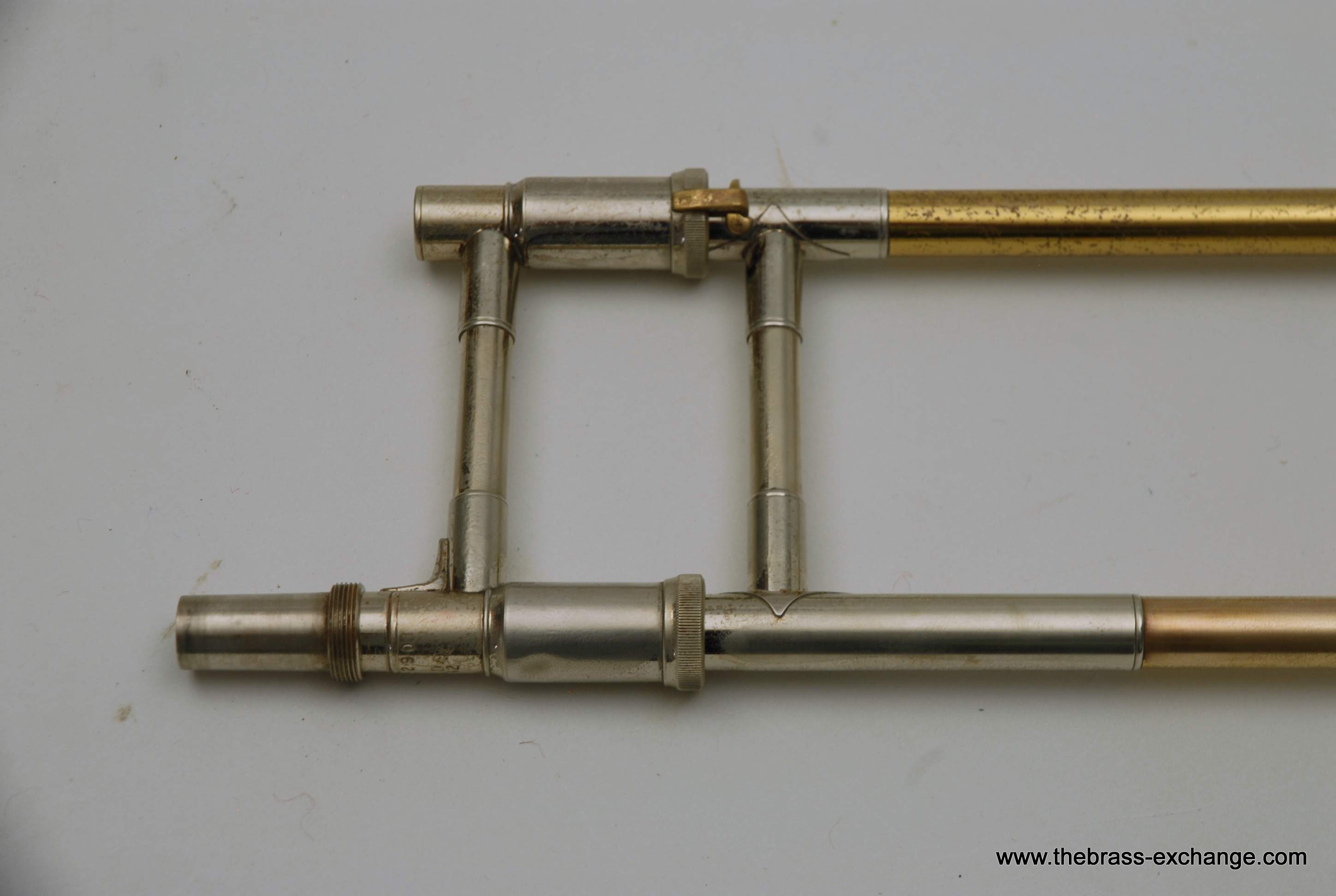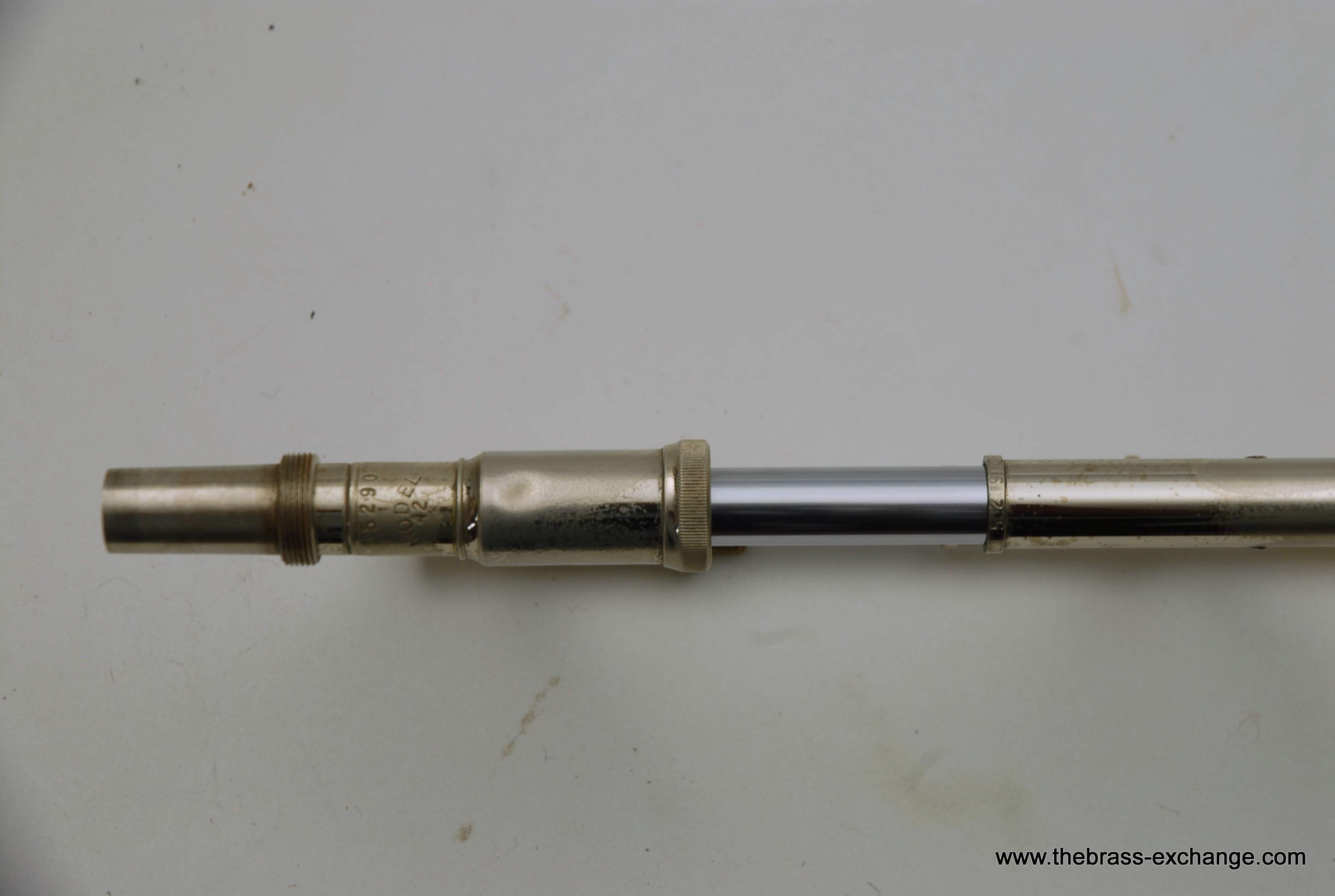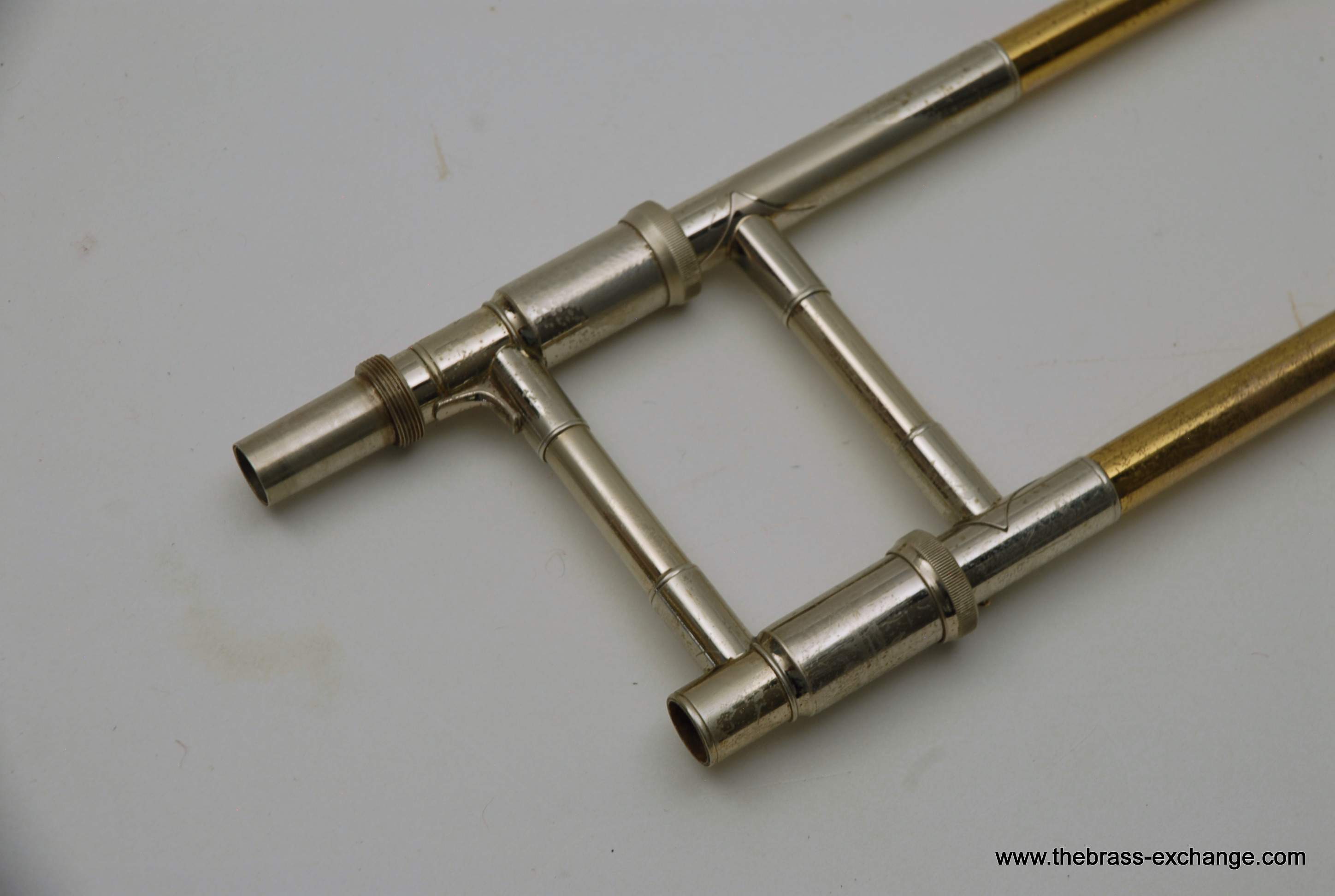 This particular 42G showed signs of a working life. It had considerable lacquer wear throughout, along with evidence of prior repair work. The bell had a noticeable crease in the past that was professionally improved during service here, leaving the instrument structurally solid and visually presentable. A small ding was also noted on the nickel cork barrel of the slide, though it did not extend into the inner tubes and had no effect on playability.