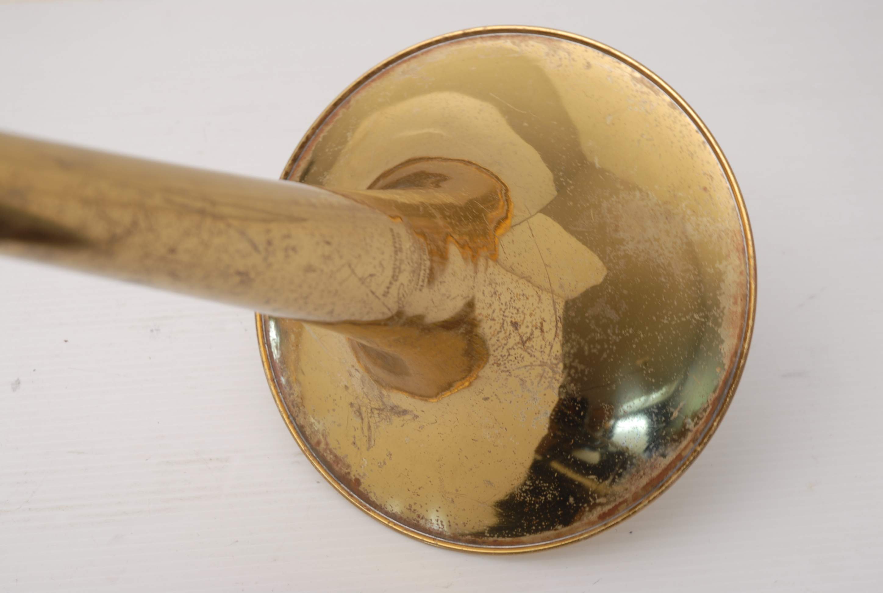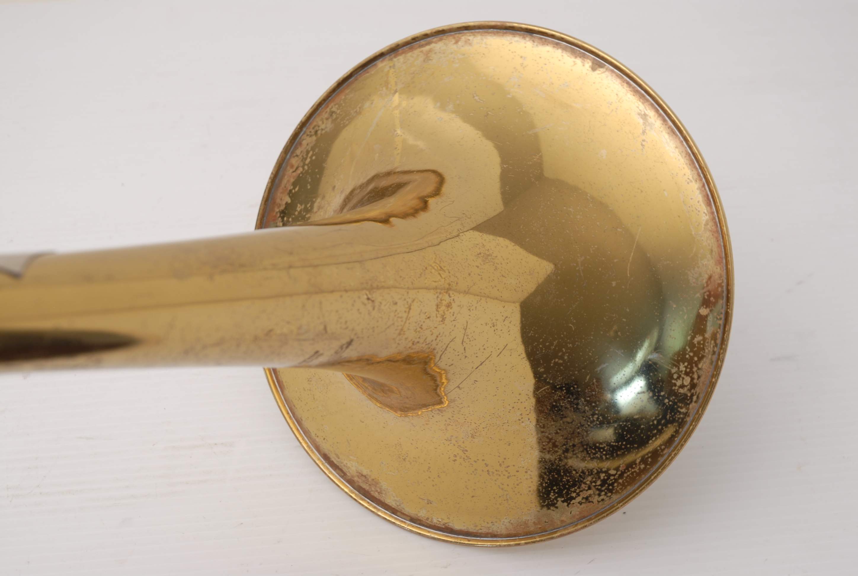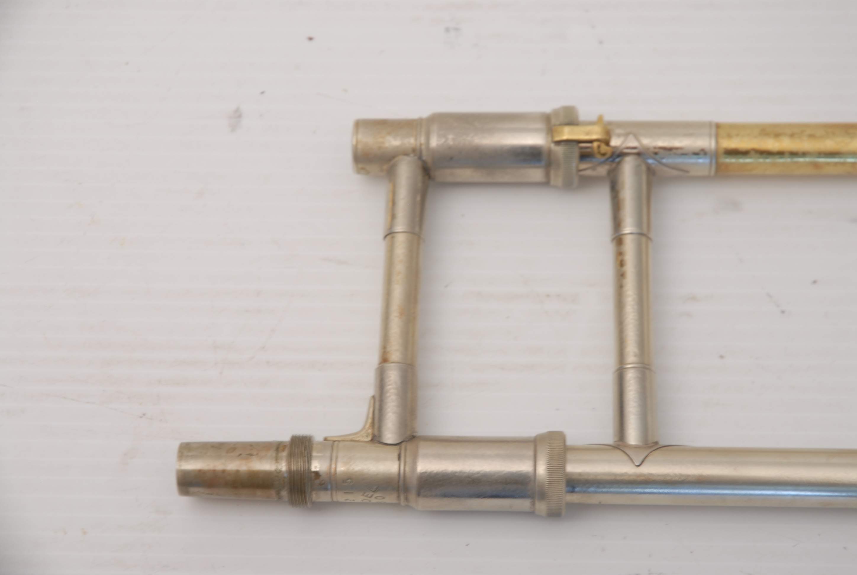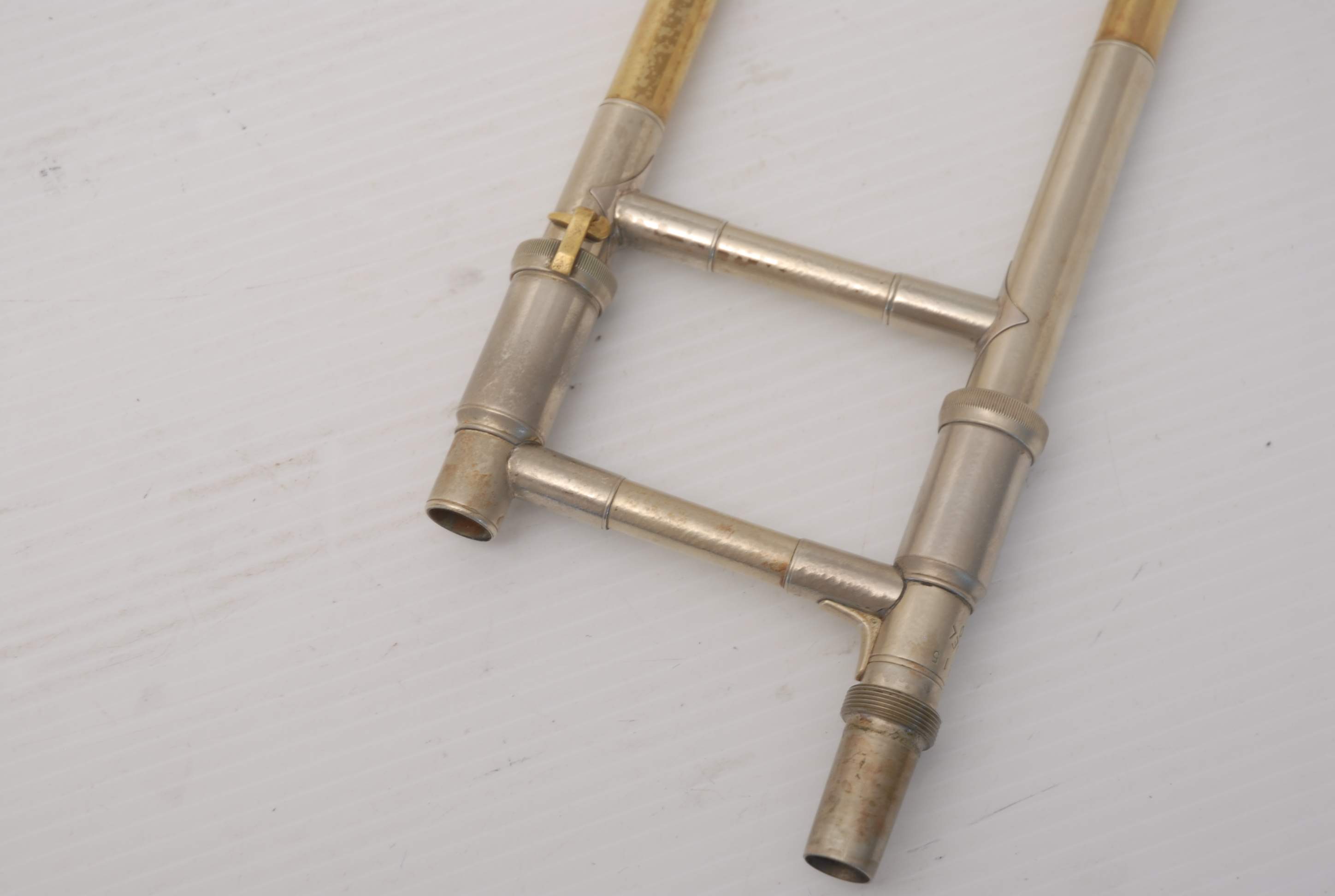 The handslide is very straight with excellent inner and outer tubes, ensuring good alignment and response. While the lacquer shows significant cosmetic wear—typical of Bach finishes from this era that were applied in thinner coats—the horn remains structurally sound and fully playable. The single F-attachment valve section plays freely, with no mechanical issues.