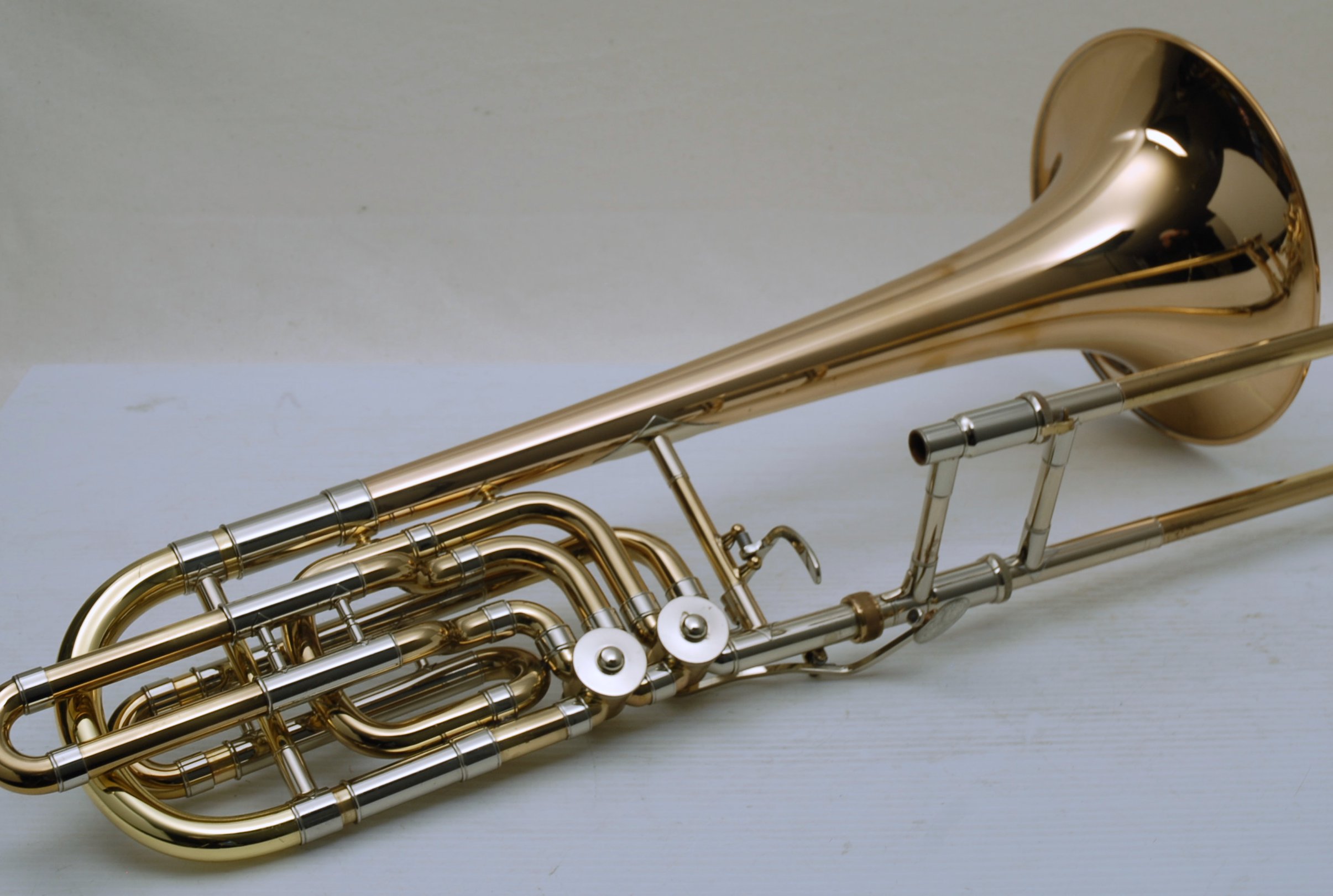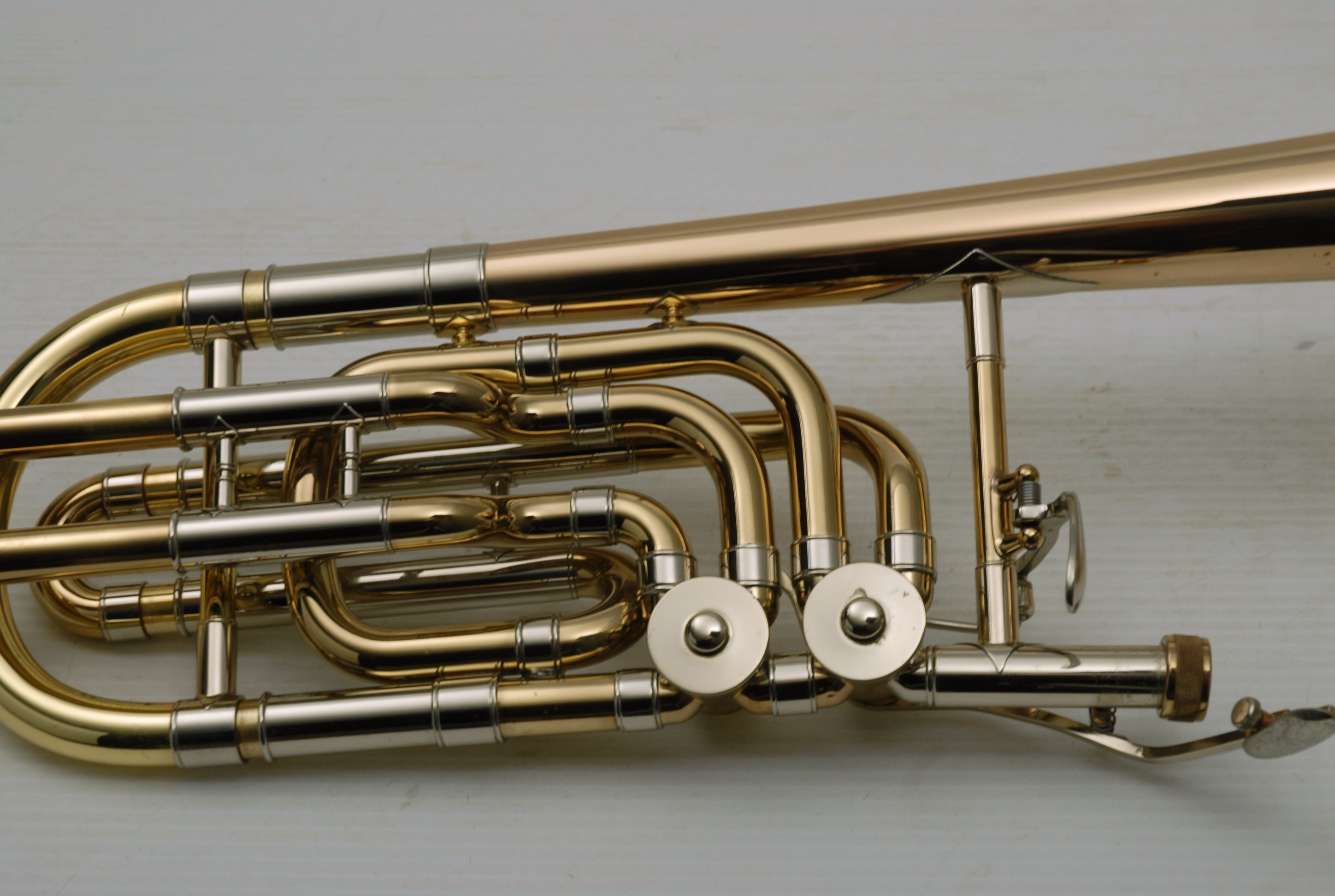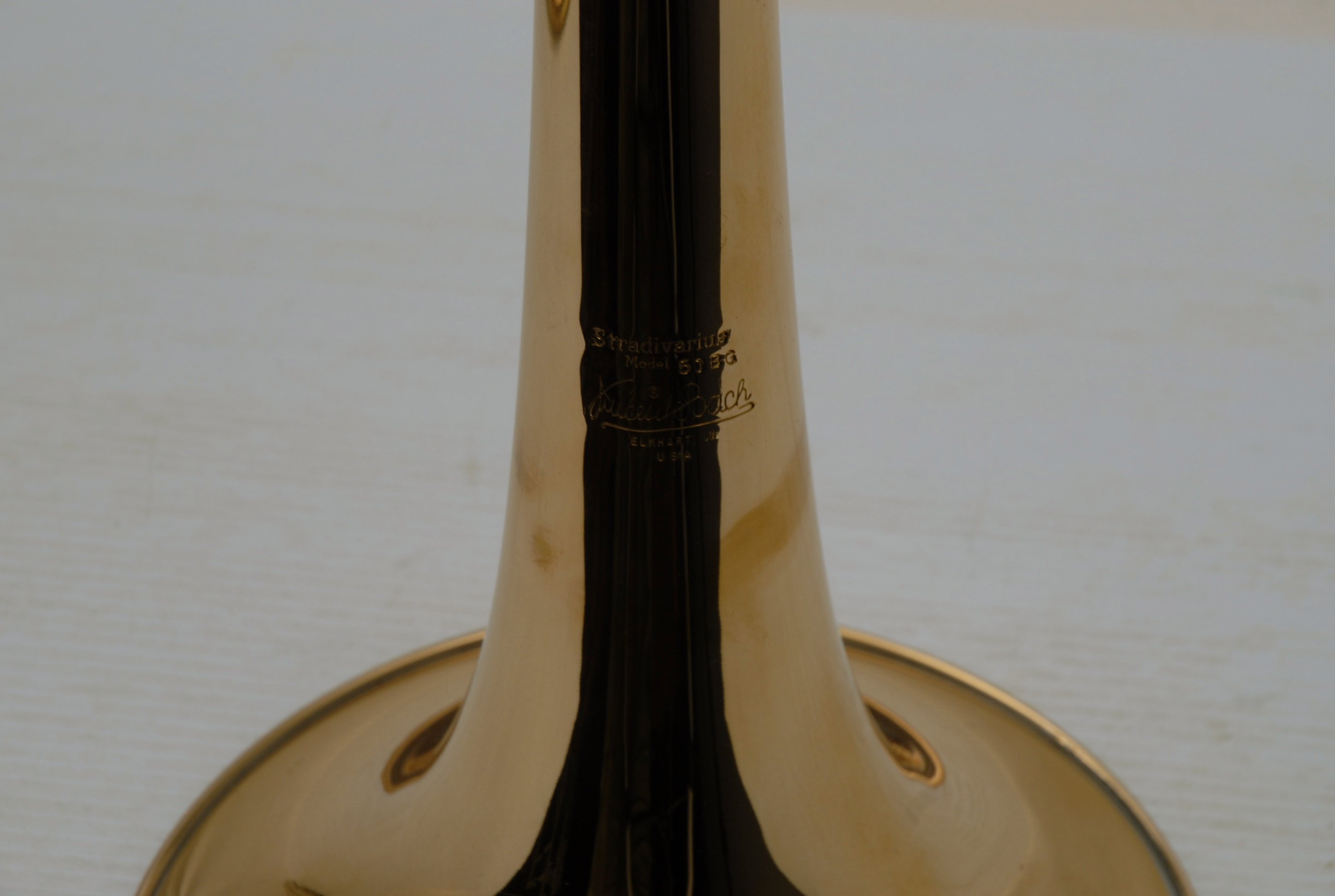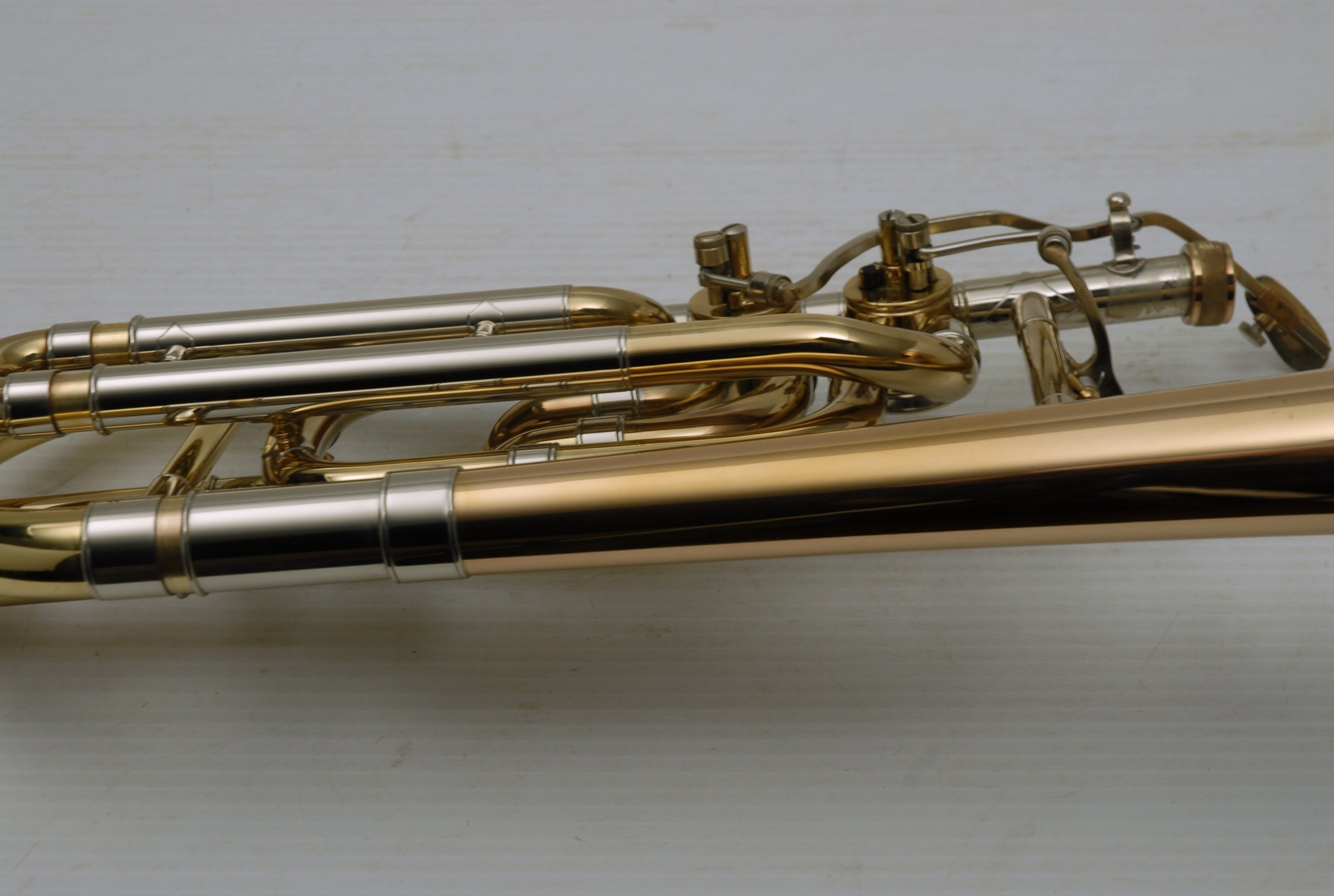 Used Bass Trombone Bach 50B3G Inline Independent Bb/F/Gb/D. This horn was made in the early 1990's. Has 9.5" gold brass bell. Standard weight straight bore .562 hand slide yellow brass. The 9.5" gold brass bell seems lighter than some of the more recent makes. Plays with lot's of color. Actually plays super easy. Has had full shop service: Chemical Bath, rotors removed and casing polished, new pads, bumpers, water key, hand slide adjusted. Overall lacquer is 95%. Is a gorgeous horn with no major prior damage or repairs. Would make an excellent Bass trombone for any player-including pro players. No service needs to improve appearance or playability. The second trigger notes play even and open, as one would expect. Gorgeous Bach overtones, and much darker with the light weight gold brass bell than the usual yellow bell. This horn has not been played on much over the last 25 years. Is a tremendous value, new Bach 50B3 start today at $5200.