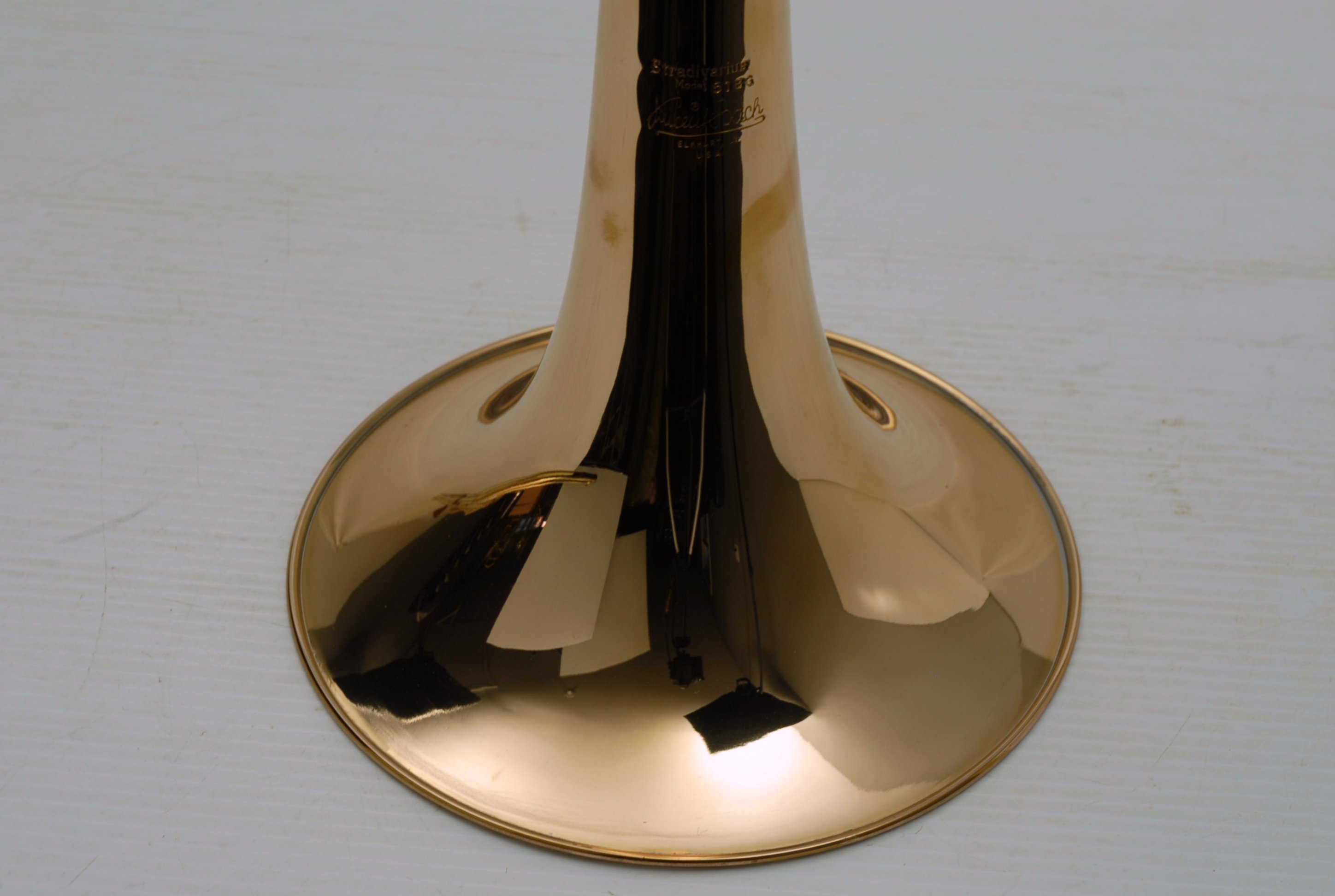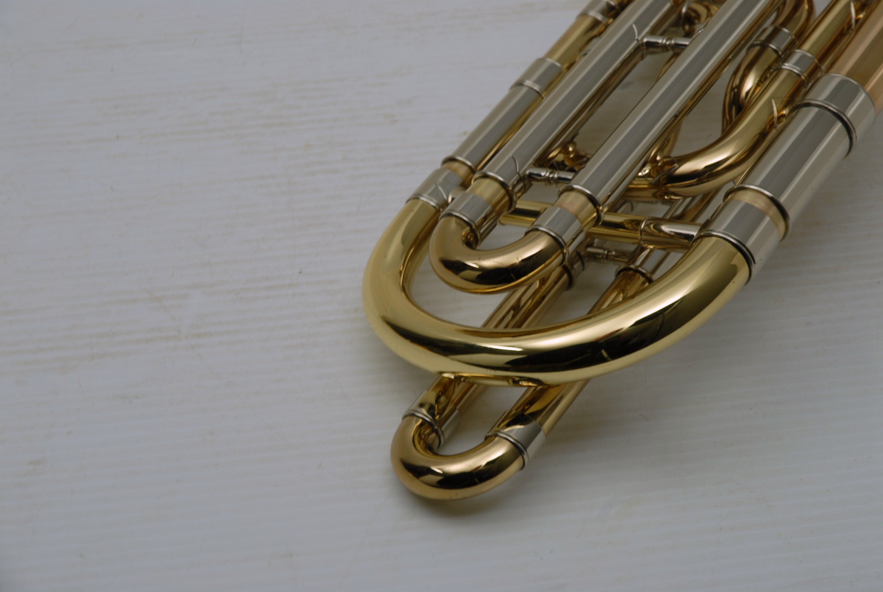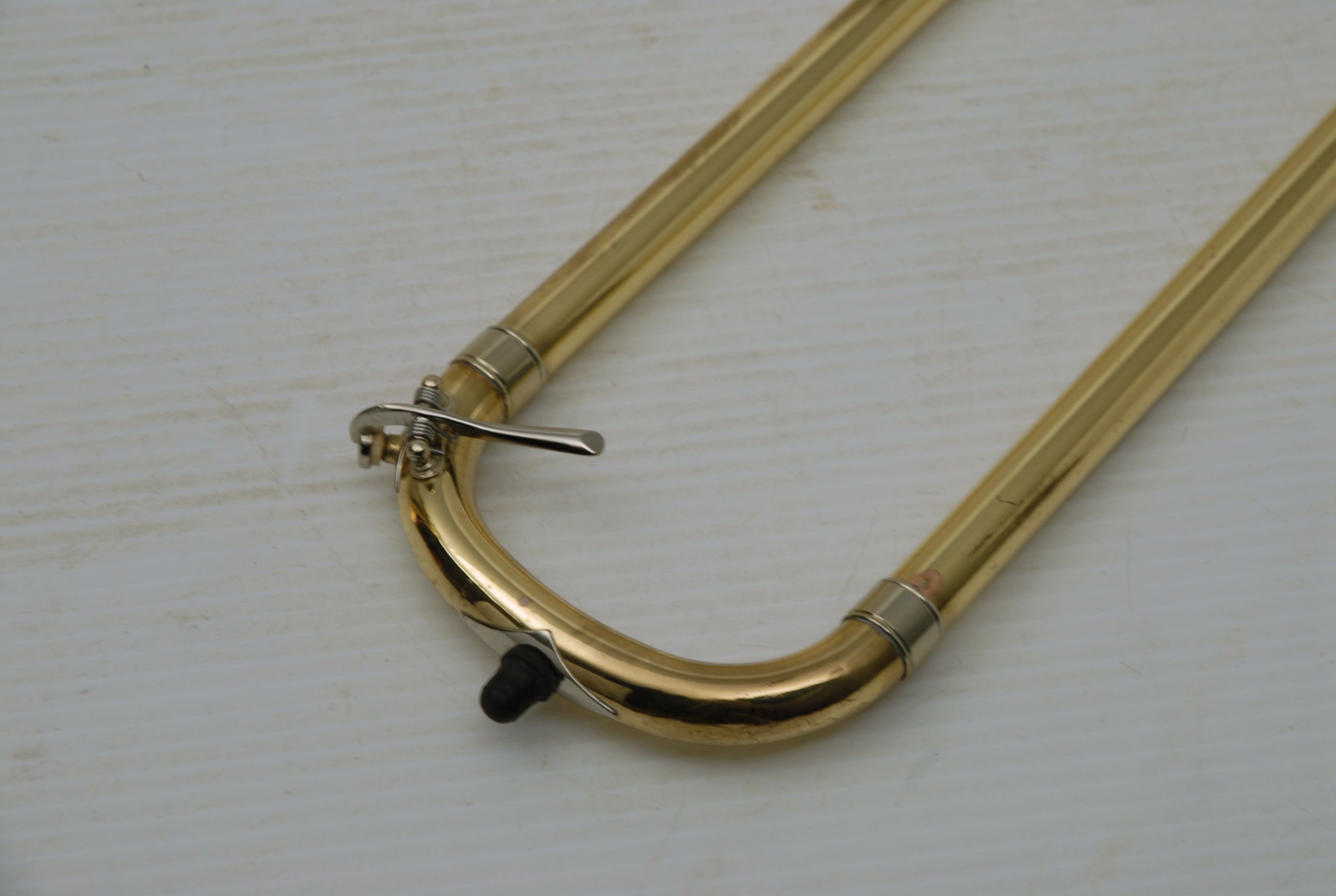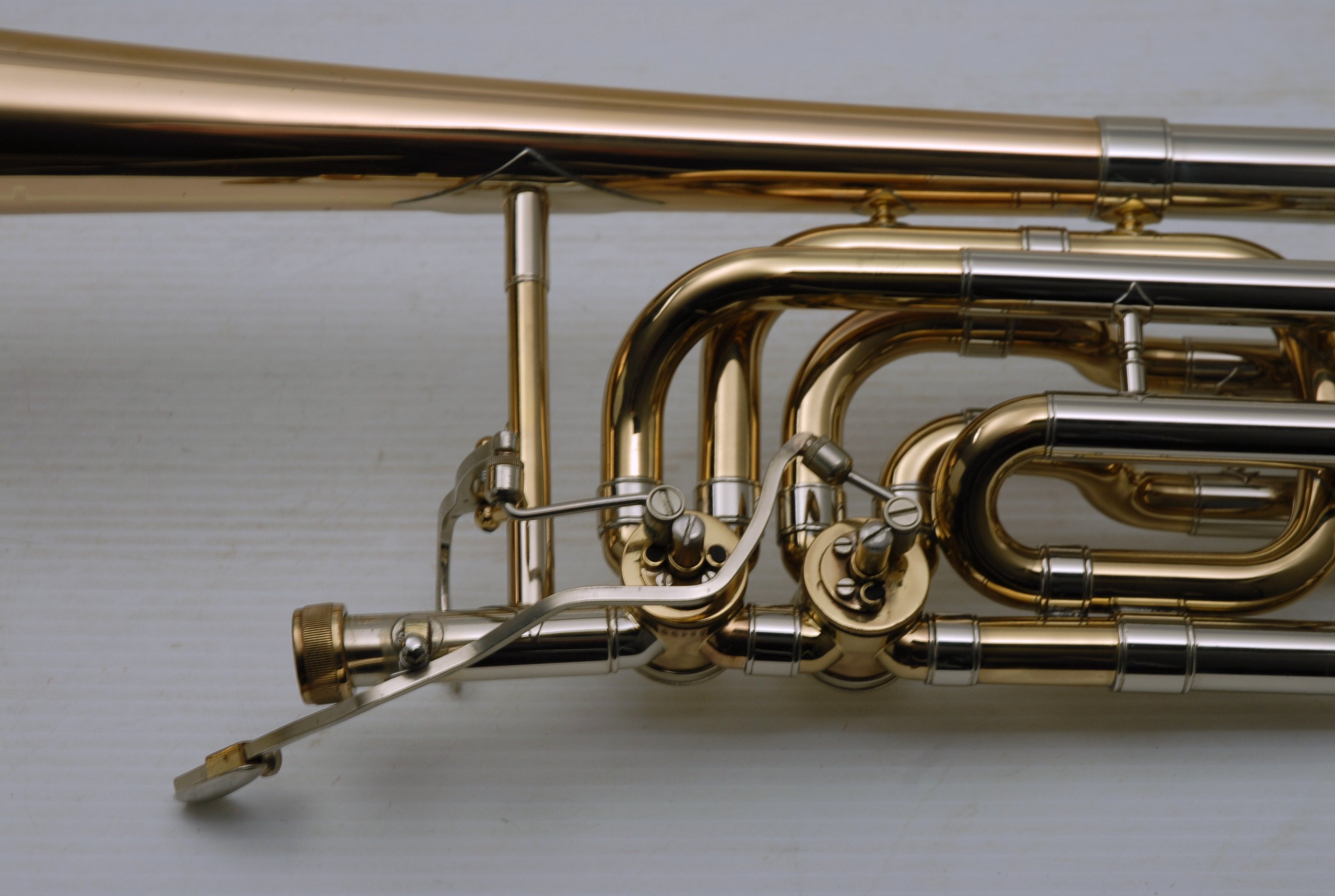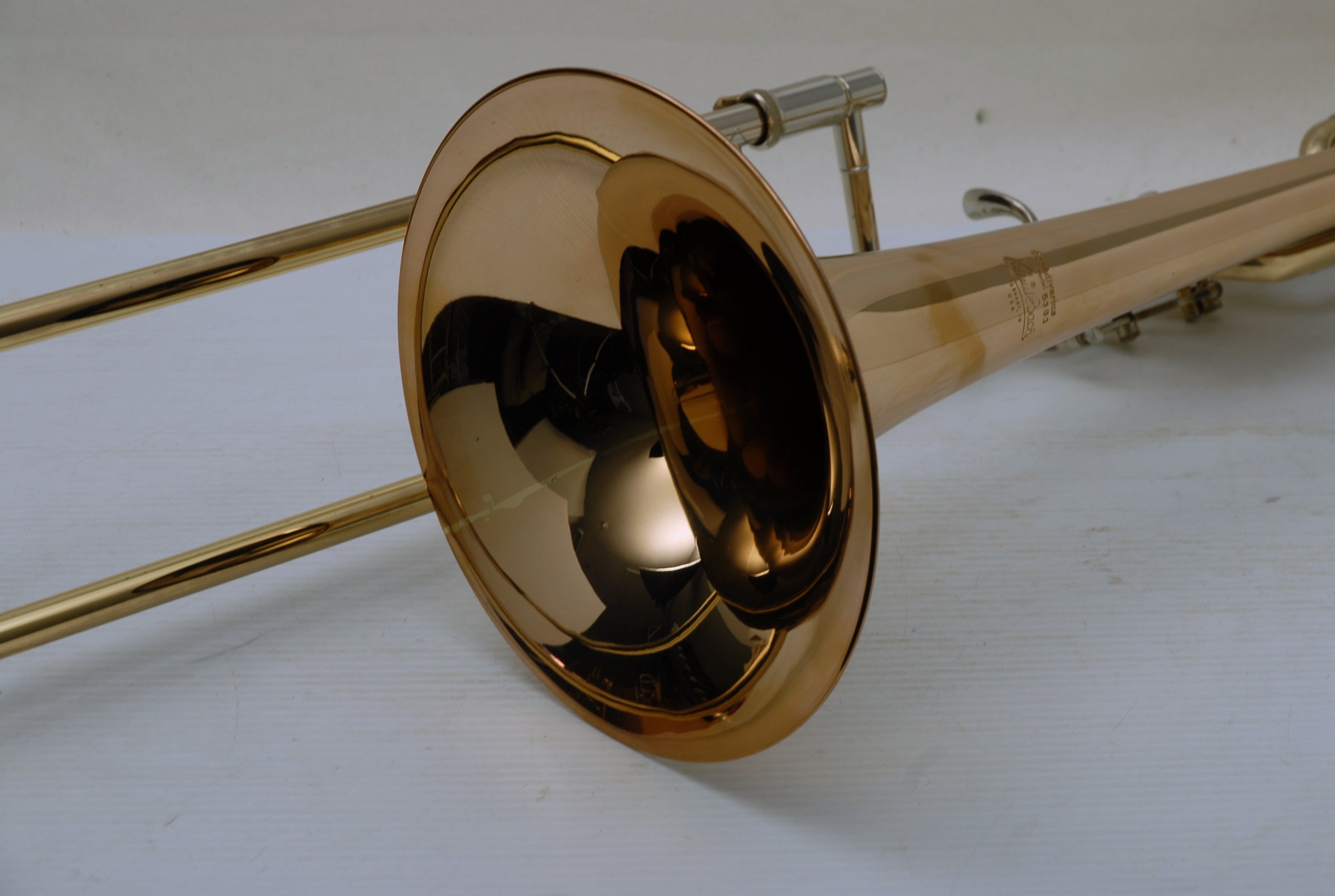 Used Bass Trombone Bach 50B3G Inline Independent Bb/F/Gb/D. This horn was made in the early 1990's. Has 9.5" gold brass bell. Standard weight straight bore .562 hand slide yellow brass. The 9.5" gold brass bell seems lighter than some of the more recent makes. Plays with lot's of color. Actually plays super easy. Has had full shop service: Chemical Bath, rotors removed and casing polished, new pads, bumpers, water key, hand slide adjusted. Overall lacquer is 95%. Is a gorgeous horn with no major prior damage or repairs. Would make an excellent Bass trombone for any player-including pro players. No service needs to improve appearance or playability. The second trigger notes play even and open, as one would expect. Gorgeous Bach overtones, and much darker with the light weight gold brass bell than the usual yellow bell. This horn has not been played on much over the last 25 years. Is a tremendous value, new Bach 50B3 start today at $5200.