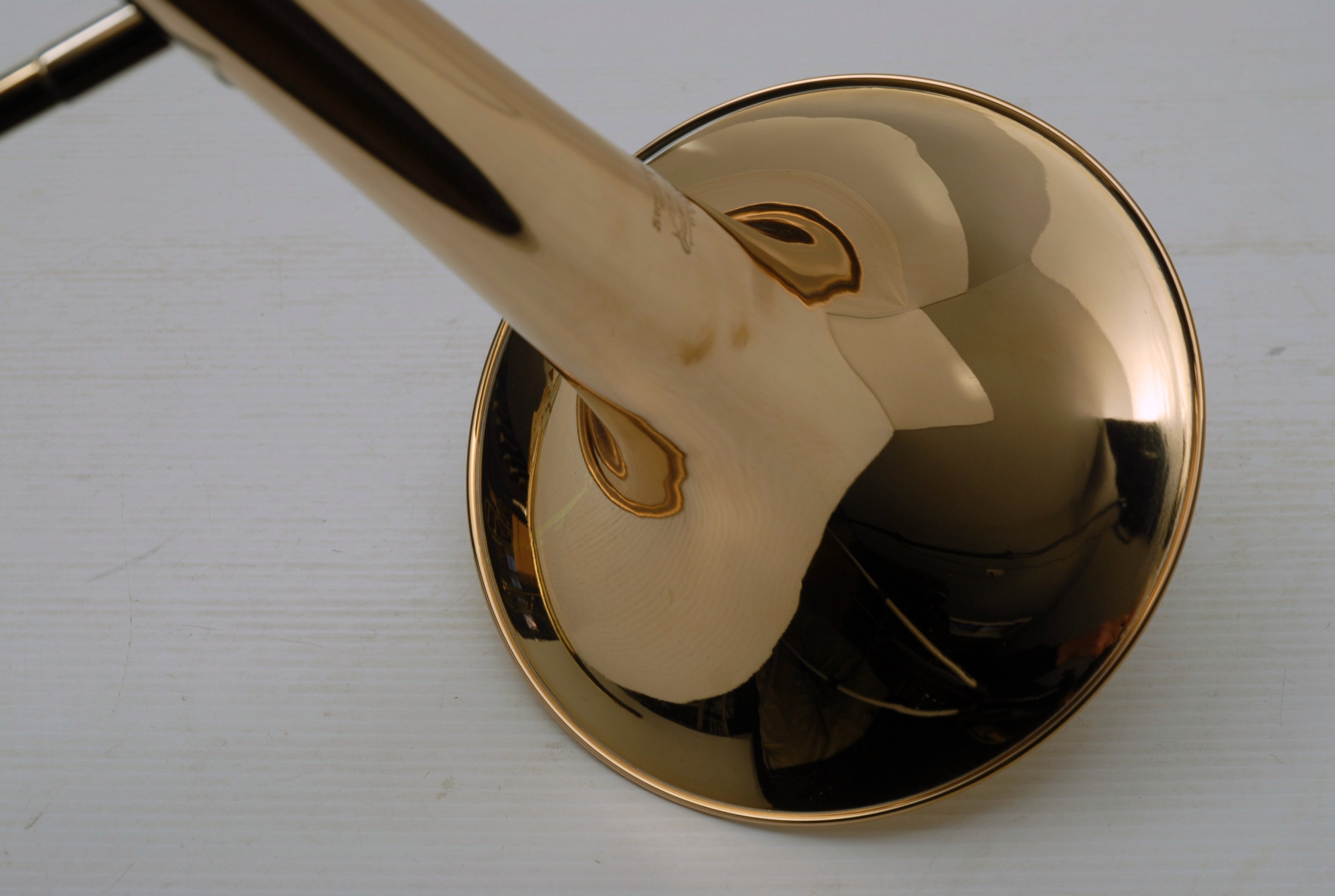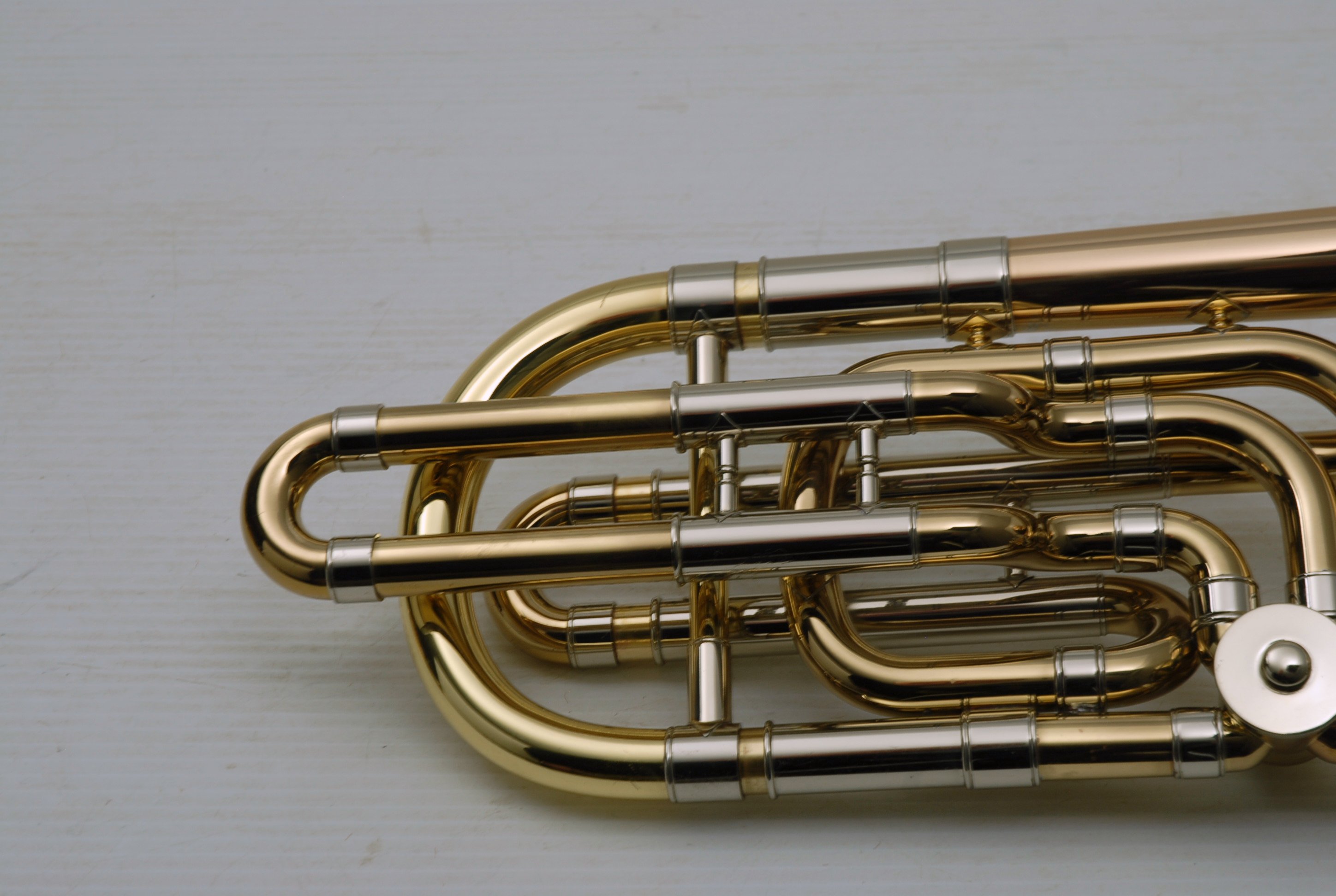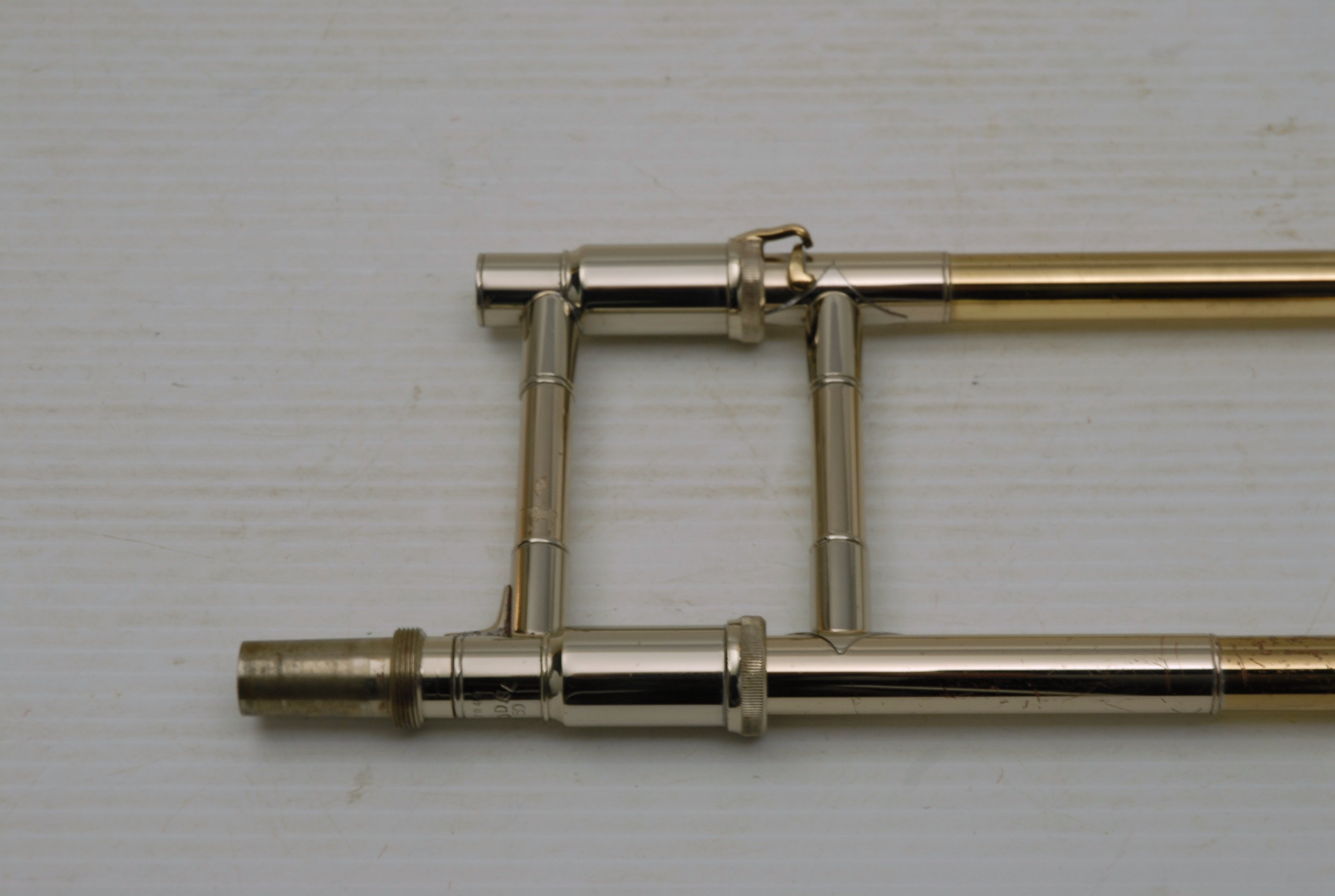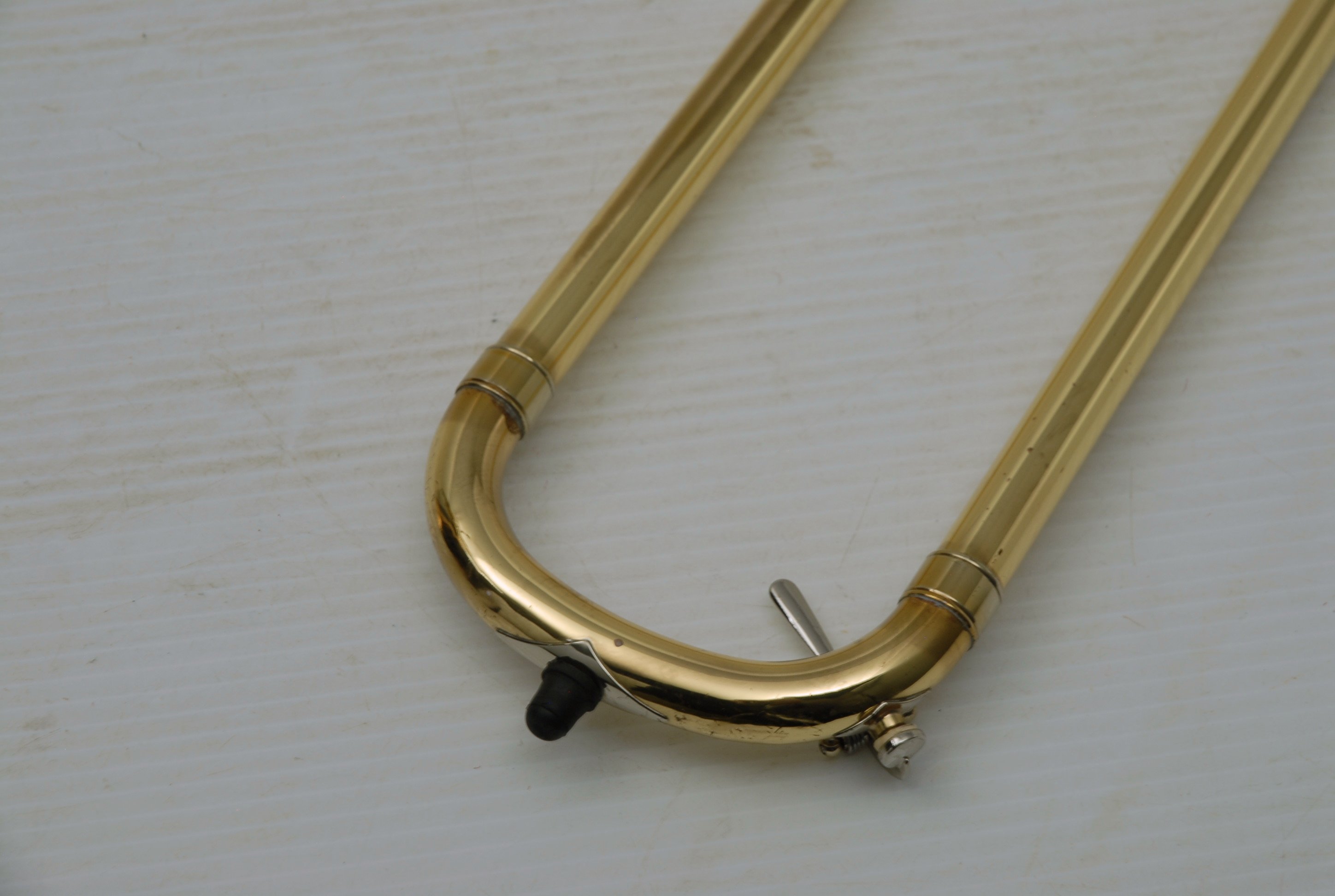 Used Bass Trombone Bach 50B3G Inline Independent Bb/F/Gb/D. This horn was made in the early 1990's. Has 9.5" gold brass bell. Standard weight straight bore .562 hand slide yellow brass. The 9.5" gold brass bell seems lighter than some of the more recent makes. Plays with lot's of color. Actually plays super easy. Has had full shop service: Chemical Bath, rotors removed and casing polished, new pads, bumpers, water key, hand slide adjusted. Overall lacquer is 95%. Is a gorgeous horn with no major prior damage or repairs. Would make an excellent Bass trombone for any player-including pro players. No service needs to improve appearance or playability. The second trigger notes play even and open, as one would expect. Gorgeous Bach overtones, and much darker with the light weight gold brass bell than the usual yellow bell. This horn has not been played on much over the last 25 years. Is a tremendous value, new Bach 50B3 start today at $5200.
