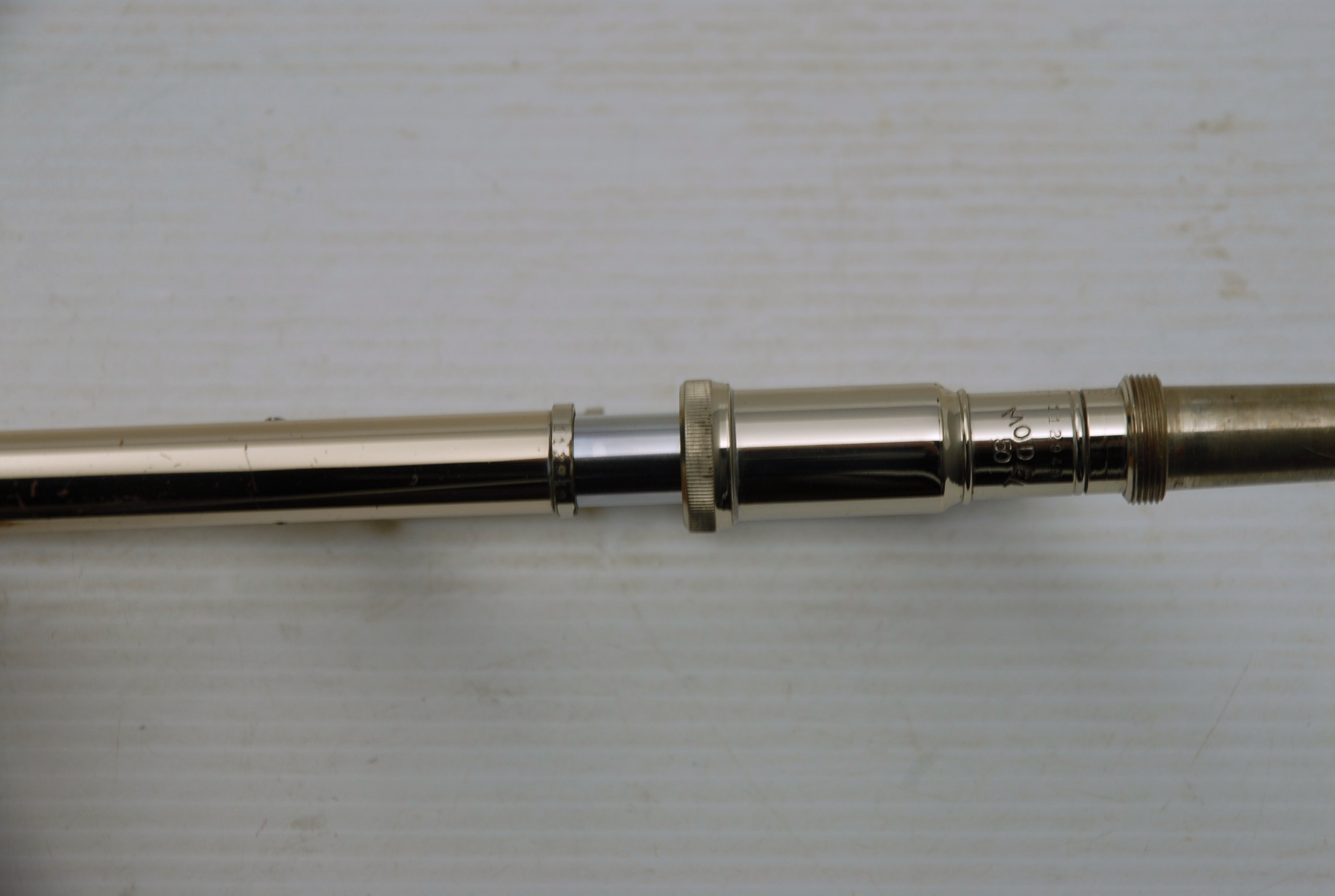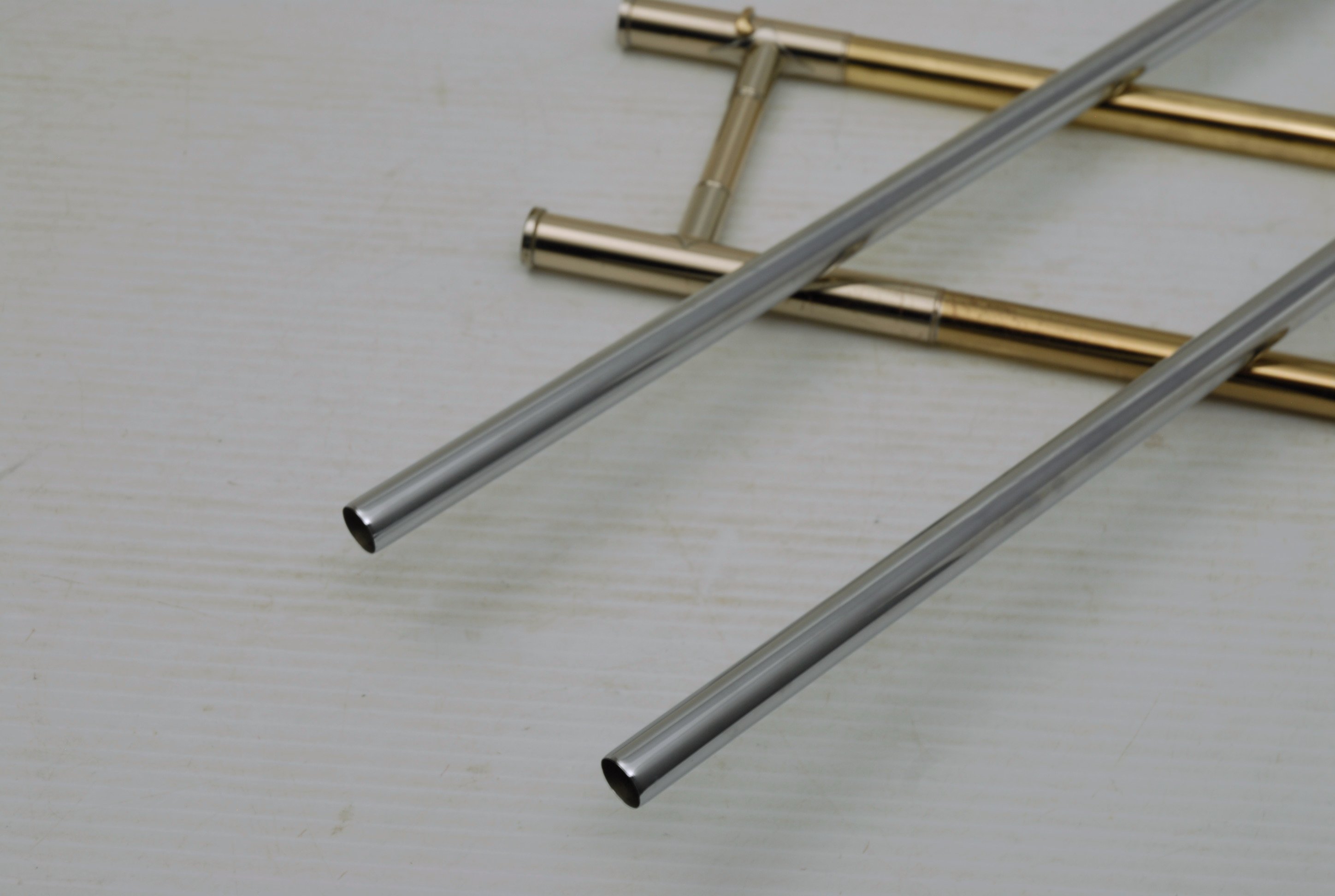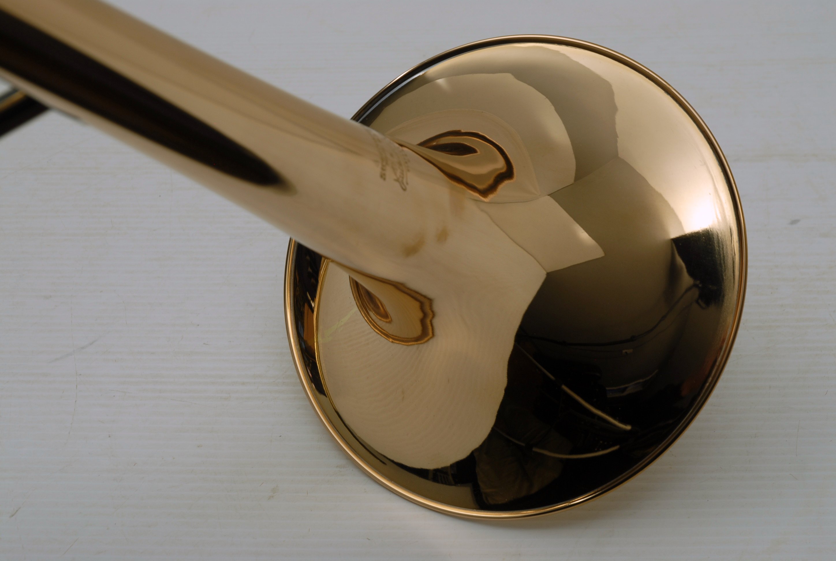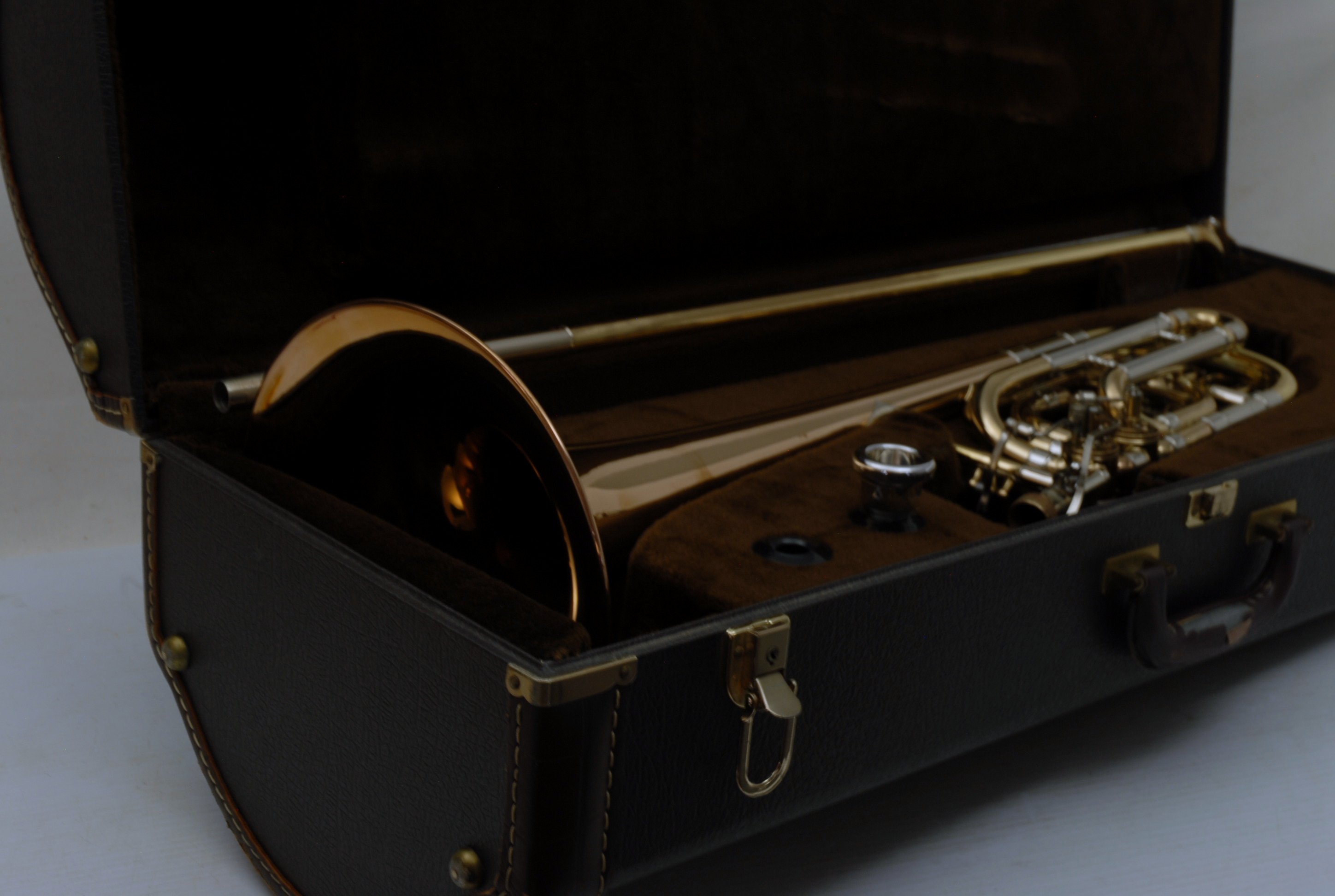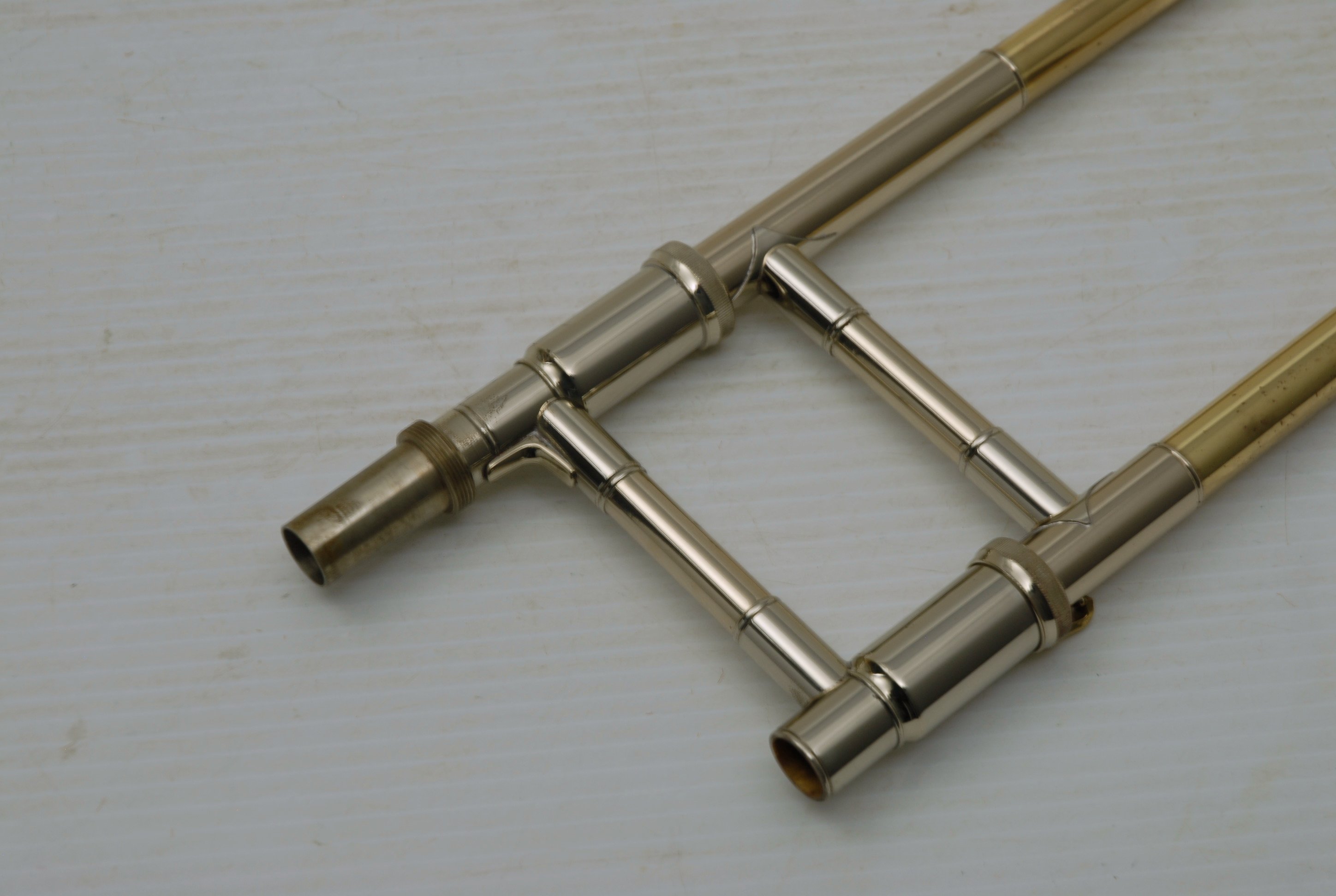 Used Bass Trombone Bach 50B3G Inline Independent Bb/F/Gb/D. This horn was made in the early 1990's. Has 9.5" gold brass bell. Standard weight straight bore .562 hand slide yellow brass. The 9.5" gold brass bell seems lighter than some of the more recent makes. Plays with lot's of color. Actually plays super easy. Has had full shop service: Chemical Bath, rotors removed and casing polished, new pads, bumpers, water key, hand slide adjusted. Overall lacquer is 95%. Is a gorgeous horn with no major prior damage or repairs. Would make an excellent Bass trombone for any player-including pro players. No service needs to improve appearance or playability. The second trigger notes play even and open, as one would expect. Gorgeous Bach overtones, and much darker with the light weight gold brass bell than the usual yellow bell. This horn has not been played on much over the last 25 years. Is a tremendous value, new Bach 50B3 start today at $5200.