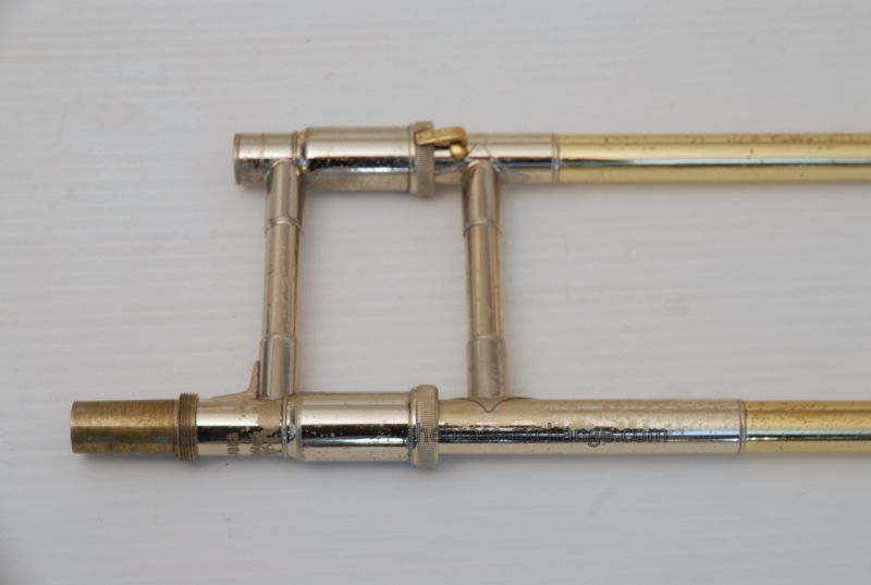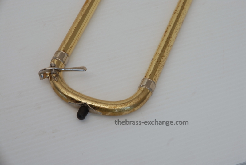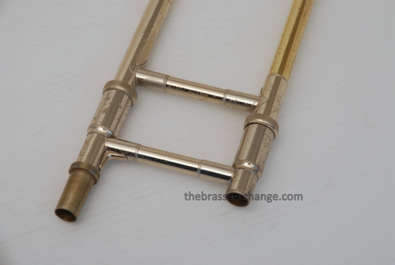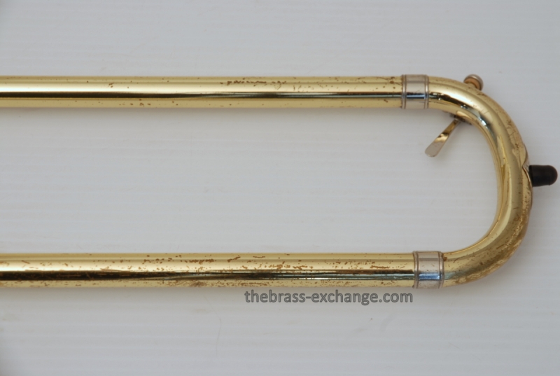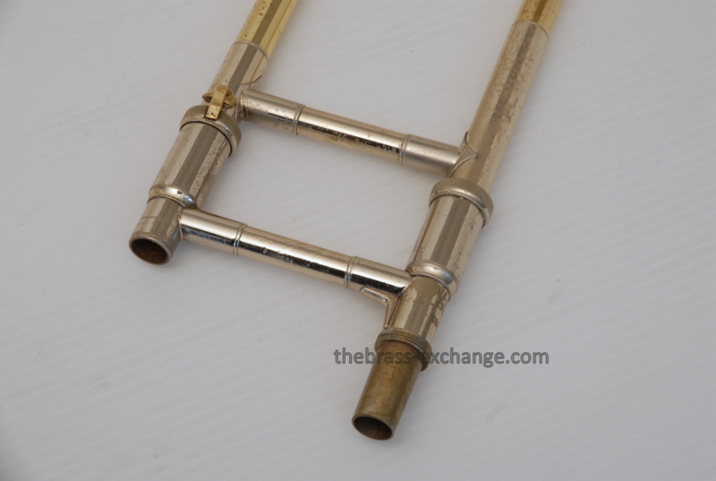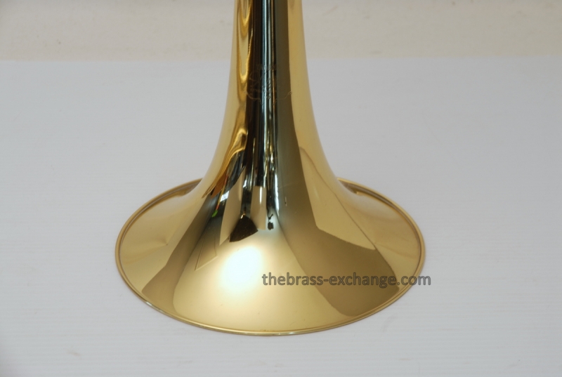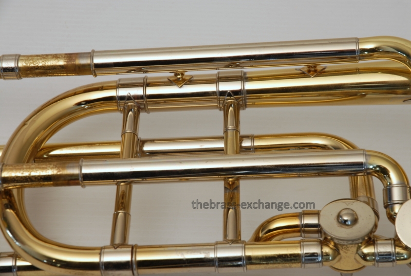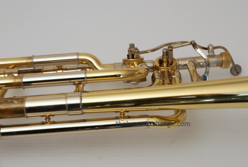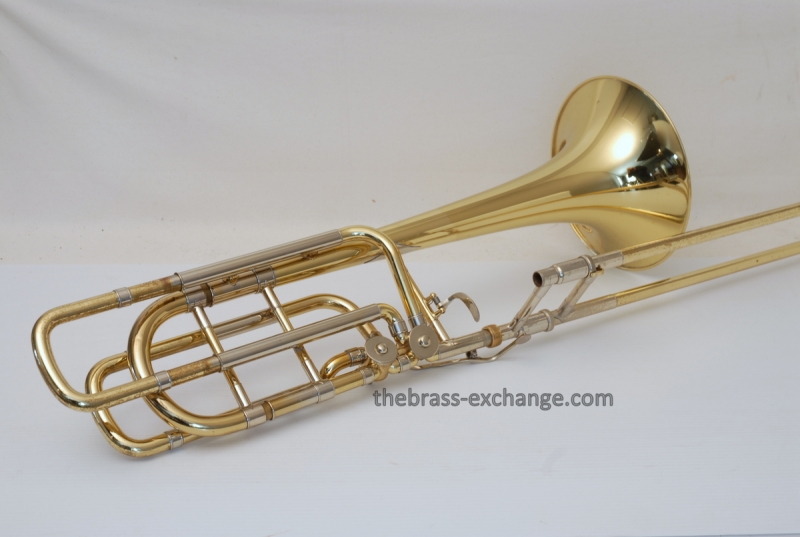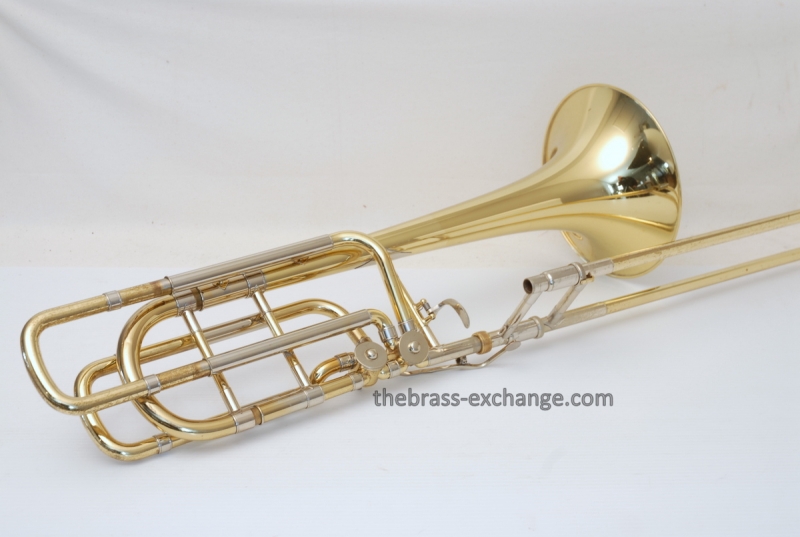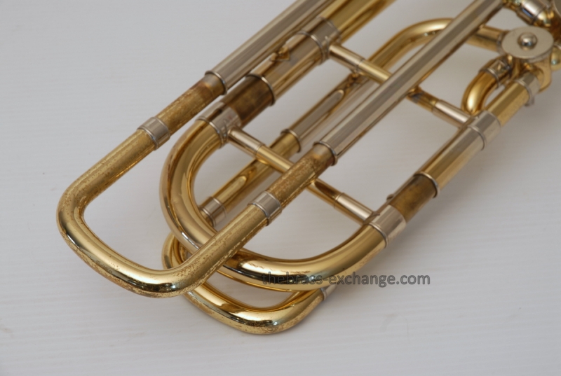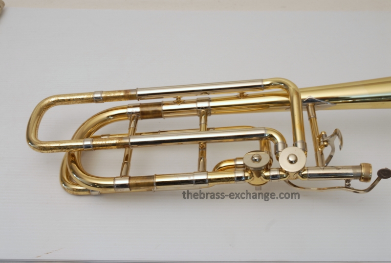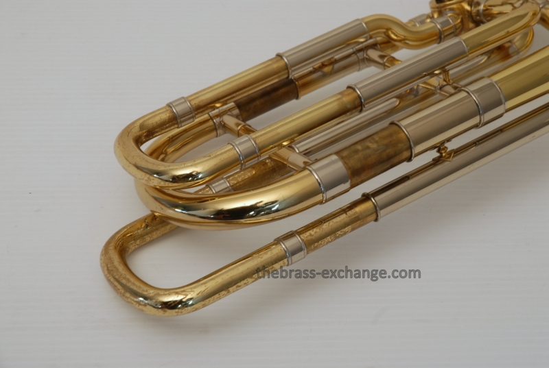 Bach 50B3O Bass Trombone. Independent Rotor, Open Wrap. Original Bell flare was damaged and replaced with a Yamaha Xeno Bass Bell, which is actually based upon the Bach Bell. Standard Bach 50 Bass Trombone Slide. No dents or dings, very clean. some lacquer weall on grip area and outer slide. Overall a really good playing Bass with no issues with playability. Would make a great first bass for advancing player or pro level double. Comes with Bach Case. Mouthpiece not included.