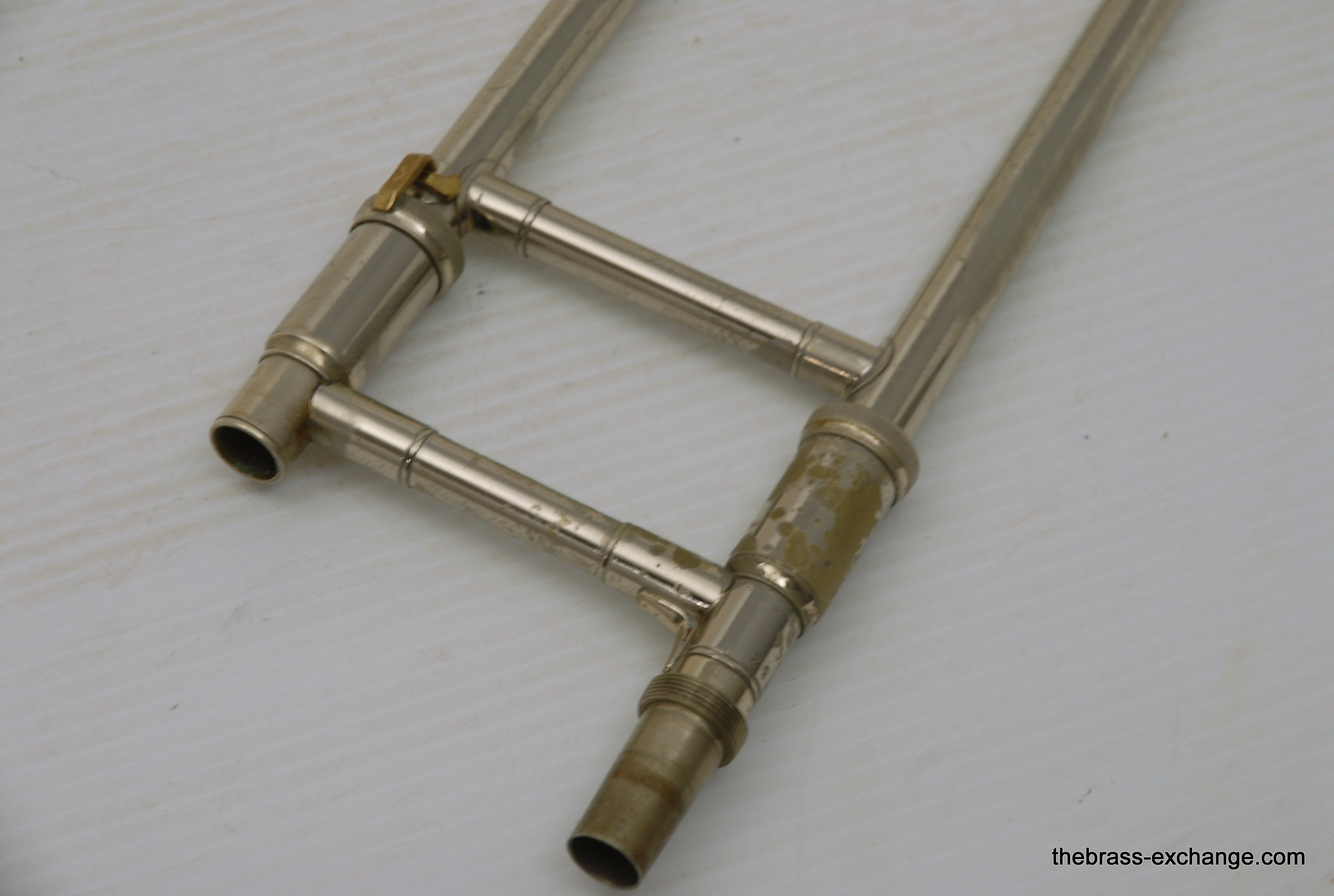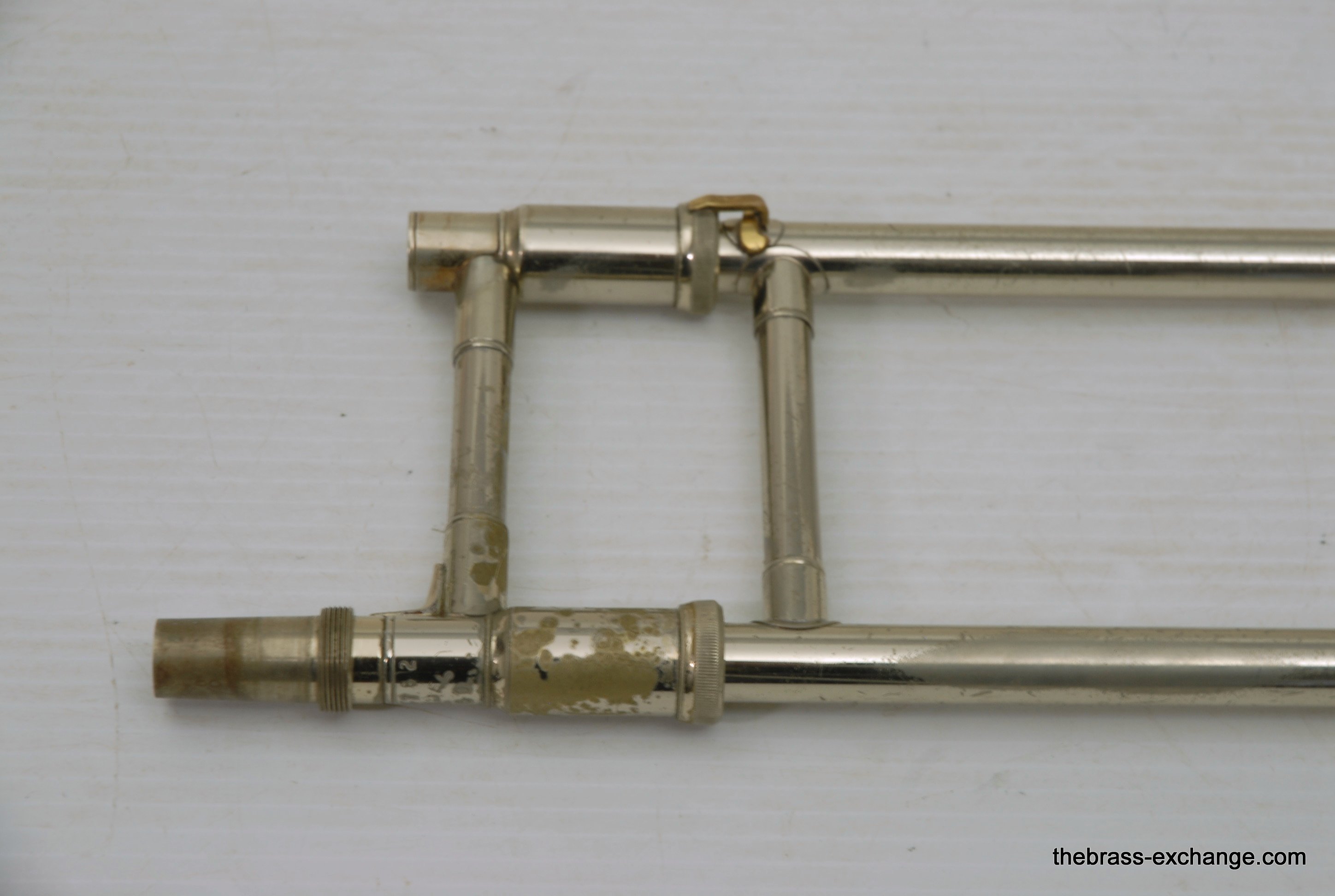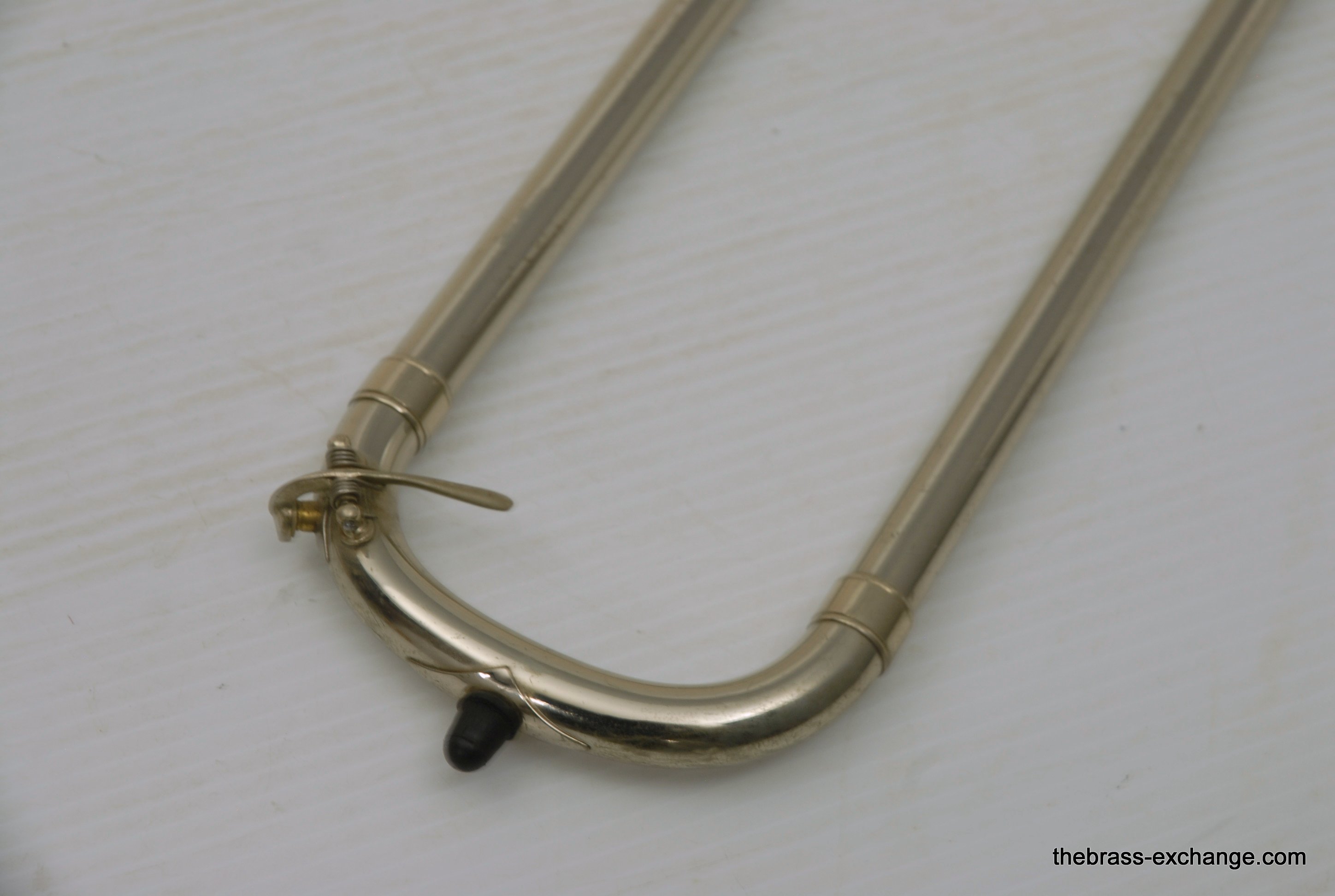 Bach 50LT Bass Trombone Handslide. Corporation Era from 1969. If this slide would have been made 6 years earlier it would be a Mt. Vernon Era. Players know that some of the best Bach trombones were made in the 1950's, 60's and 70's. Vincent Bach remained in control of his company up until 1976. The trombones made between 1963 adn 1976 are commonly referred to as "Corporation" era. This is an all original parts/lacquer 1969 make. The Chicago symphony tenor players, Jay Friedman, Michael Mulcahy use 50LT slides on their tenors. A few years ago when visiting Cleveland, Massimo Larosa showed me his Gold Brass 42 with a 50LT Handslide. This makes a tenor play huge, but it's just a great bass trombone slide too. This one is getting a chemical bath and set up prior to delivery. The previous owner had electrial tape wrapped on the lower cork barrel and it ate into the lacuer. Upon request, we will strip, polish and relacquer the lower cork barrell. Please call or email for price. Great playing slide as is.