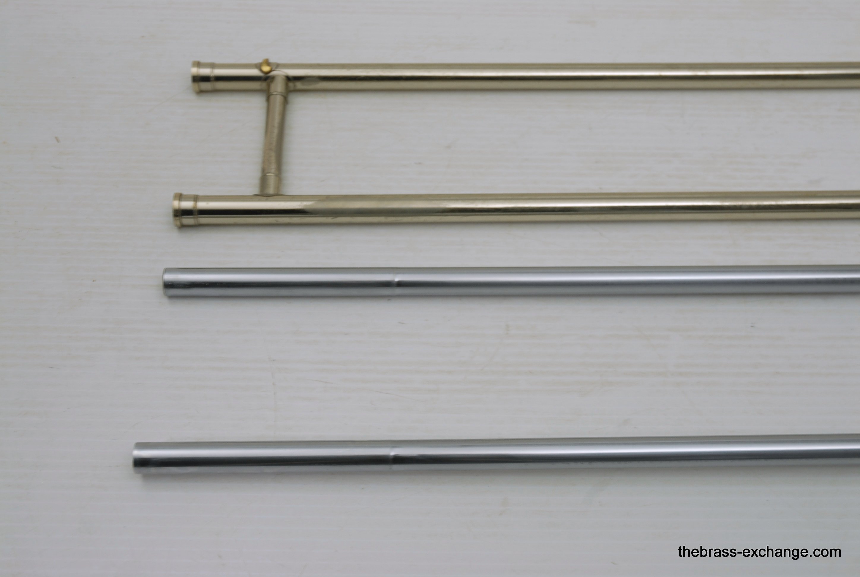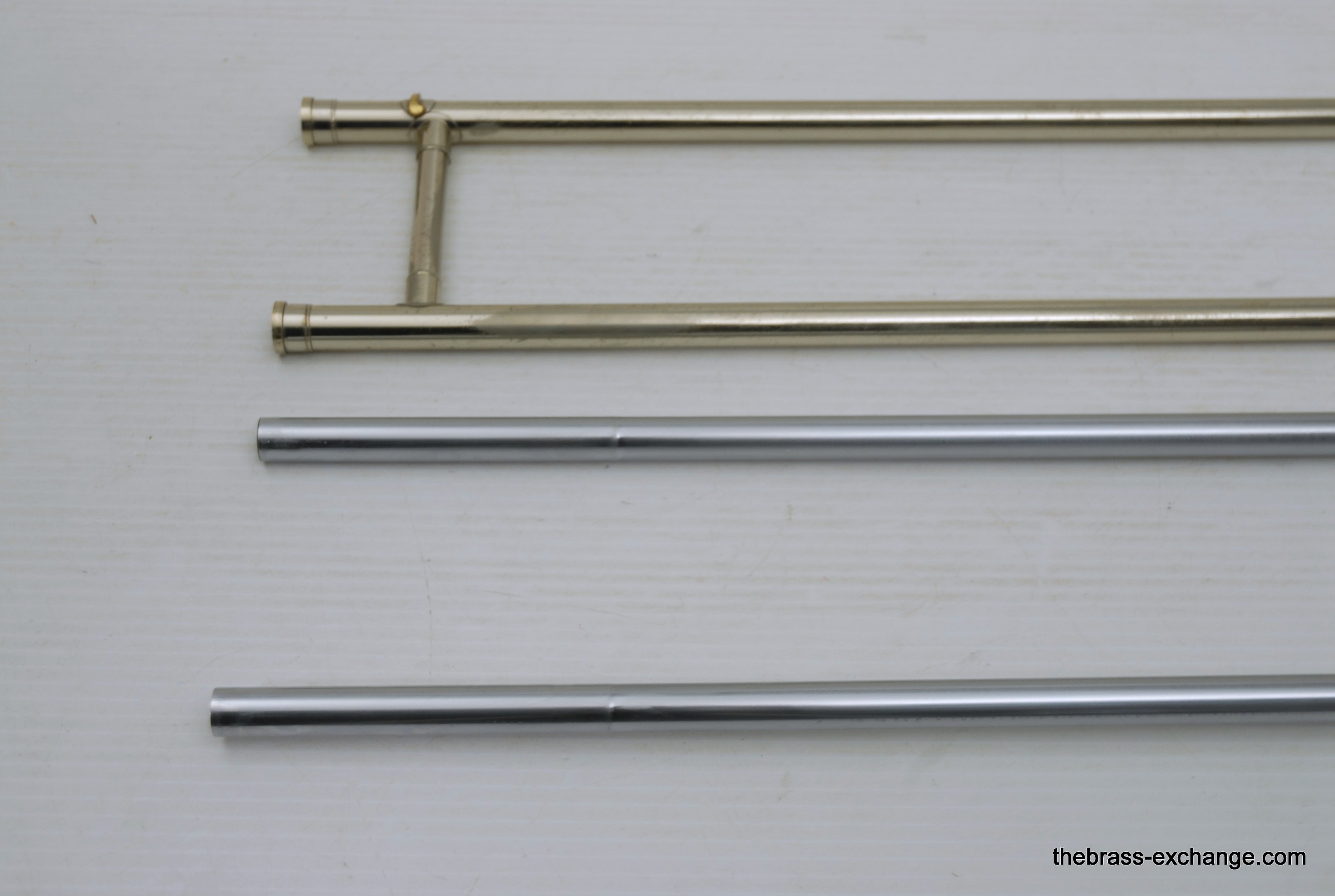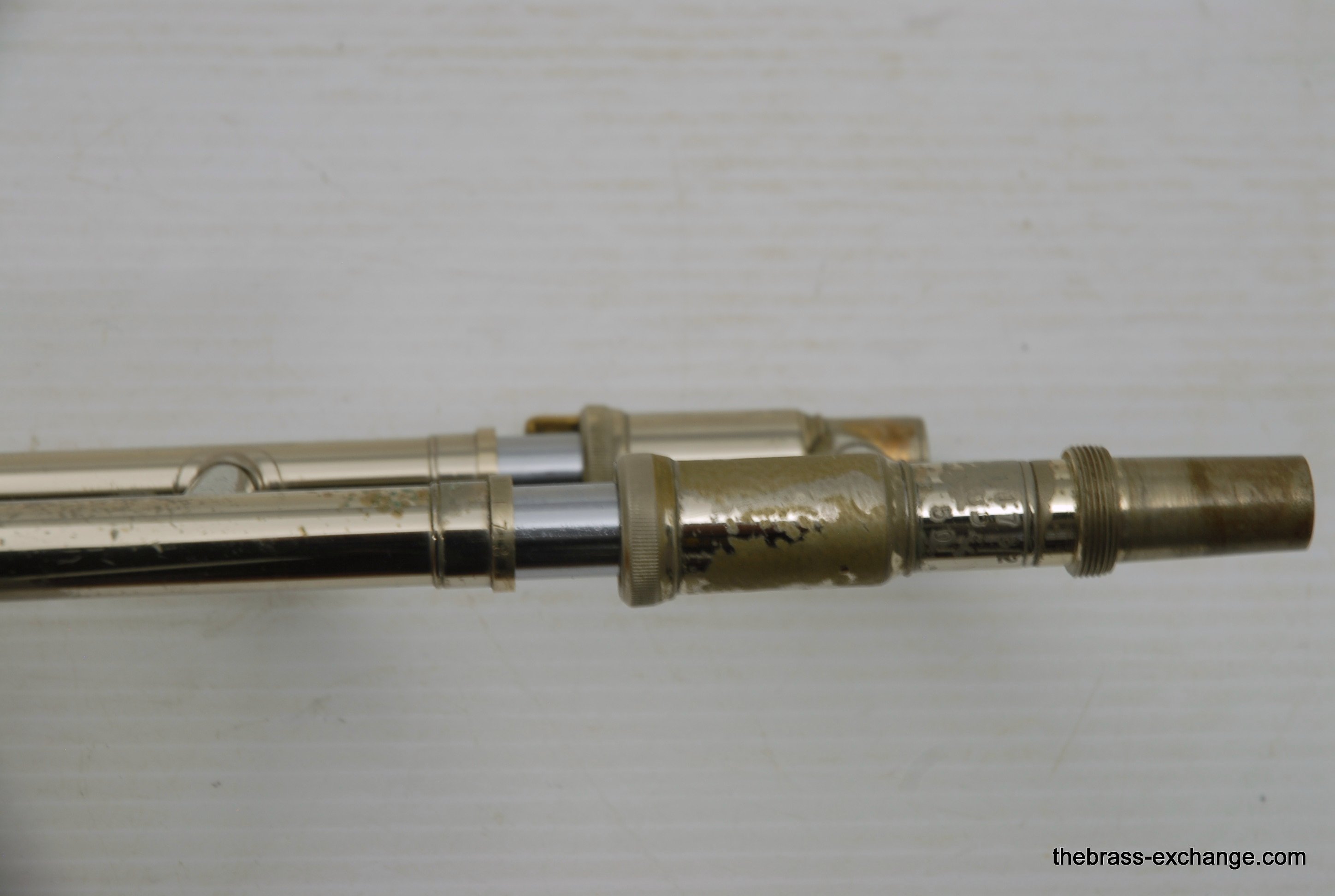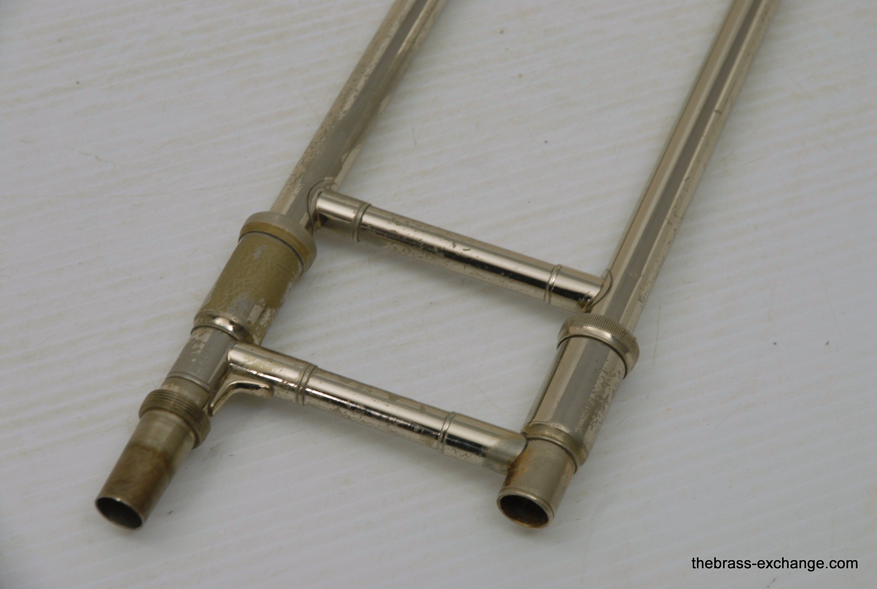 Bach 50LT Bass Trombone Handslide. Corporation Era from 1969. If this slide would have been made 6 years earlier it would be a Mt. Vernon Era. Players know that some of the best Bach trombones were made in the 1950's, 60's and 70's. Vincent Bach remained in control of his company up until 1976. The trombones made between 1963 adn 1976 are commonly referred to as "Corporation" era. This is an all original parts/lacquer 1969 make. The Chicago symphony tenor players, Jay Friedman, Michael Mulcahy use 50LT slides on their tenors. A few years ago when visiting Cleveland, Massimo Larosa showed me his Gold Brass 42 with a 50LT Handslide. This makes a tenor play huge, but it's just a great bass trombone slide too. This one is getting a chemical bath and set up prior to delivery. The previous owner had electrial tape wrapped on the lower cork barrel and it ate into the lacuer. Upon request, we will strip, polish and relacquer the lower cork barrell. Please call or email for price. Great playing slide as is.