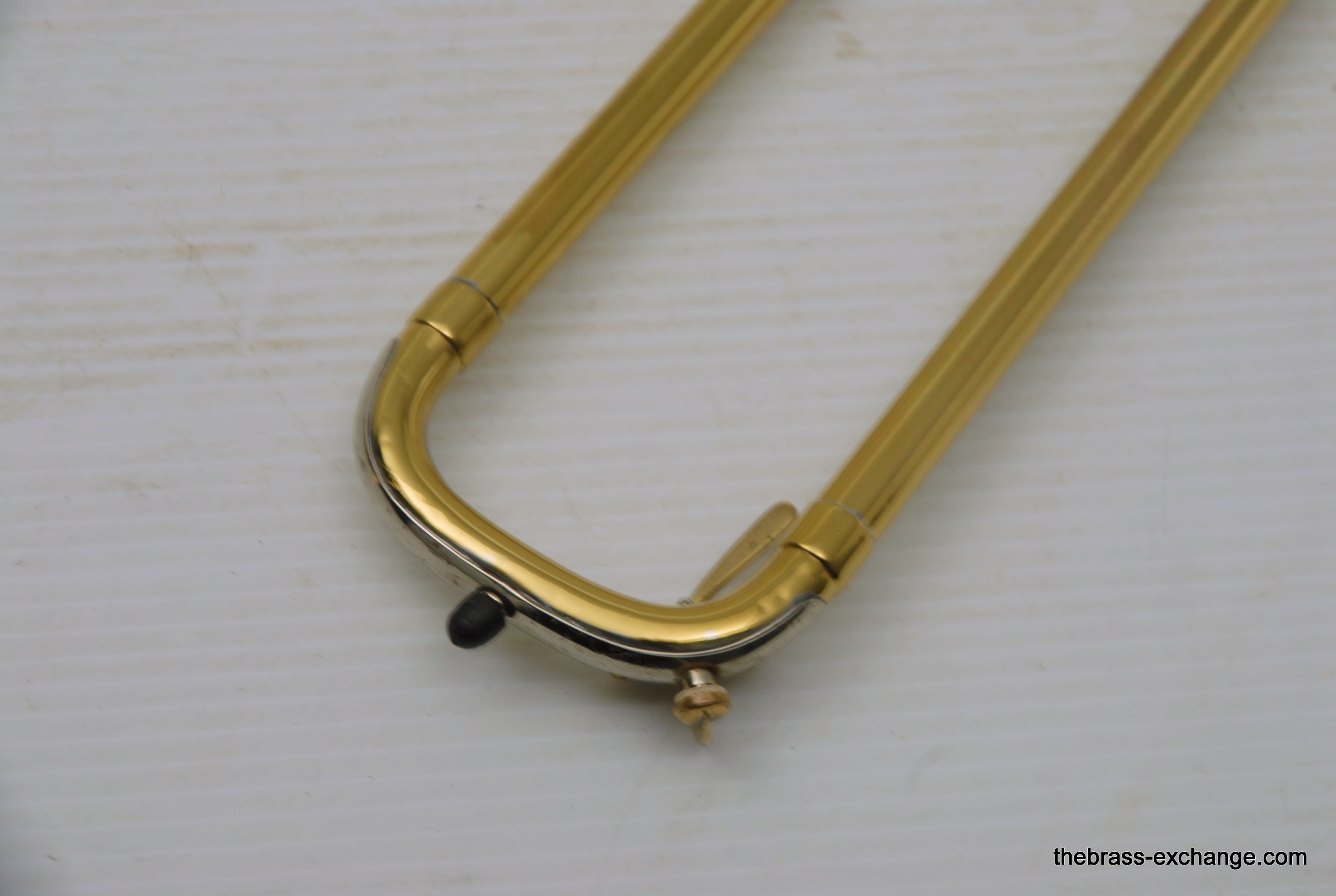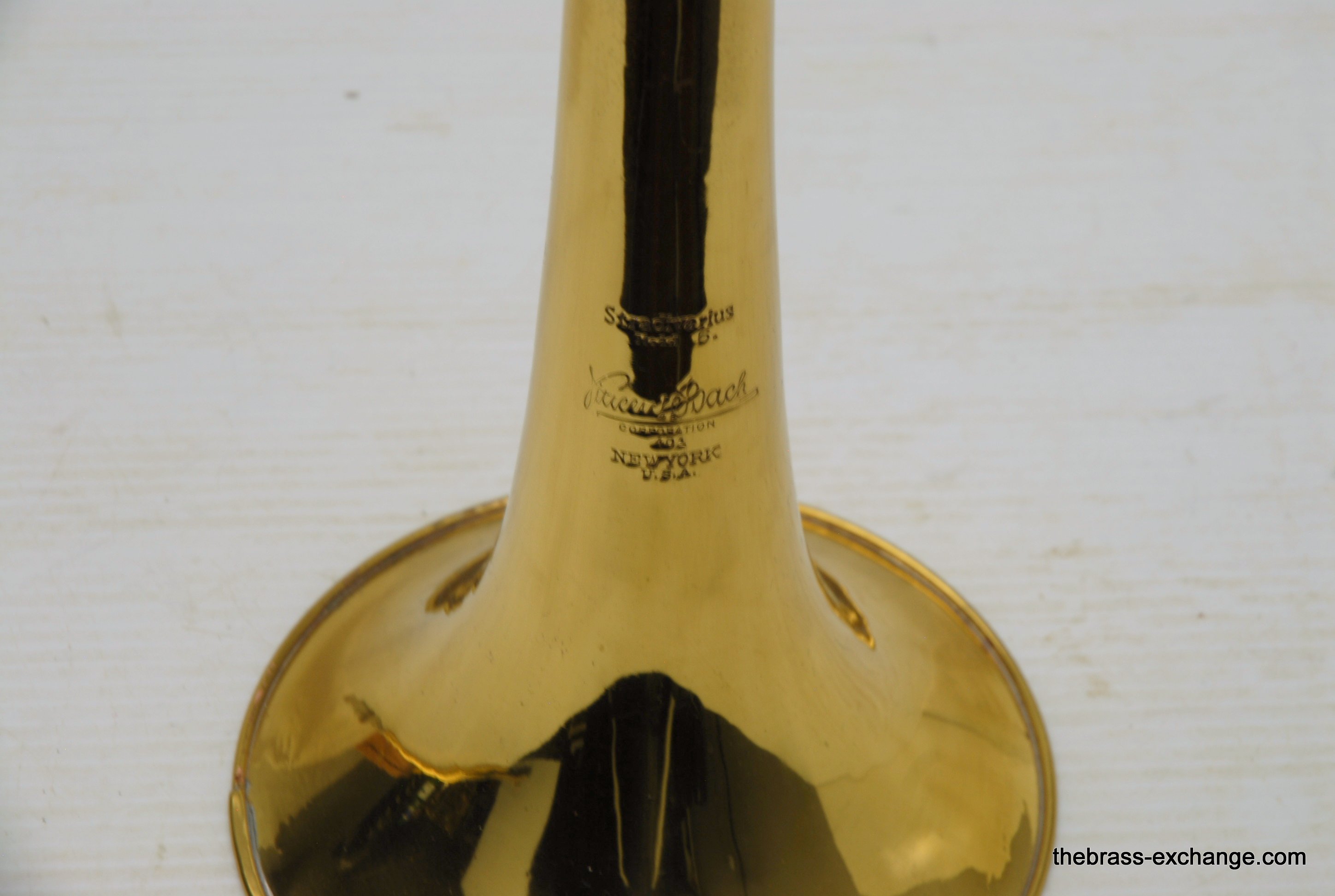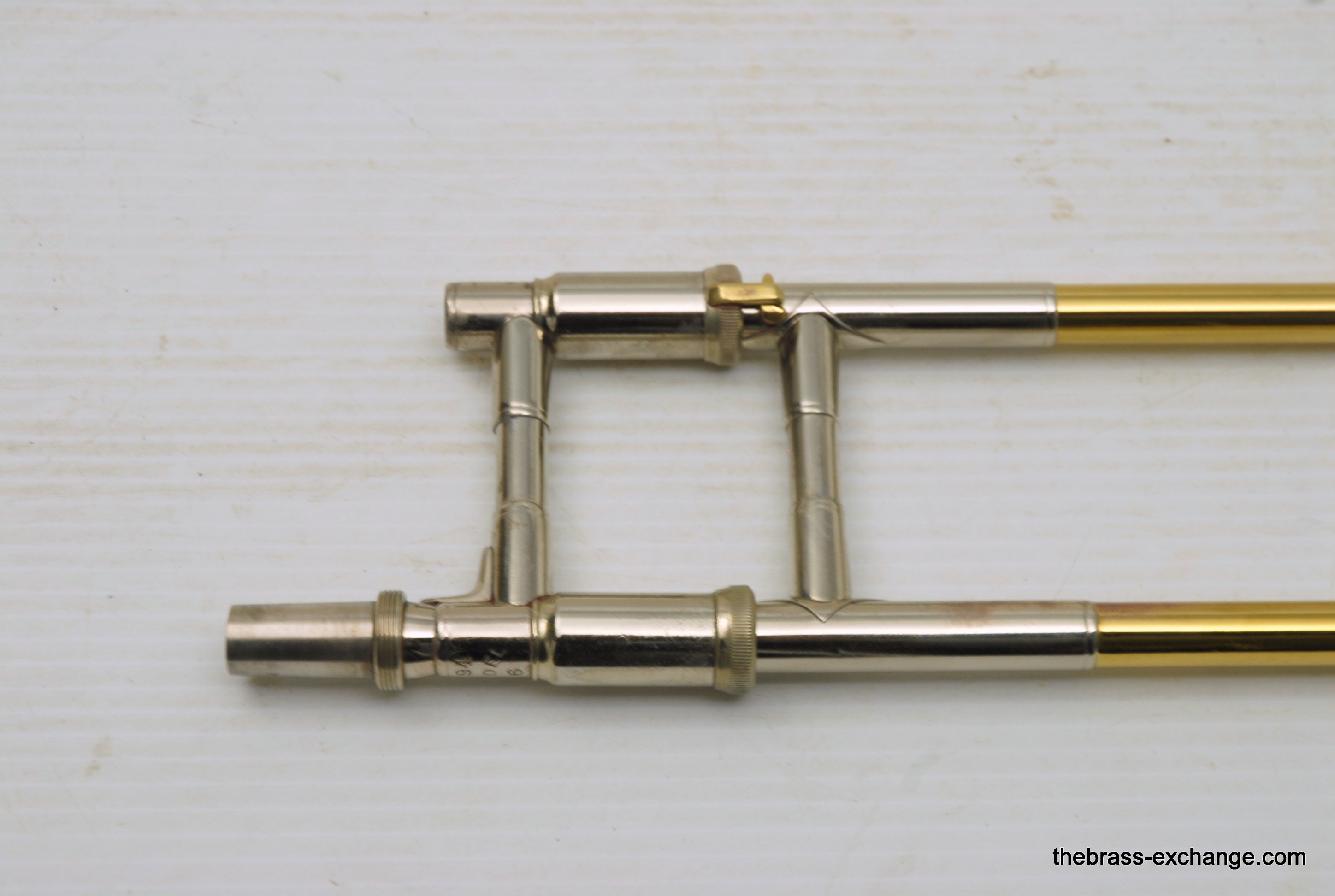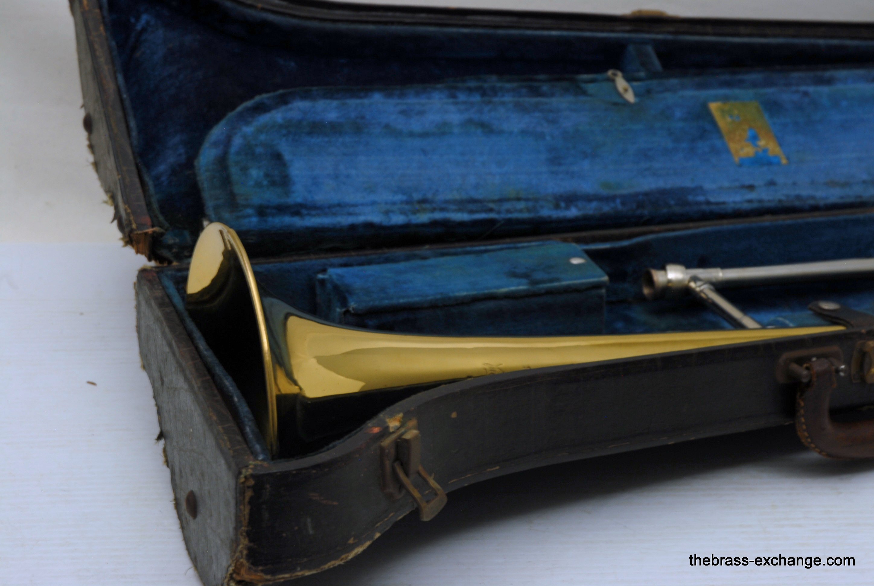 Bach 6 New York Era.  Has a 3 digit serial number 69x is from the 1930's.  If you were a trombone player during the big band era and played with Glen Miller, he would be pleased with your equipment choice.  It's small, has small bore and 7" bell.  But, that's what they played on back then.  This one is interesting with the nickel silver neckpipe.  The handslide is standard weight.  The bell had a repair and was relacquered years ago.  There is a light patch on the bell rim about 4-5 inches, yet it still plays good.  The previous owner who had it for 50 years, didn't seem to mind the patch one bit.  Has had full shop service with chemical bath.  Is gig ready.  Original case is in need of repair, but still works.  This is a good deal on such a historic NY Bach.  In-stock for immediate delivery.