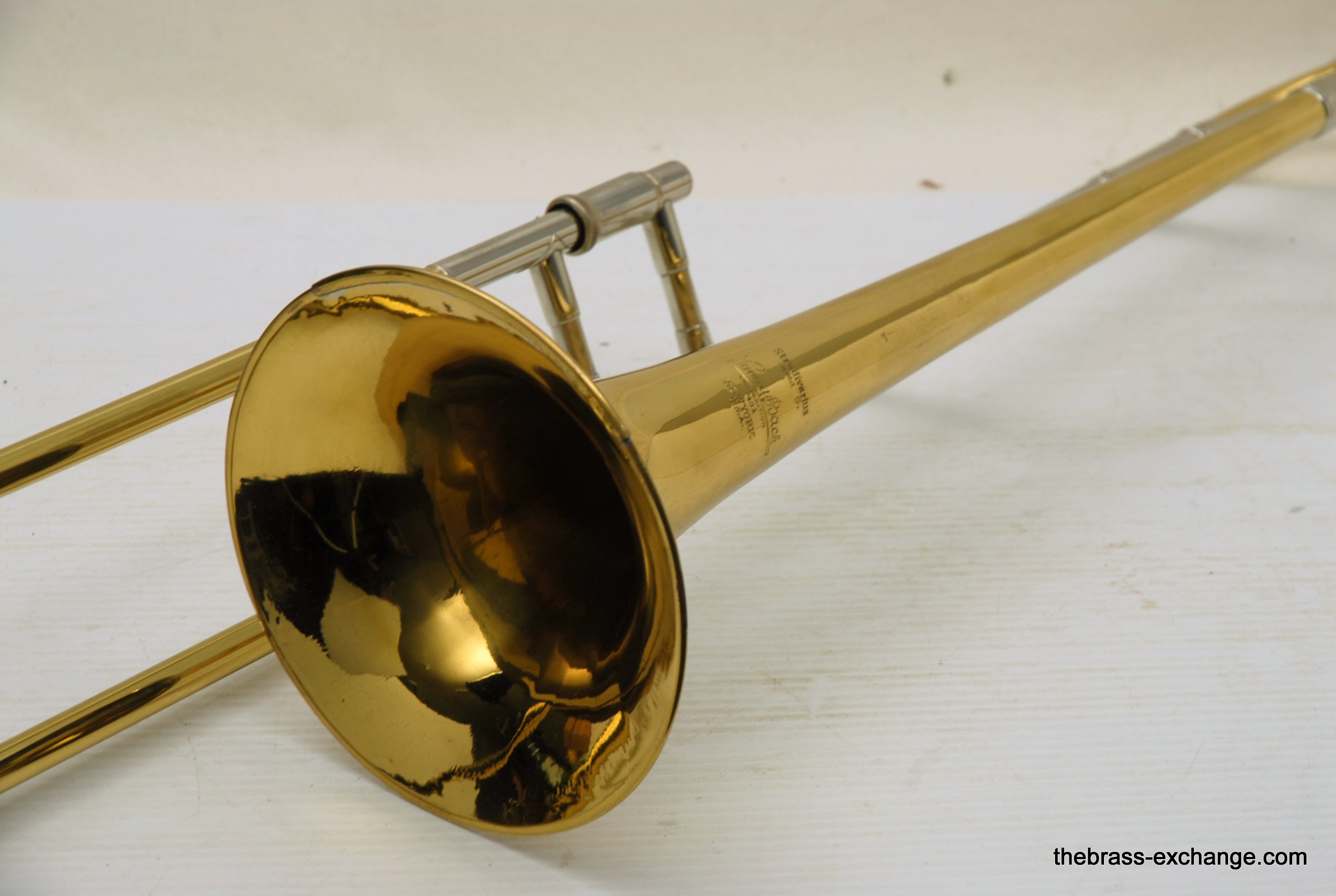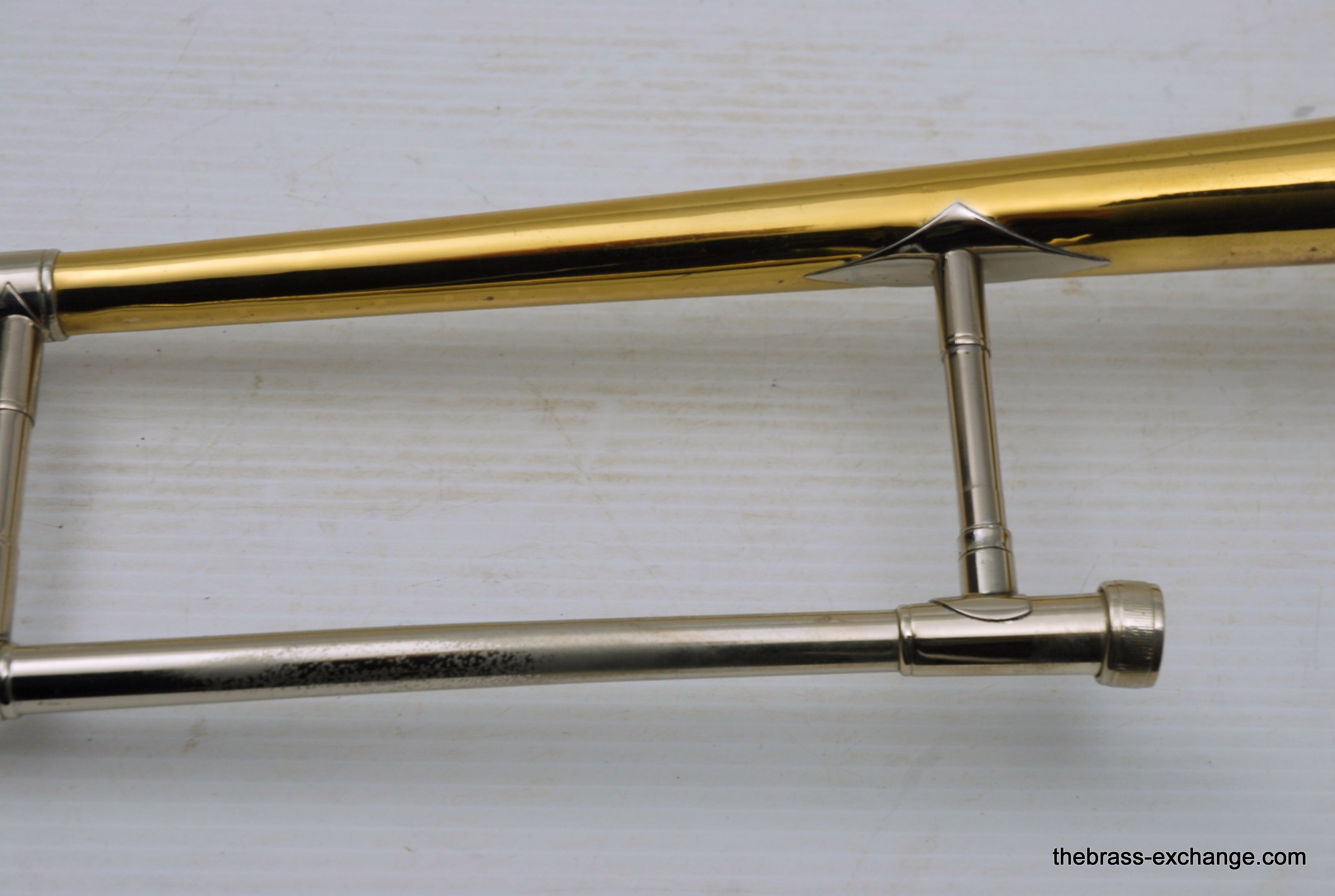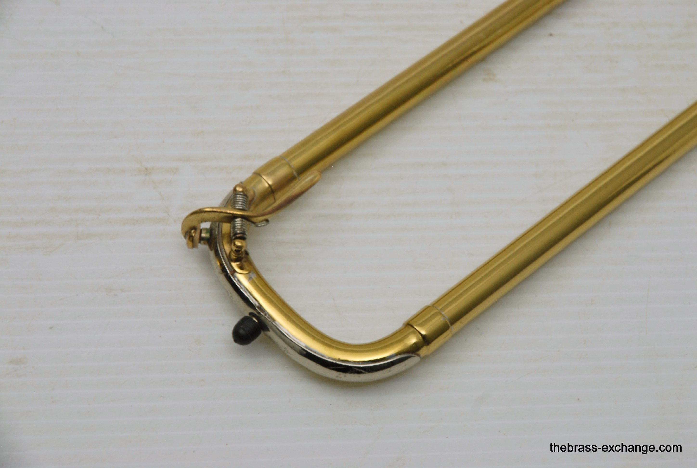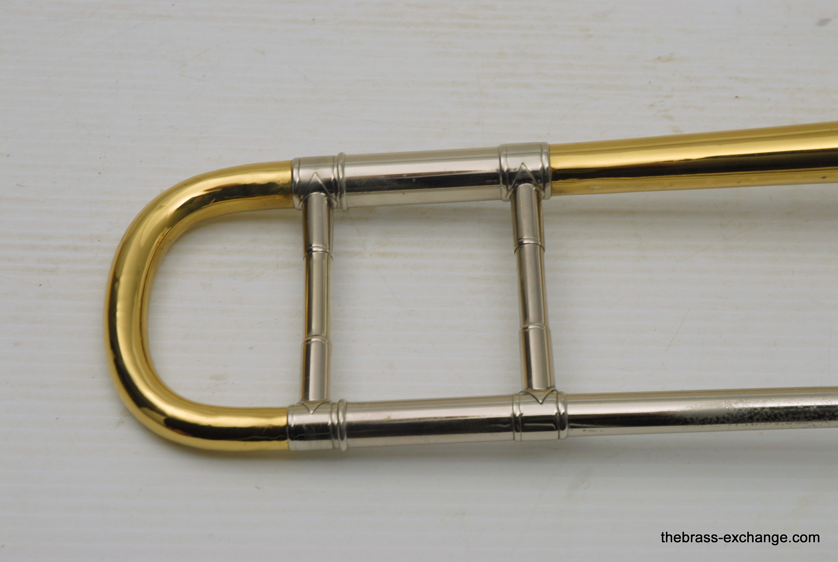 Bach 6 New York Era.  Has a 3 digit serial number 69x is from the 1930's.  If you were a trombone player during the big band era and played with Glen Miller, he would be pleased with your equipment choice.  It's small, has small bore and 7" bell.  But, that's what they played on back then.  This one is interesting with the nickel silver neckpipe.  The handslide is standard weight.  The bell had a repair and was relacquered years ago.  There is a light patch on the bell rim about 4-5 inches, yet it still plays good.  The previous owner who had it for 50 years, didn't seem to mind the patch one bit.  Has had full shop service with chemical bath.  Is gig ready.  Original case is in need of repair, but still works.  This is a good deal on such a historic NY Bach.  In-stock for immediate delivery.