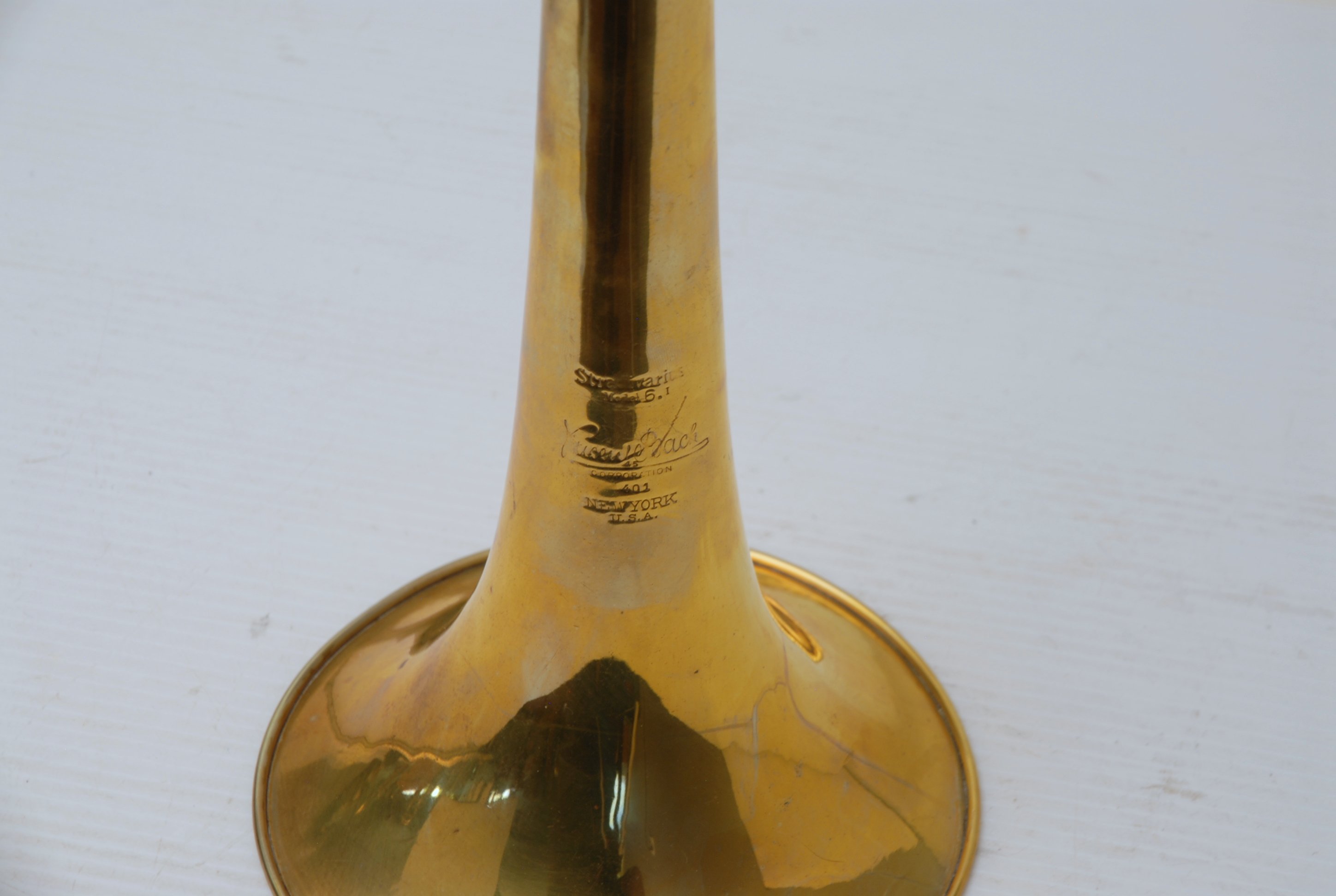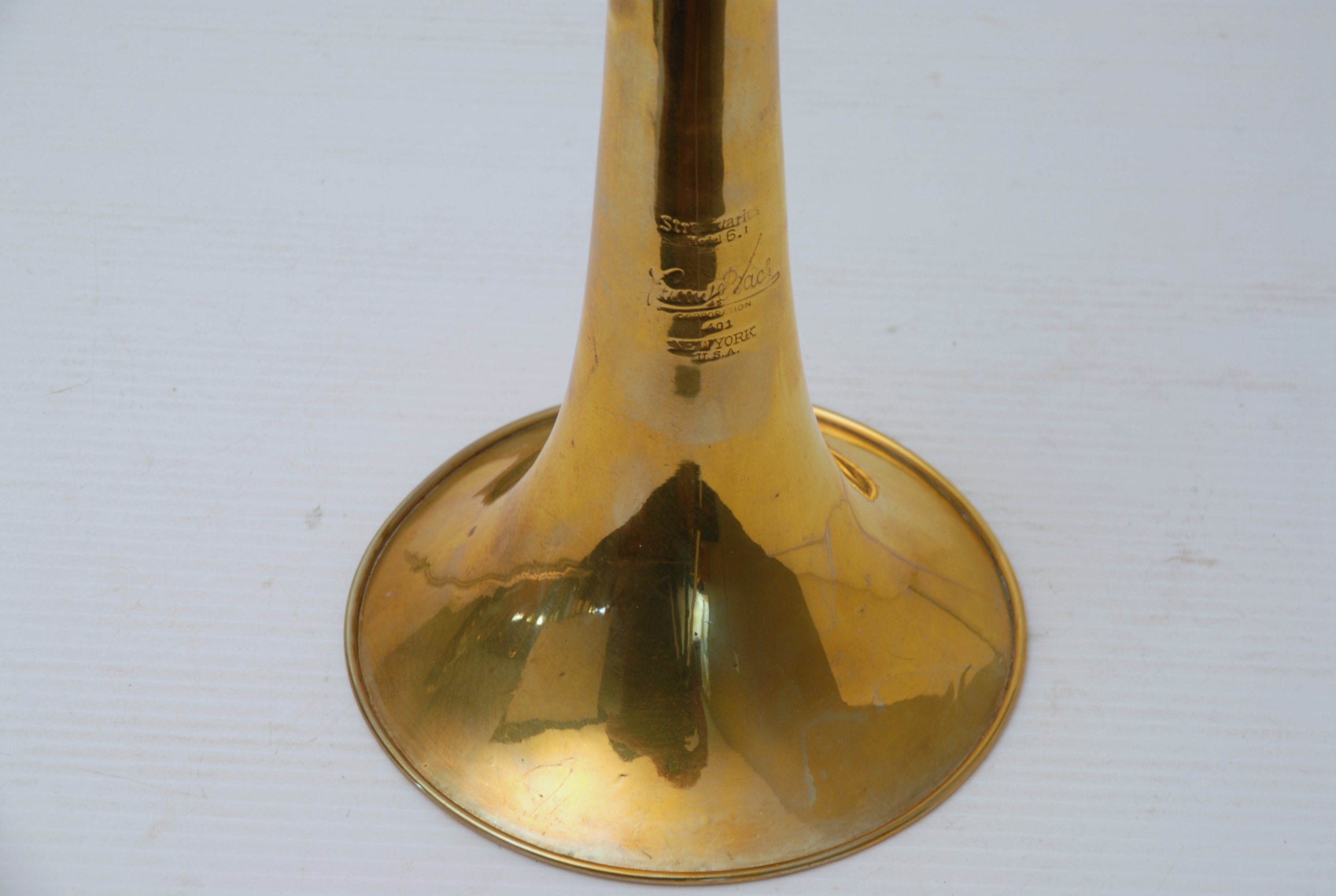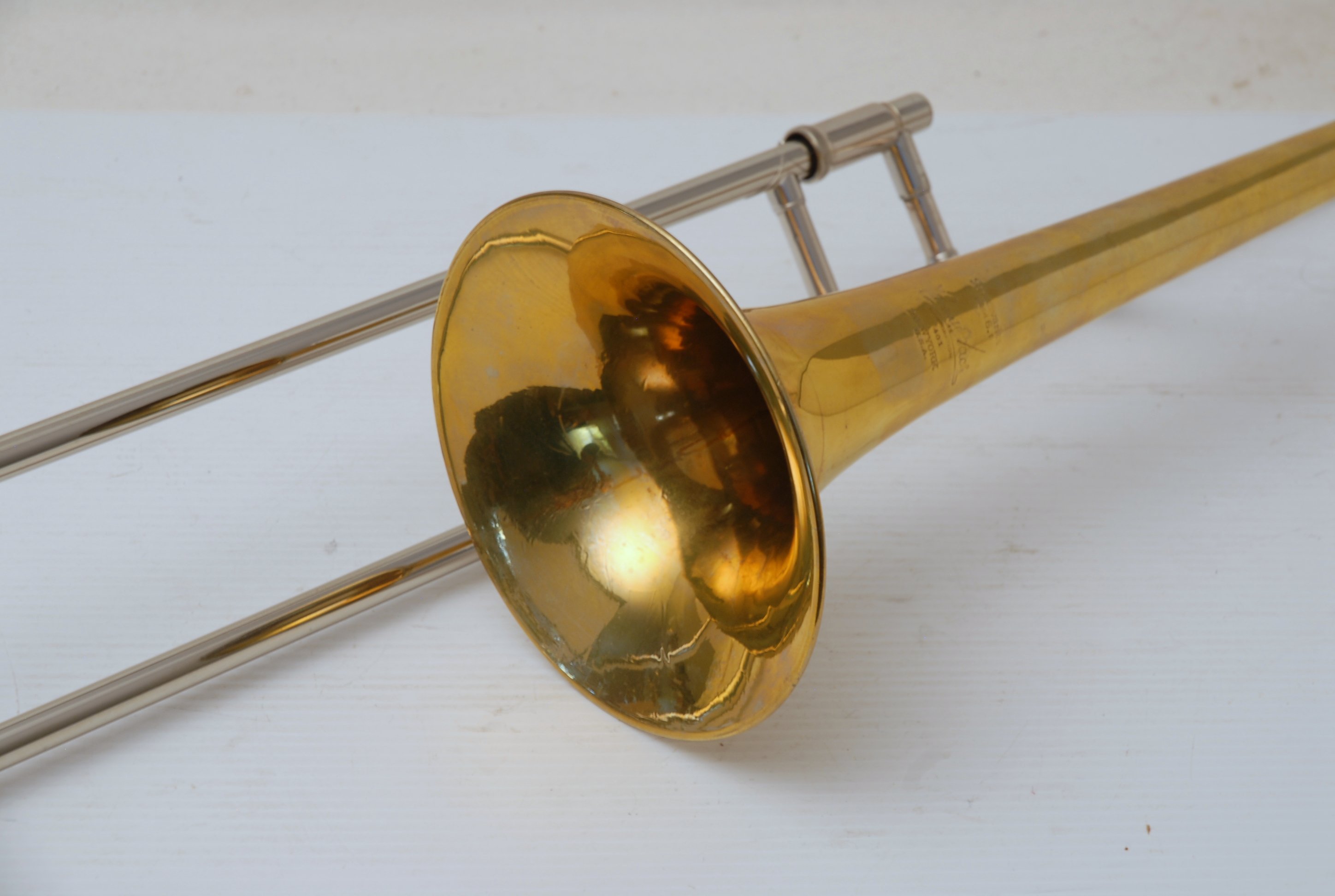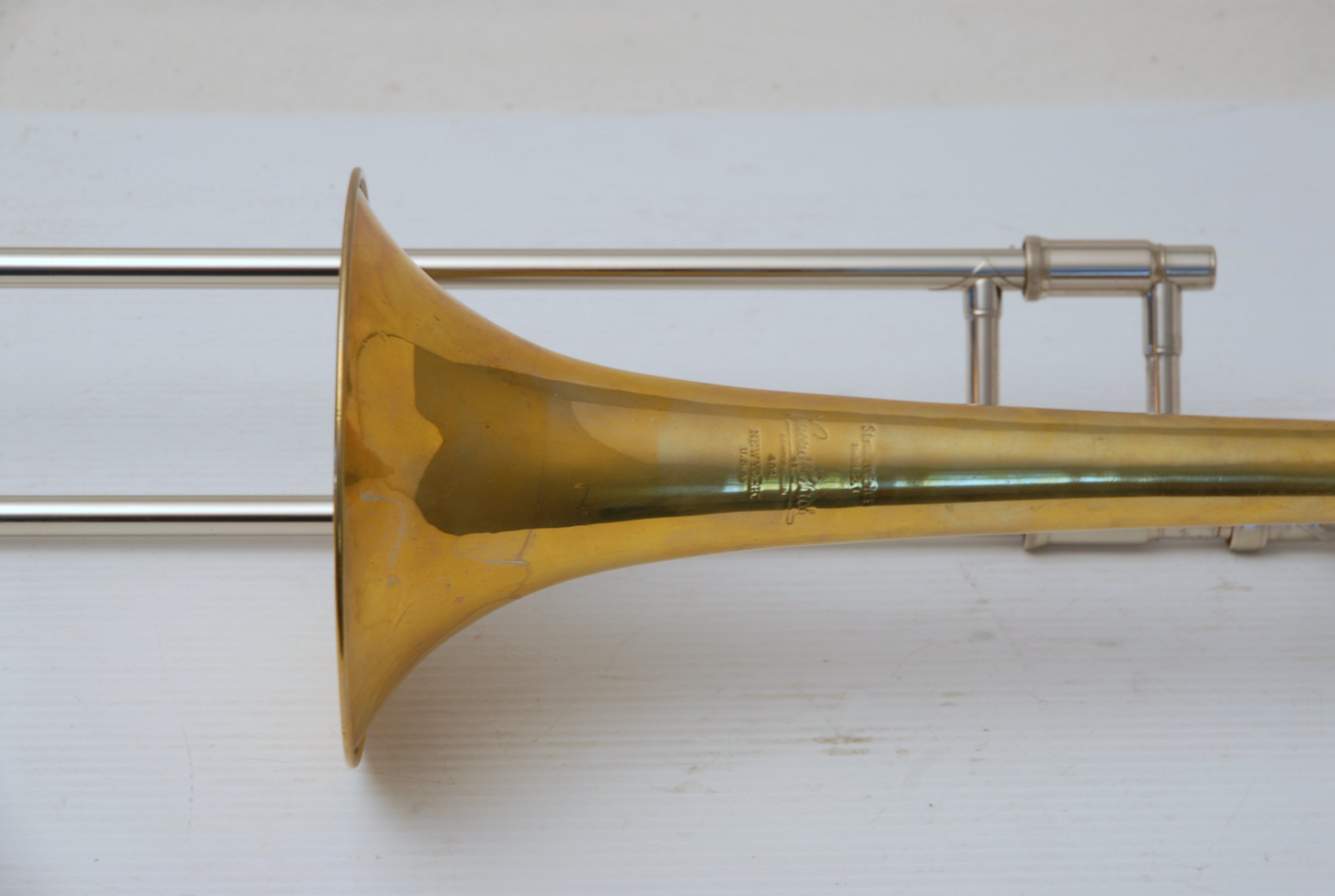 Bach 6.1 Vintage New York era made in 1941.  Hard to believe that one fo these is still in existence in such great condition.  Plays really nice and has a very good Light Weight Nickel Slide.  Has 1 piece yellow brass bell with 7" flare and nickel silver neckpipe.  Most of the lacquer is of the bell flare, but not the neck, braces, tuning slide or handslide.  This .485 bore has lots of center and would make a fantastic lead horn.  No wonder why Glenn Miller made all of his section players play on these.  Non-Original Gator Case included.