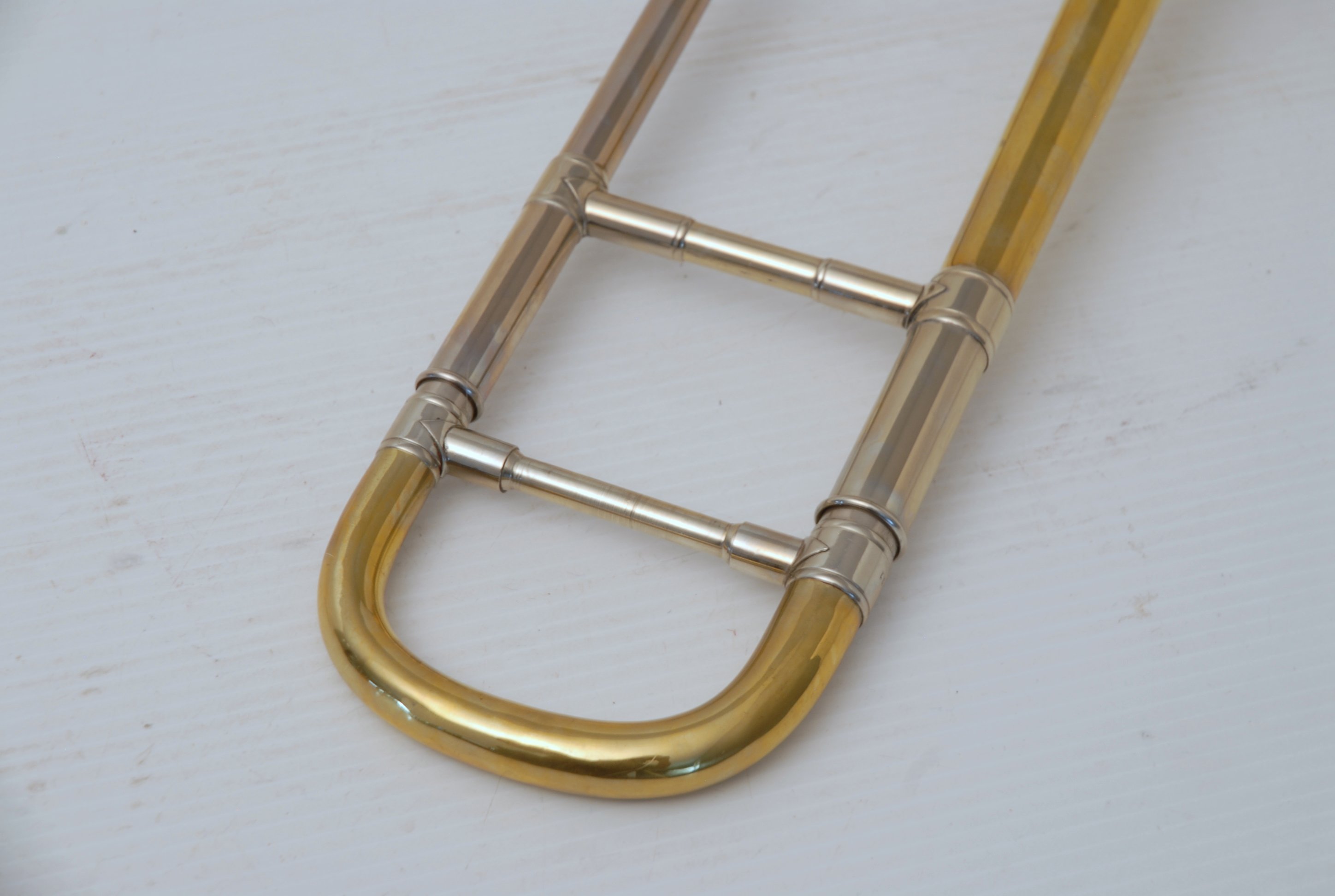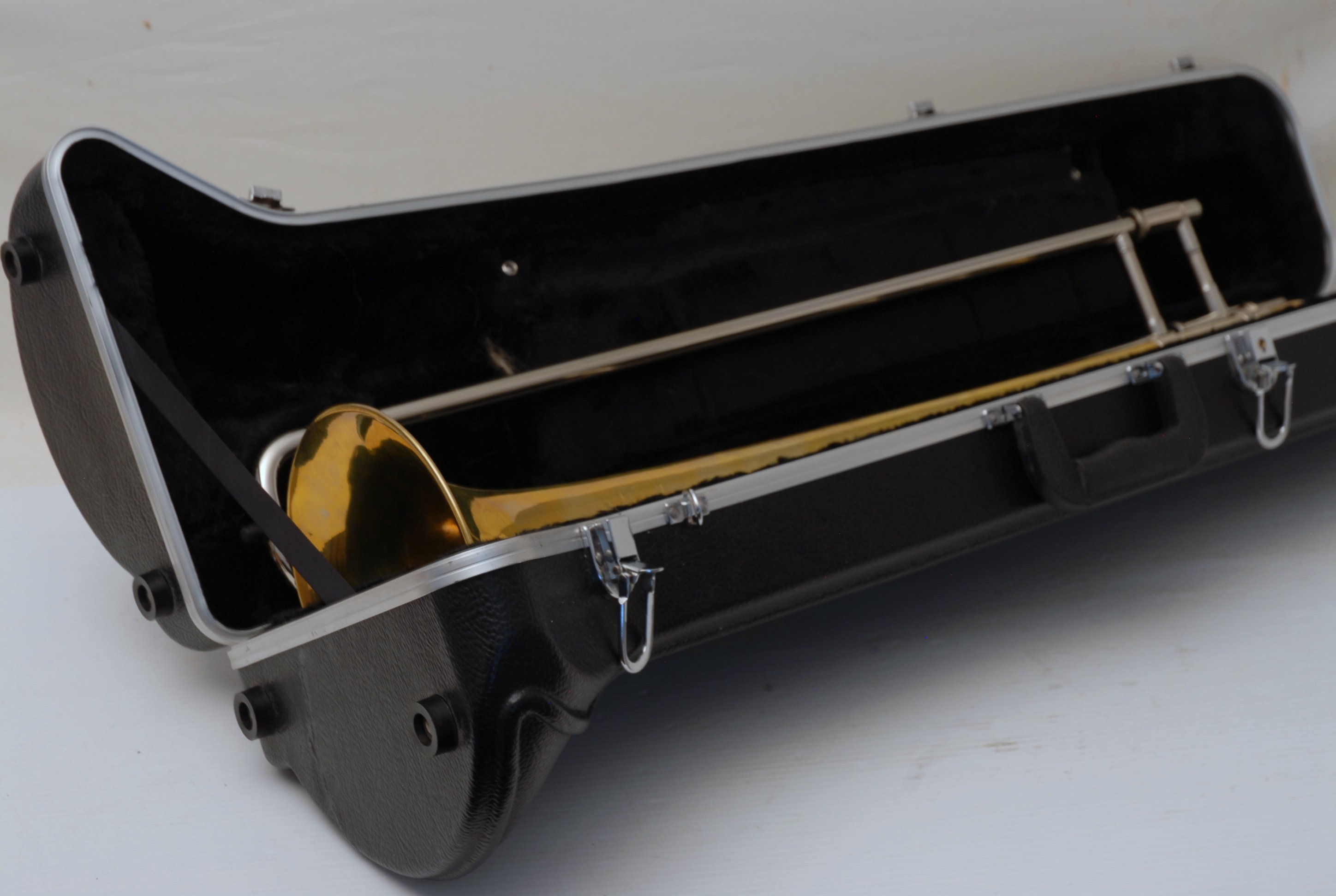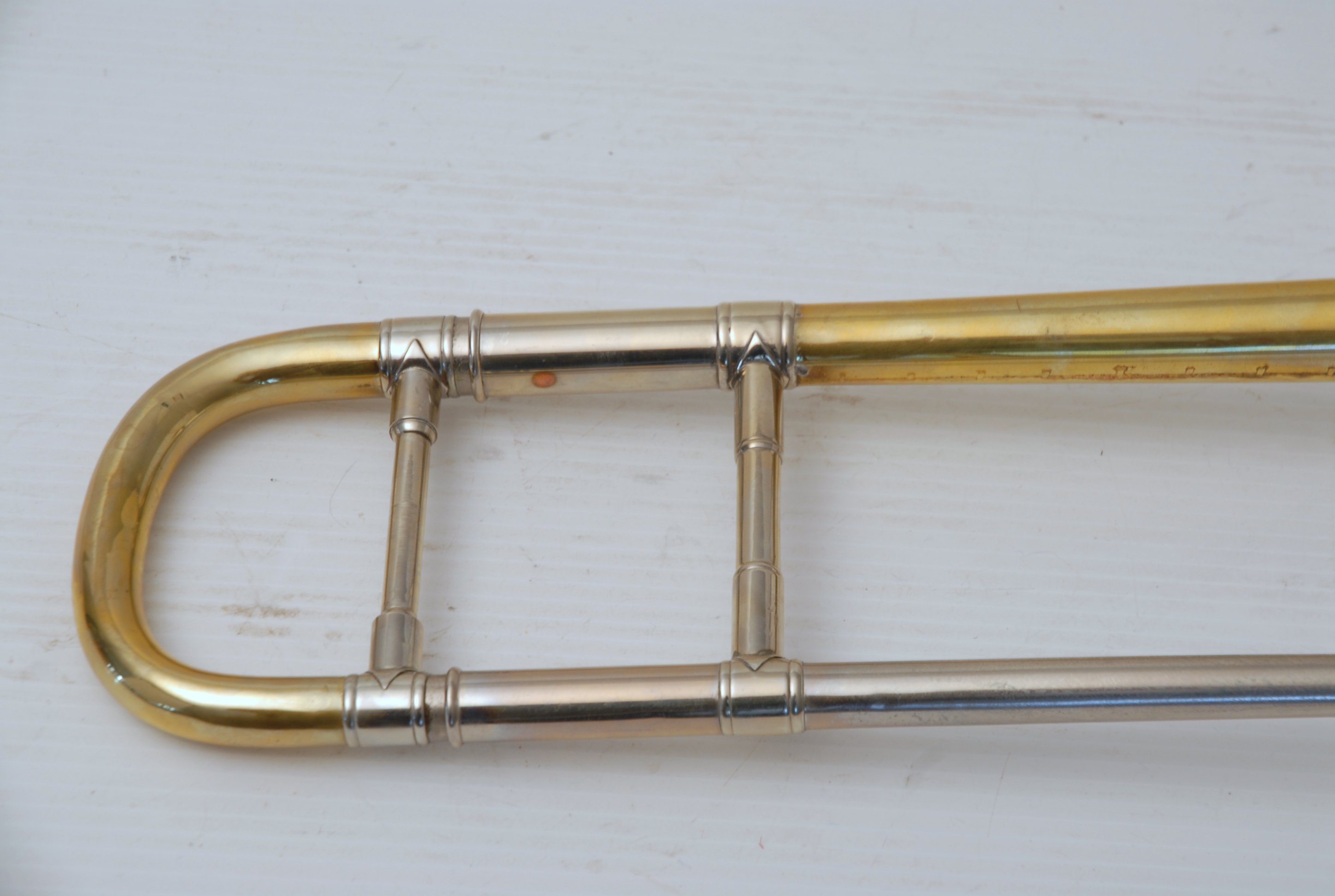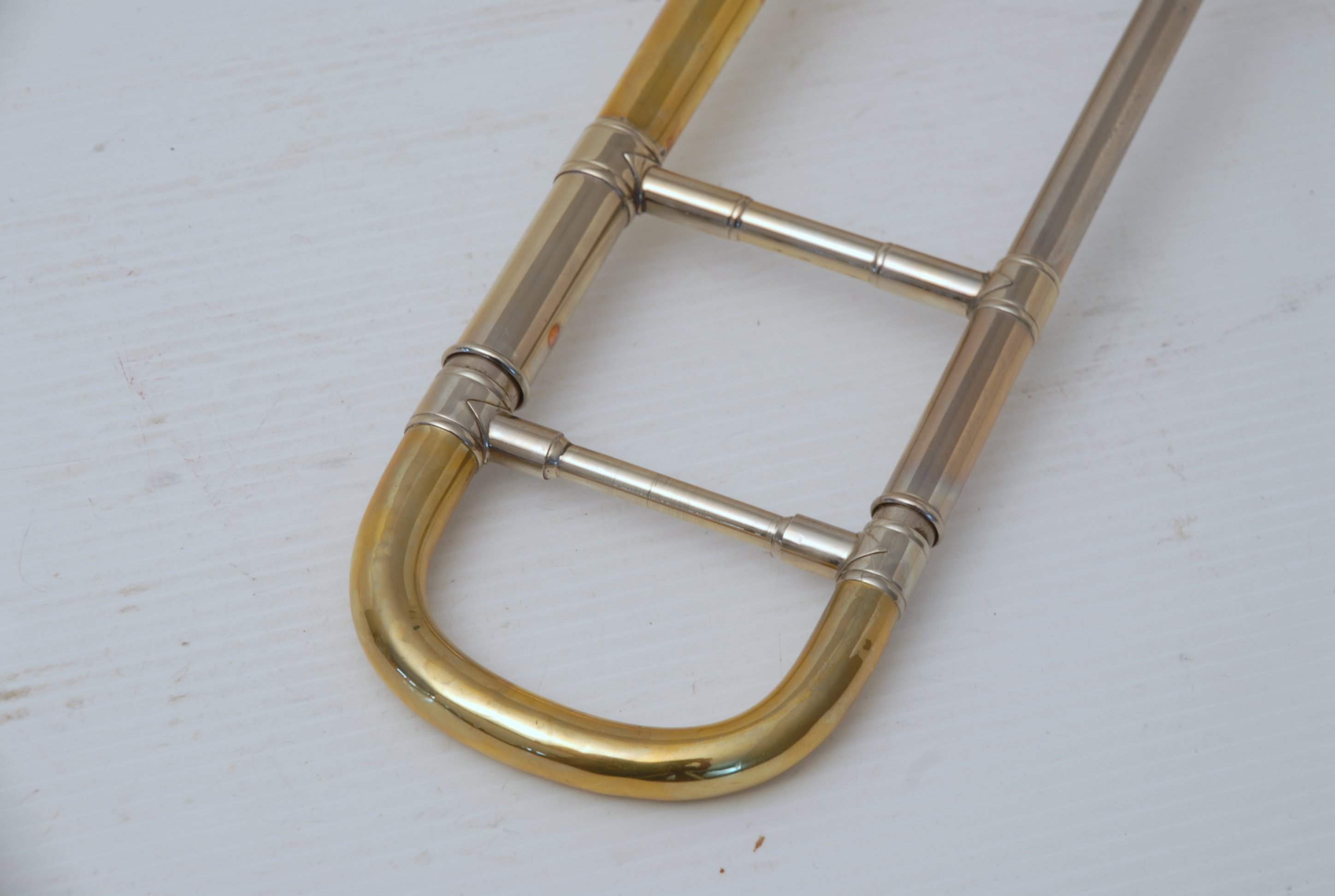 Bach 6.1 Vintage New York era made in 1941.  Hard to believe that one fo these is still in existence in such great condition.  Plays really nice and has a very good Light Weight Nickel Slide.  Has 1 piece yellow brass bell with 7" flare and nickel silver neckpipe.  Most of the lacquer is of the bell flare, but not the neck, braces, tuning slide or handslide.  This .485 bore has lots of center and would make a fantastic lead horn.  No wonder why Glenn Miller made all of his section players play on these.  Non-Original Gator Case included.