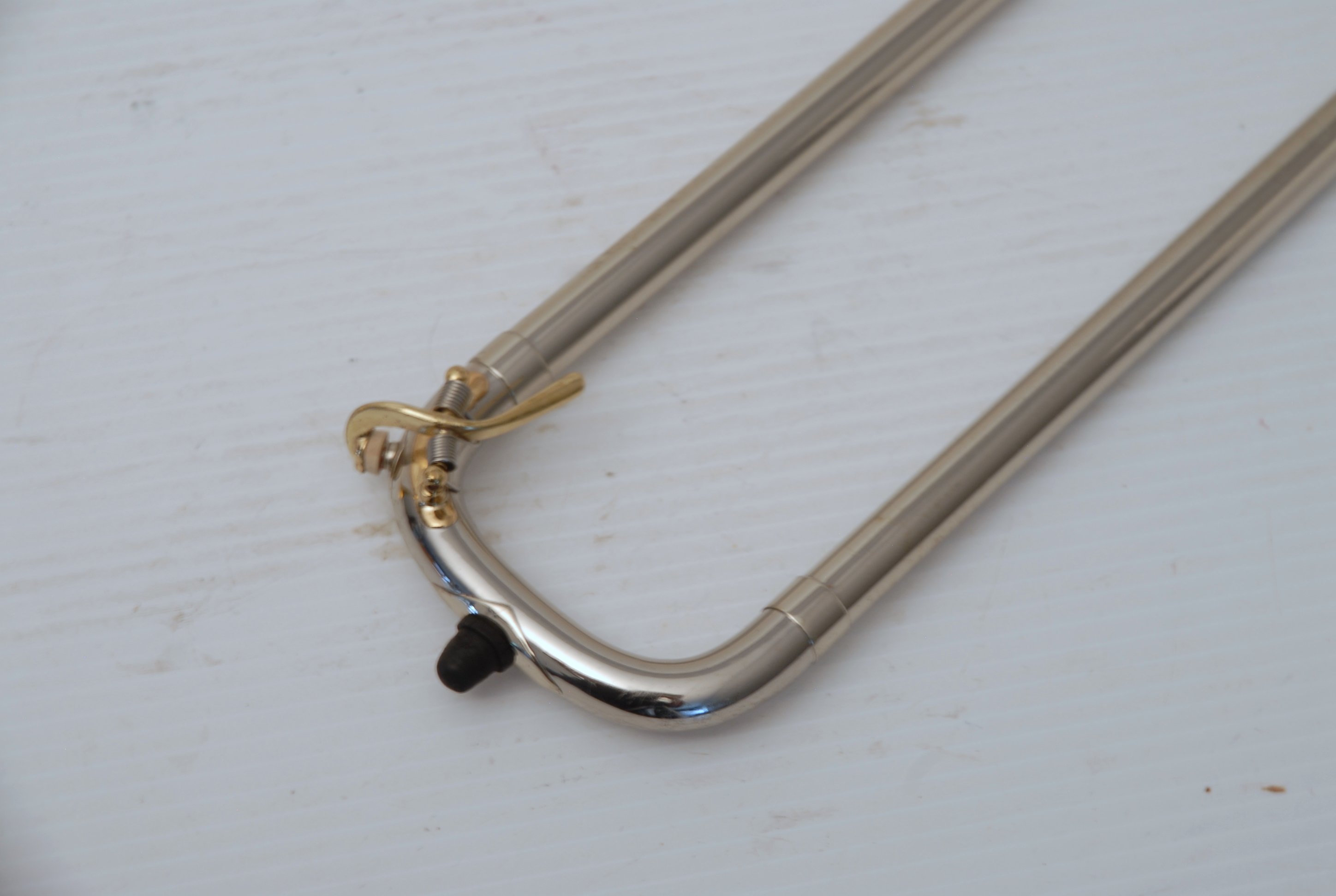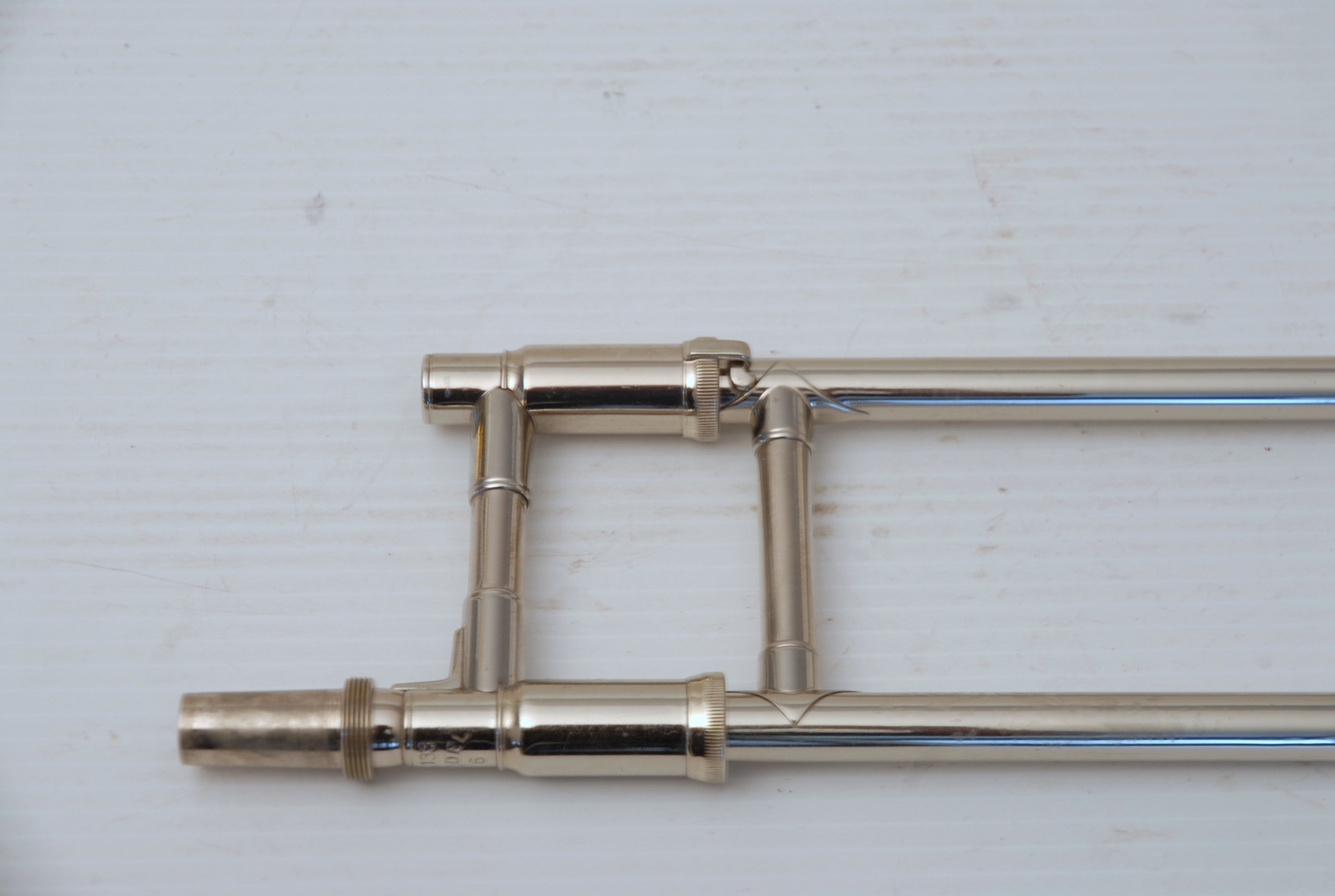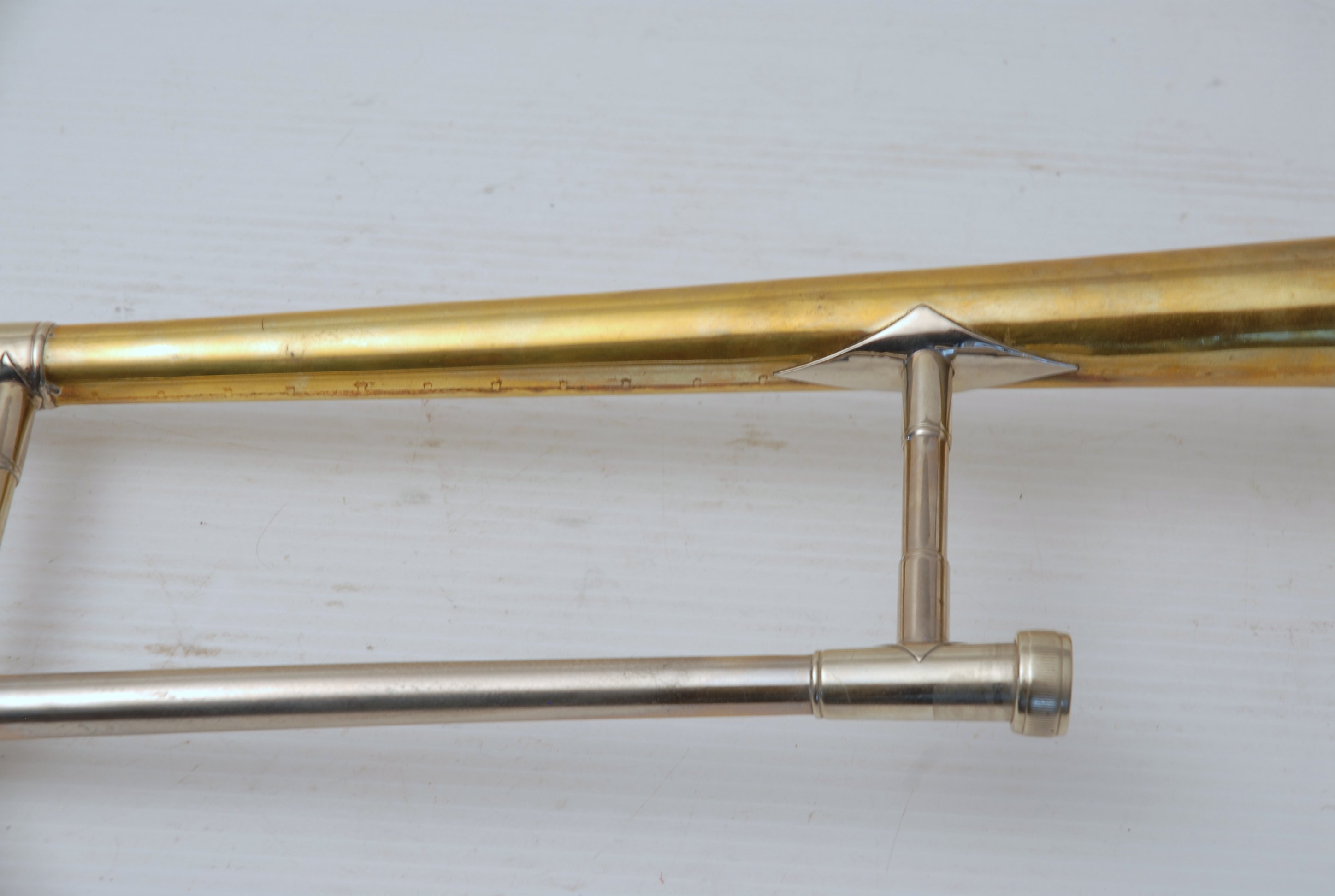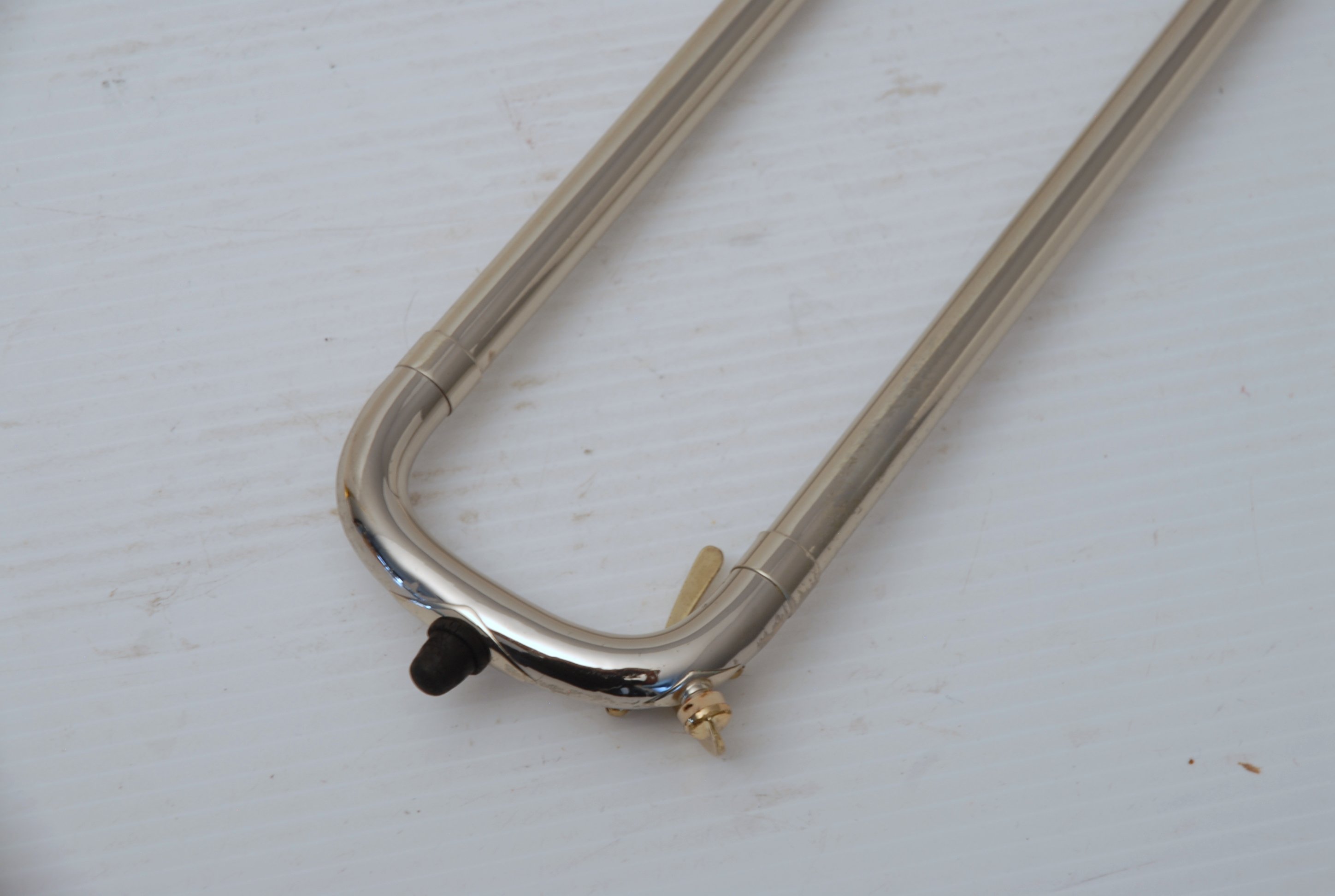 Bach 6.1 Vintage New York era made in 1941.  Hard to believe that one fo these is still in existence in such great condition.  Plays really nice and has a very good Light Weight Nickel Slide.  Has 1 piece yellow brass bell with 7" flare and nickel silver neckpipe.  Most of the lacquer is of the bell flare, but not the neck, braces, tuning slide or handslide.  This .485 bore has lots of center and would make a fantastic lead horn.  No wonder why Glenn Miller made all of his section players play on these.  Non-Original Gator Case included.
