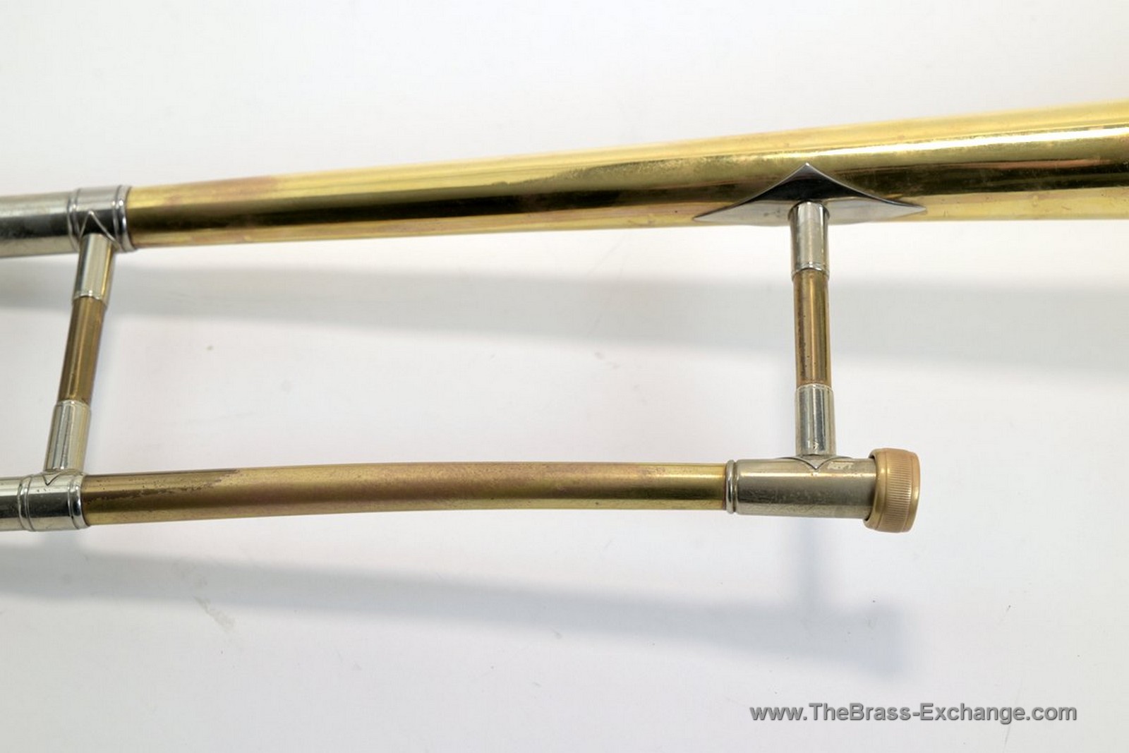 There are areas of lacquer wear typical for a vintage instrument, including the slide grip areas, outer slide tubes, and neck area. These are cosmetic only and do not affect performance.