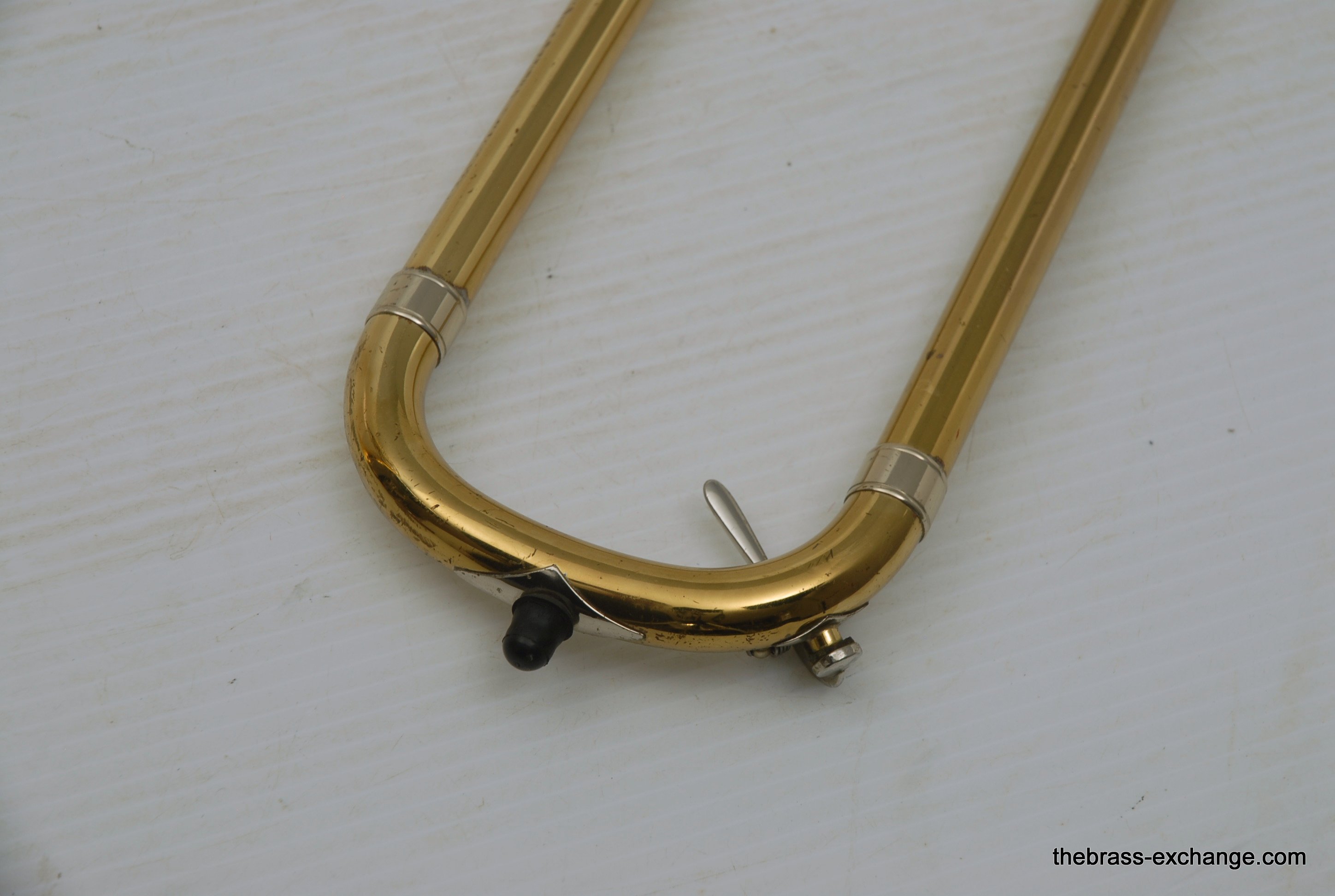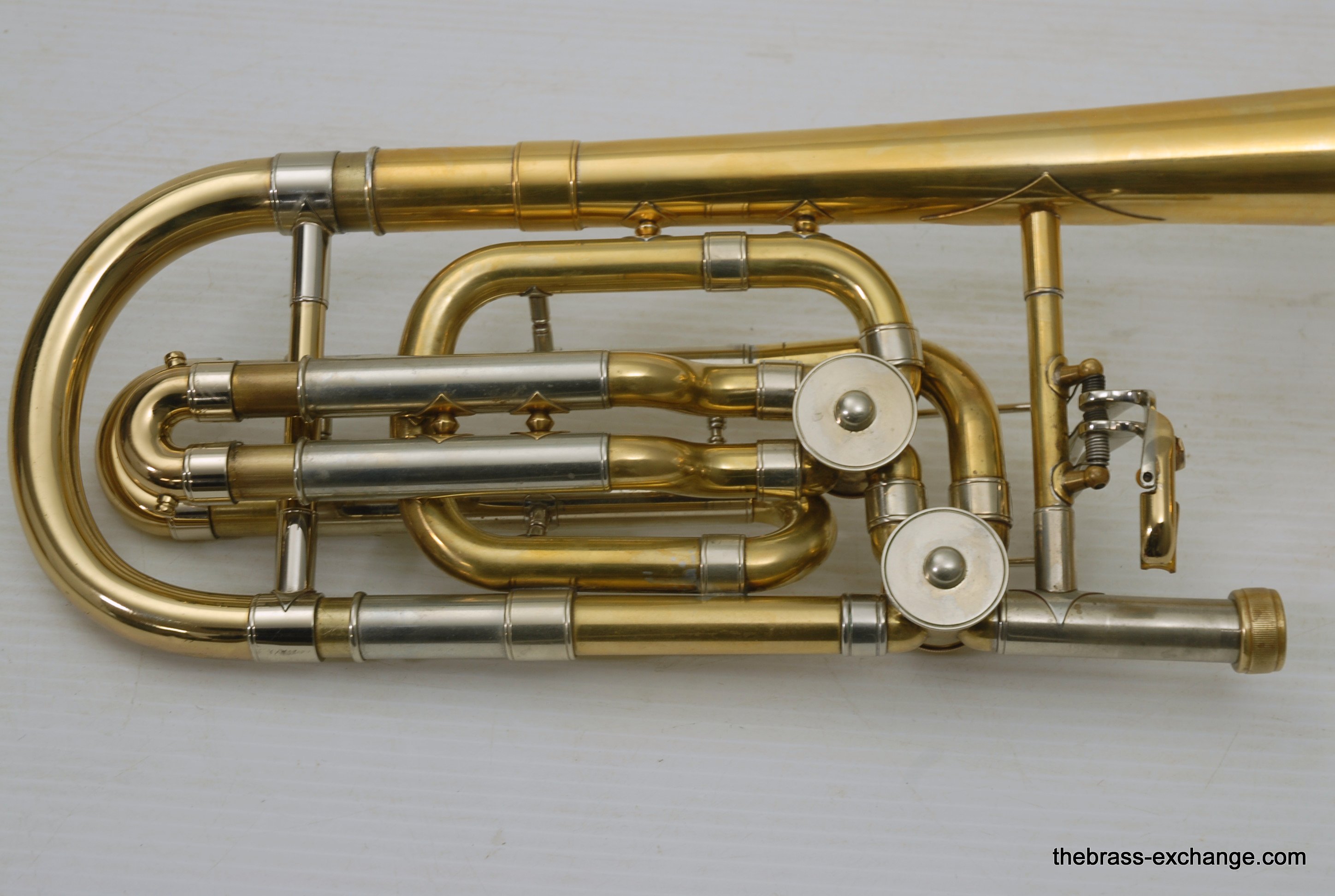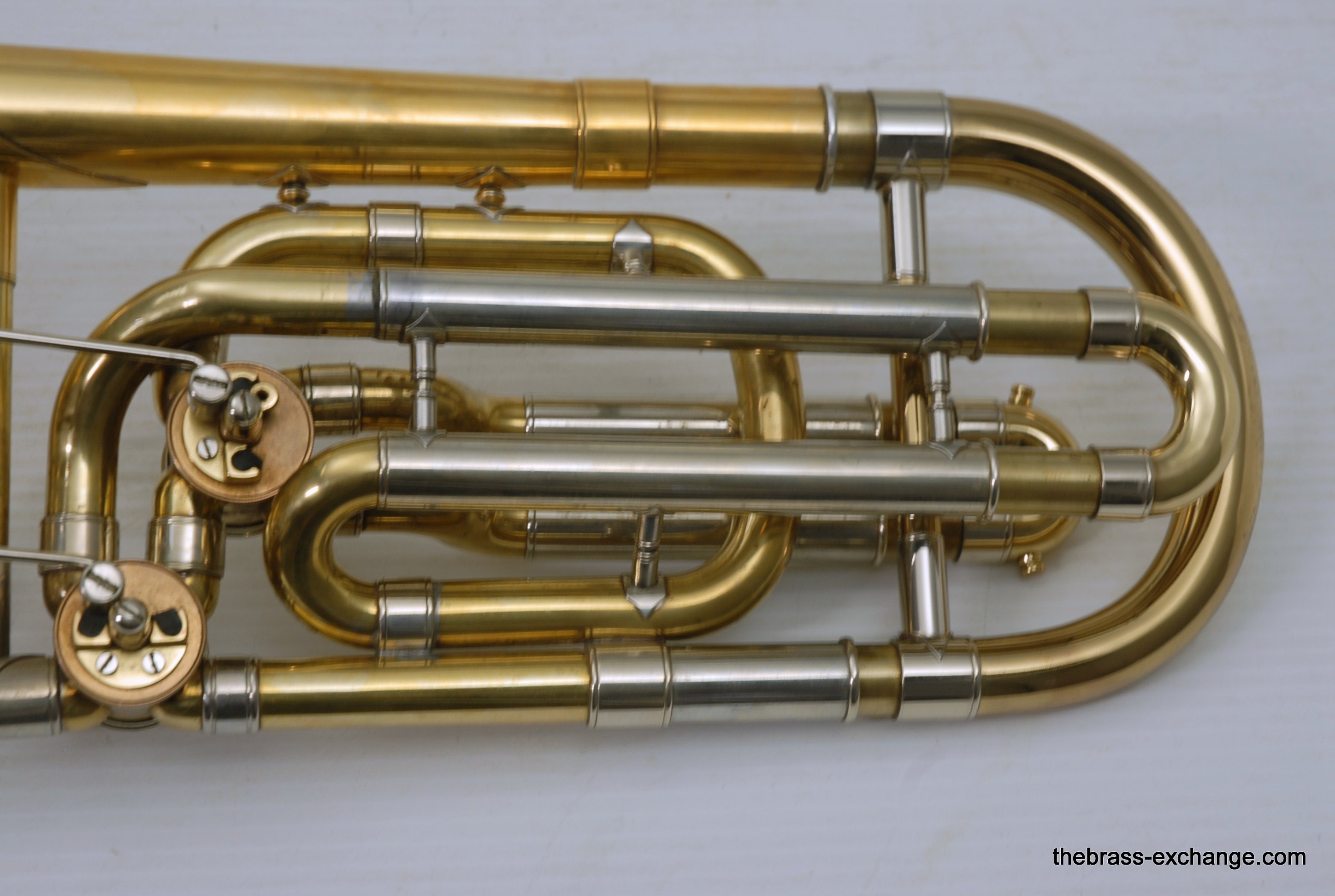 Bach 50B2 Bass Trombone "Corporation" 1973 Gold Plated. Dependent Valve Set with Bb/F/Eb Tuning. The original owner, a prodigy of Edward Kleinhammer, Chicago Symphony, had the bell gold plated. Tuning slides are brass/lacquer.  Now retired from playing 20 years, this horn played over 500 Nutcrackers. This is a serious pro level Bass Trombone. No flaws, or issues. Gorgeous dark Bach sound with gold plating, is legit all the way. Never any damage or repairs to bell section or hand slide. The hand slide is fantastic, we did a Pro Slide Set-up. It's as smooth as any great slide can be. Photos taken prior to our shop service, which includes chemical bath, rotors removed, casing polished, adjust, etc. Hand slide is amazing, inner slide tubes are 100% no plating loss, outer tubes excellent too and no signs of dezincification. Original lead pipe, never pulled or modified. Original case. It's not a Mt. Vernon Era, but it is pretty close.