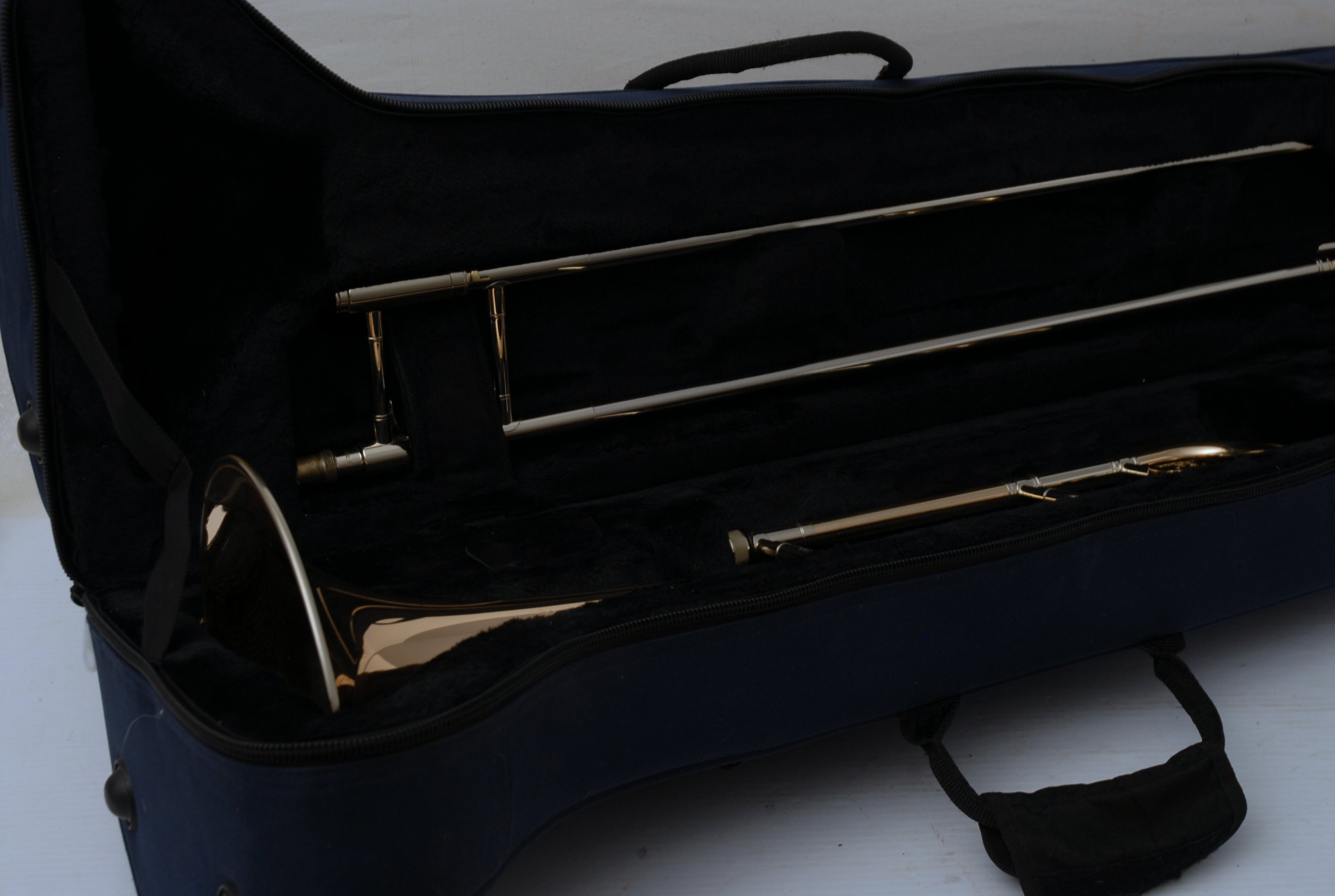 This trombone is in perfect condition, having been used barely and showing no signs of wear. It includes a case and mouthpiece, and there is no service needed to improve its appearance or playabilityβ€”it looks and plays like new.
