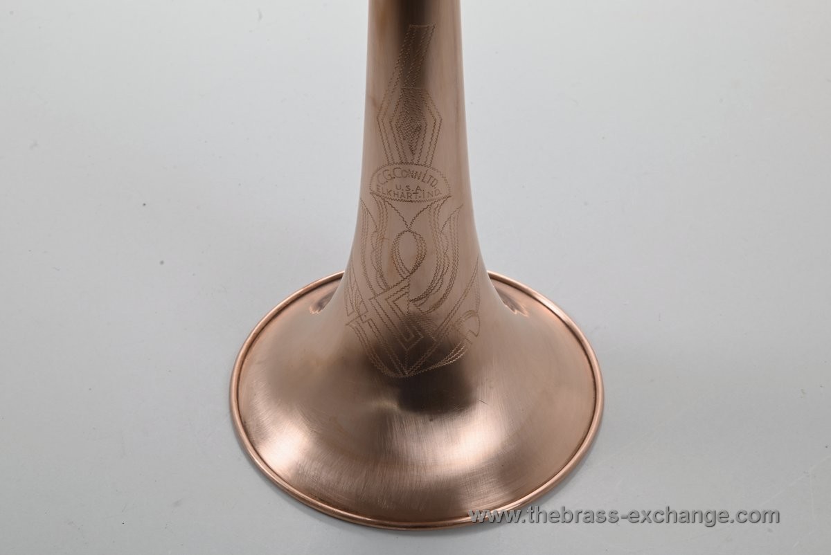 The bell and tuning slide have been de-lacquered by a previous owner and display an attractive scratch-brushed bare brass finish. A qualified brass shop could easily re-lacquer them if desired, as all surface prep has already been completed. The horn showcases distinctive, crisp Art Deco engraving that reflects Conn’s design aesthetic of the era.