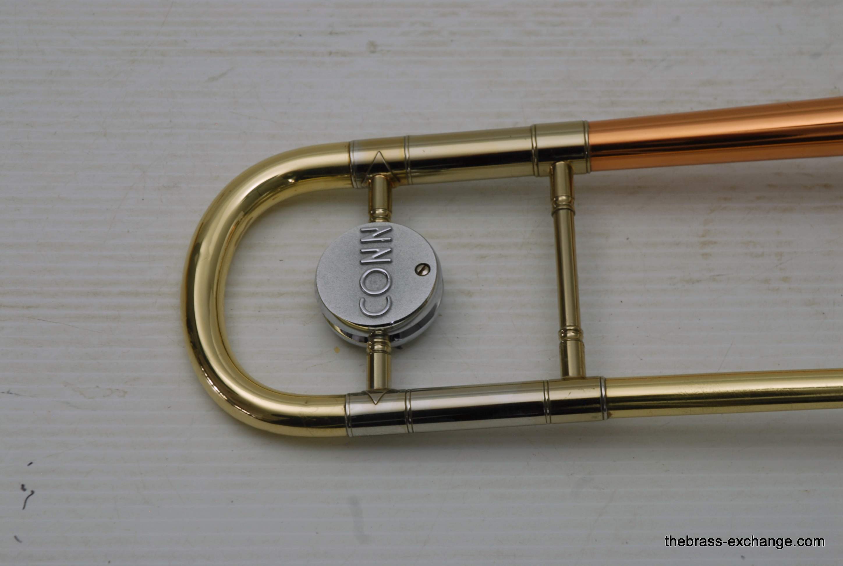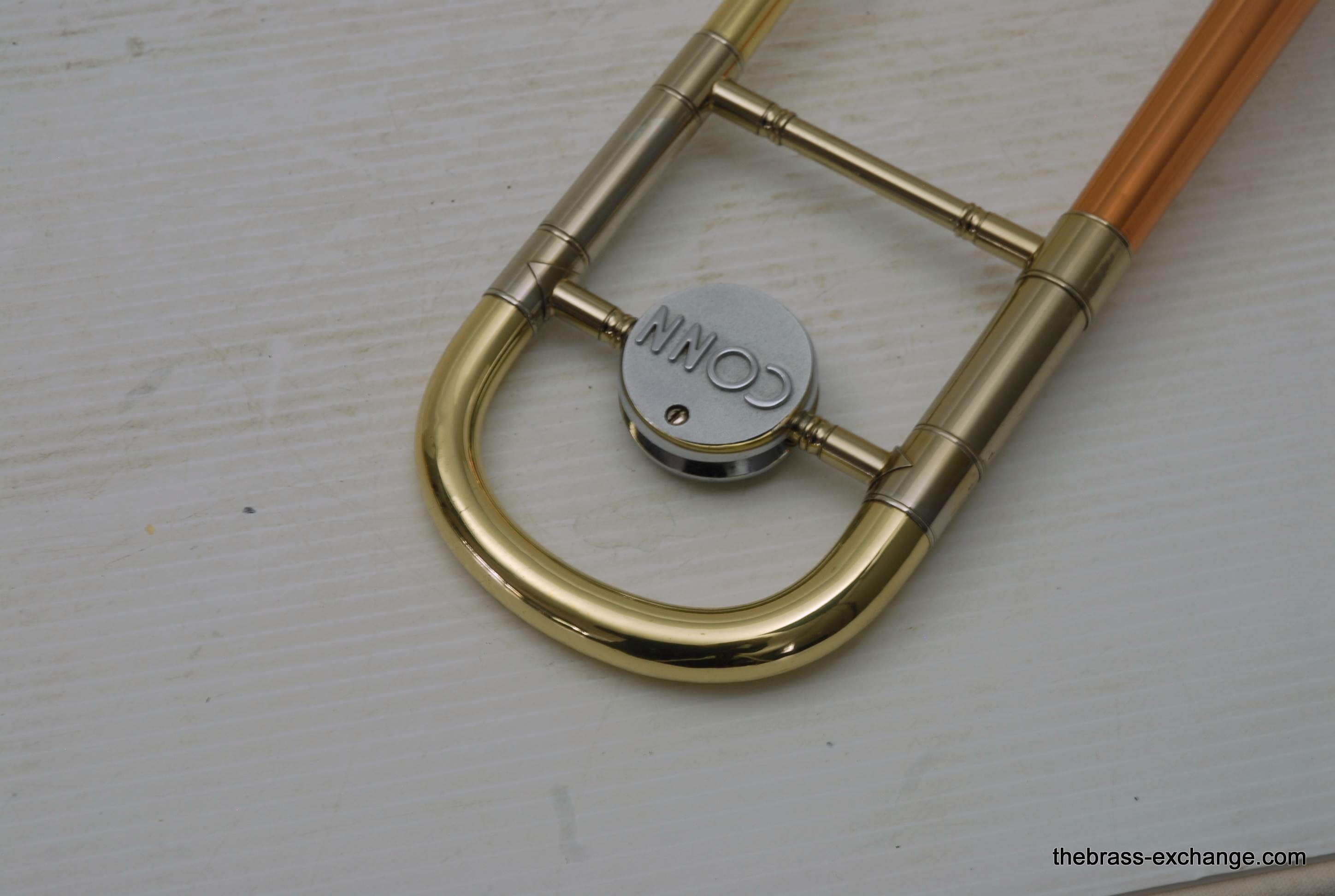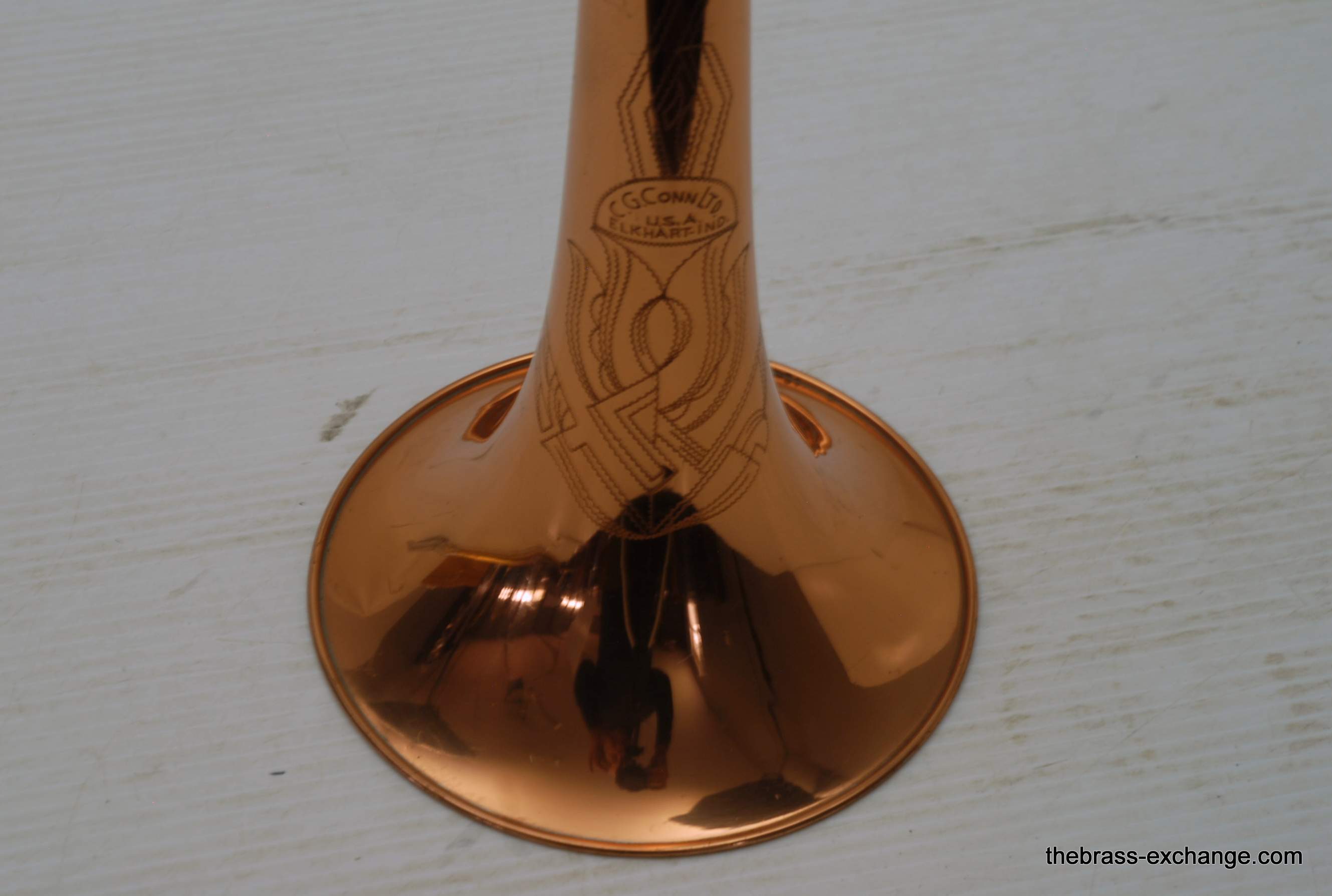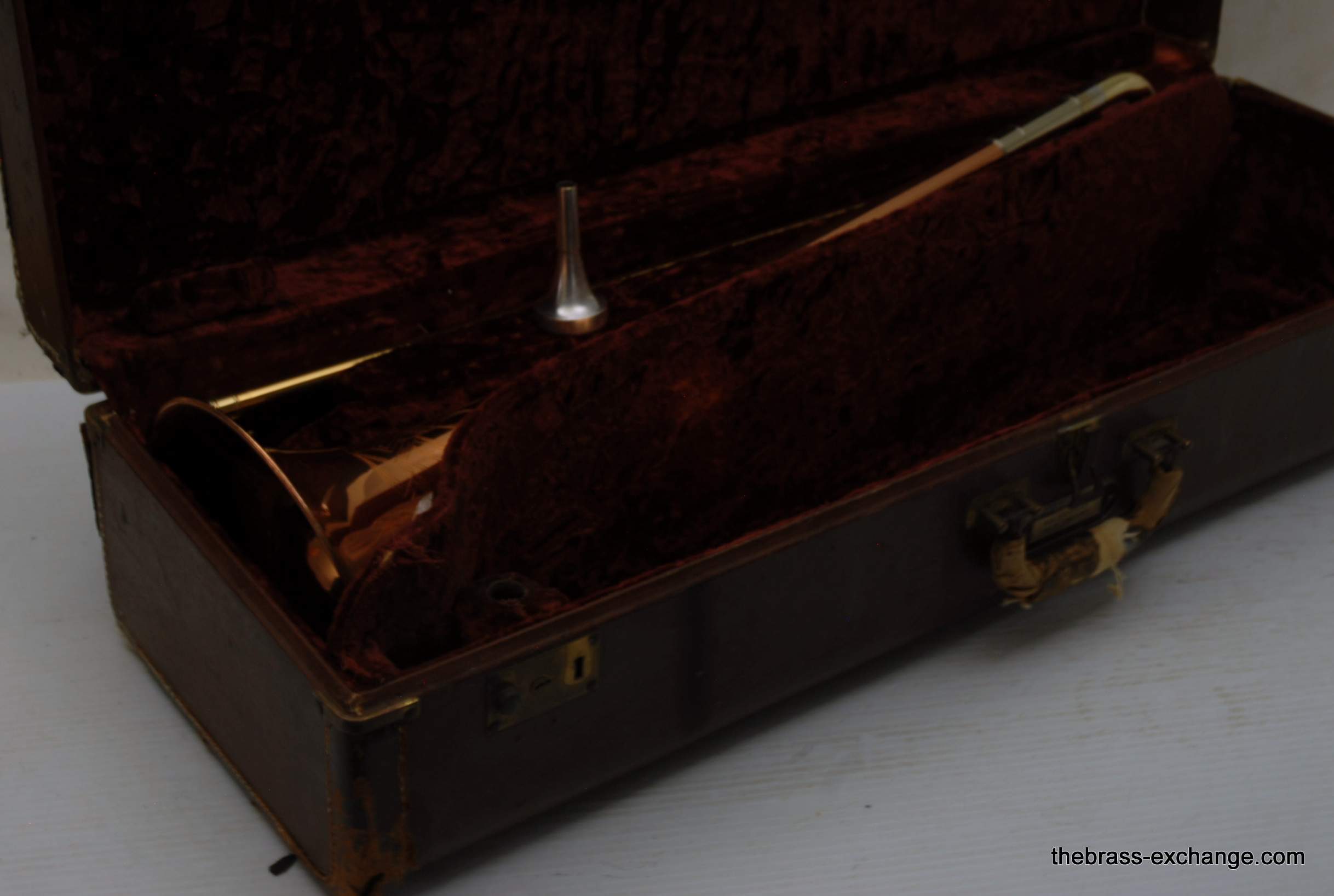 Conn 12H Vintage Elkhart Early 1950's Make.  Very mint condition.  All original parts/lacquer, except maybe the balance weight.  It may have been sold originally without a balance weight, or someone removed the original.  Either way, this is a fine 12H in perfect playing condition.  Has Coprion 7" bell, standard weight .485 bore slide without defect.  The slide actually feels quite loose and super straight tubes. This one is a joy to play.  The copper bells play darker than yellow brass, less highs in the overtones.  But, it's not a one dimensional sound.  It is complex.  These horns will sizzle with the right air stream.  Conn collectors:  If you have been looking for one of these, don't hesitate.  This about as nice as they get.  Original case, ok condition, original mouthpiece.  This would be a great horn today for many different settings including lead trombone, trad jazz, bebop. No service needs to improve playability.  In-stock for immediate delivery.