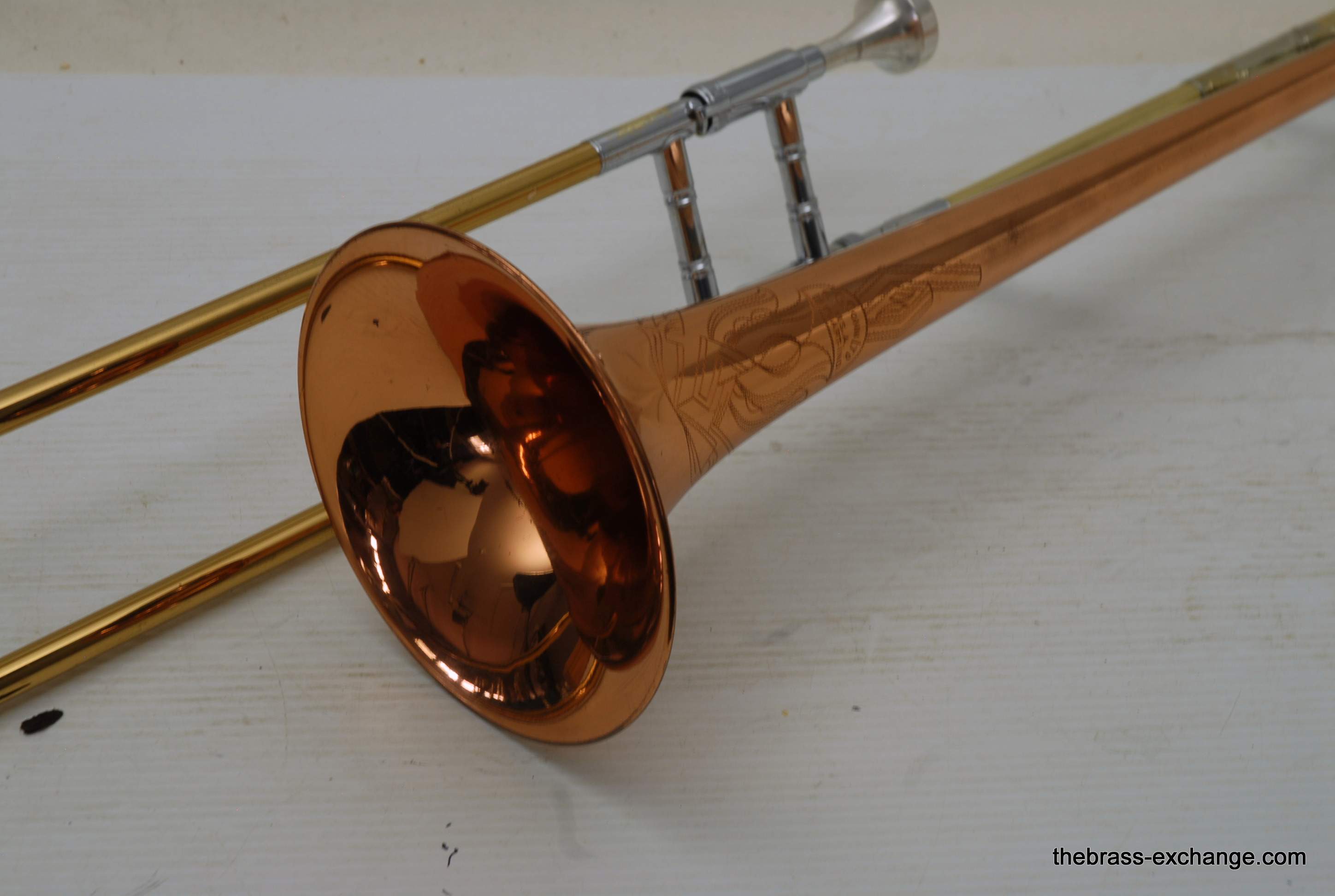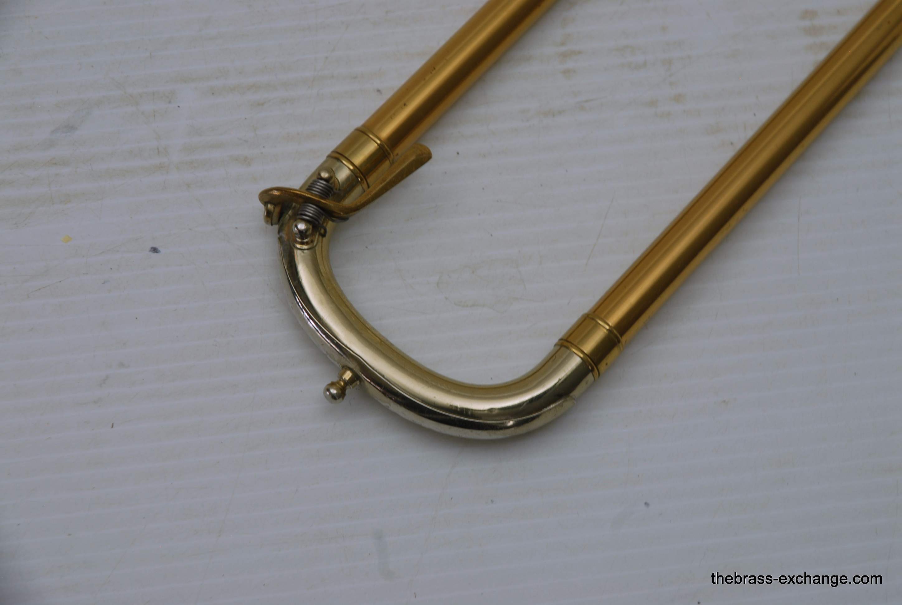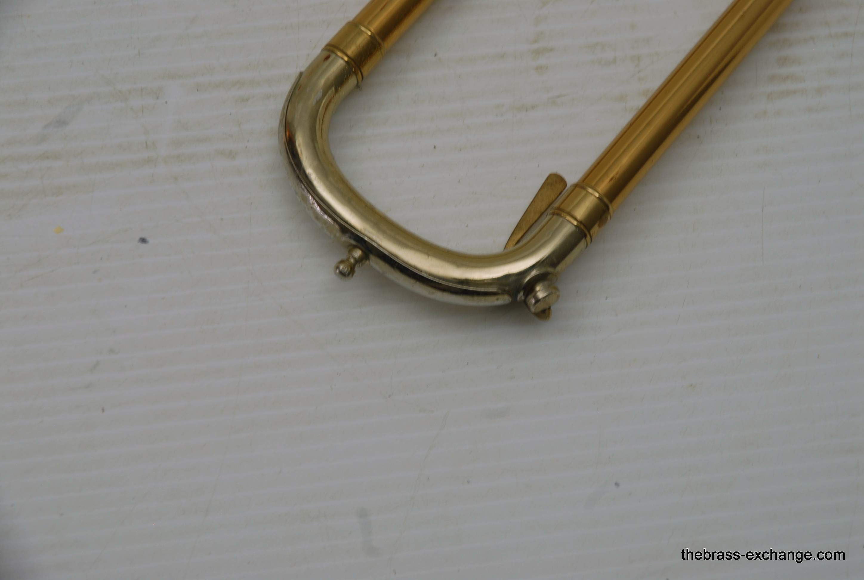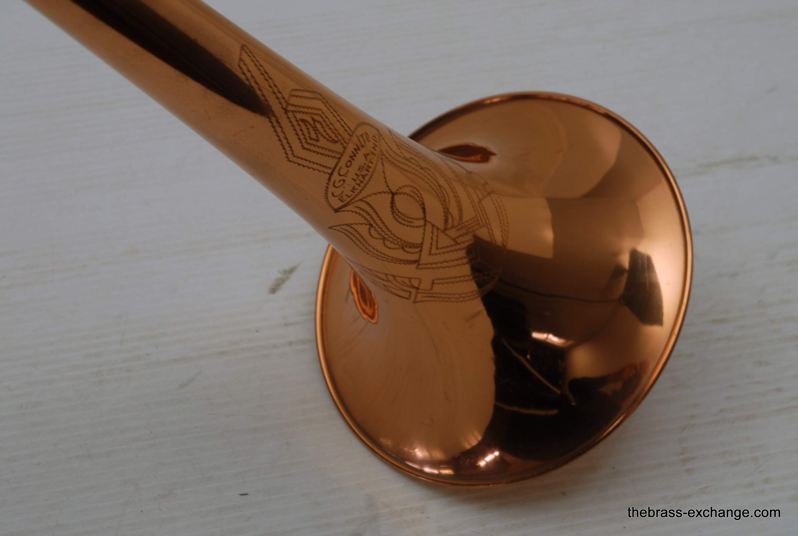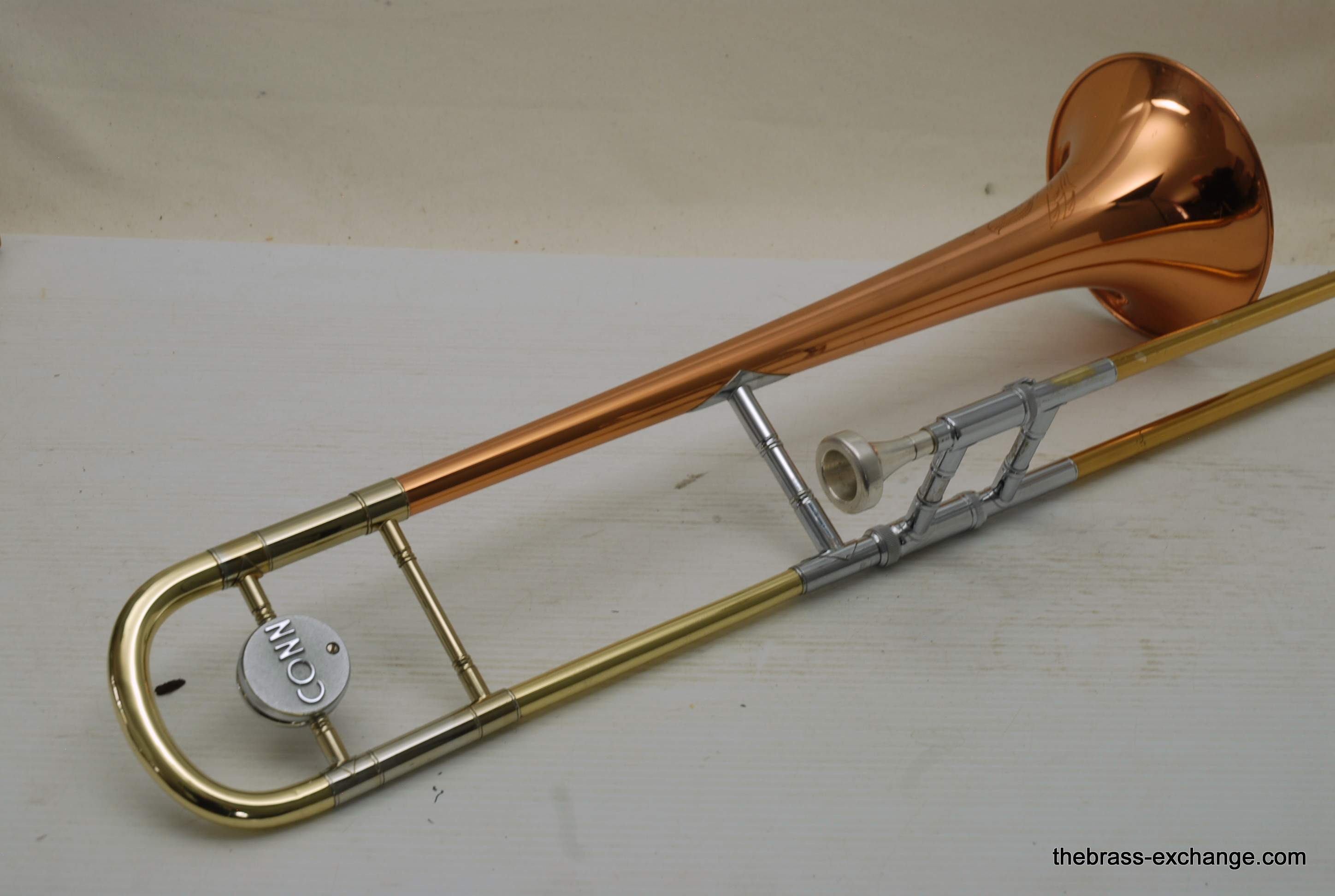Conn 12H Vintage Elkhart Early 1950's Make.  Very mint condition.  All original parts/lacquer, except maybe the balance weight.  It may have been sold originally without a balance weight, or someone removed the original.  Either way, this is a fine 12H in perfect playing condition.  Has Coprion 7" bell, standard weight .485 bore slide without defect.  The slide actually feels quite loose and super straight tubes. This one is a joy to play.  The copper bells play darker than yellow brass, less highs in the overtones.  But, it's not a one dimensional sound.  It is complex.  These horns will sizzle with the right air stream.  Conn collectors:  If you have been looking for one of these, don't hesitate.  This about as nice as they get.  Original case, ok condition, original mouthpiece.  This would be a great horn today for many different settings including lead trombone, trad jazz, bebop. No service needs to improve playability.  In-stock for immediate delivery.