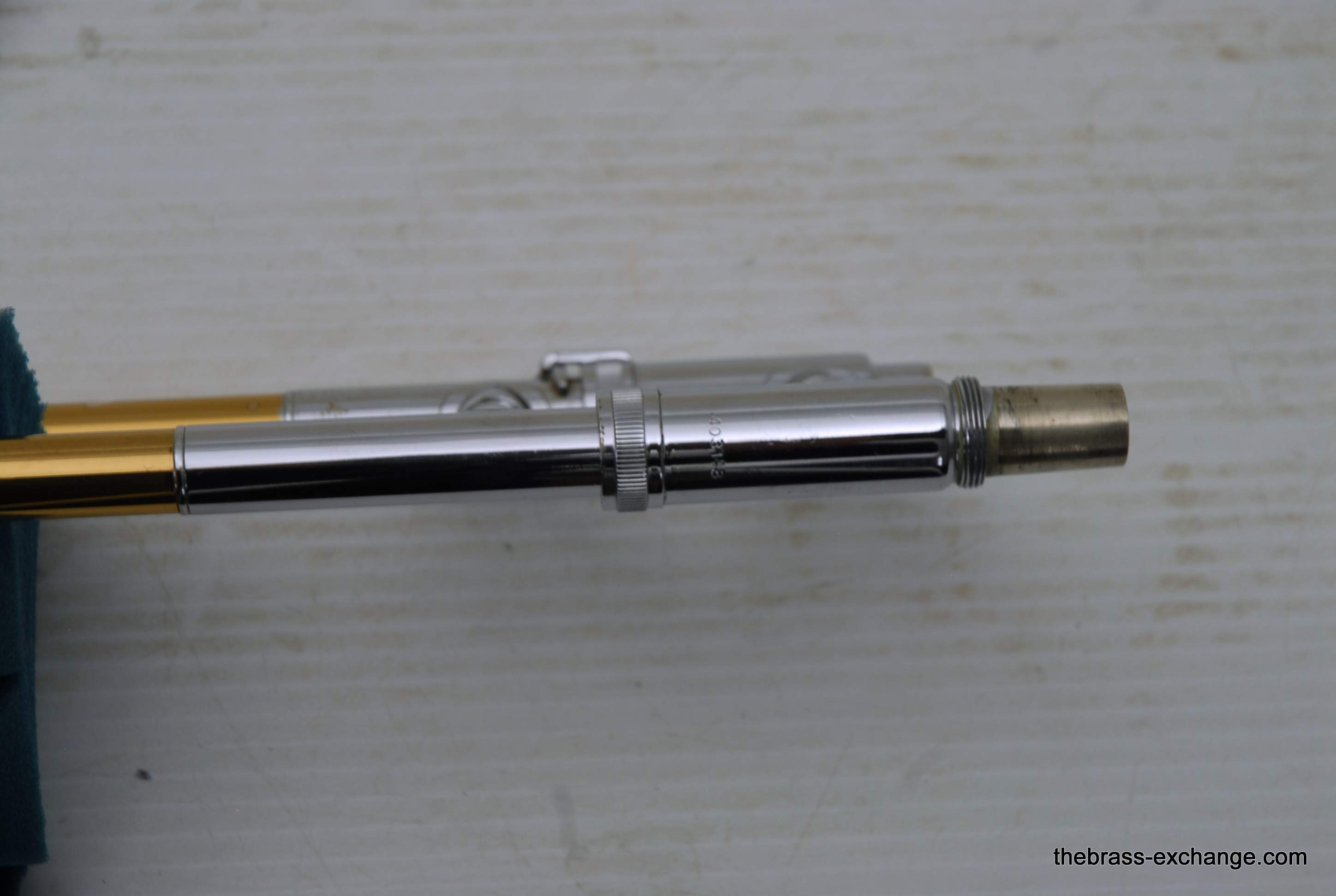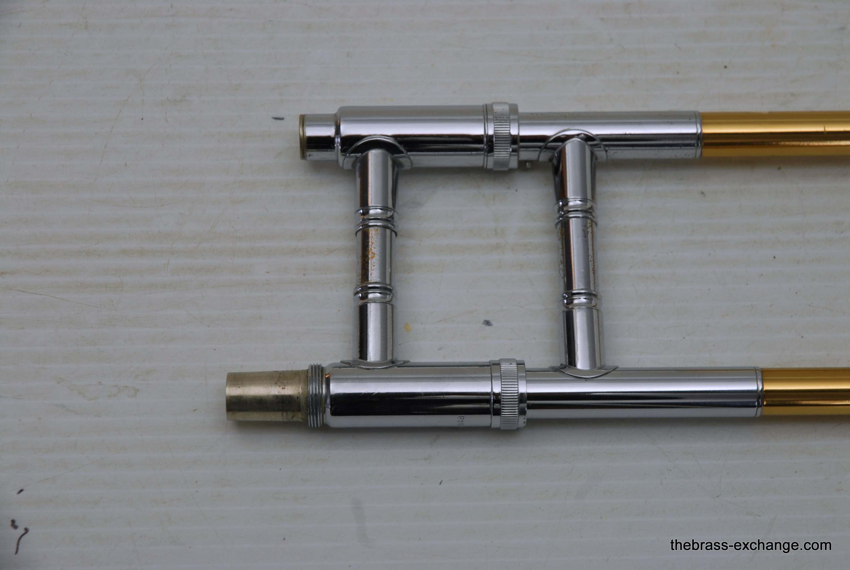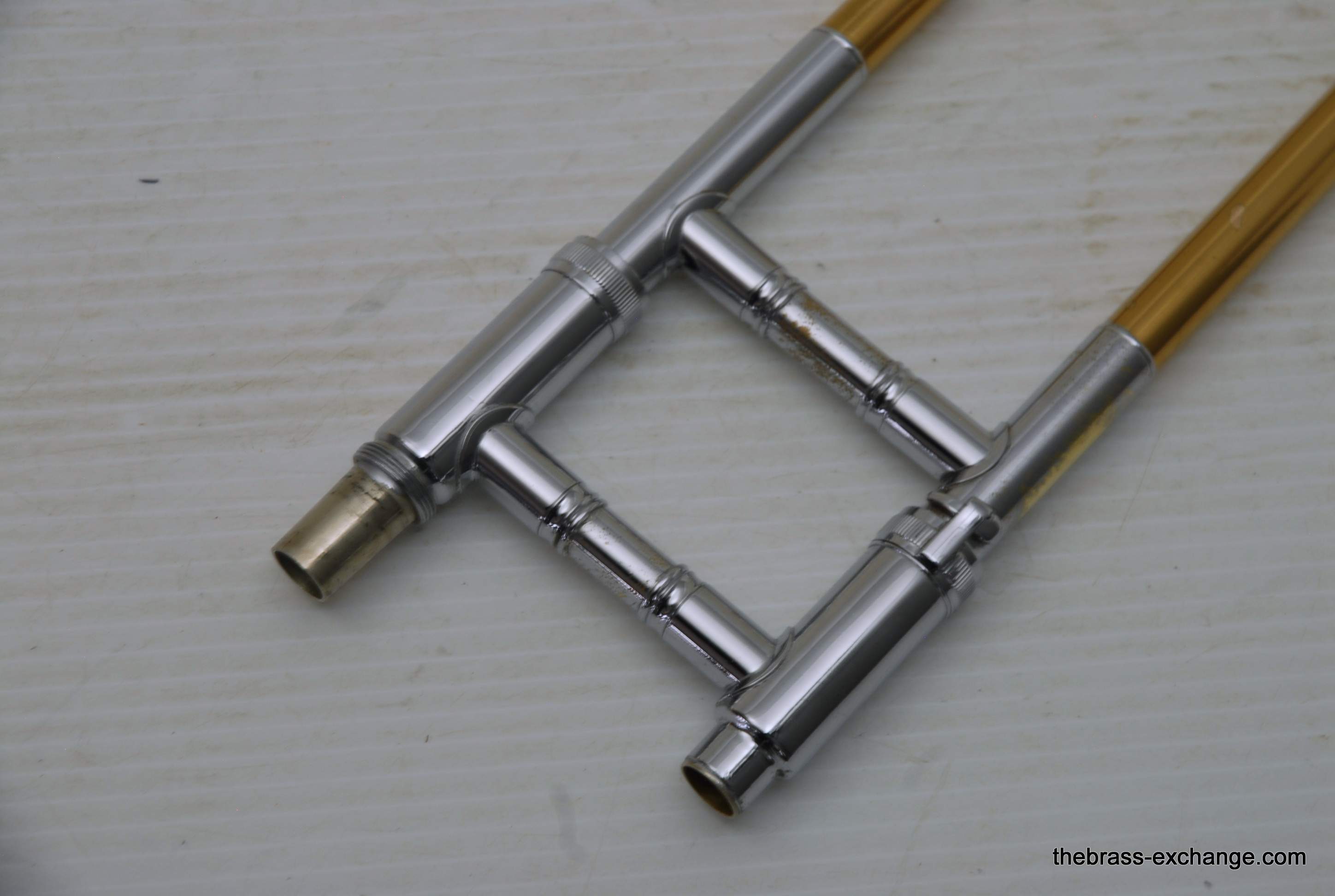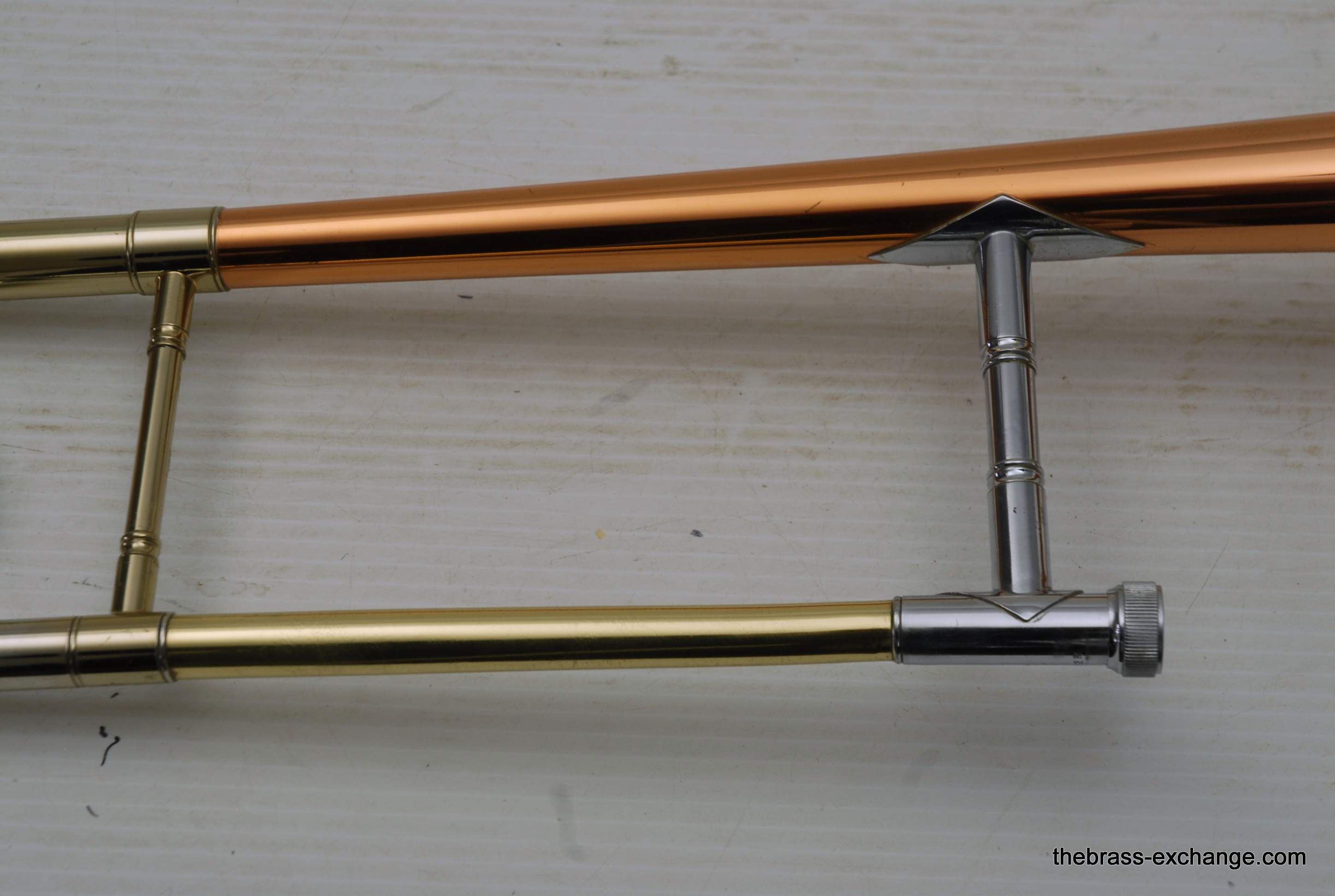 Conn 12H Vintage Elkhart Early 1950's Make.  Very mint condition.  All original parts/lacquer, except maybe the balance weight.  It may have been sold originally without a balance weight, or someone removed the original.  Either way, this is a fine 12H in perfect playing condition.  Has Coprion 7" bell, standard weight .485 bore slide without defect.  The slide actually feels quite loose and super straight tubes. This one is a joy to play.  The copper bells play darker than yellow brass, less highs in the overtones.  But, it's not a one dimensional sound.  It is complex.  These horns will sizzle with the right air stream.  Conn collectors:  If you have been looking for one of these, don't hesitate.  This about as nice as they get.  Original case, ok condition, original mouthpiece.  This would be a great horn today for many different settings including lead trombone, trad jazz, bebop. No service needs to improve playability.  In-stock for immediate delivery.