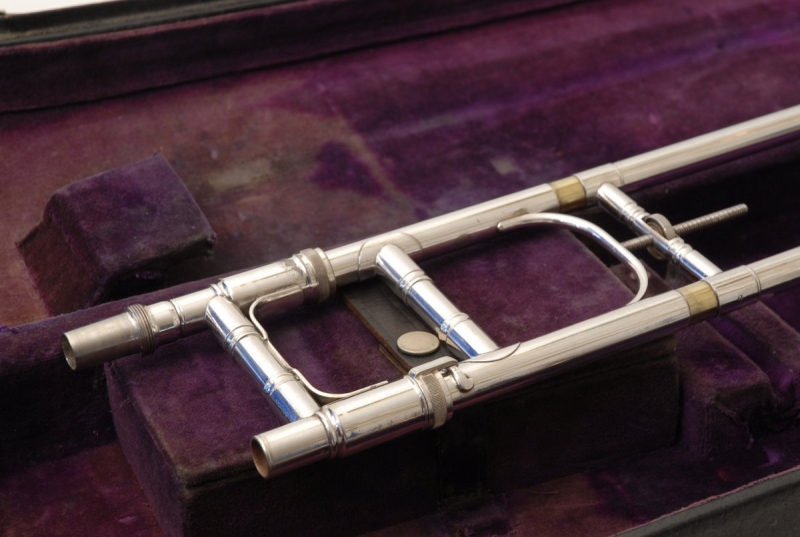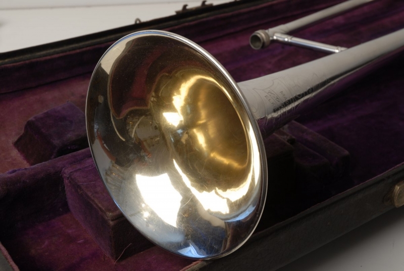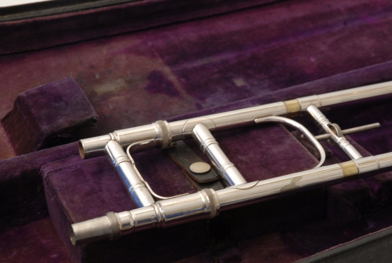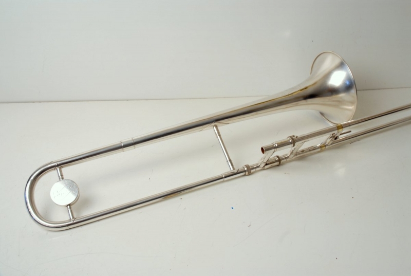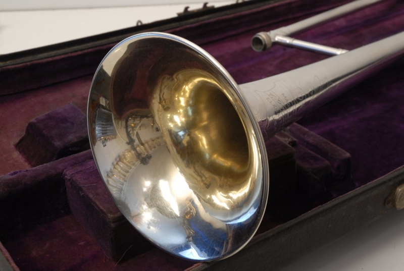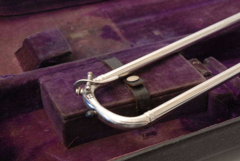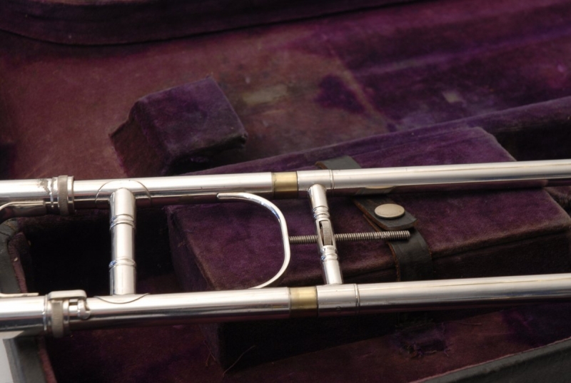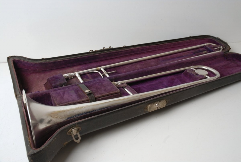 Conn 40H, Ballroom Model. Excellent condition/playing .500 Bore, with Tuning In Slide T.I.S. This one is from 1928, without question one of the cleanest ones we have seen. Freshly cleaned and serviced. No signs of previous damage or repair. Slide is very good and has no issues. No need to worry about chrome loss on the inners, they didn't use it back then. Will lubricate well with traditional superslick or ponds cold cream type, also works just fine with Yamha liquid lubricant. Has deceptive small look but big sound. Will take standard small shank modern mouthpiece no problem. We tested out on a Bach 7C, plays great. Has strong presence of sound, easy intonation, especially in the upper range. Would be a seriously great trad jazz horn, or for legit player needing an occasional small bore. Would also make a seriously great marching trombone for section leader- sound will cut like a laser- much more so than any thing modern today. Original silver/gold plating, stunning appearance. Orginal case included.