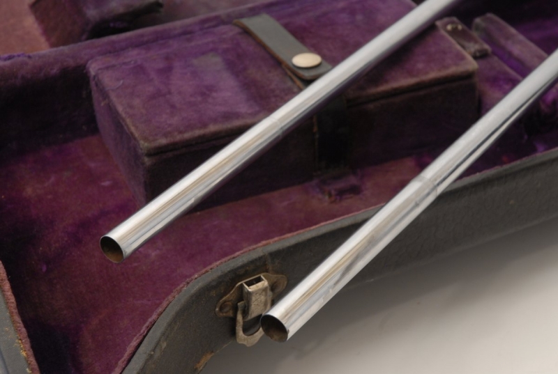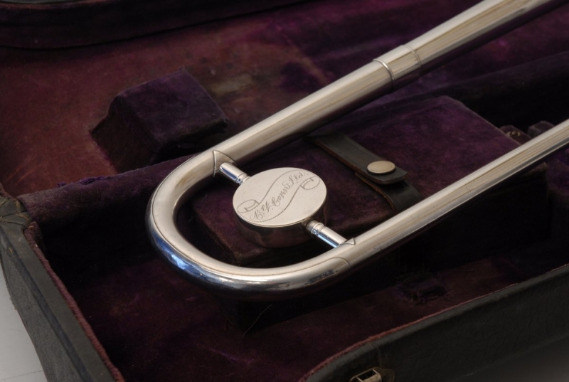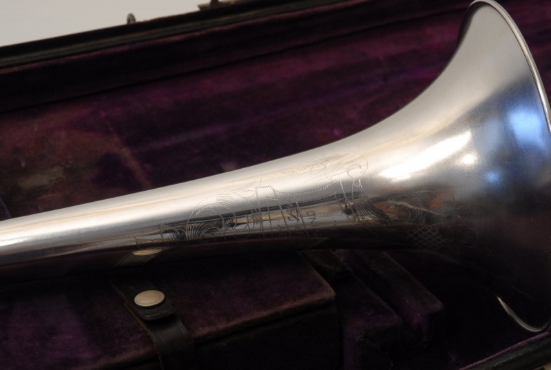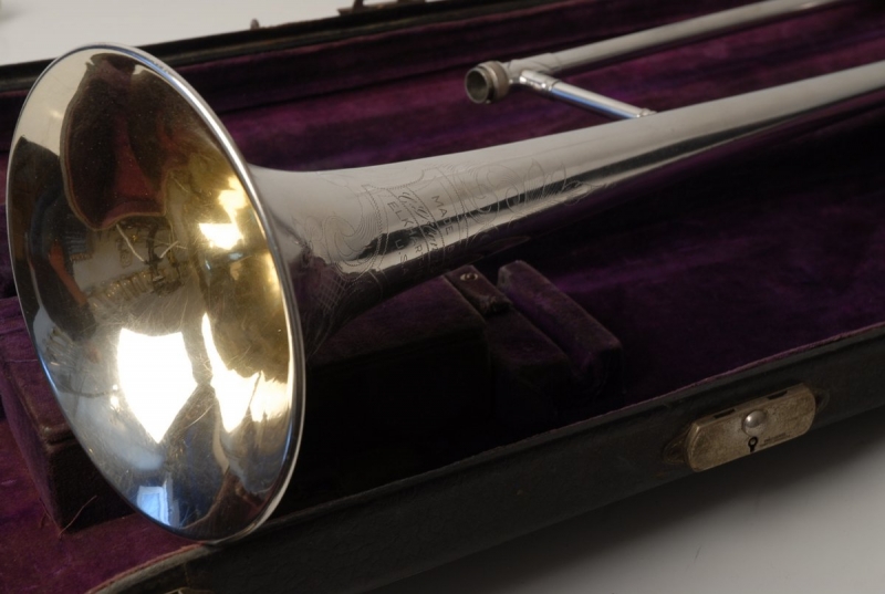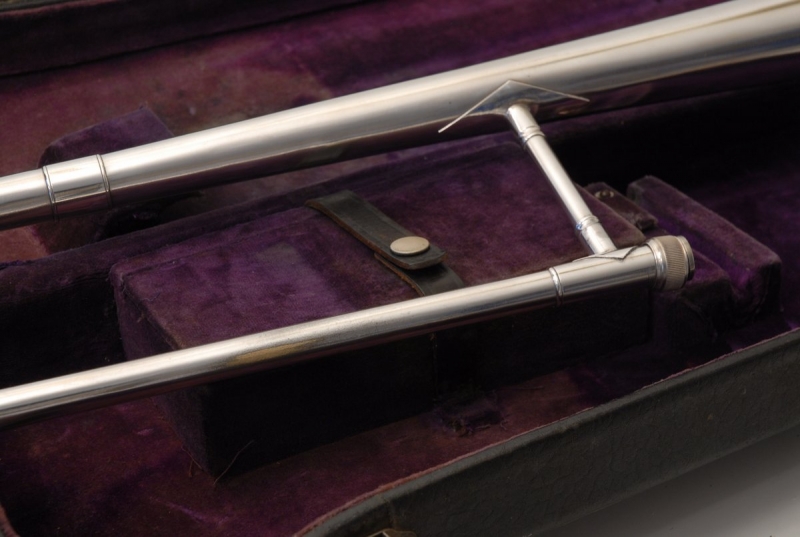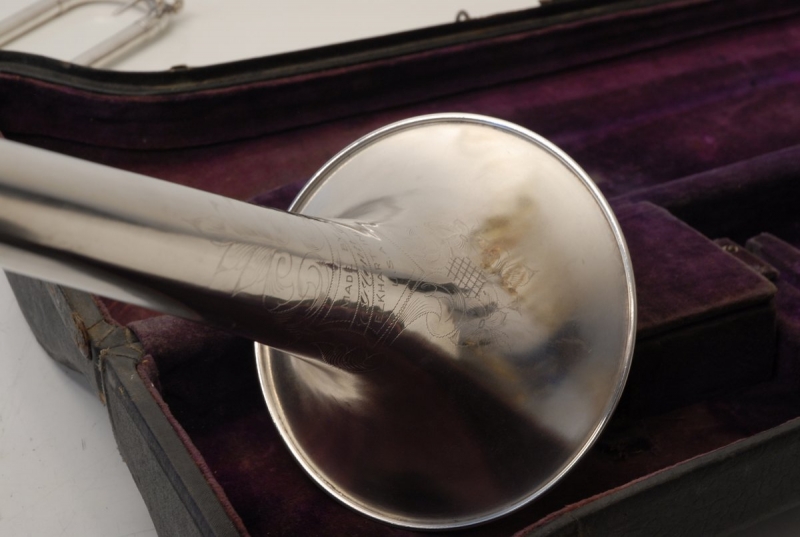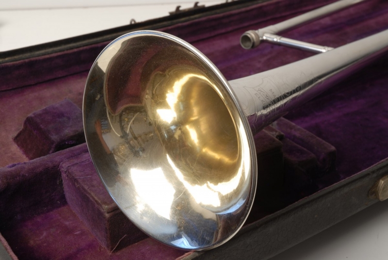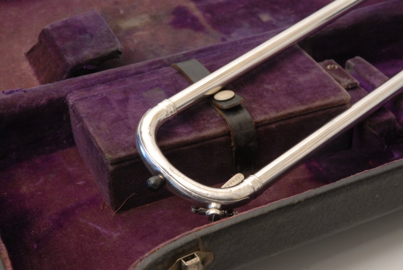 Conn 40H, Ballroom Model. Excellent condition/playing .500 Bore, with Tuning In Slide T.I.S. This one is from 1928, without question one of the cleanest ones we have seen. Freshly cleaned and serviced. No signs of previous damage or repair. Slide is very good and has no issues. No need to worry about chrome loss on the inners, they didn't use it back then. Will lubricate well with traditional superslick or ponds cold cream type, also works just fine with Yamha liquid lubricant. Has deceptive small look but big sound. Will take standard small shank modern mouthpiece no problem. We tested out on a Bach 7C, plays great. Has strong presence of sound, easy intonation, especially in the upper range. Would be a seriously great trad jazz horn, or for legit player needing an occasional small bore. Would also make a seriously great marching trombone for section leader- sound will cut like a laser- much more so than any thing modern today. Original silver/gold plating, stunning appearance. Orginal case included.
