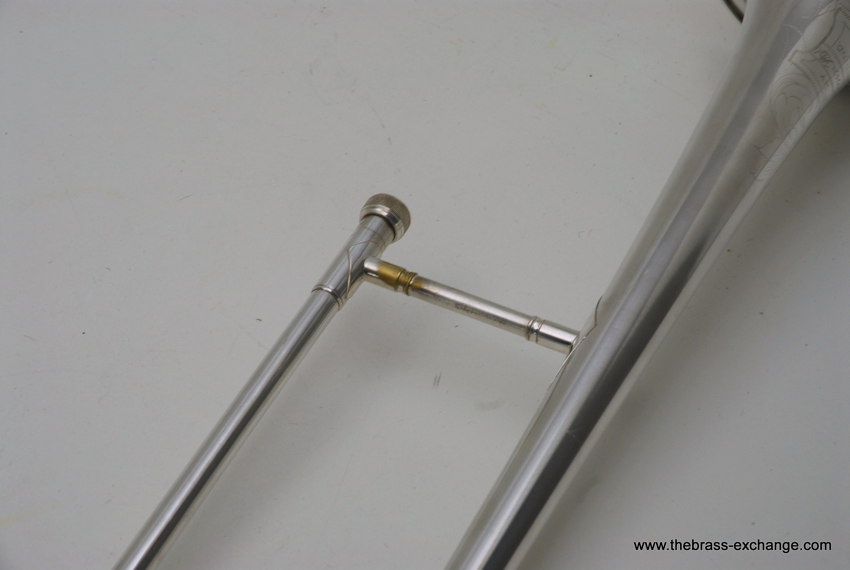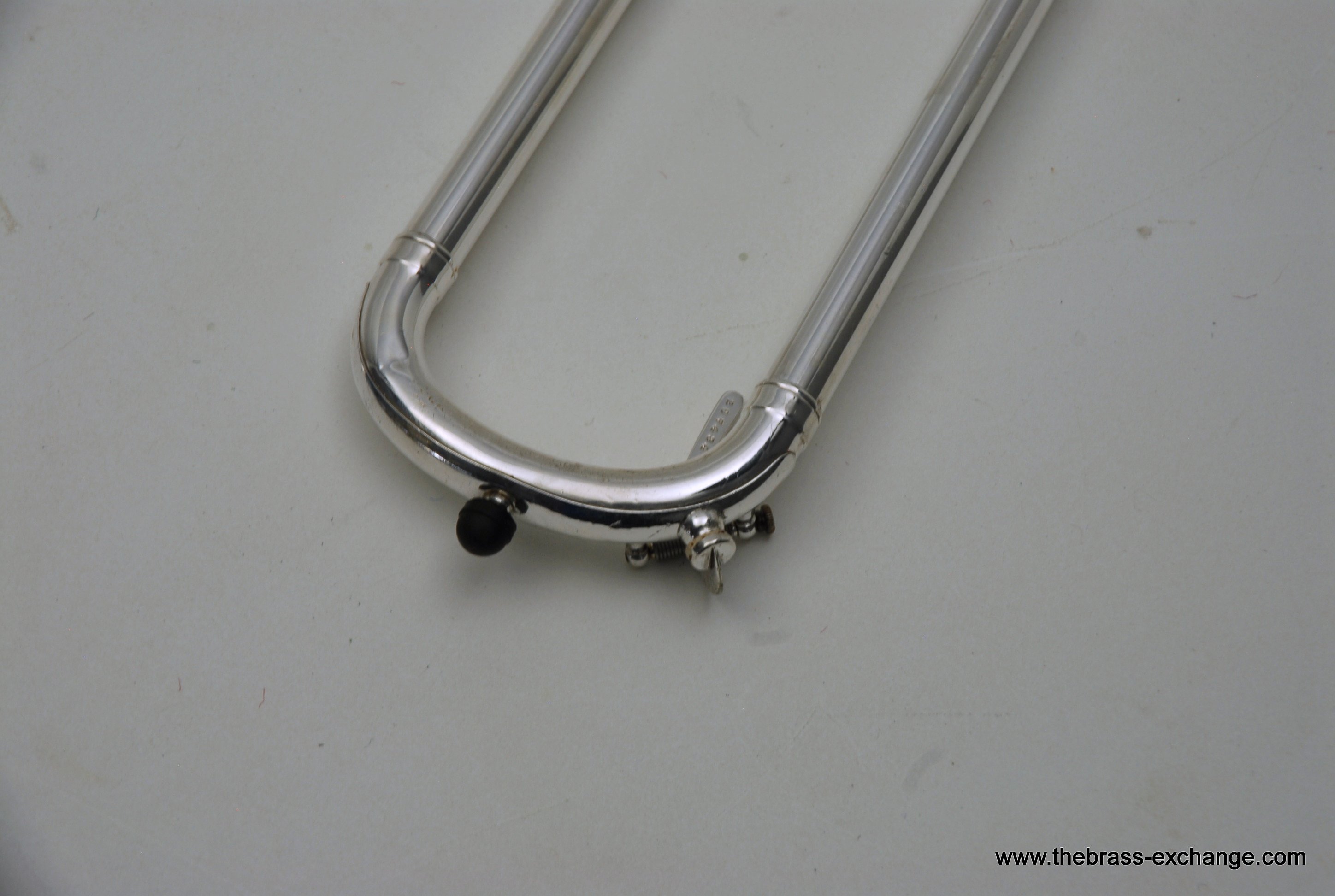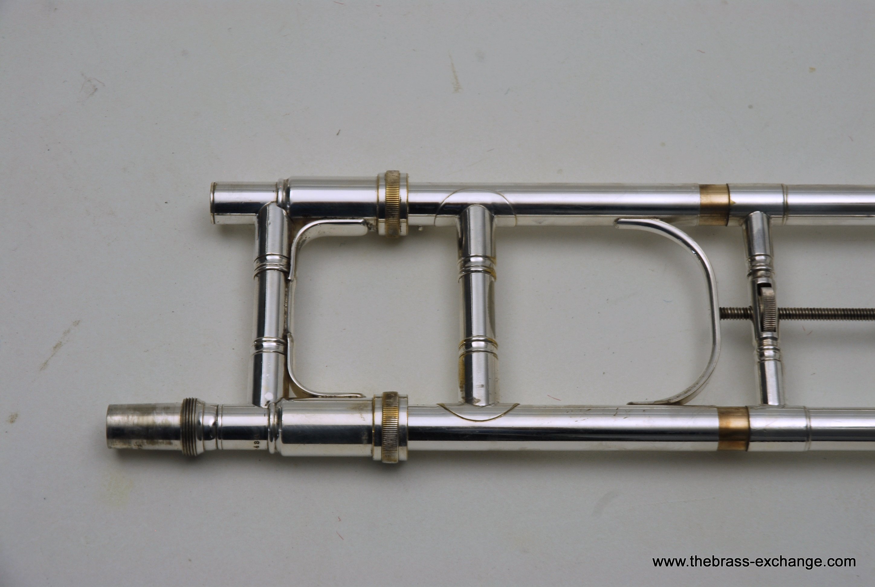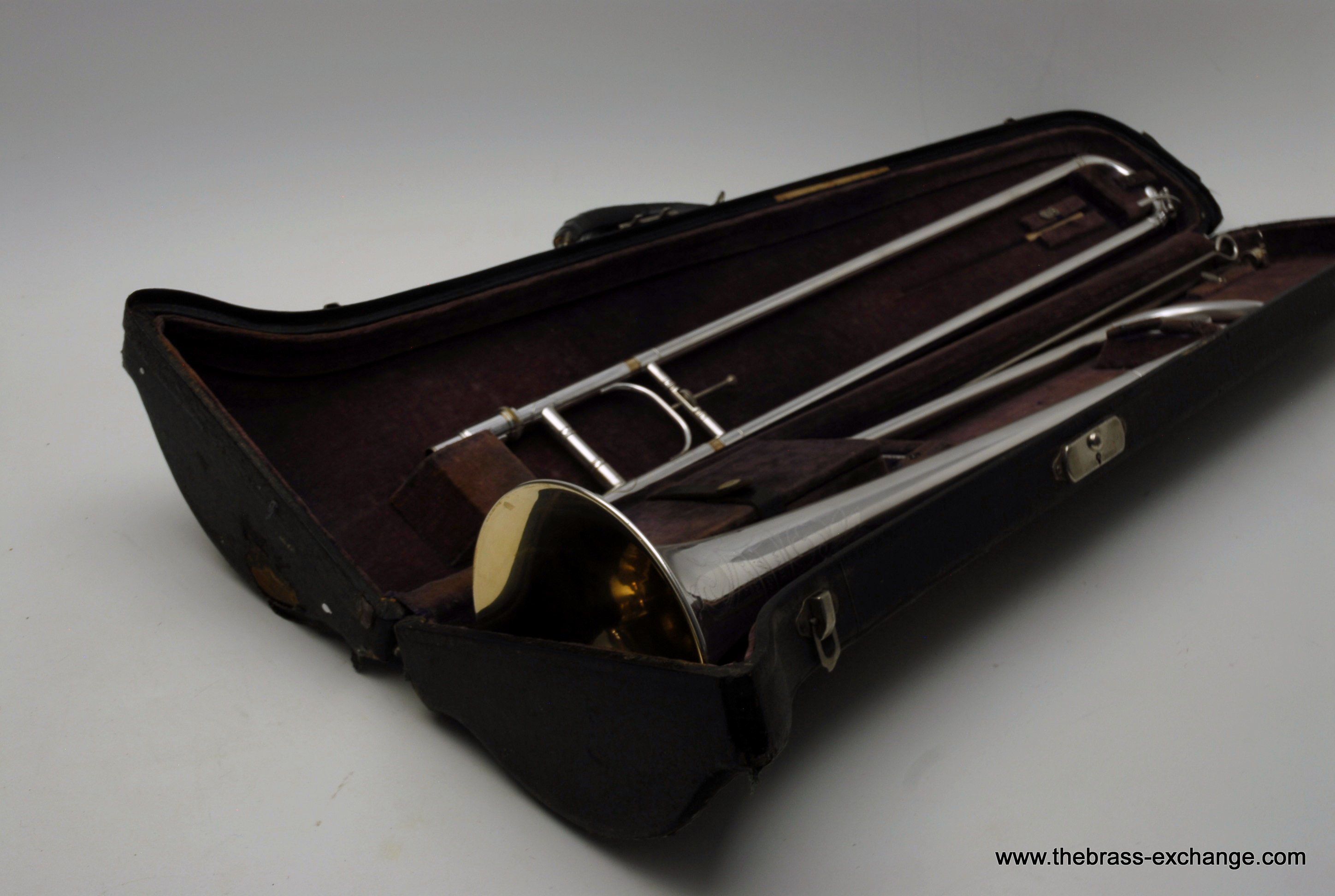 The finish is original glass bead silver plating with a beautiful gold wash inner bell. It has received a full service in our shop, including a complete chemical cleaning and inspection. The overall condition is super mint, nearly showroom quality despite its age. The handslide is perfectly straight, free of defects, and operates with exceptional response. There is only one small area of plating wear on the thumb grip of the cross brace – a minor cosmetic note that does not affect performance.