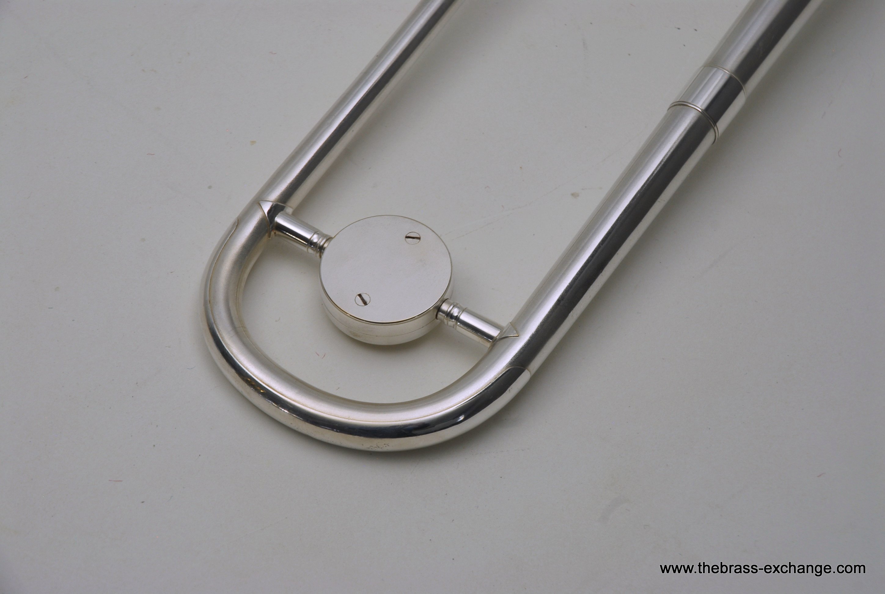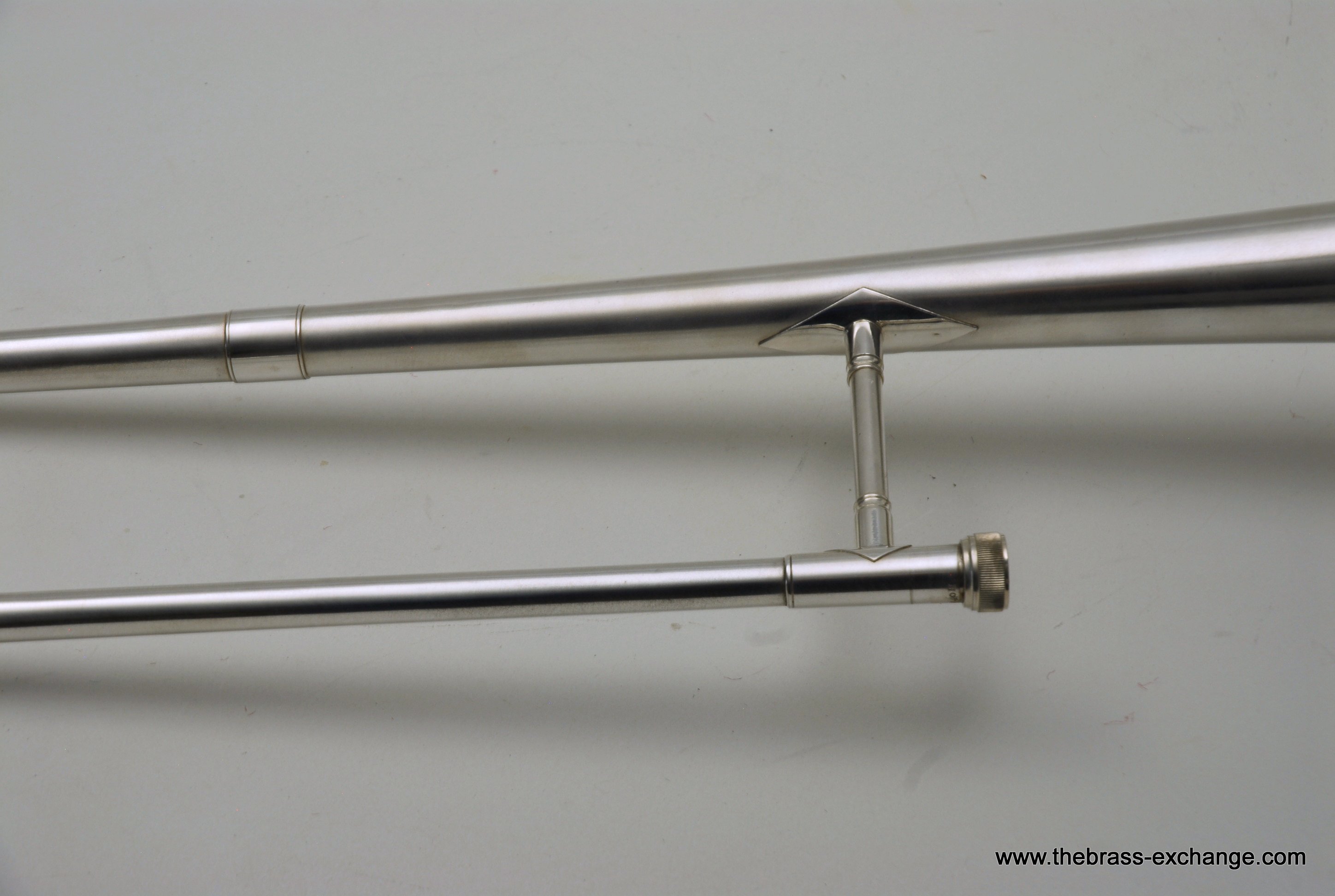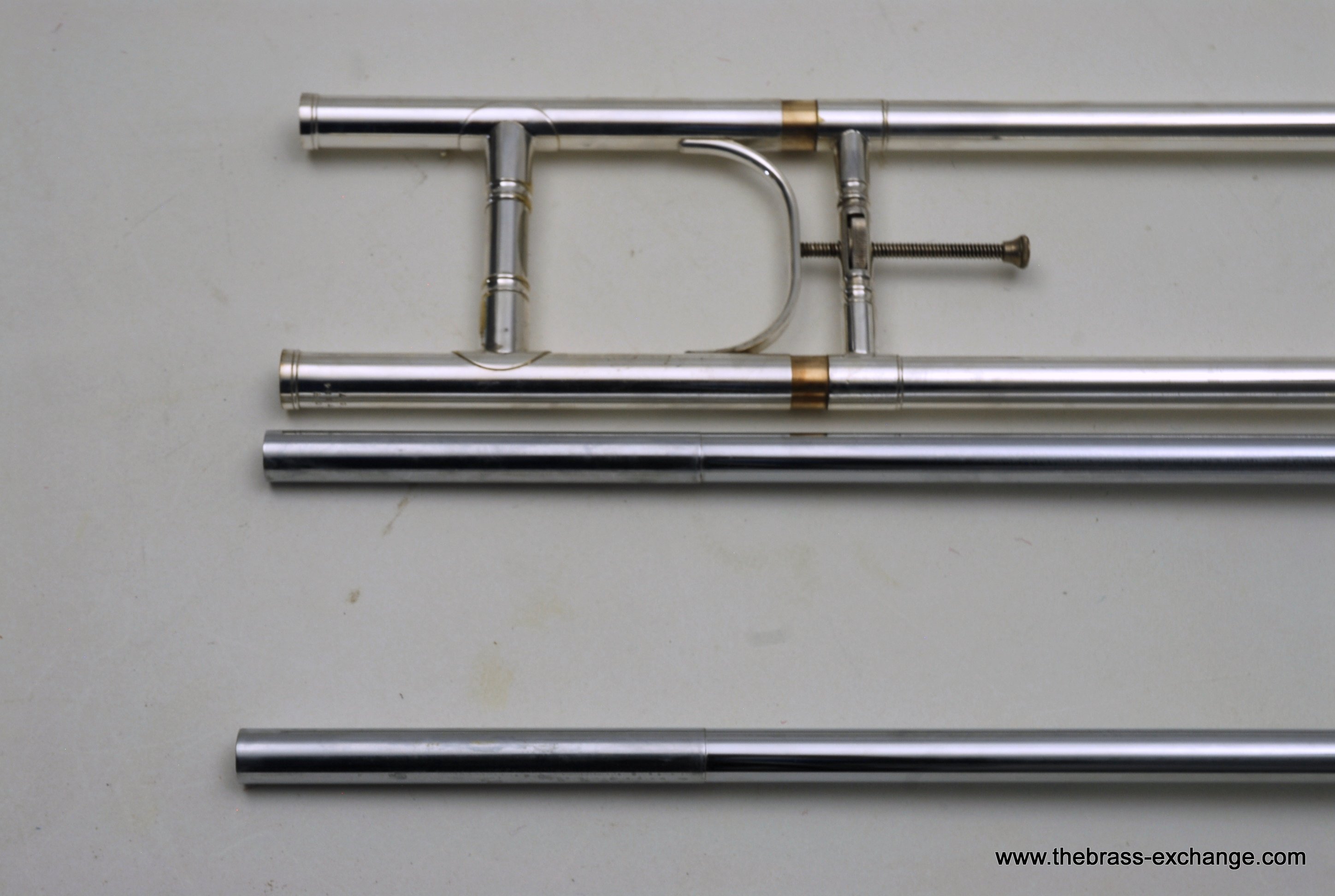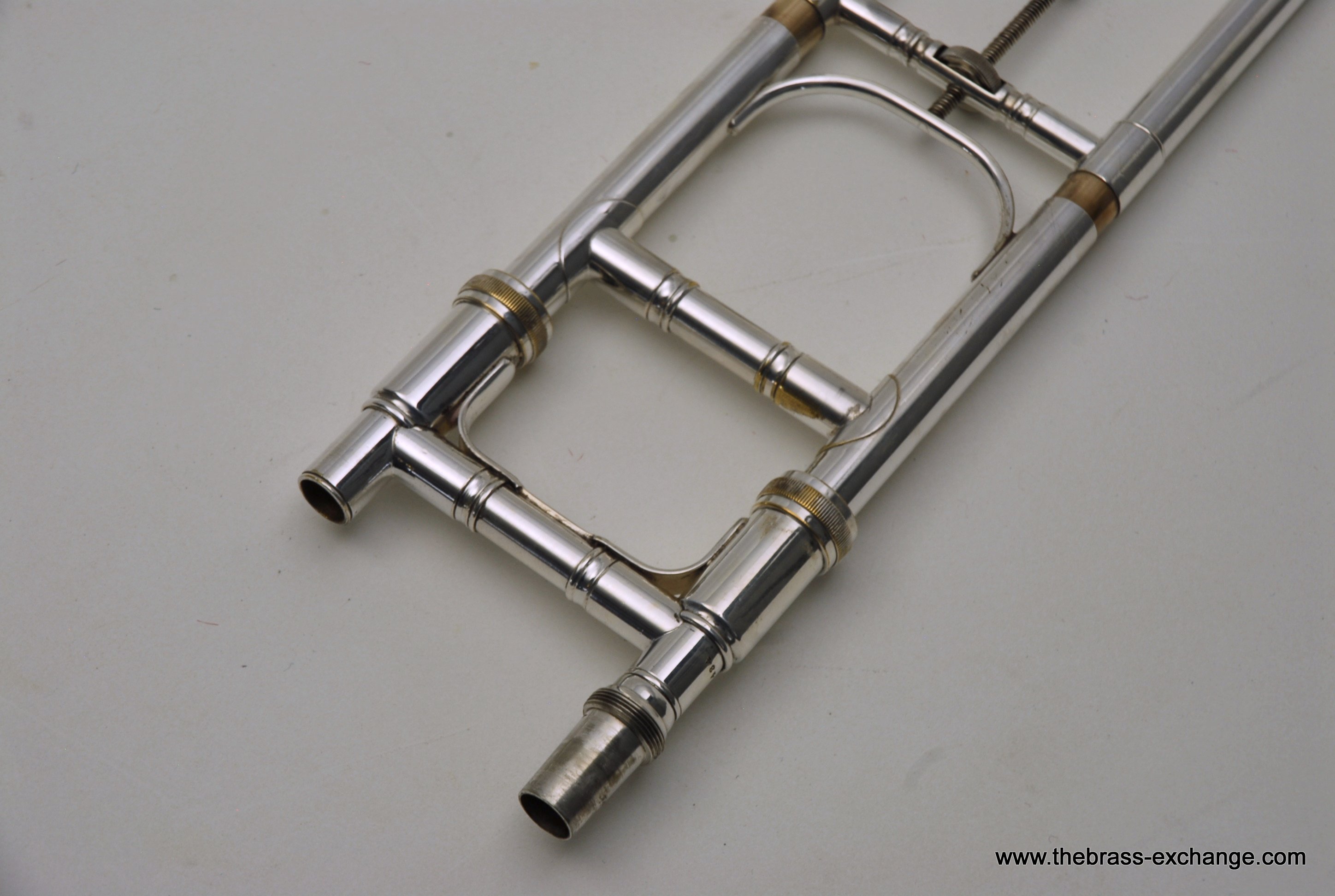 The finish is original glass bead silver plating with a beautiful gold wash inner bell. It has received a full service in our shop, including a complete chemical cleaning and inspection. The overall condition is super mint, nearly showroom quality despite its age. The handslide is perfectly straight, free of defects, and operates with exceptional response. There is only one small area of plating wear on the thumb grip of the cross brace – a minor cosmetic note that does not affect performance.