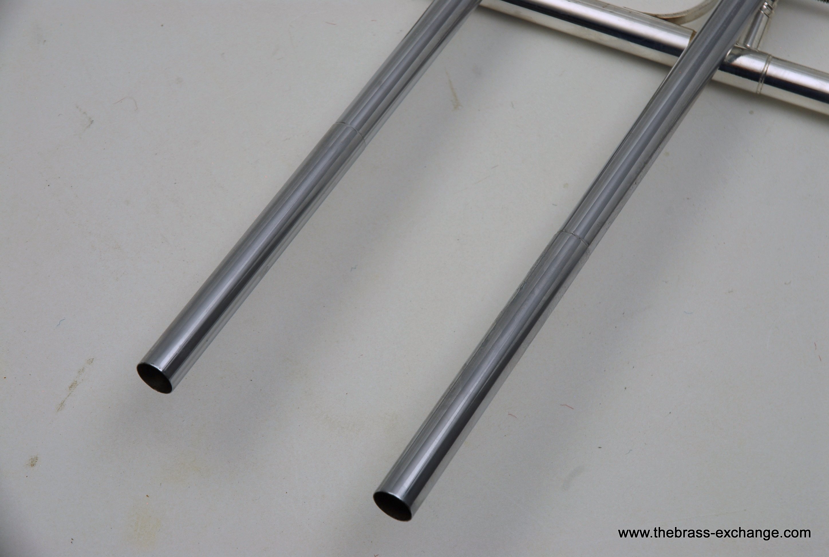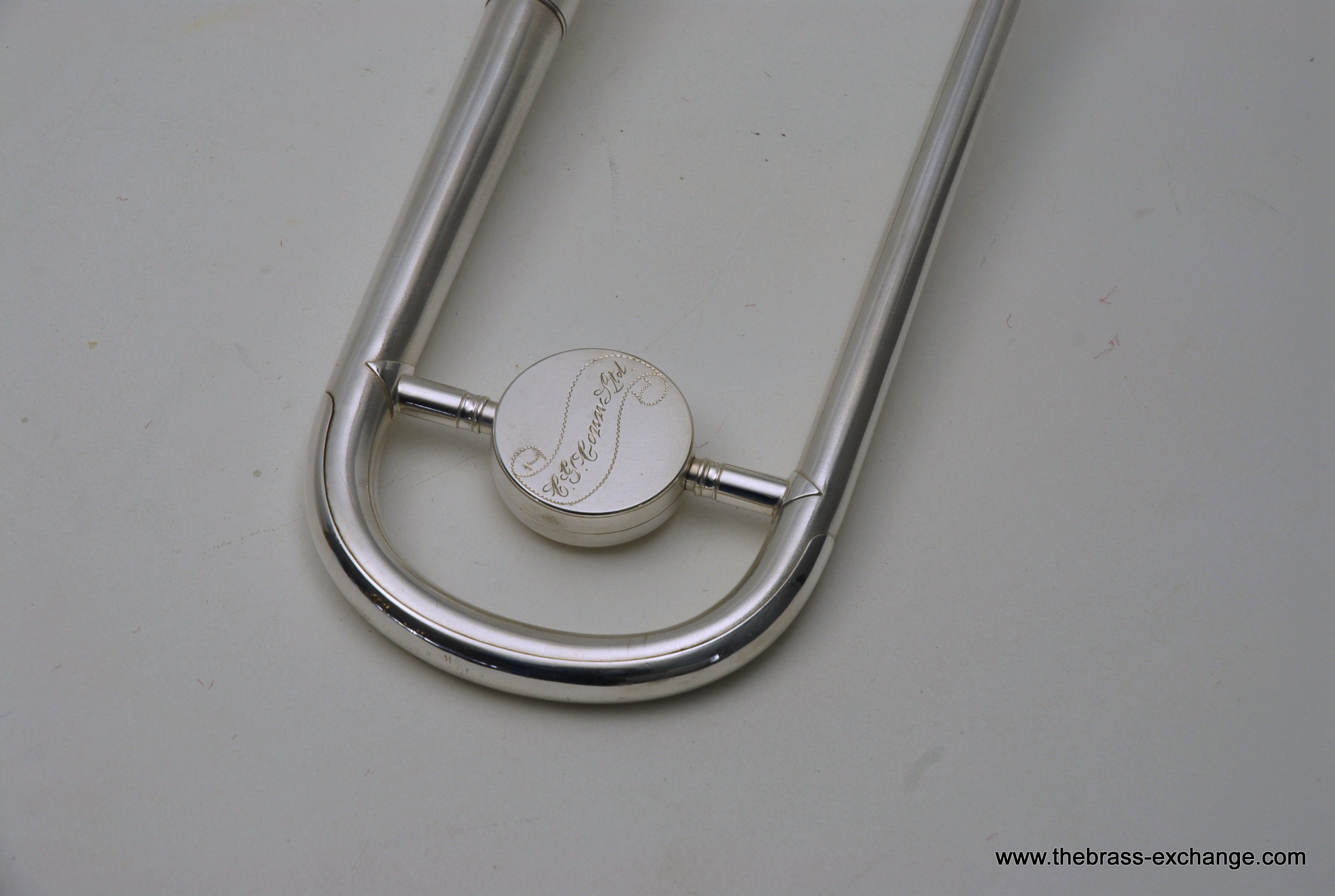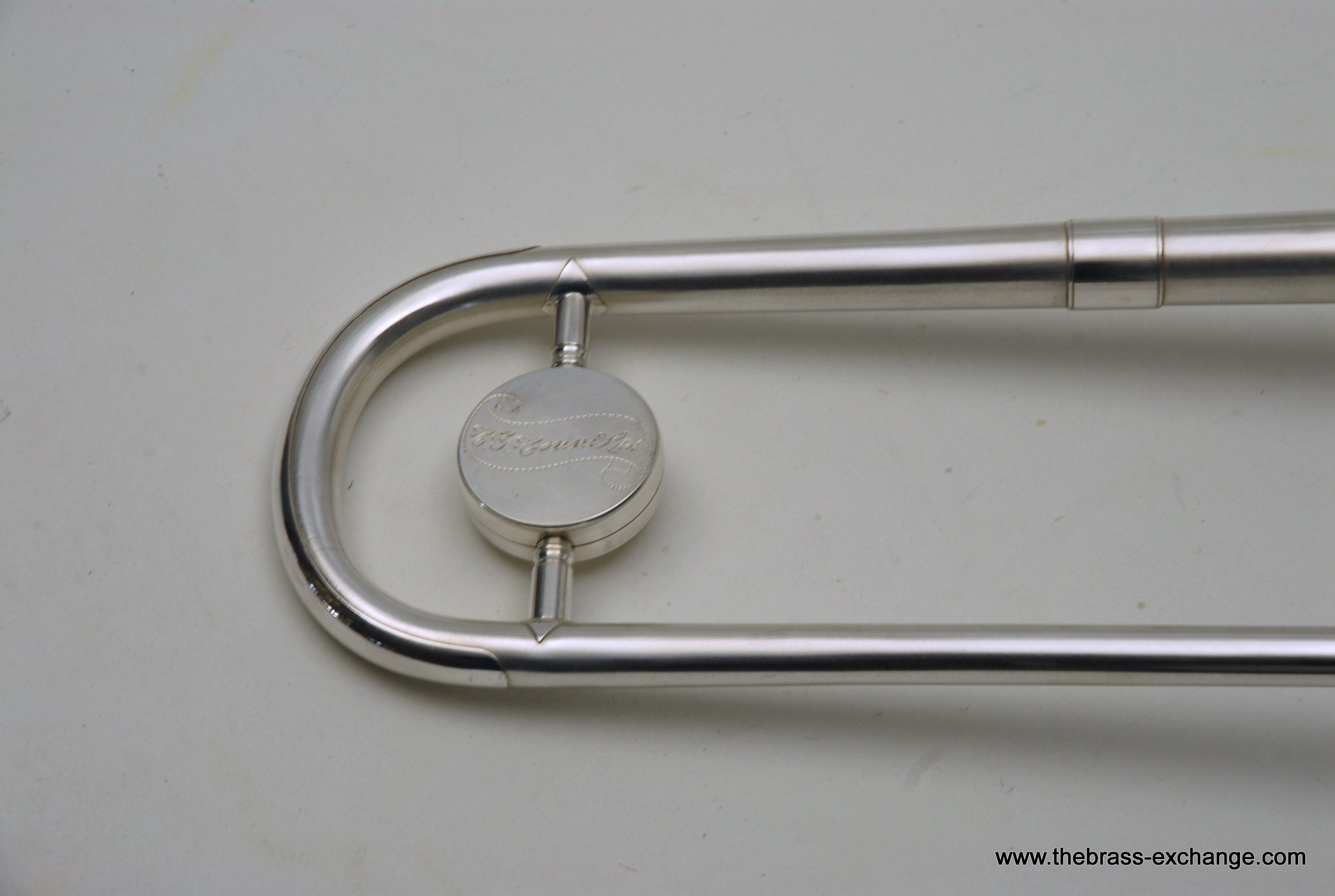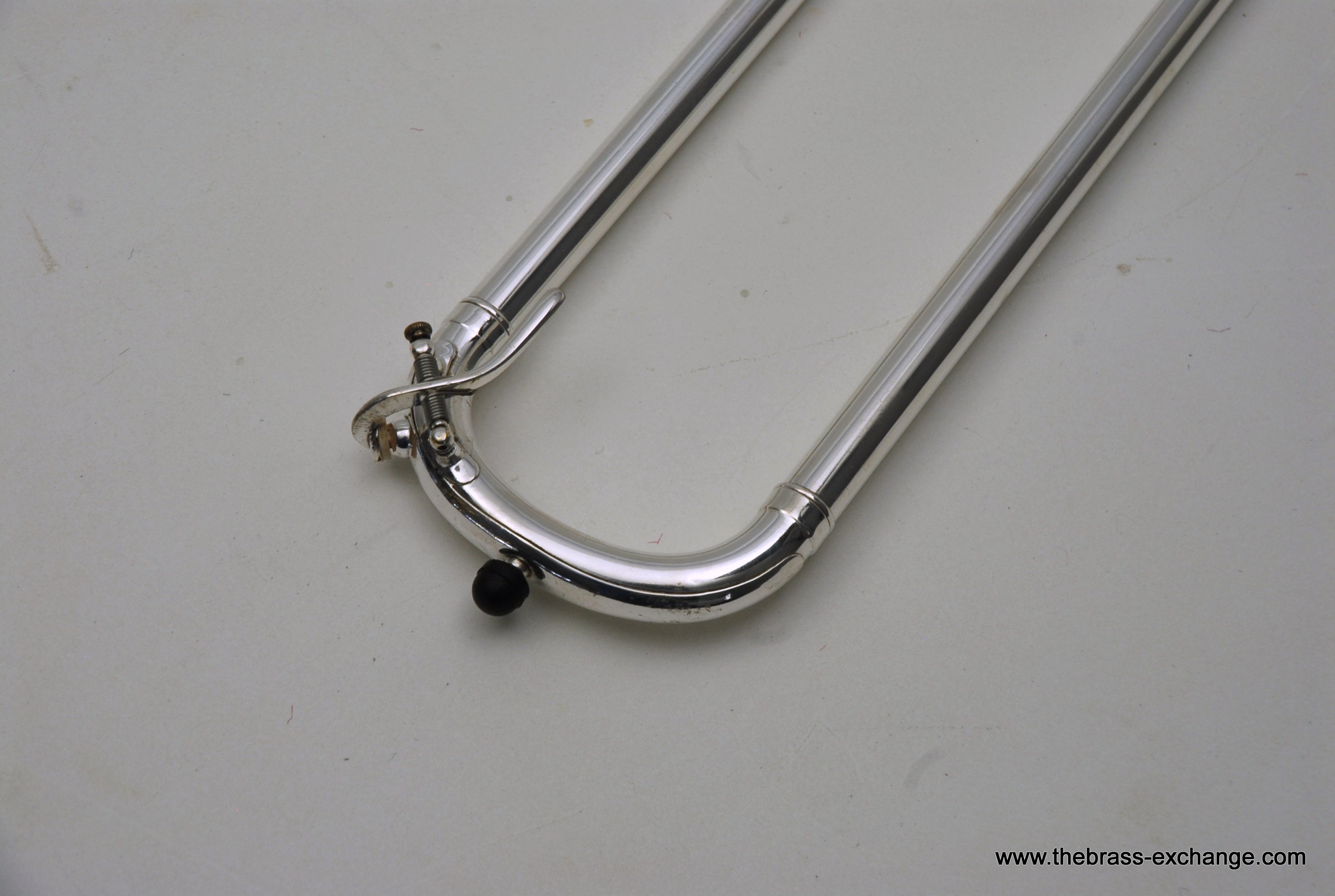 The finish is original glass bead silver plating with a beautiful gold wash inner bell. It has received a full service in our shop, including a complete chemical cleaning and inspection. The overall condition is super mint, nearly showroom quality despite its age. The handslide is perfectly straight, free of defects, and operates with exceptional response. There is only one small area of plating wear on the thumb grip of the cross brace – a minor cosmetic note that does not affect performance.