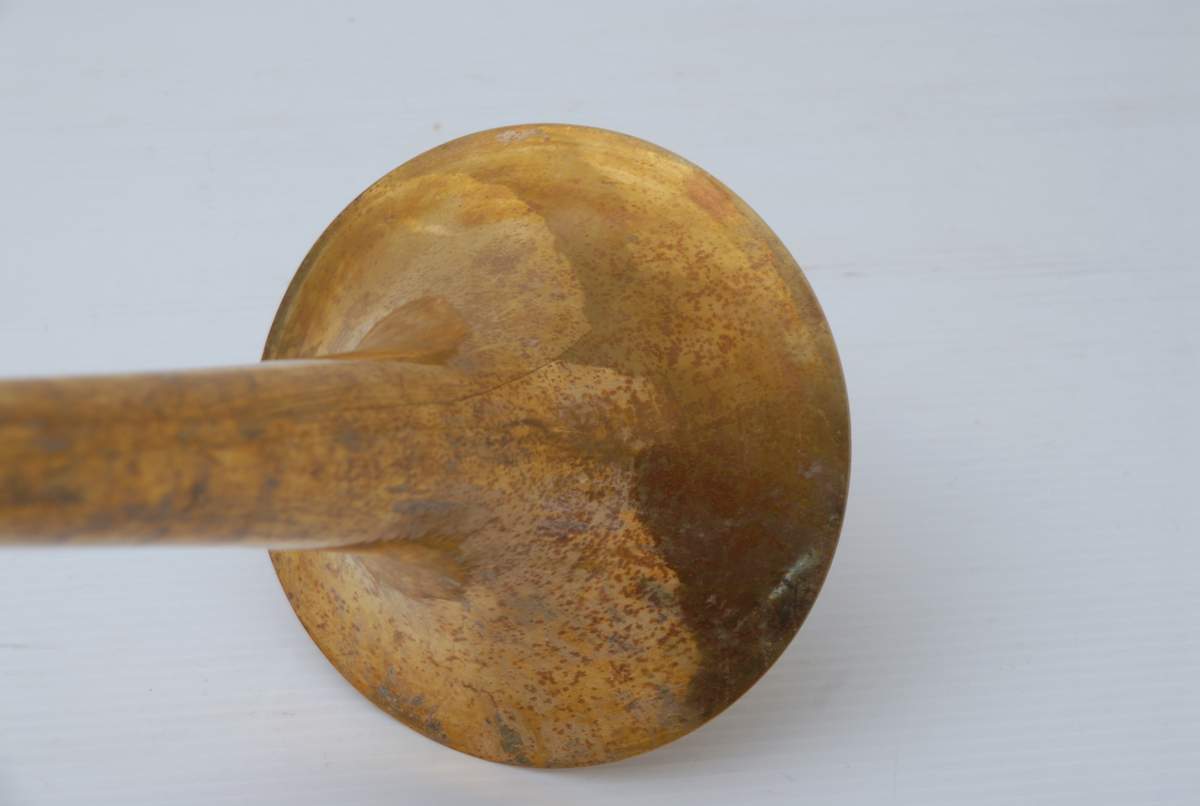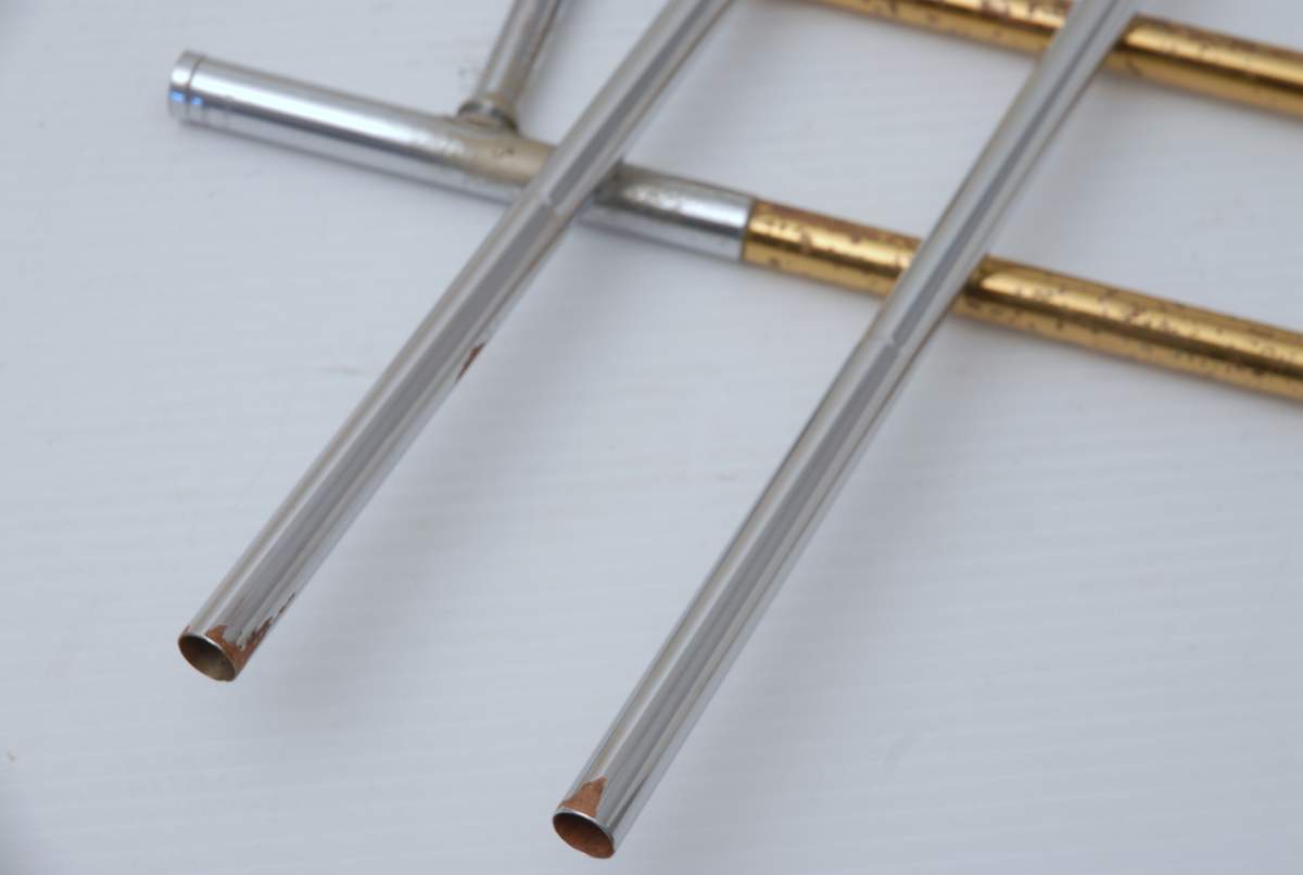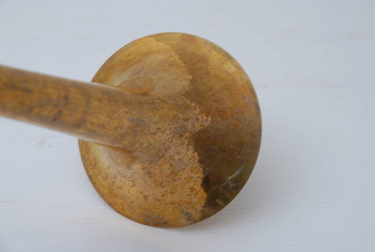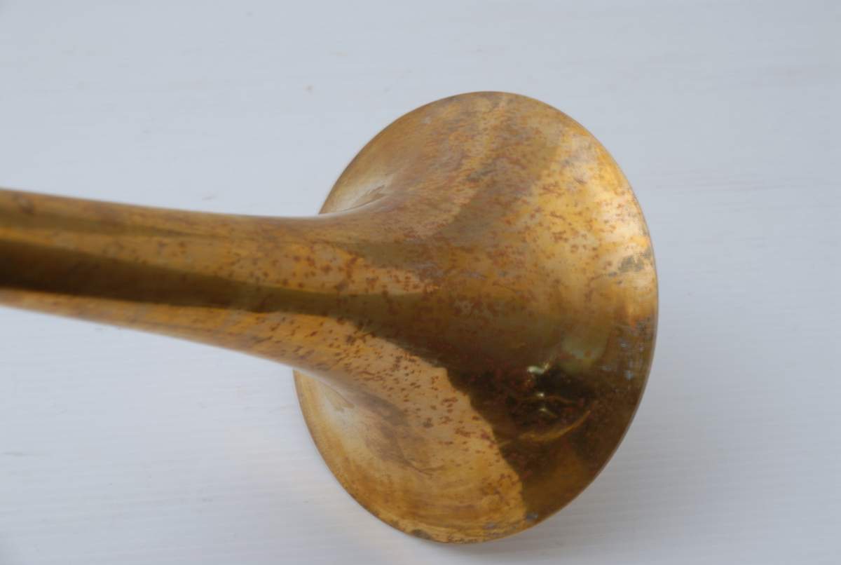 Over time, this horn has developed freckling in the finish, a natural sign of aging that adds character to its vintage appearance. It has also had a few repairs, including a tuning slide crook guard and some small patchwork in other areas. Despite these repairs, the horn remains structurally sound and is fully playable.