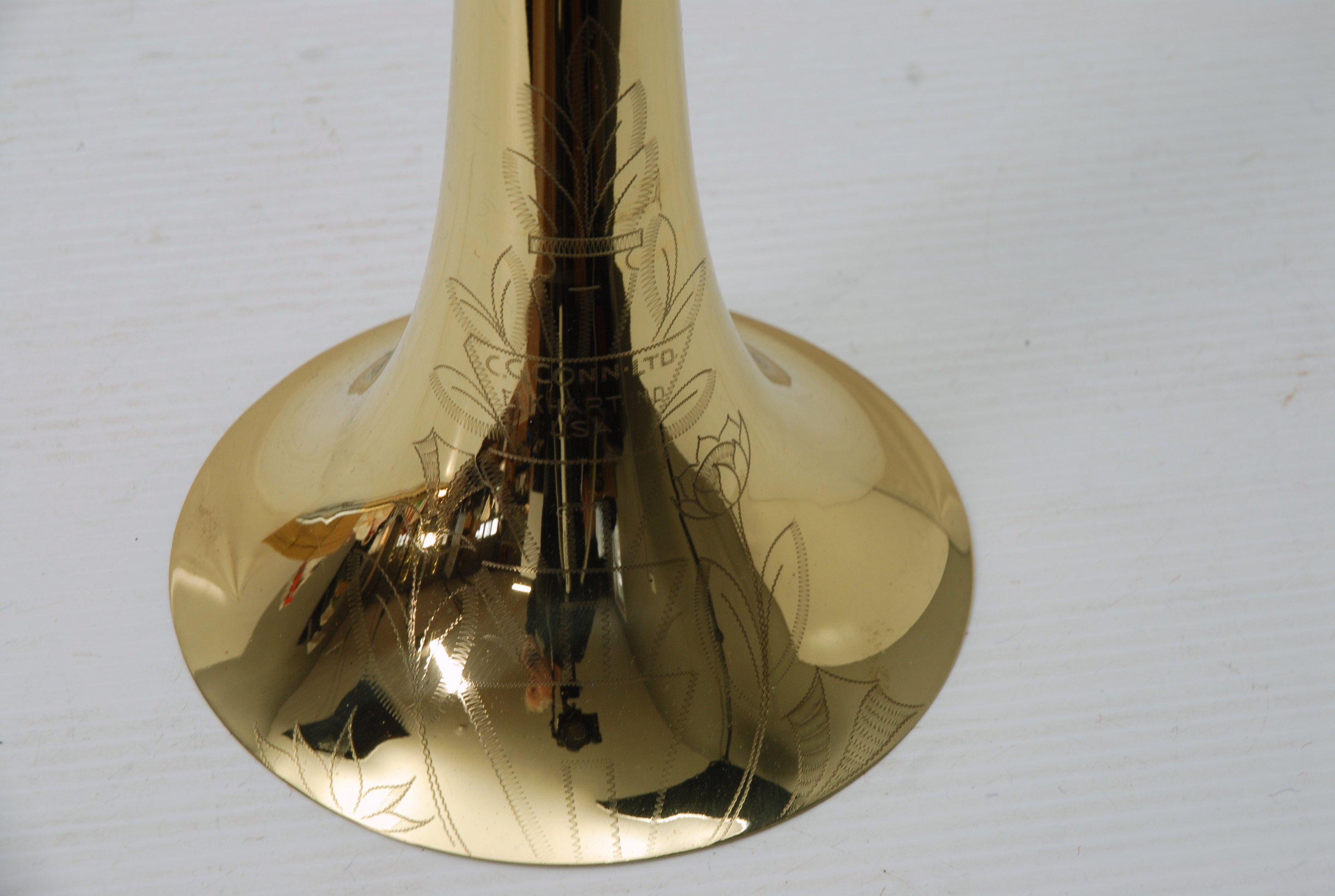 This Conn 44H Vocabell Model from the late 1940s features deco engraving and is in very mint condition. This classic Conn model stands out with its rimless bell and .500 bore handslide, offering a unique playing experience.